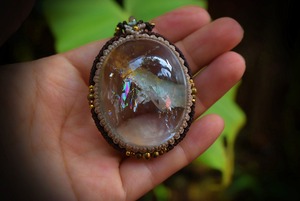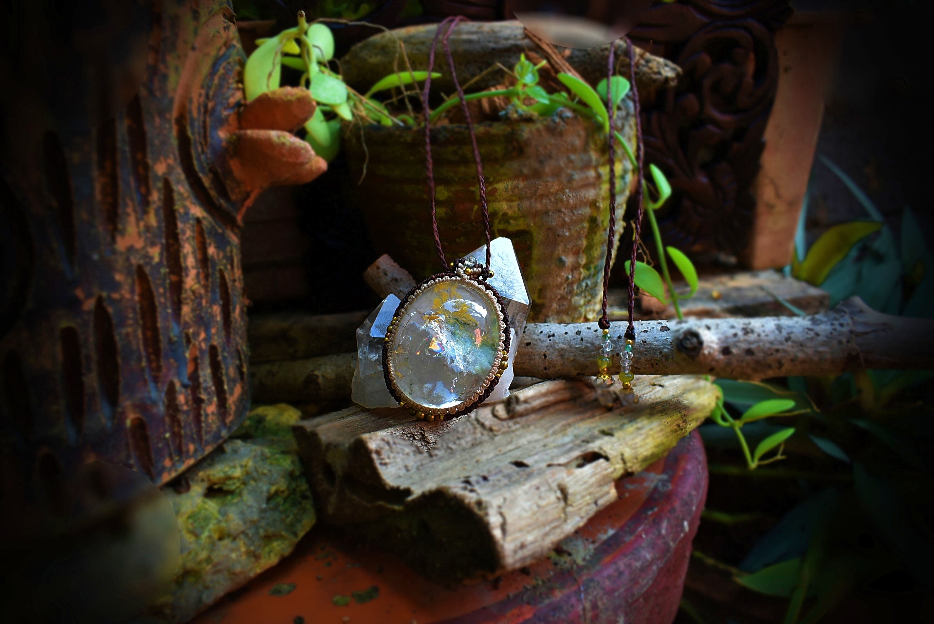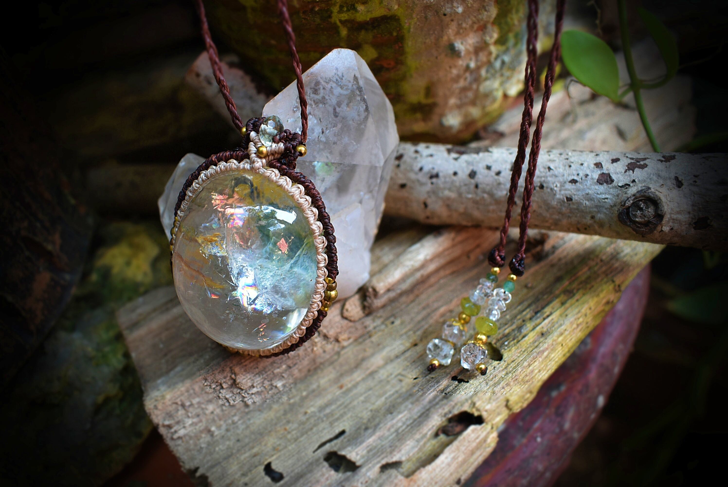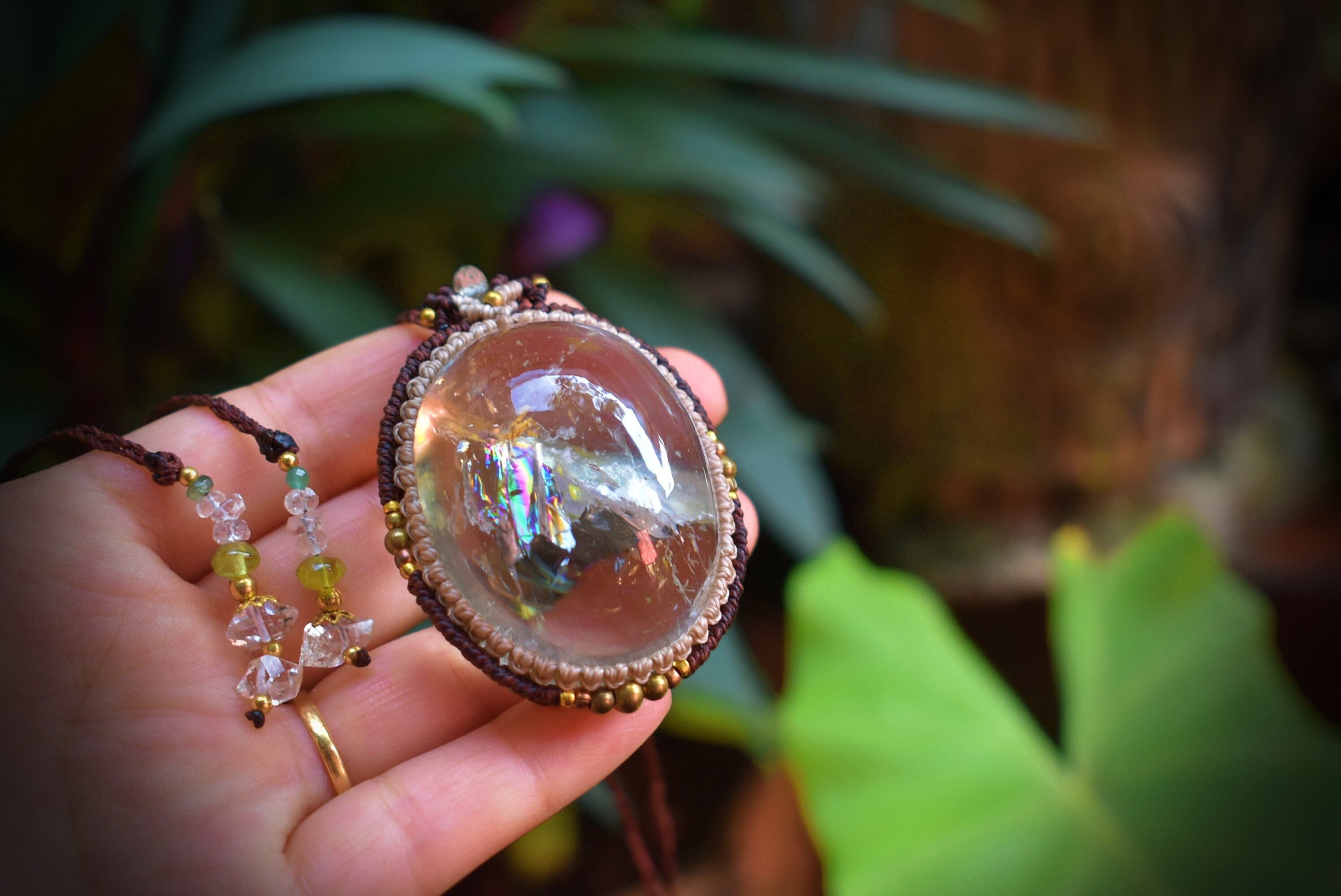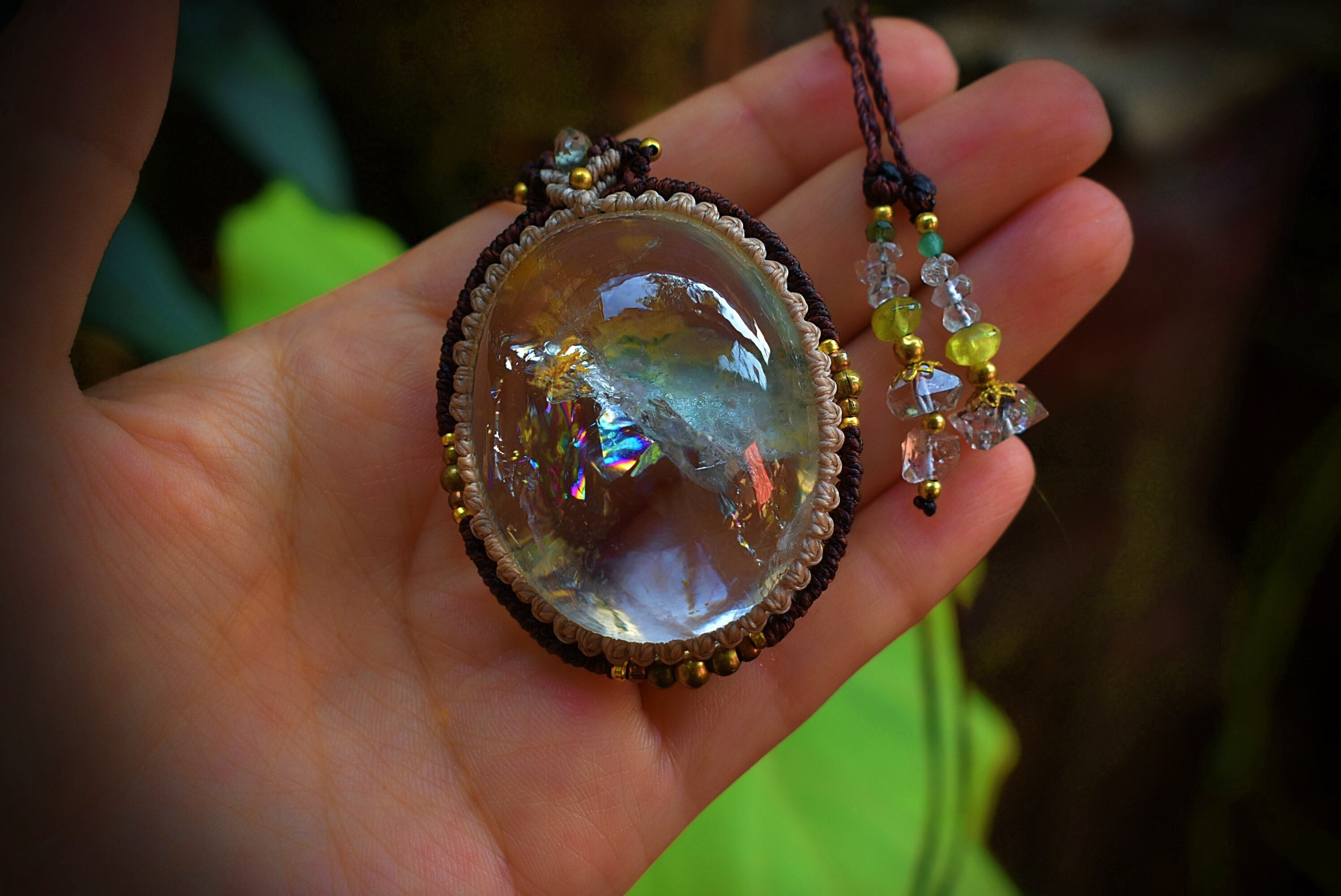 このたびの水晶、透明感溢れる大きな石の中に大きな虹をはっきりと見ることができる、特別なピースのルースをペンダントにマクラメ編み装飾をシンプルに施し、仕上げました。