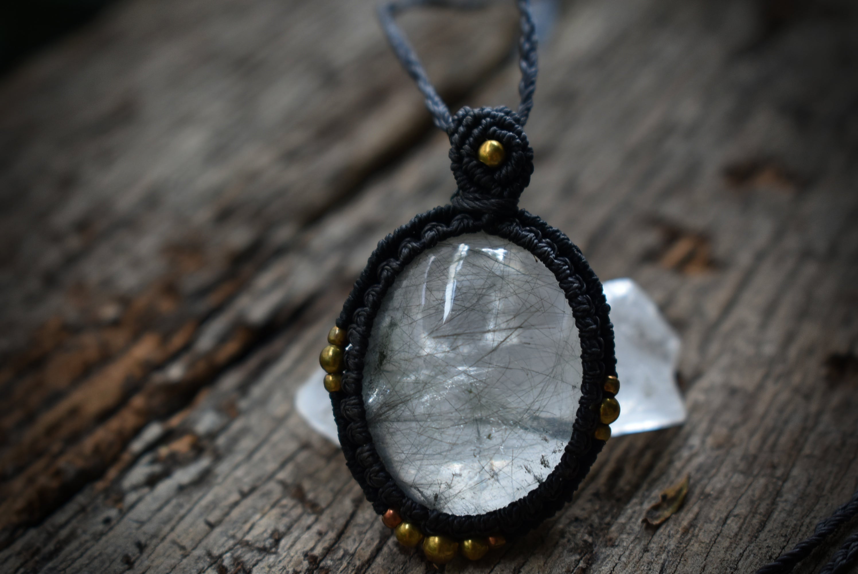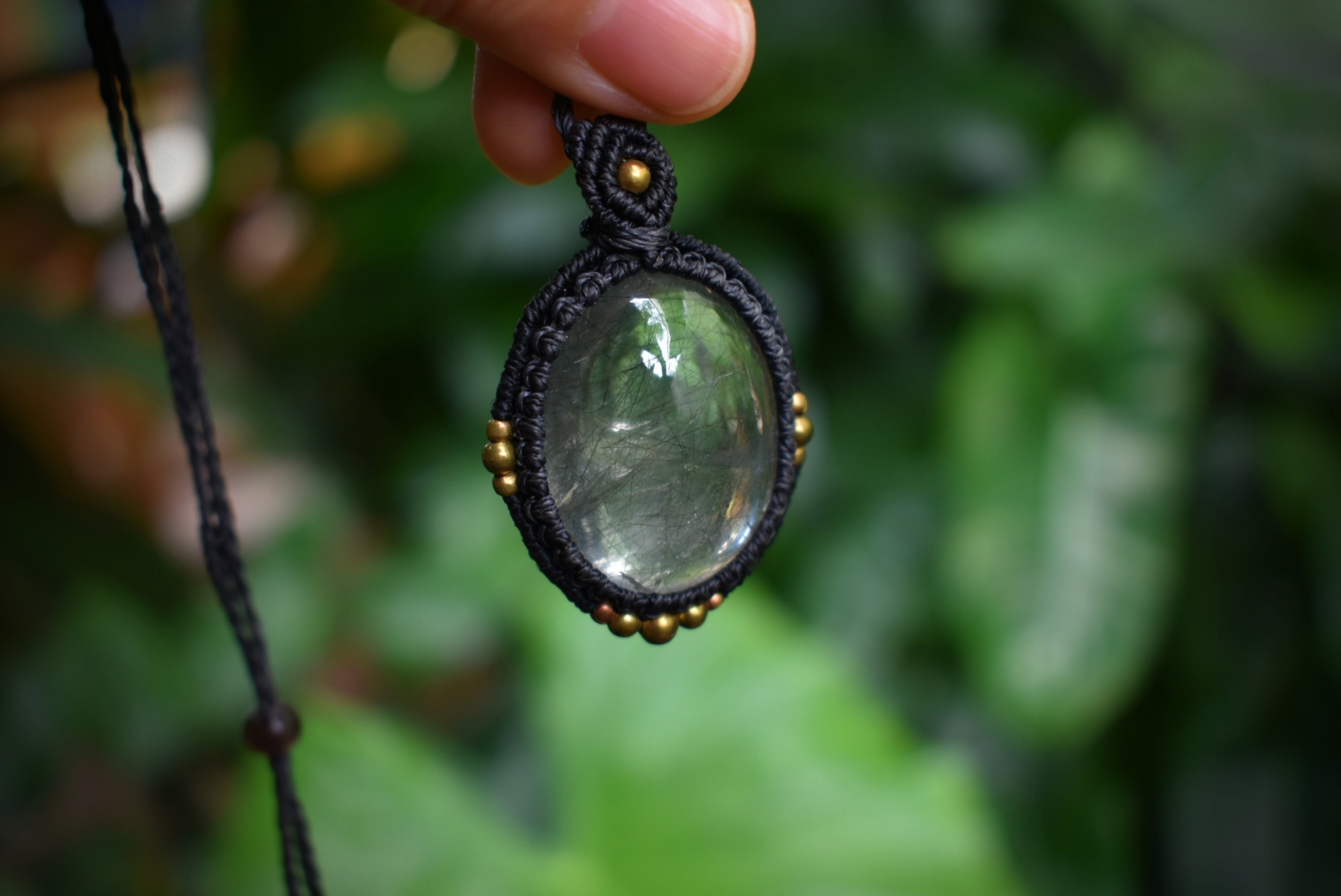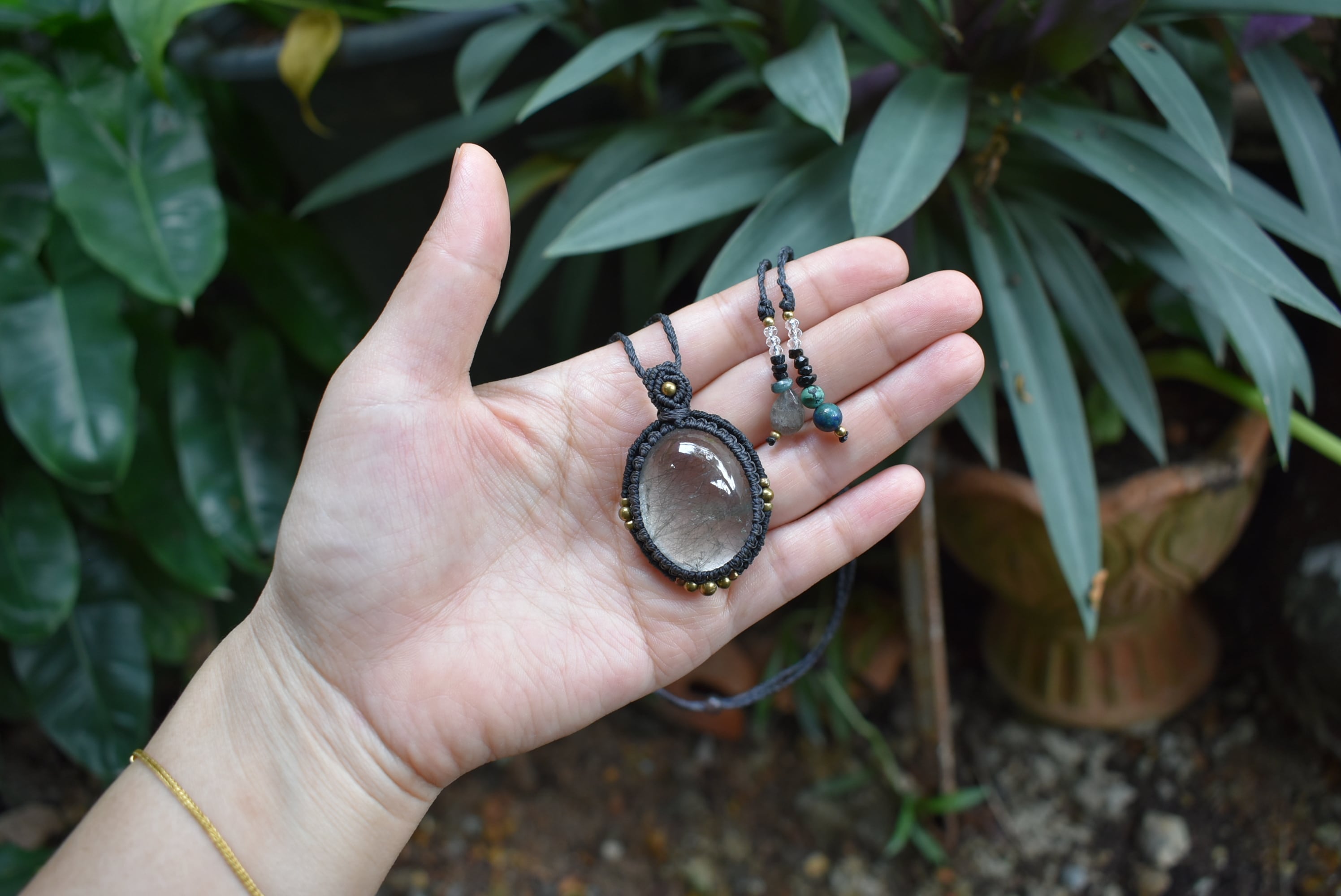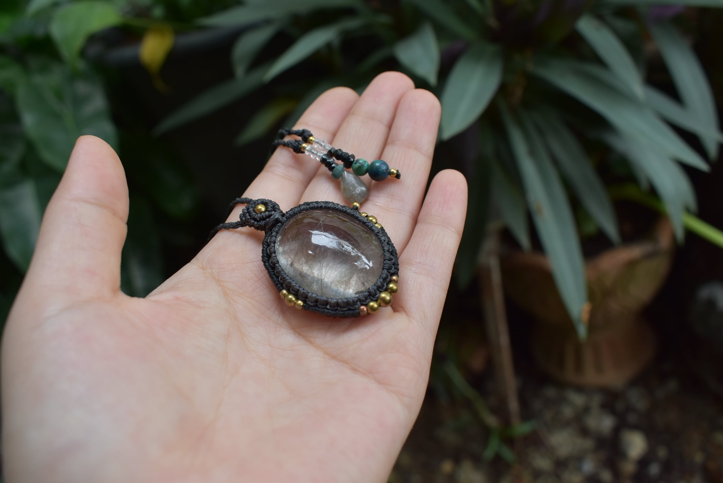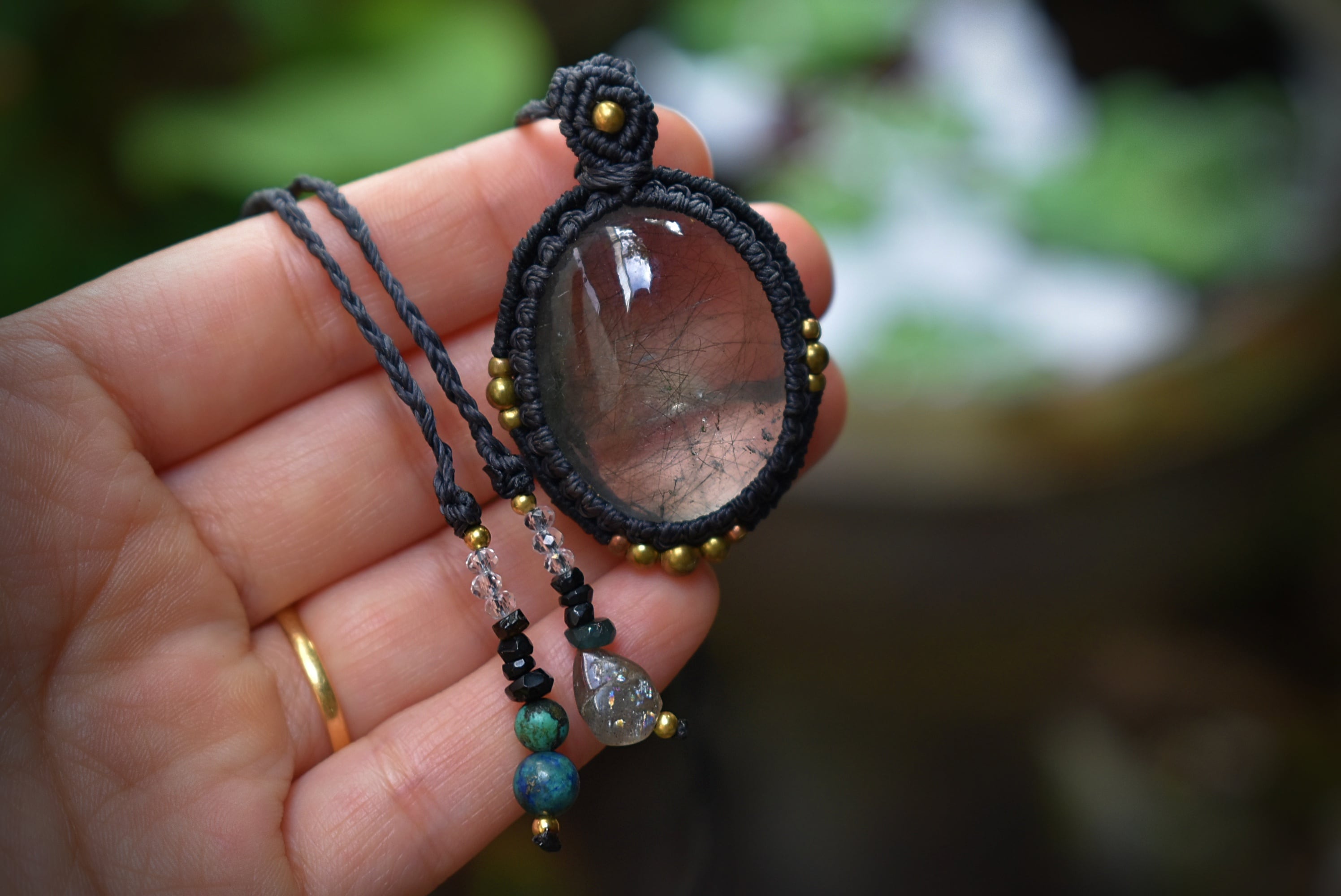 透明感★輝く虹と鏡★ブラックルチル水晶 マクラメペンダント