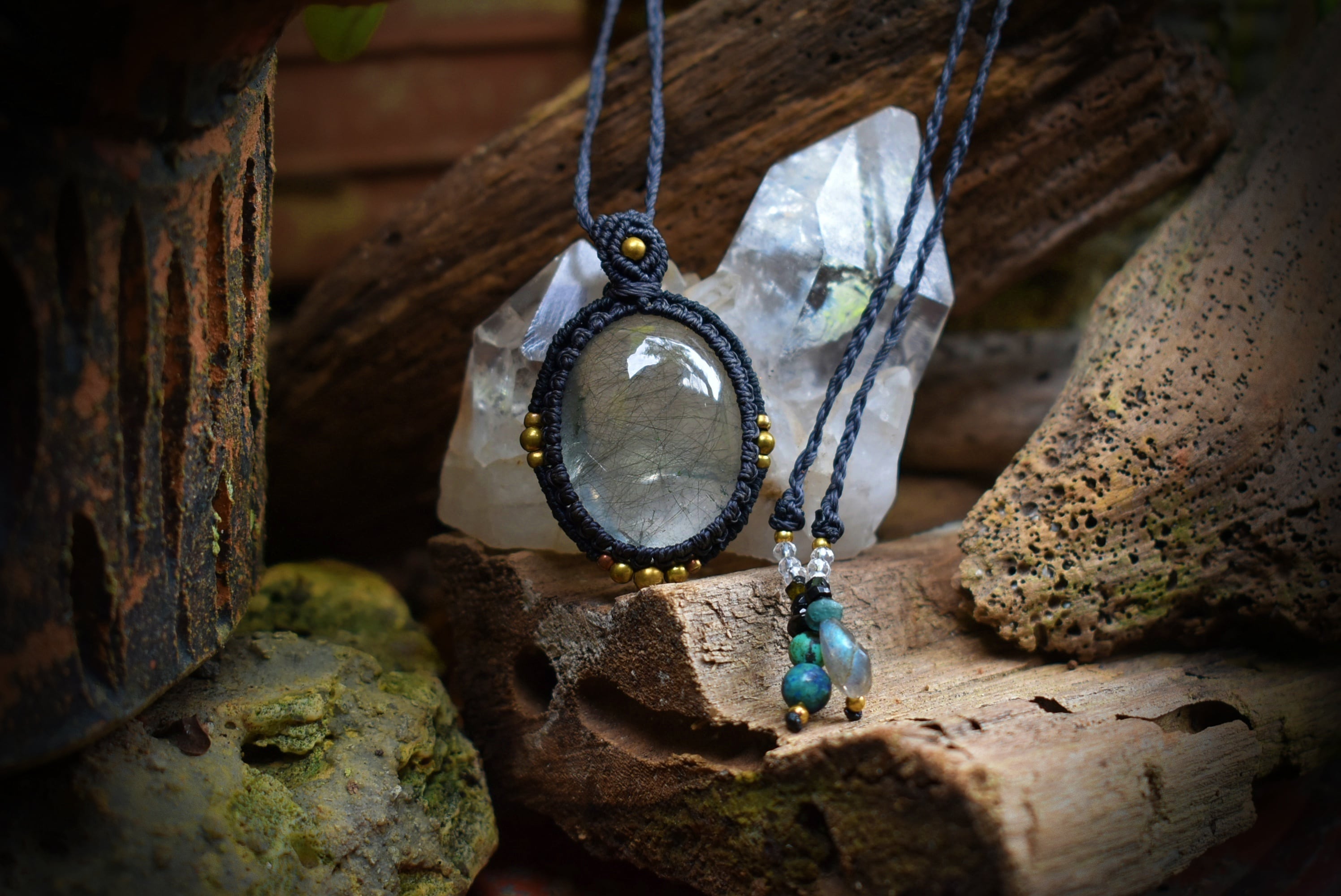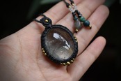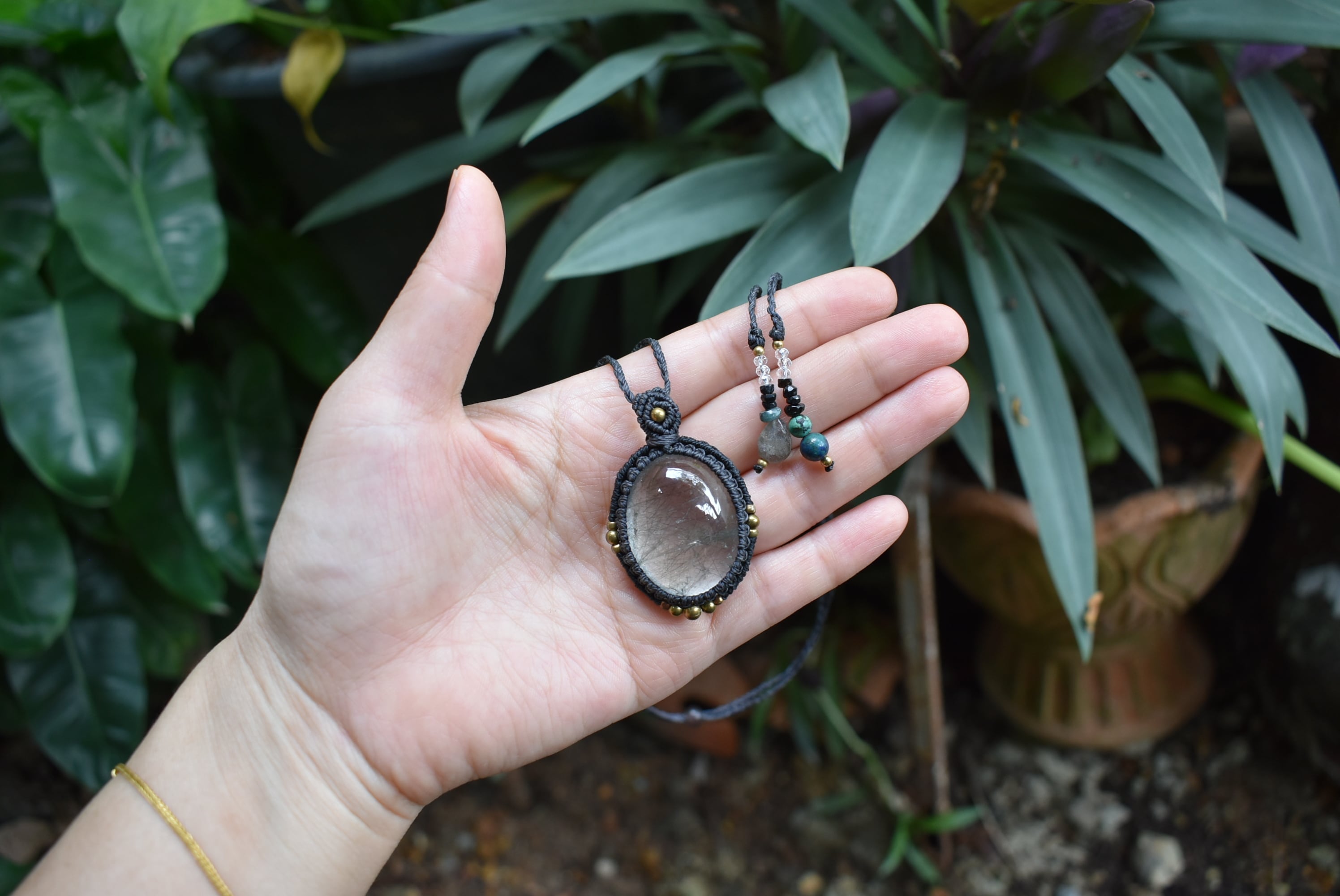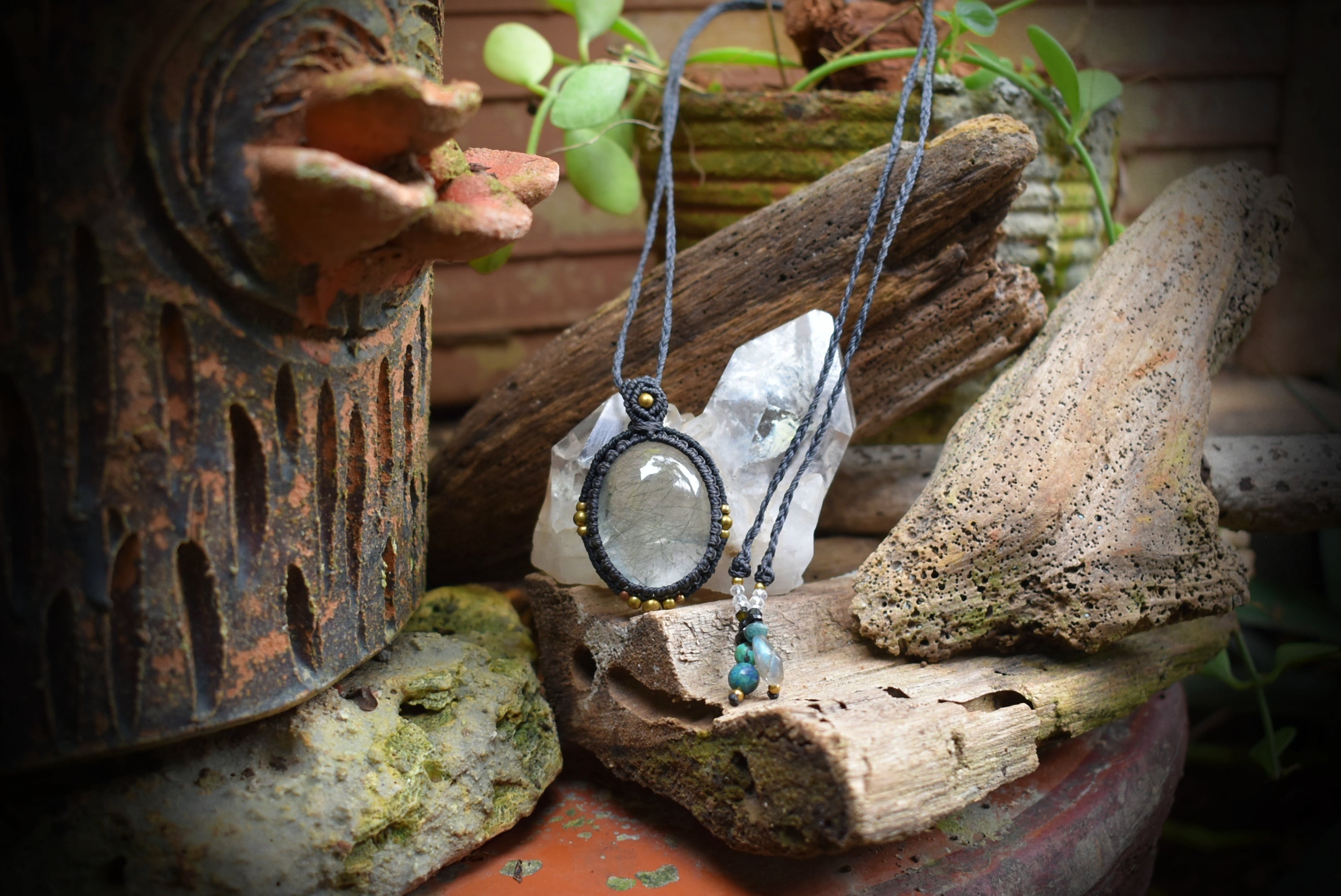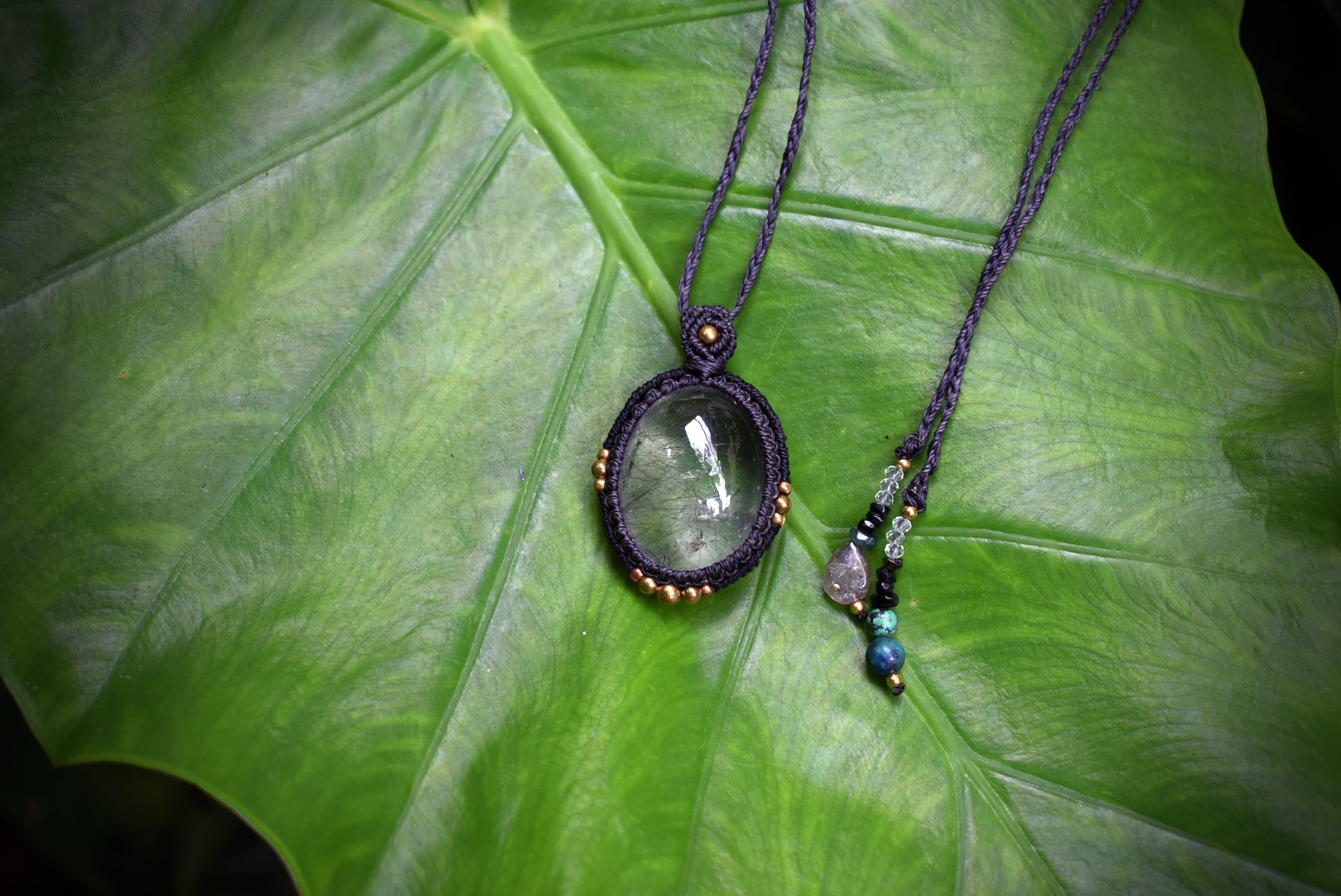 透明感★輝く虹と鏡★ブラックルチル水晶 マクラメペンダント