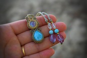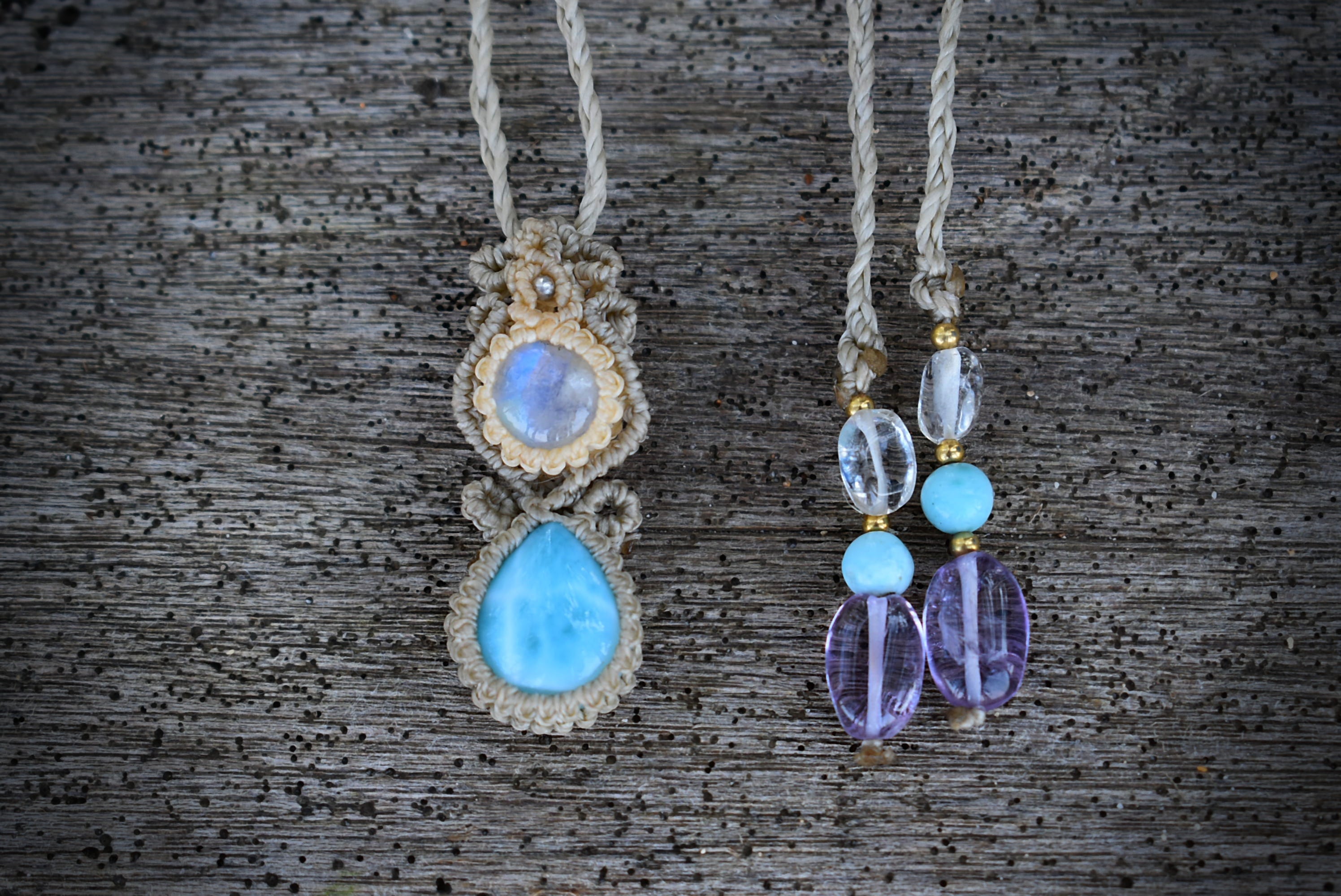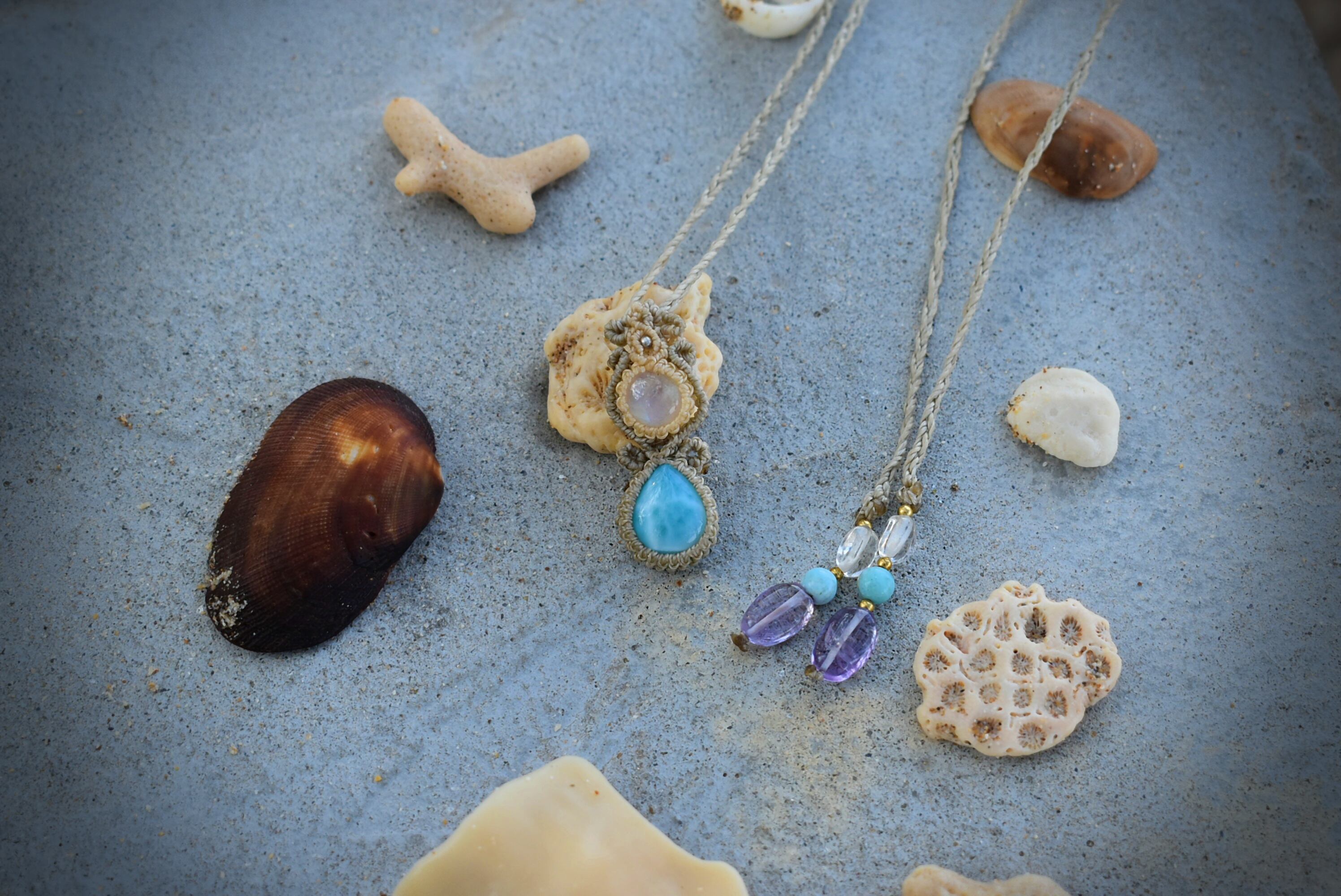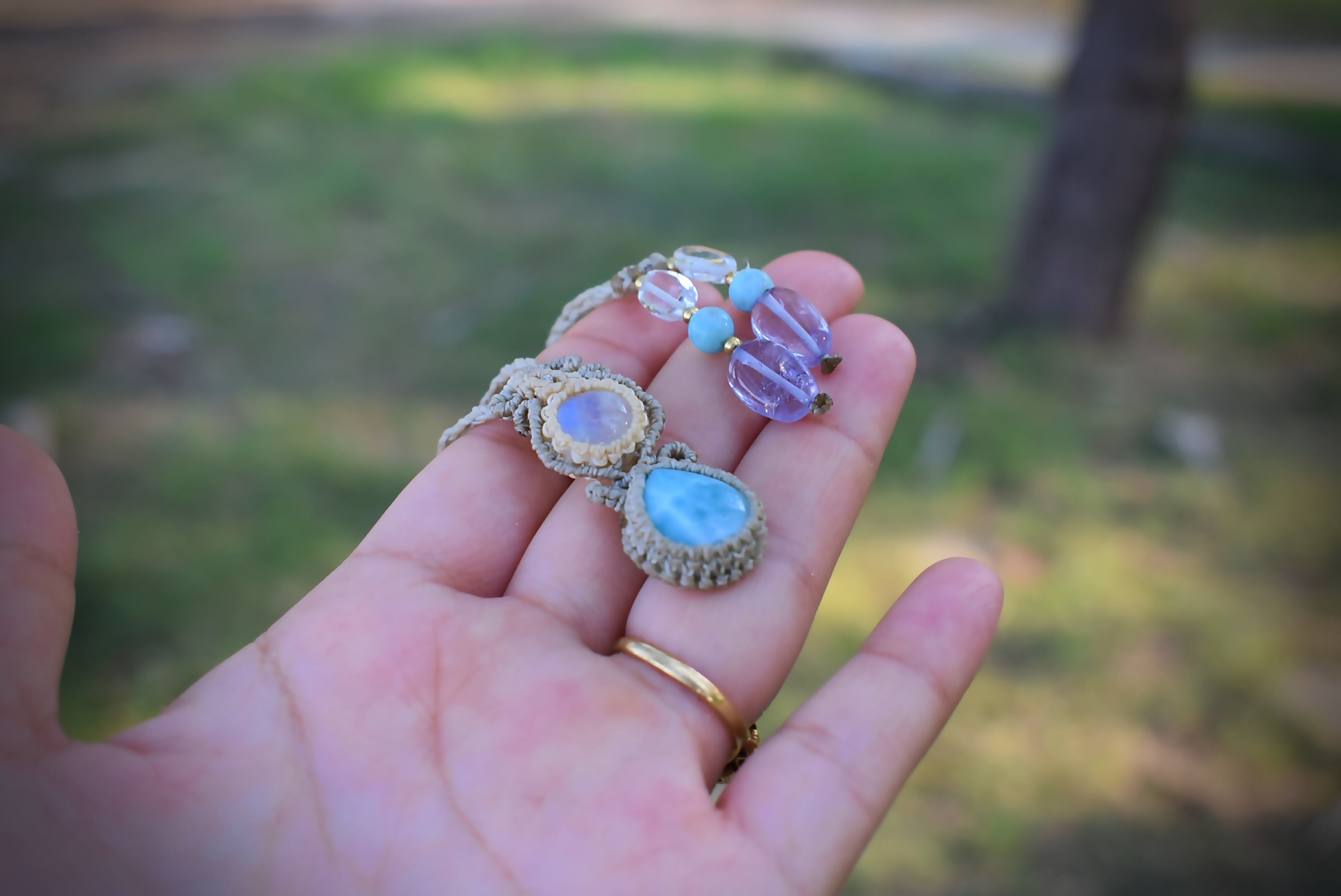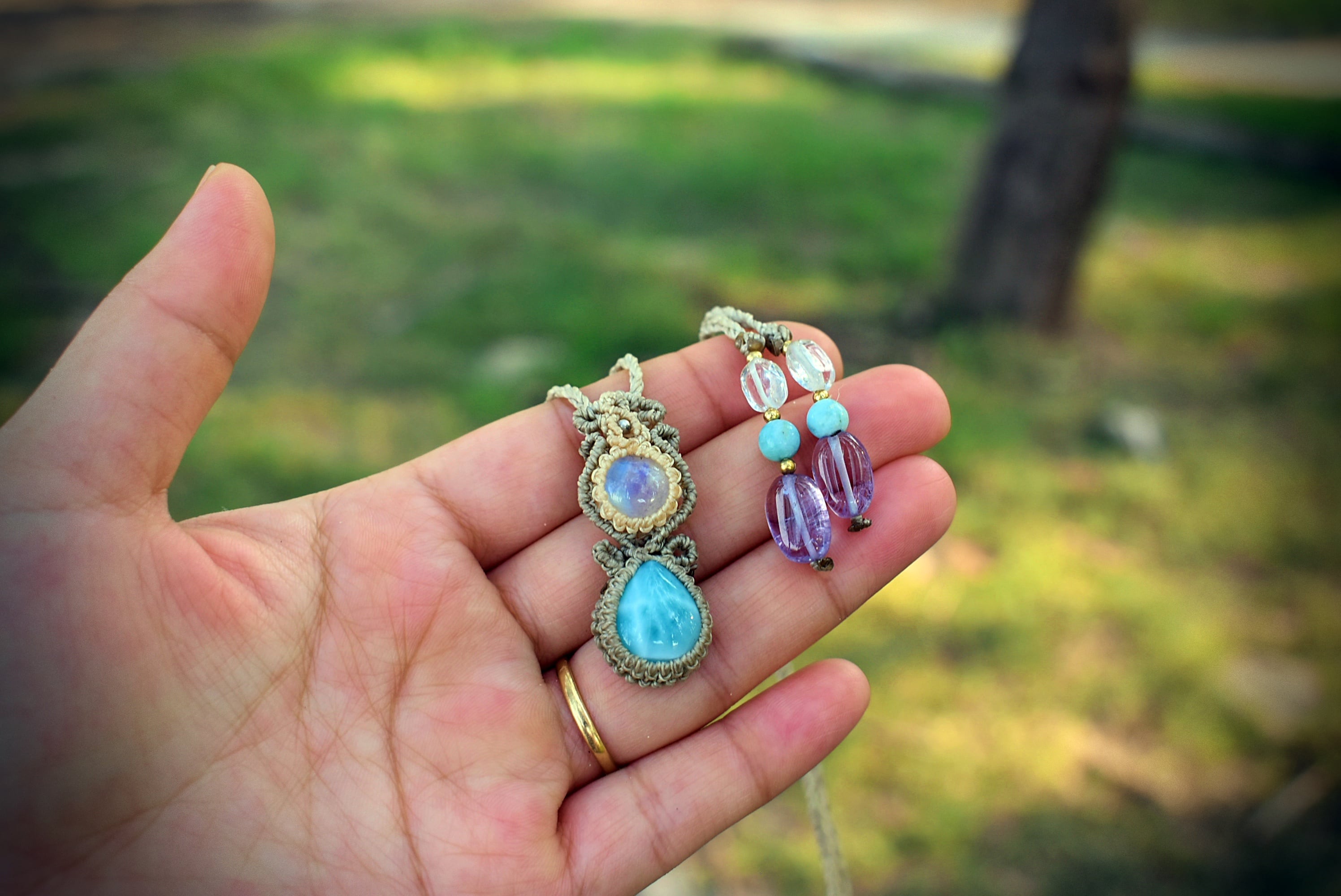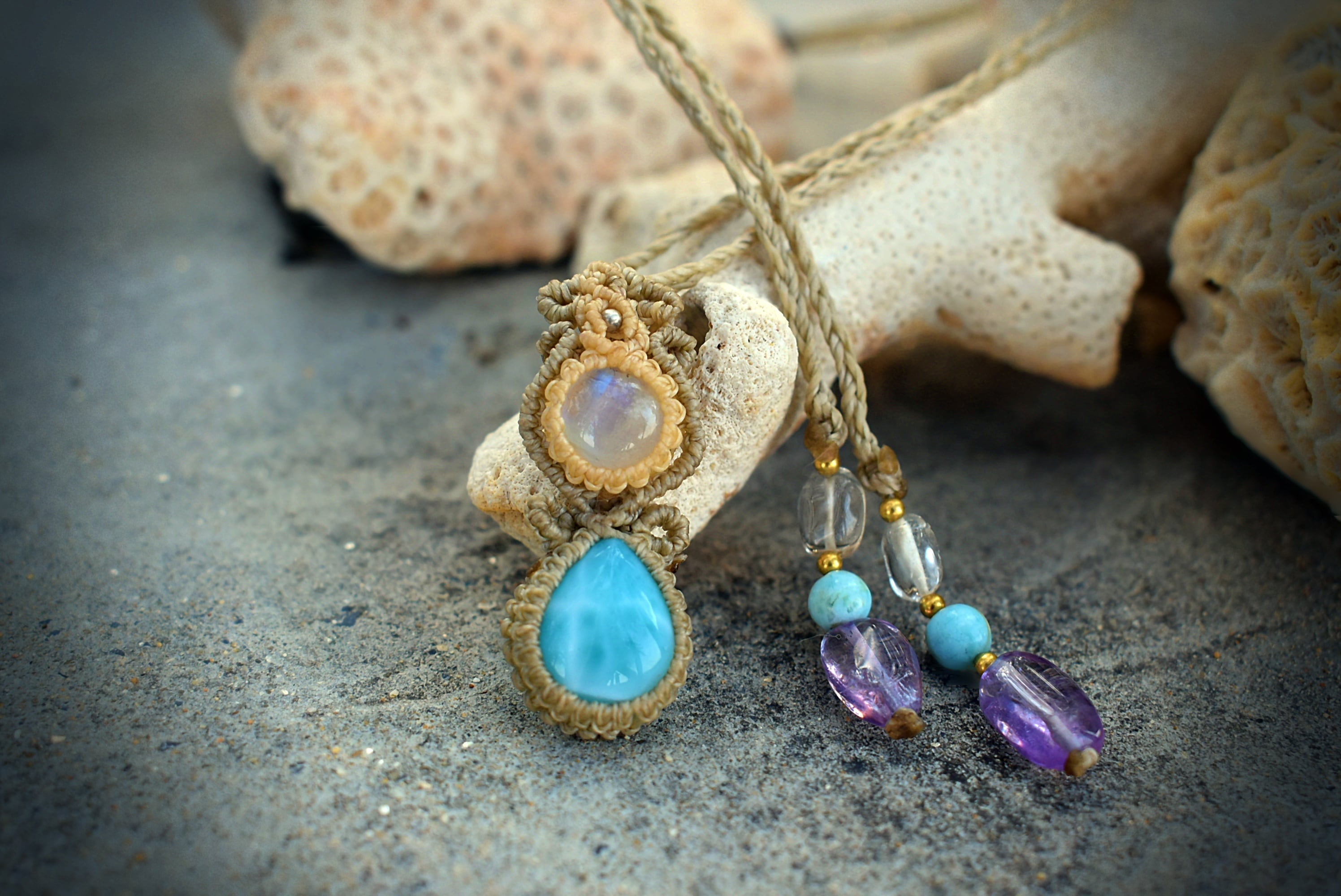 高品質で小粒な天然石ラリマーとホワイトラブラドライトを使用してマクラメ編み装飾を施し、ペンダントに仕上げました。