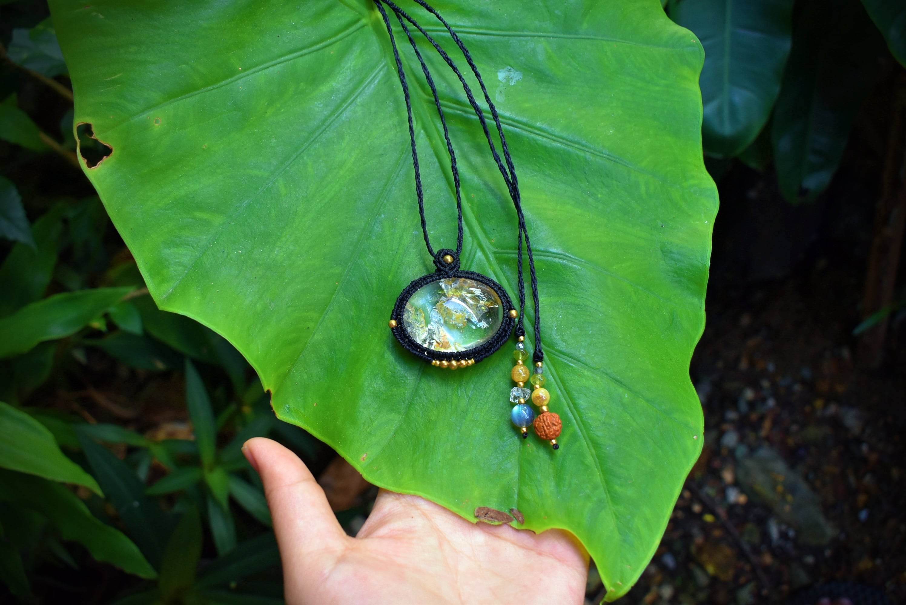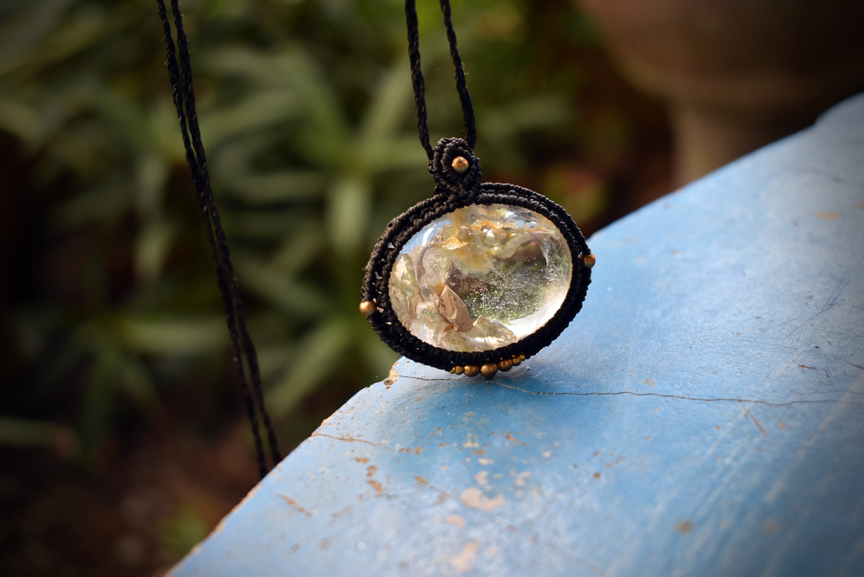 この石をシンプルに真鍮ビーズをトッピングして、マクラメ編み装飾を施し