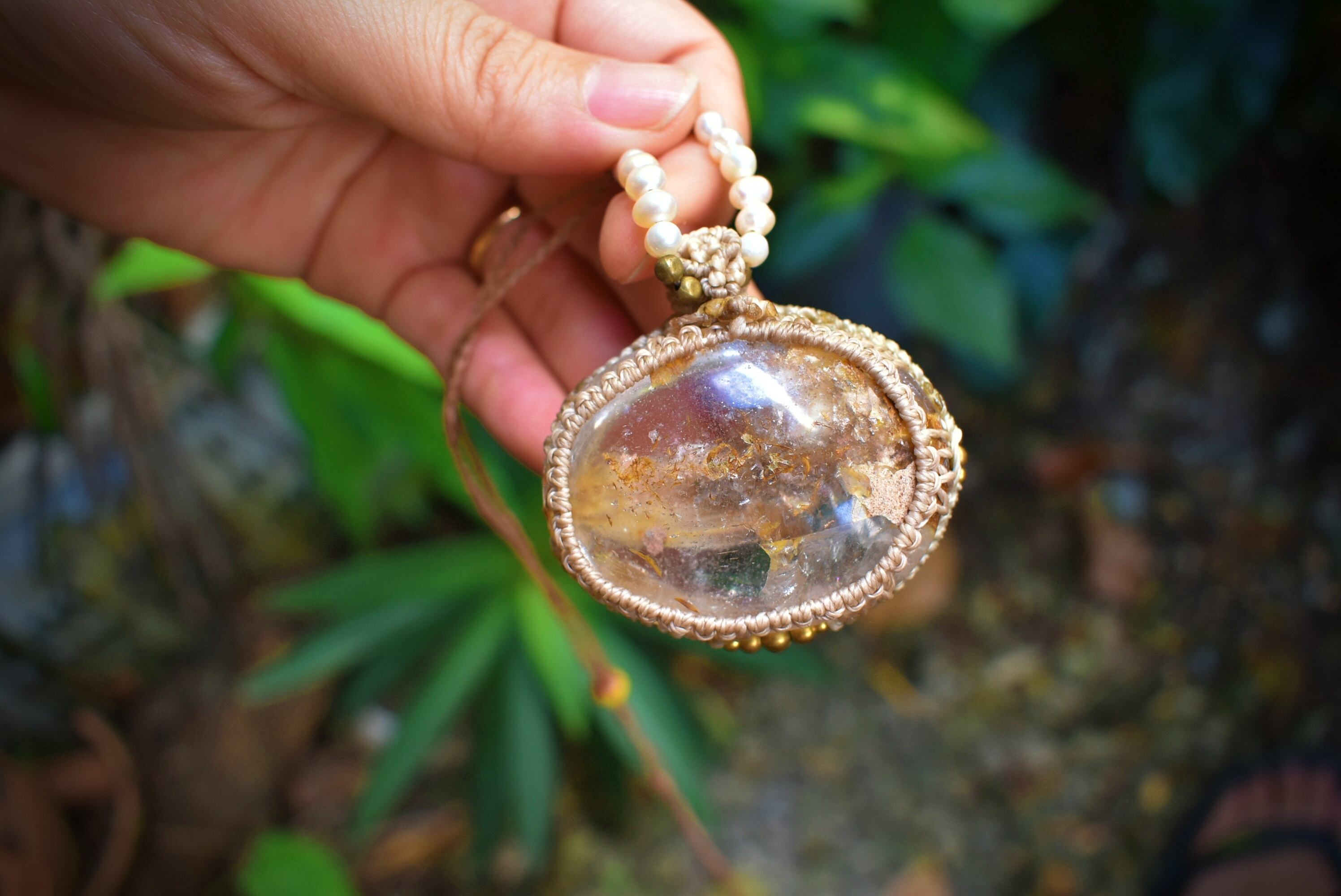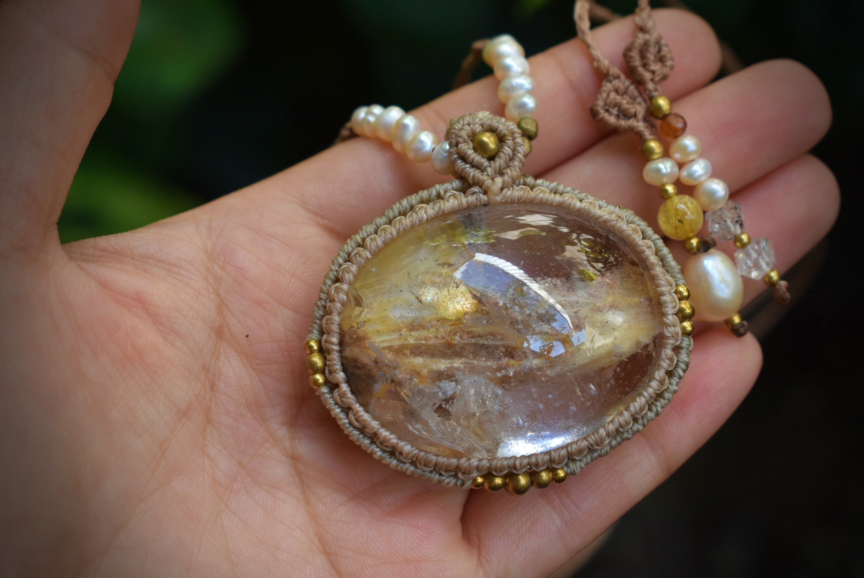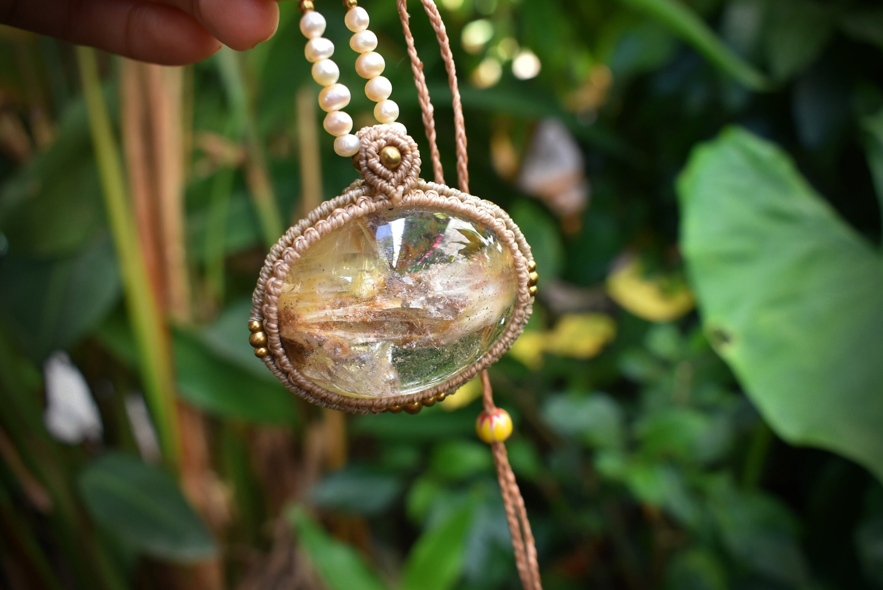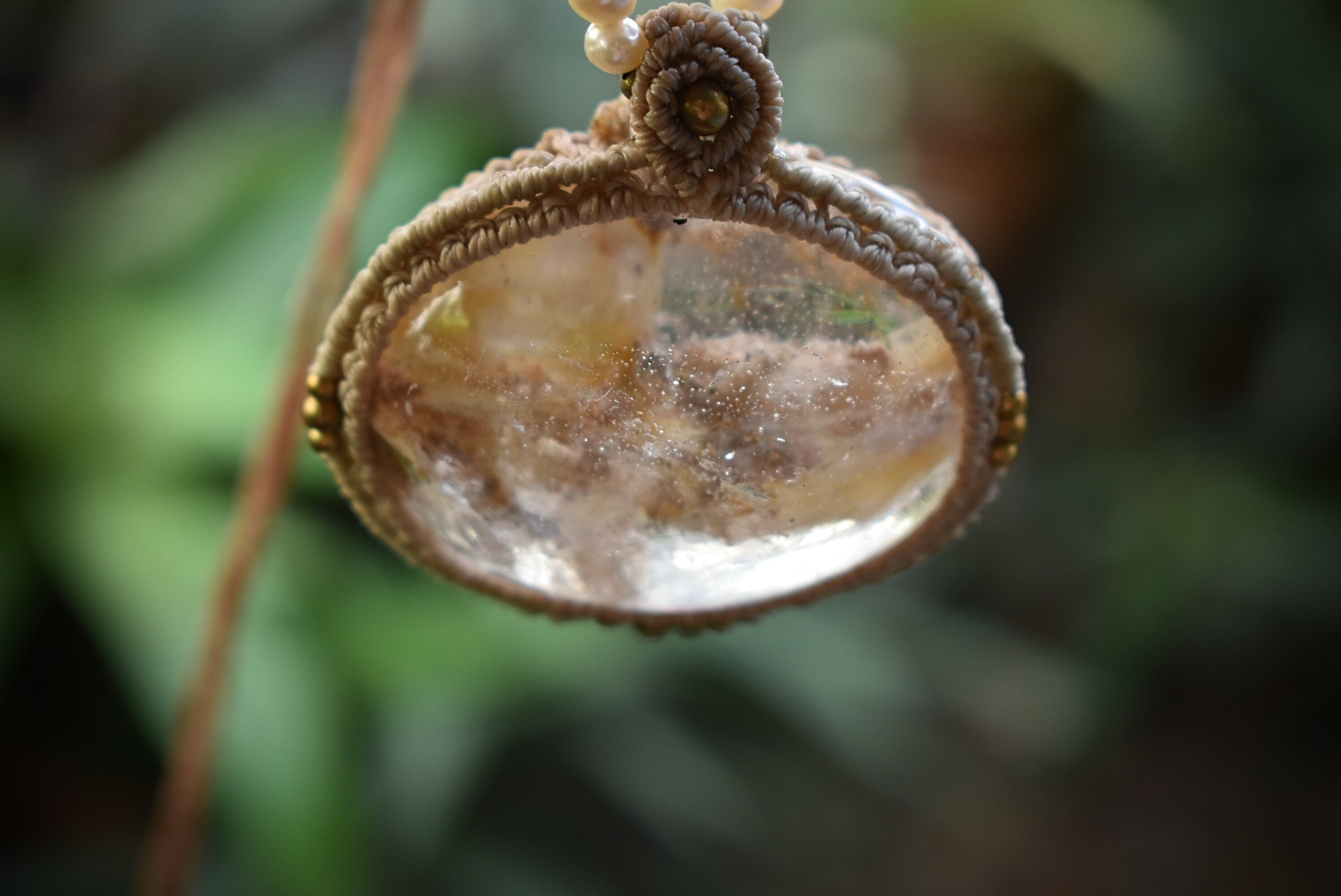 大きな石の中にピンク色の森、シラー、気泡、インクルージョンが全部詰まったボリュームあるスペシャルなガーデン貫入り水晶をマクラメ編み装飾をシンプルに施してペンダントに仕上げました。