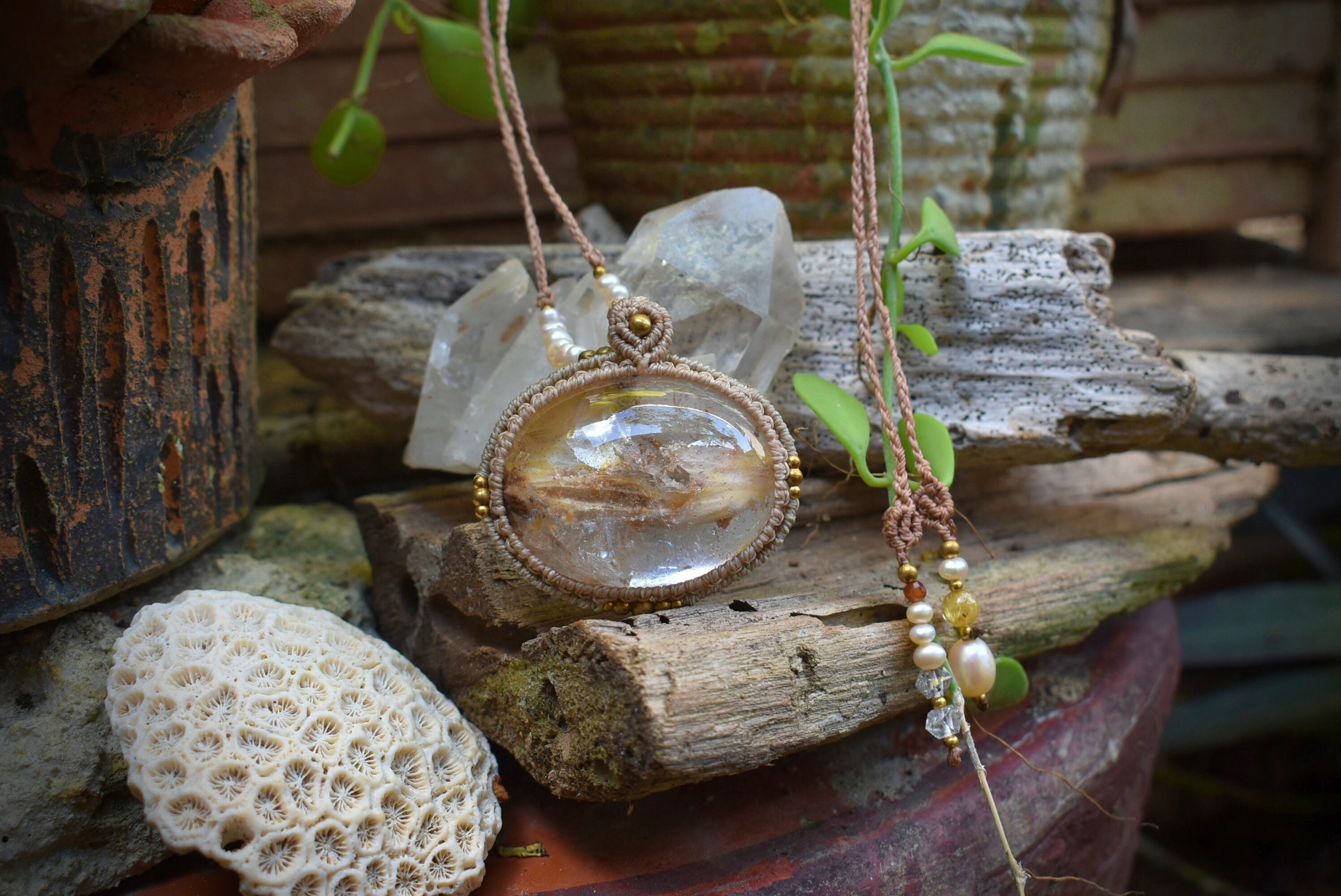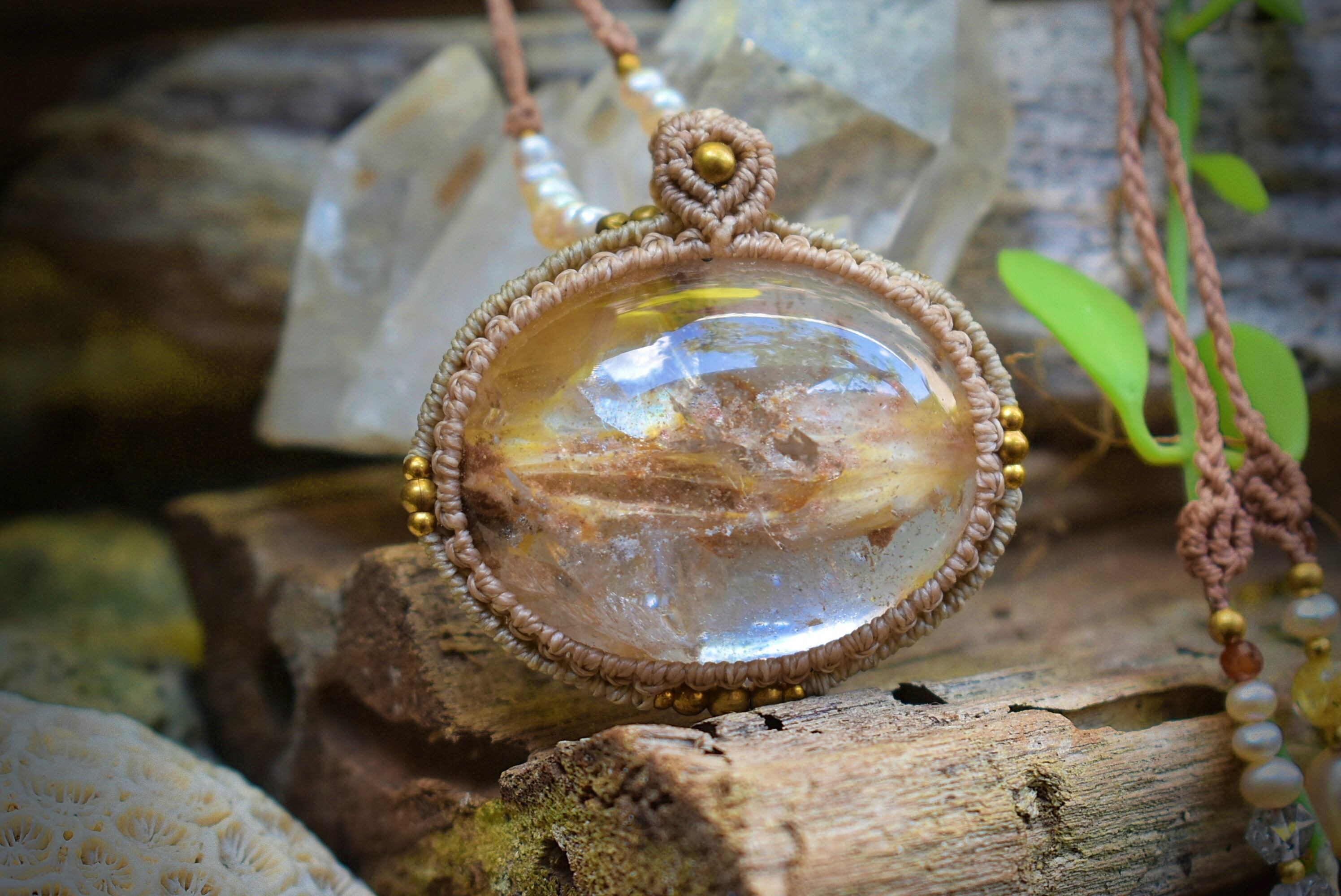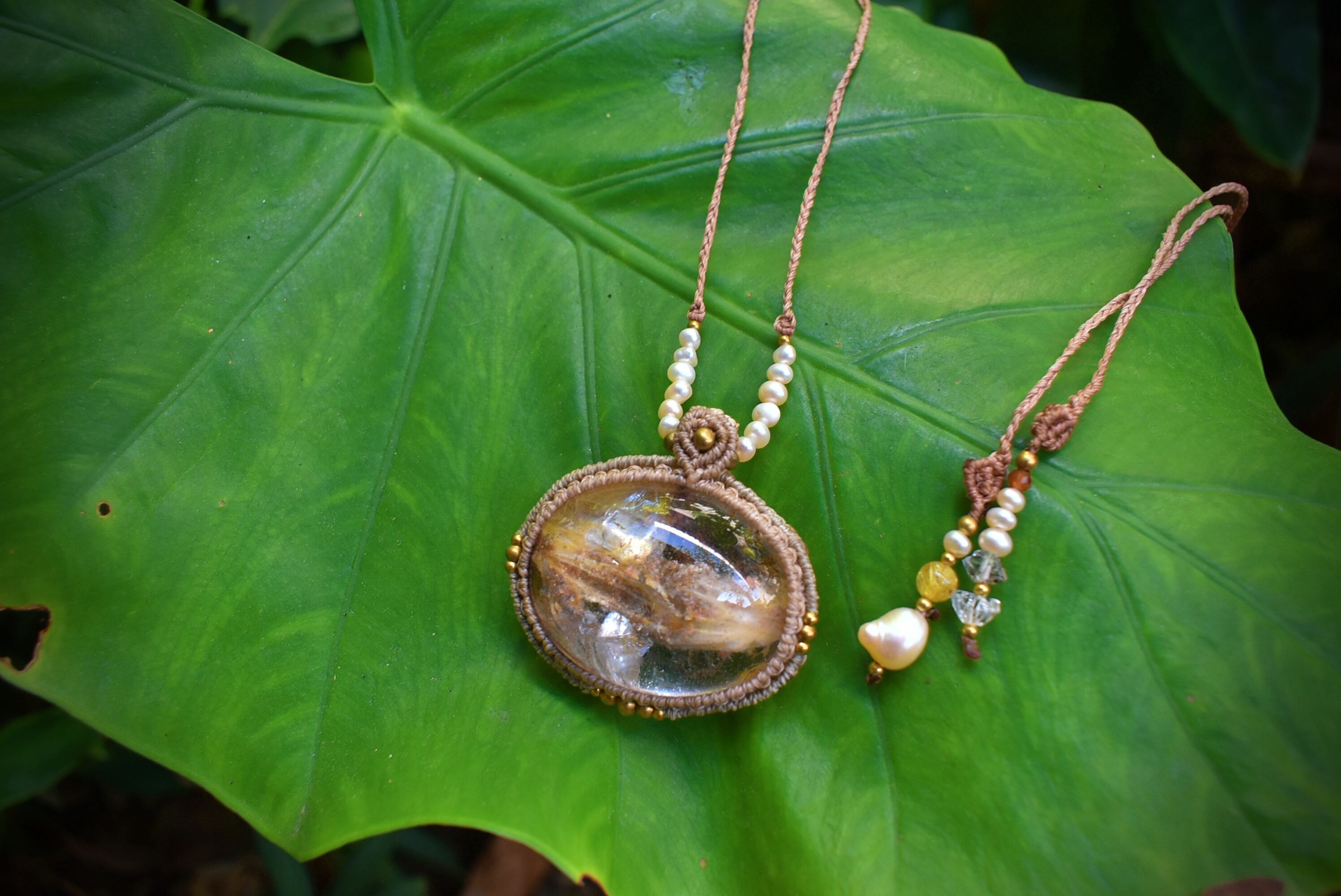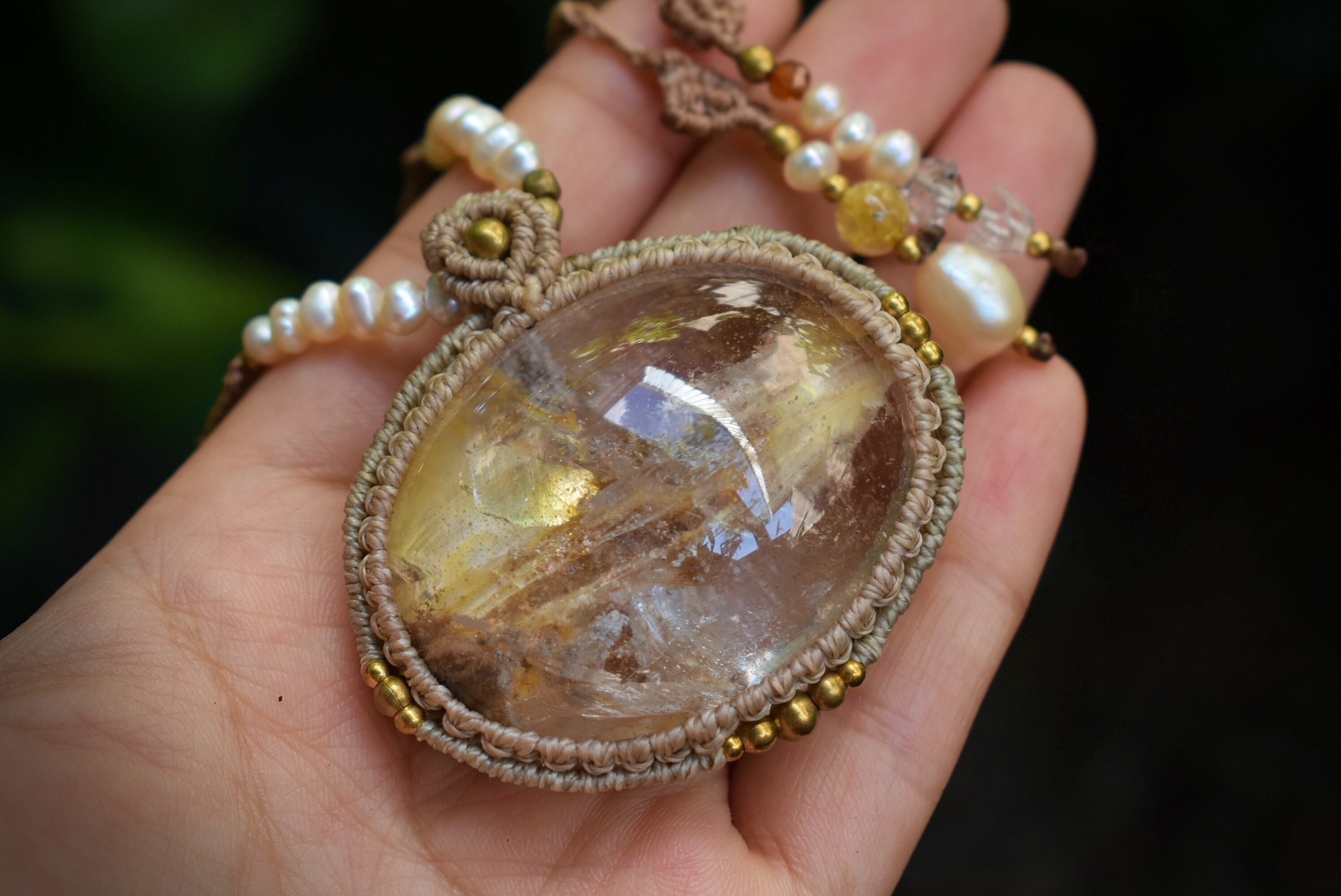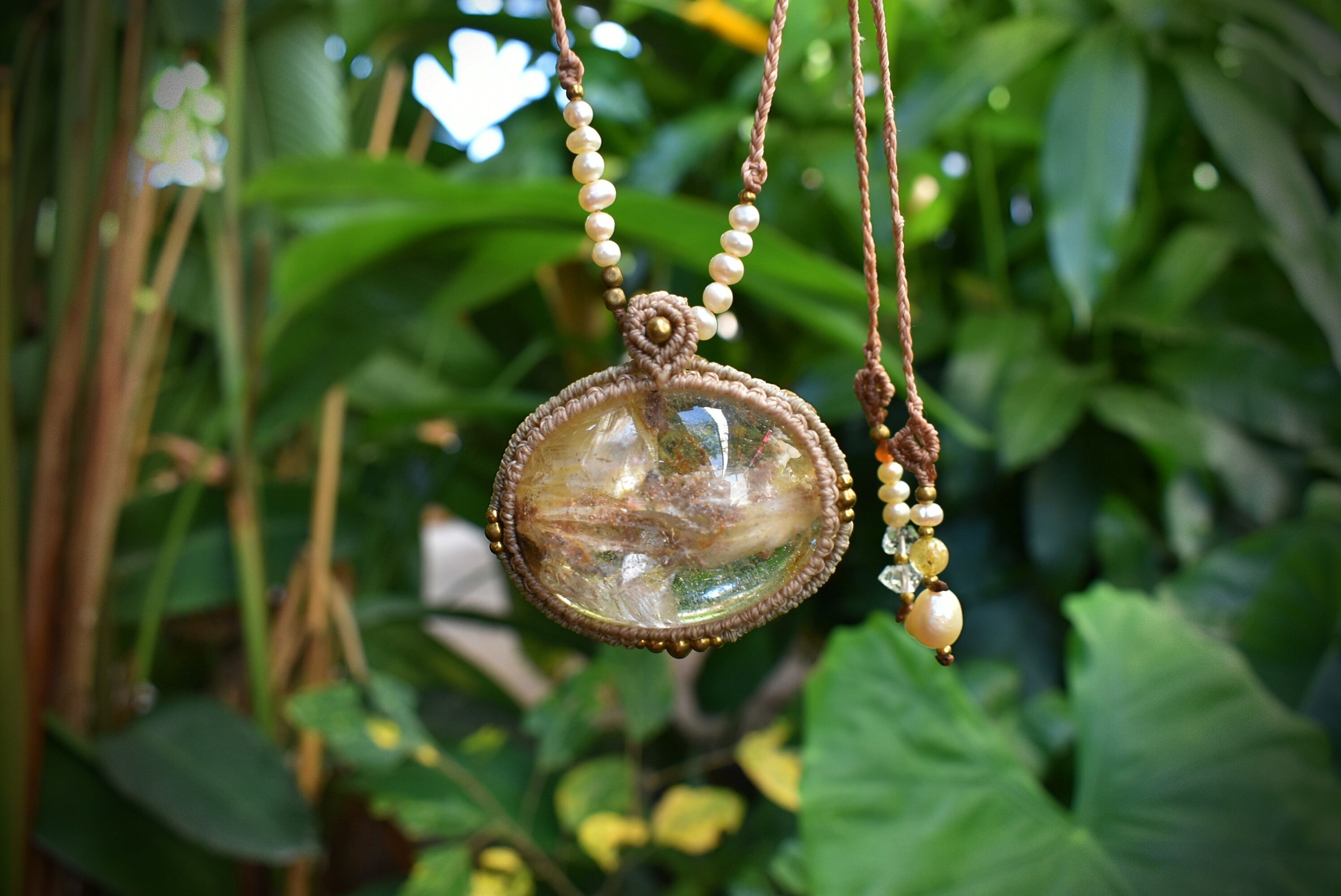 大きな石の中にピンク色の森、シラー、気泡、インクルージョンが全部詰まったボリュームあるスペシャルなガーデン貫入り水晶をマクラメ編み装飾をシンプルに施してペンダントに仕上げました。