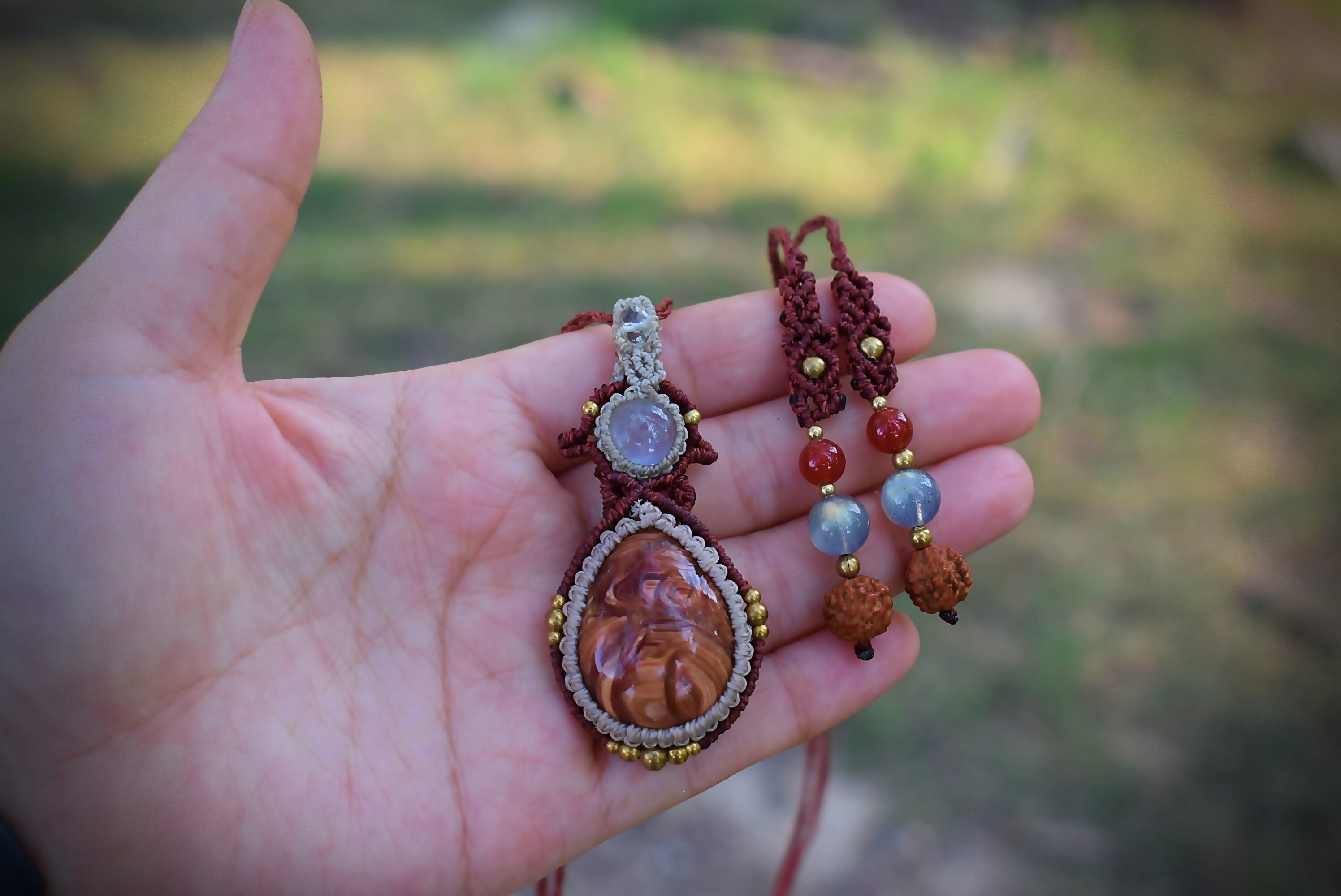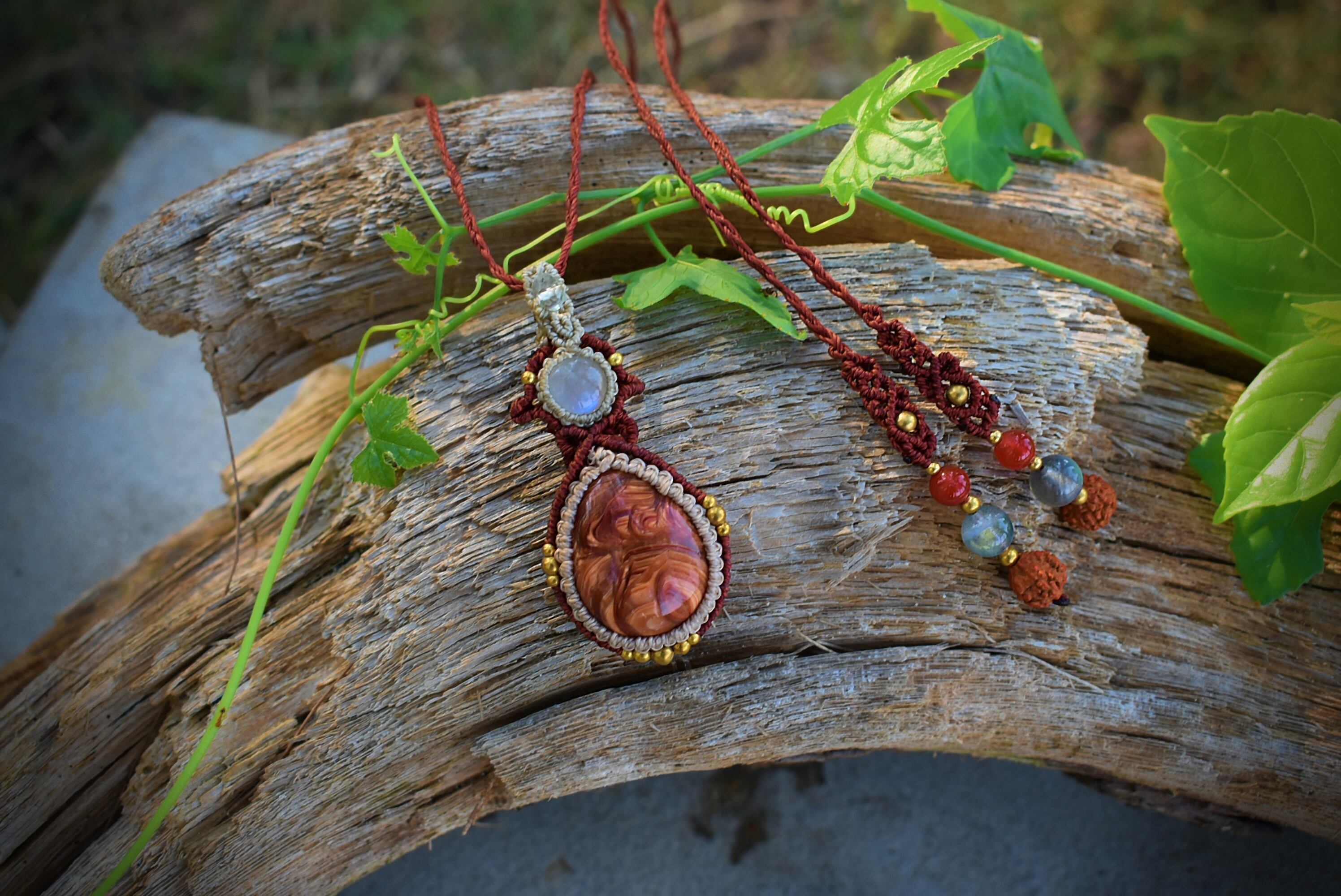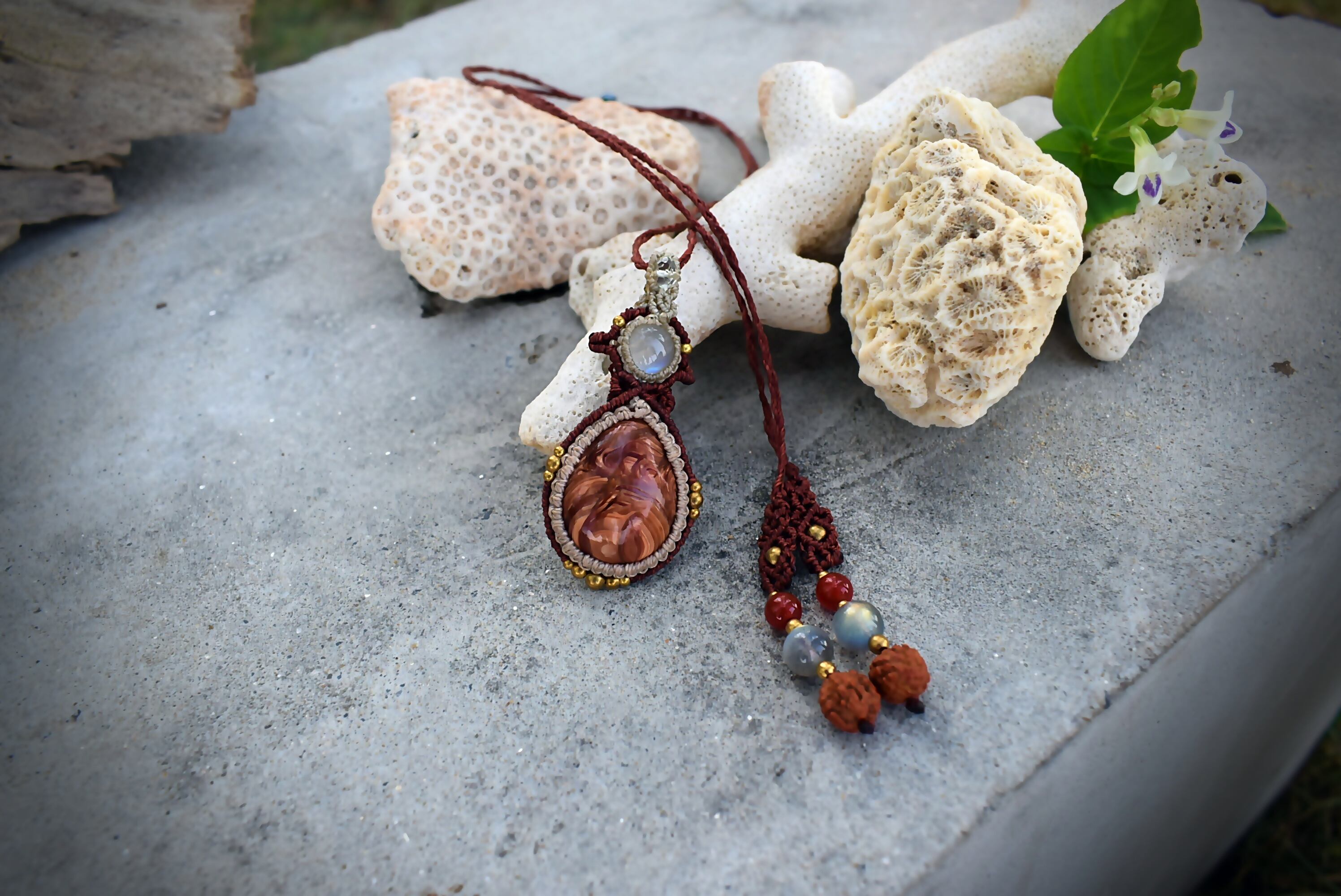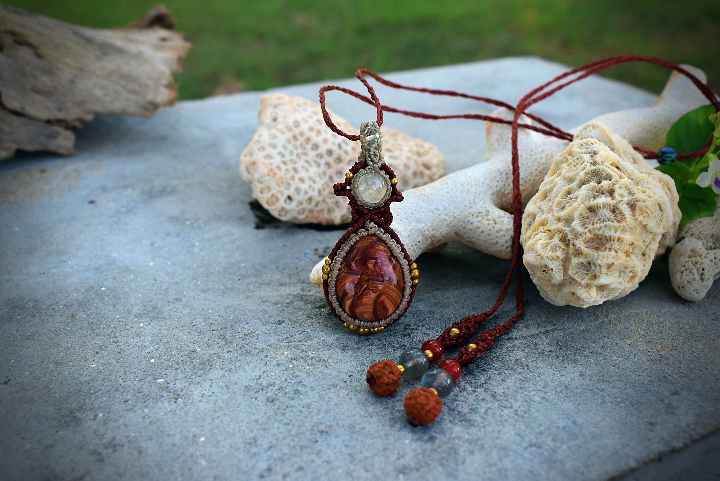 芸術の高品質★レッドオパールとレインボームーンストーン マクラメペンダント
