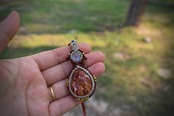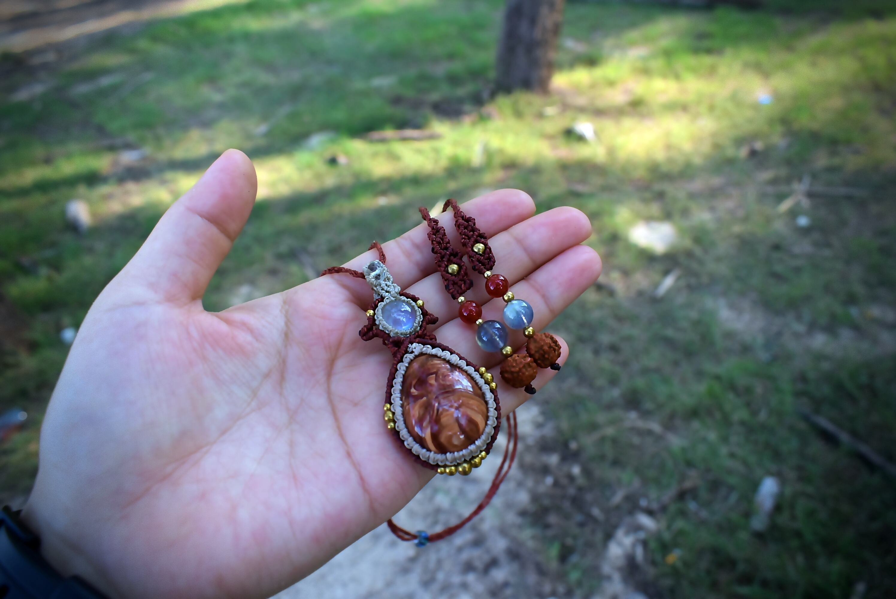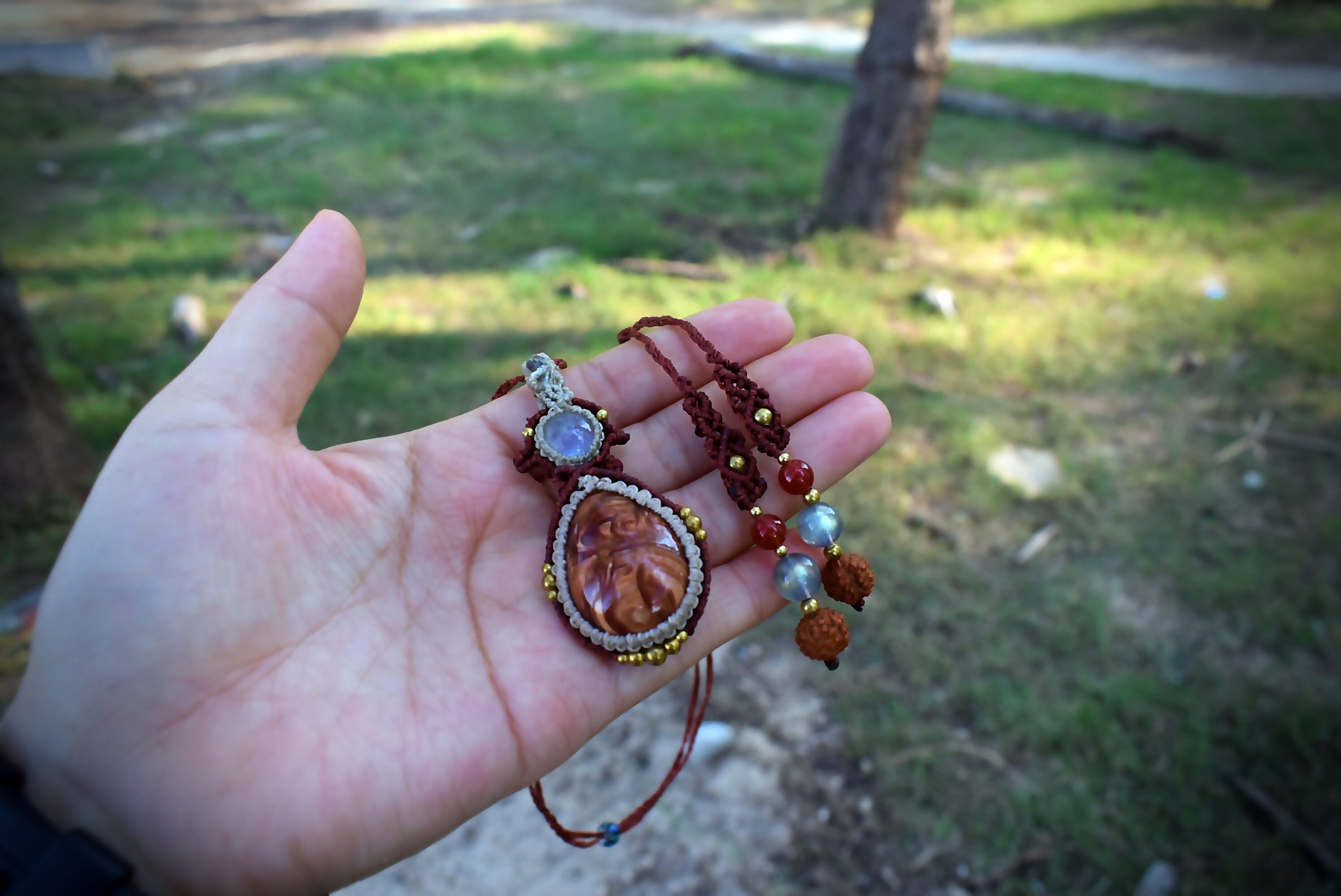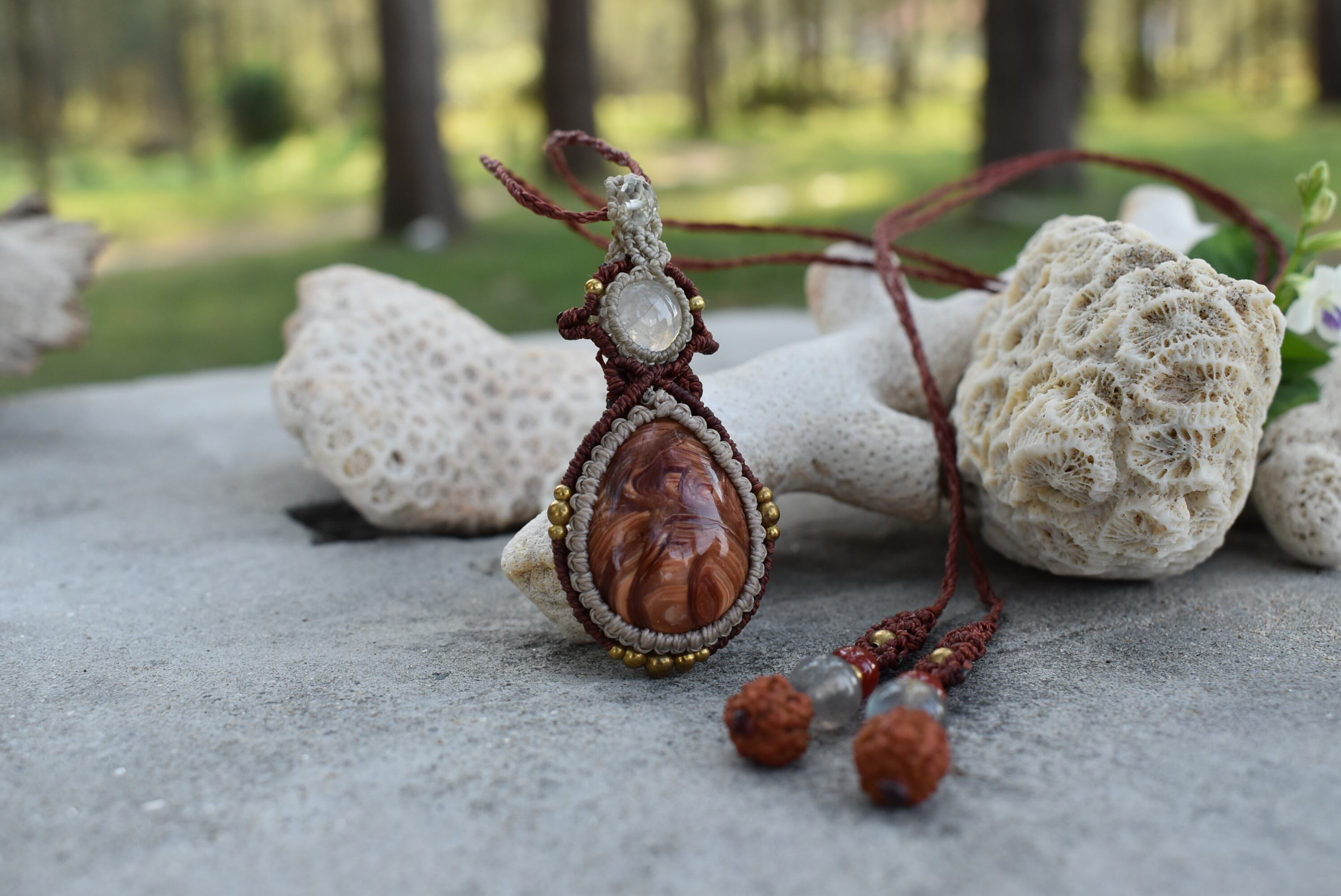 芸術の高品質★レッドオパールとレインボームーンストーン マクラメペンダント