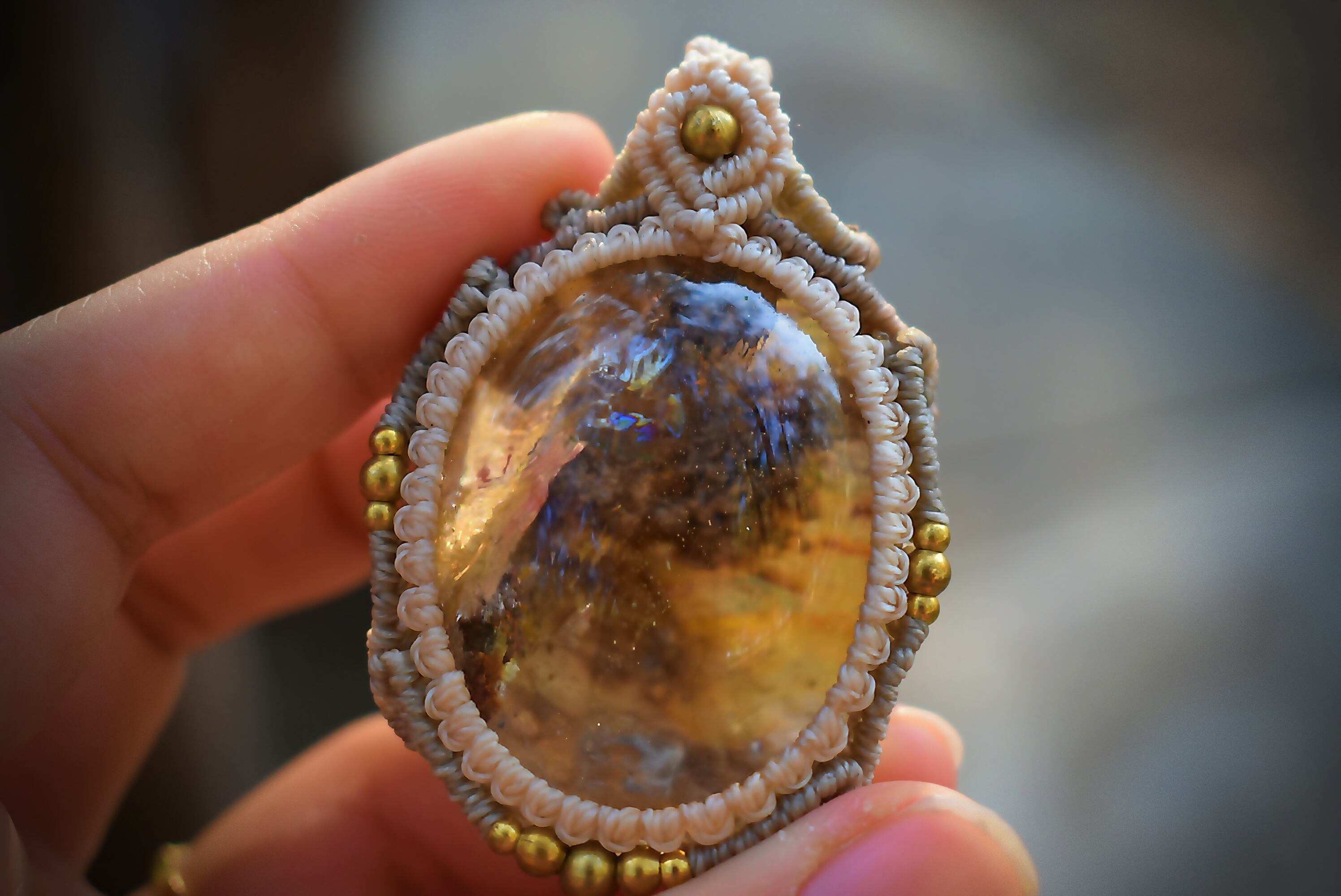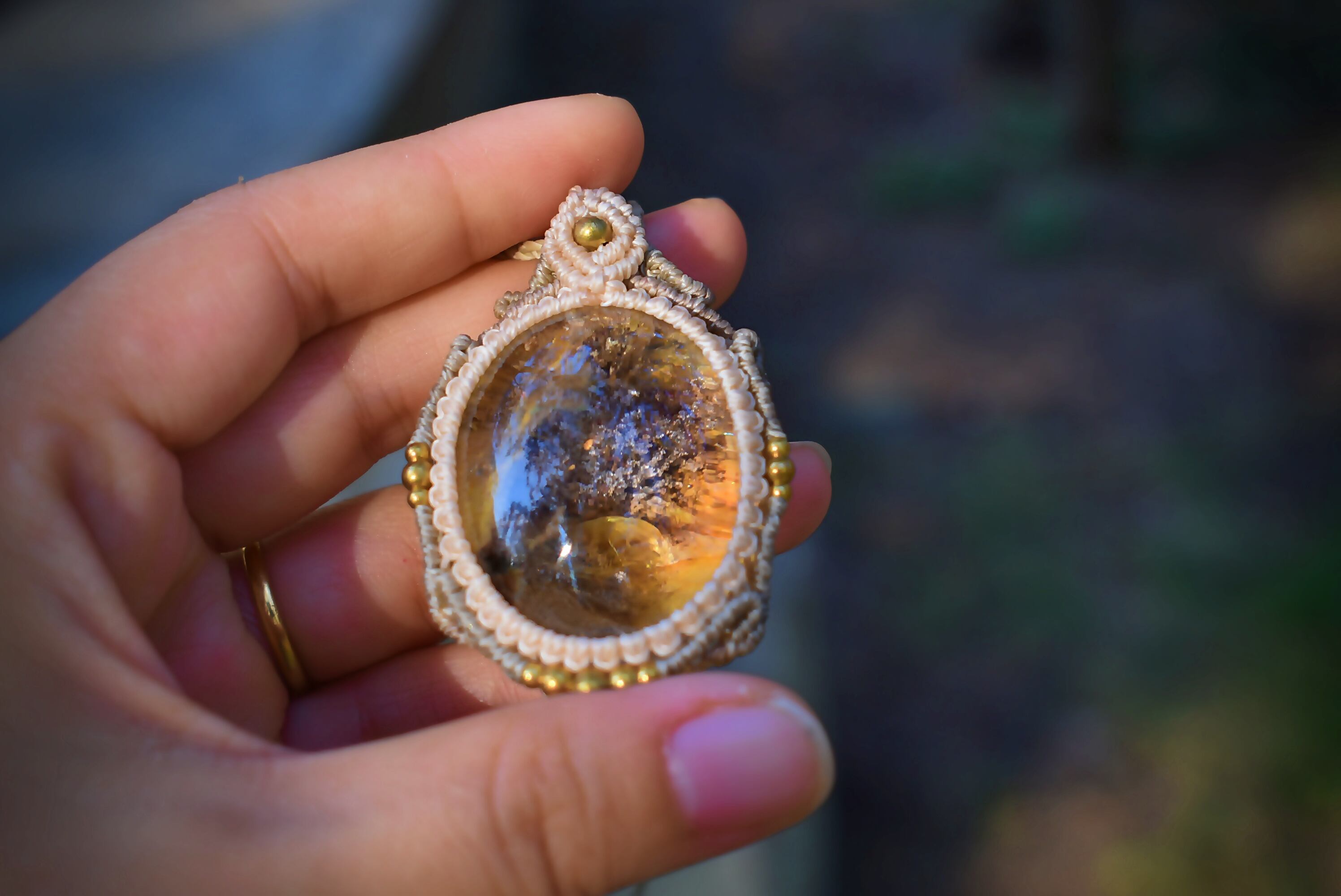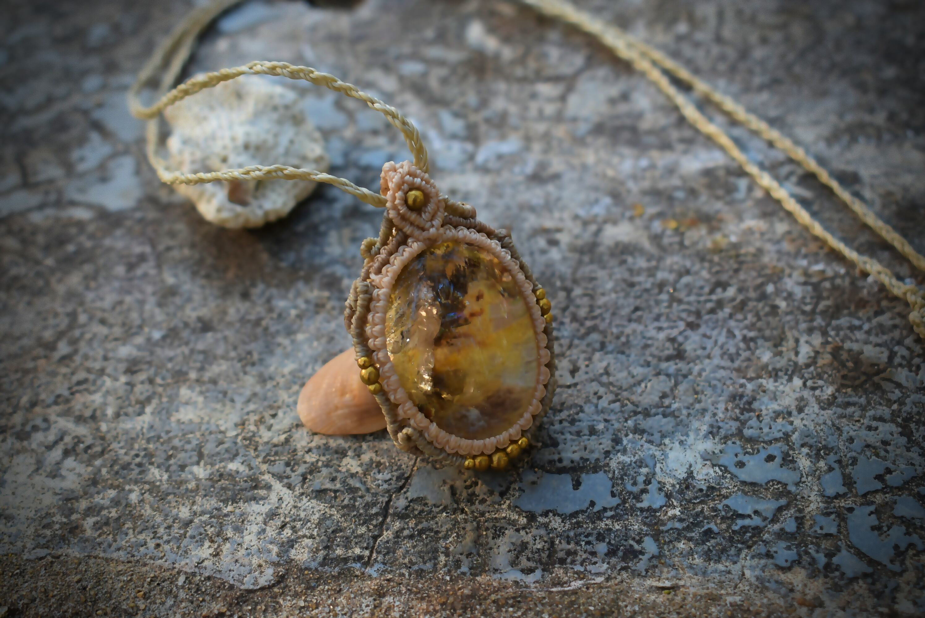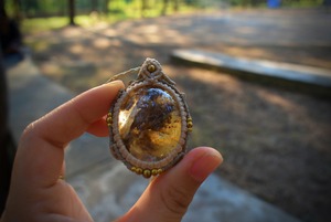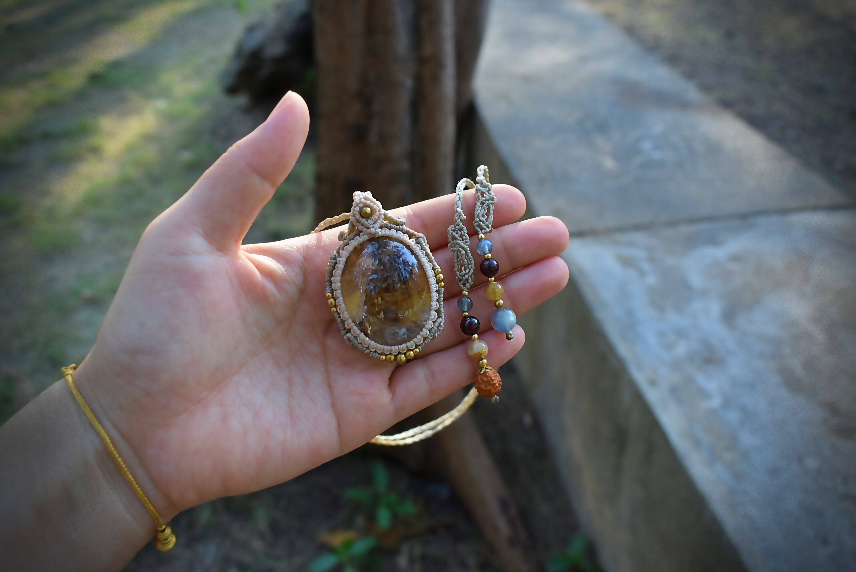 透明度も非常に美しく、個性的なピースを真鍮ビーズをアクセントにペンダントトップにマクラメ編み装飾を施しました。