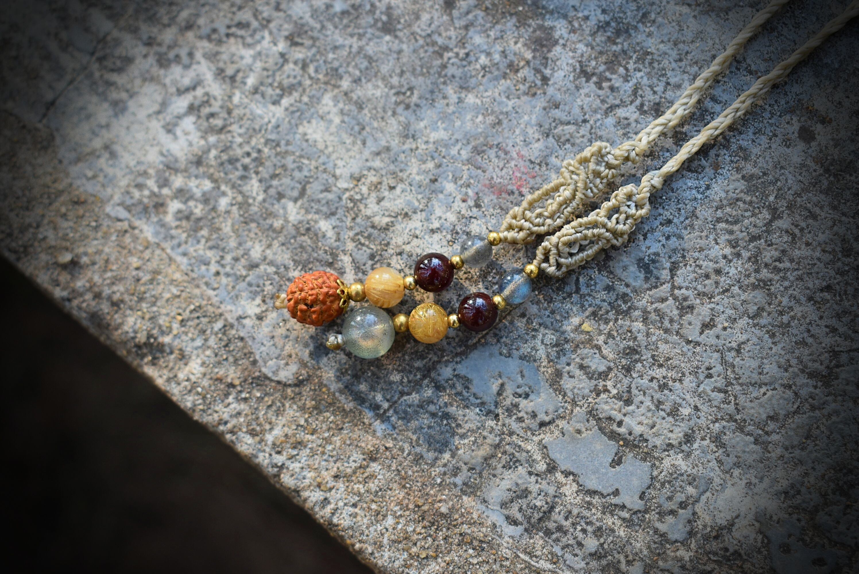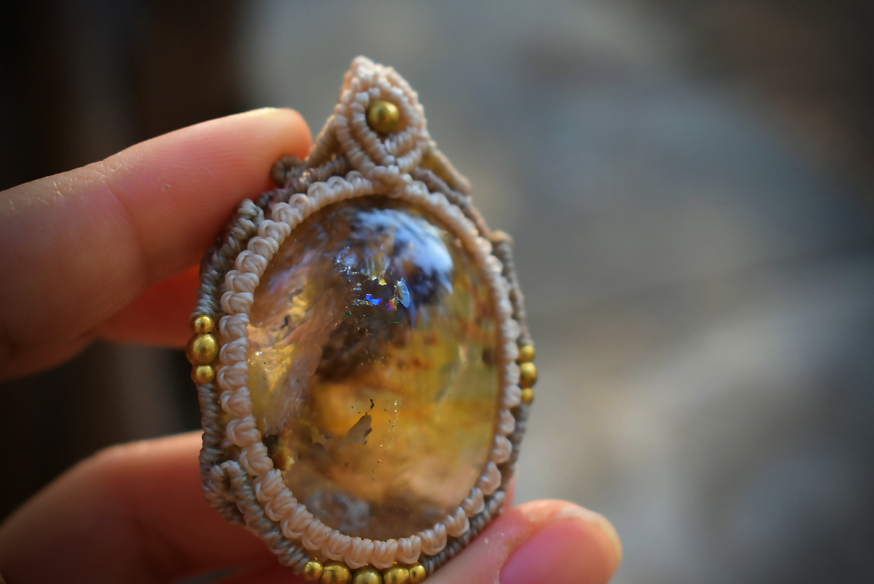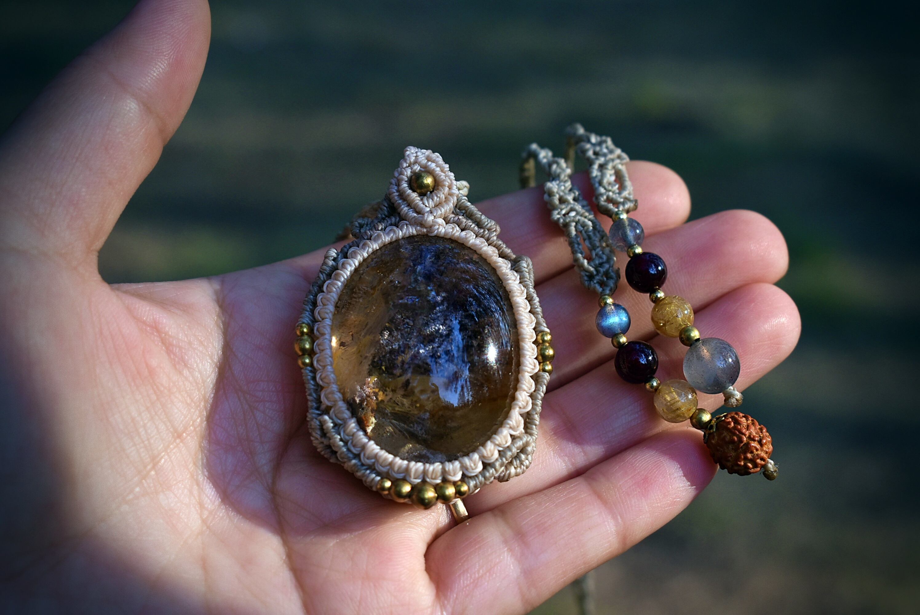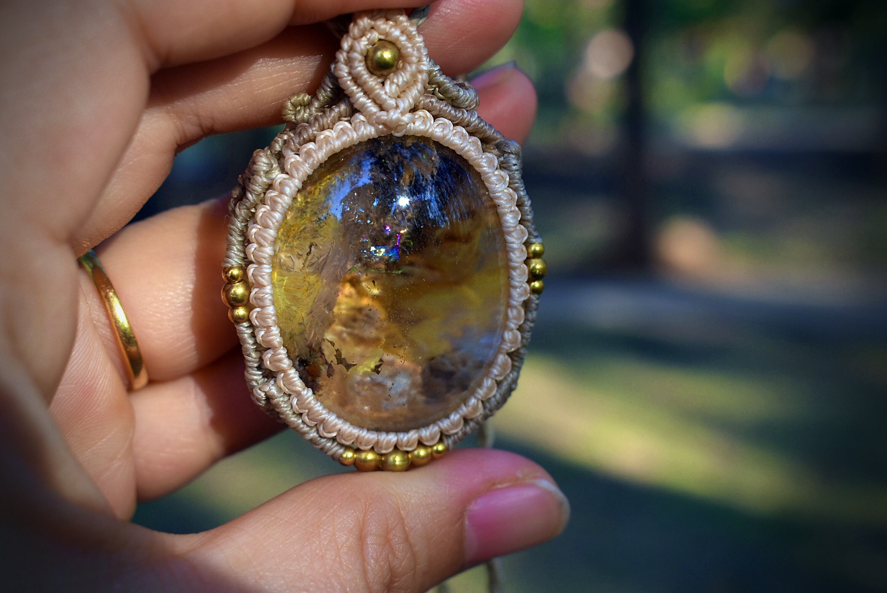 透明度も非常に美しく、個性的なピースを真鍮ビーズをアクセントにペンダントトップにマクラメ編み装飾を施しました。