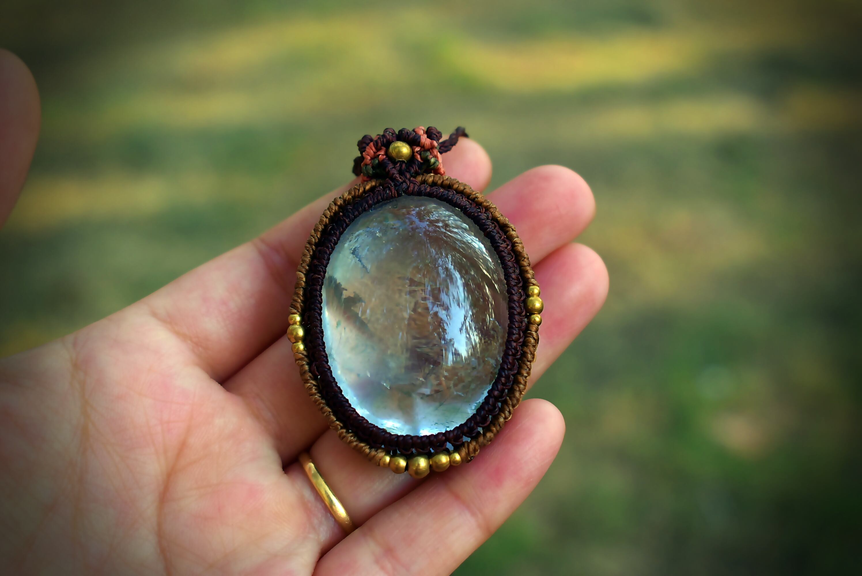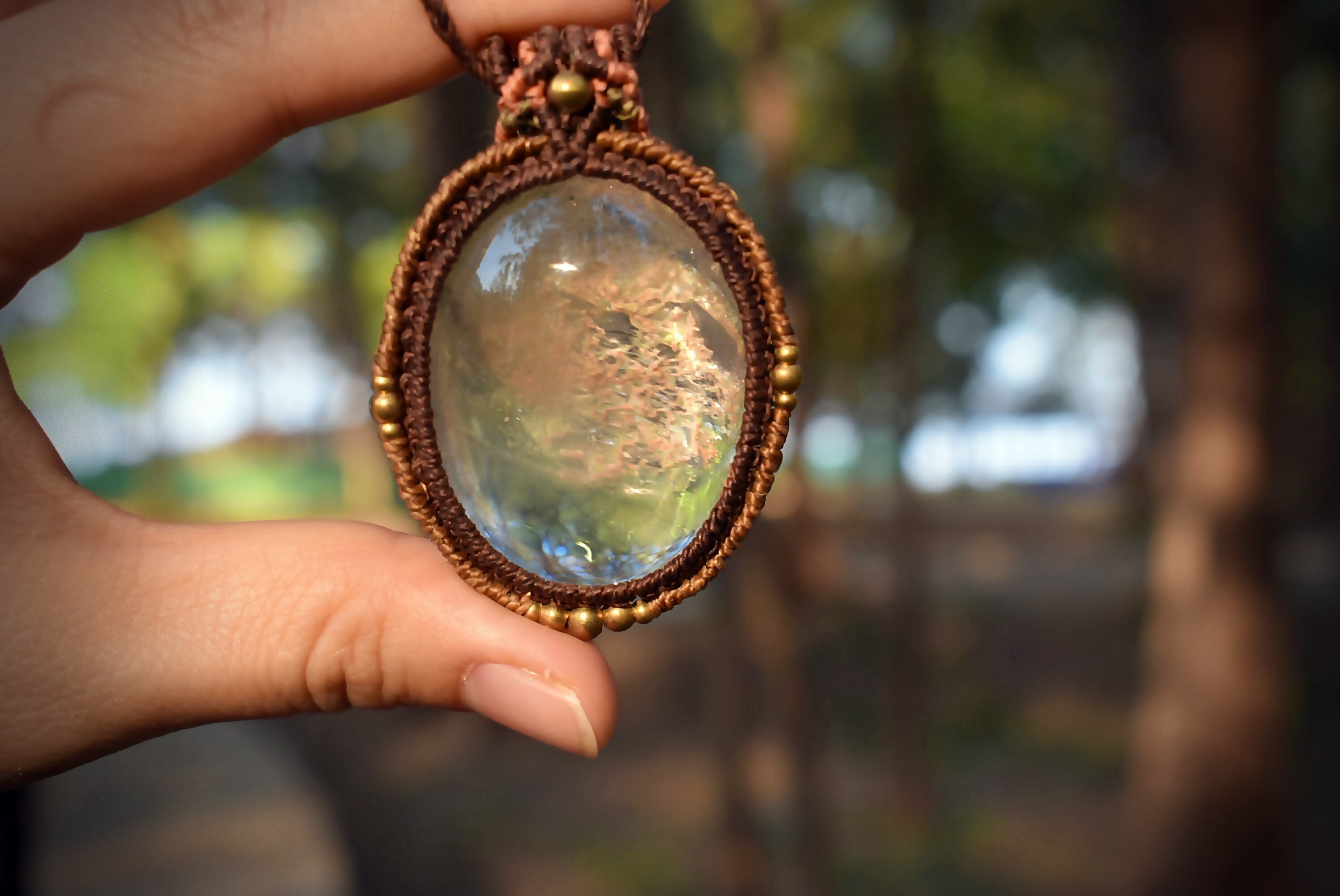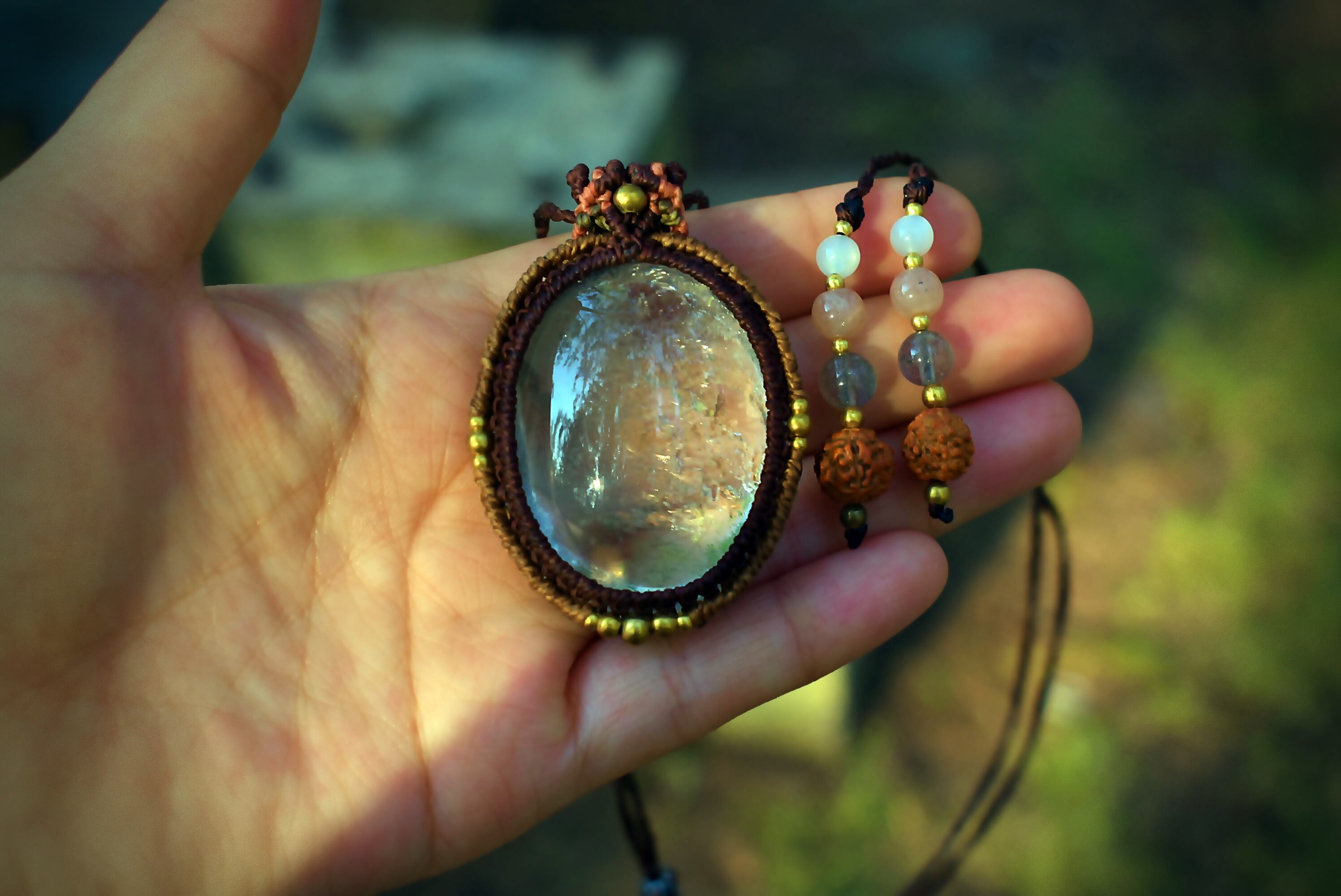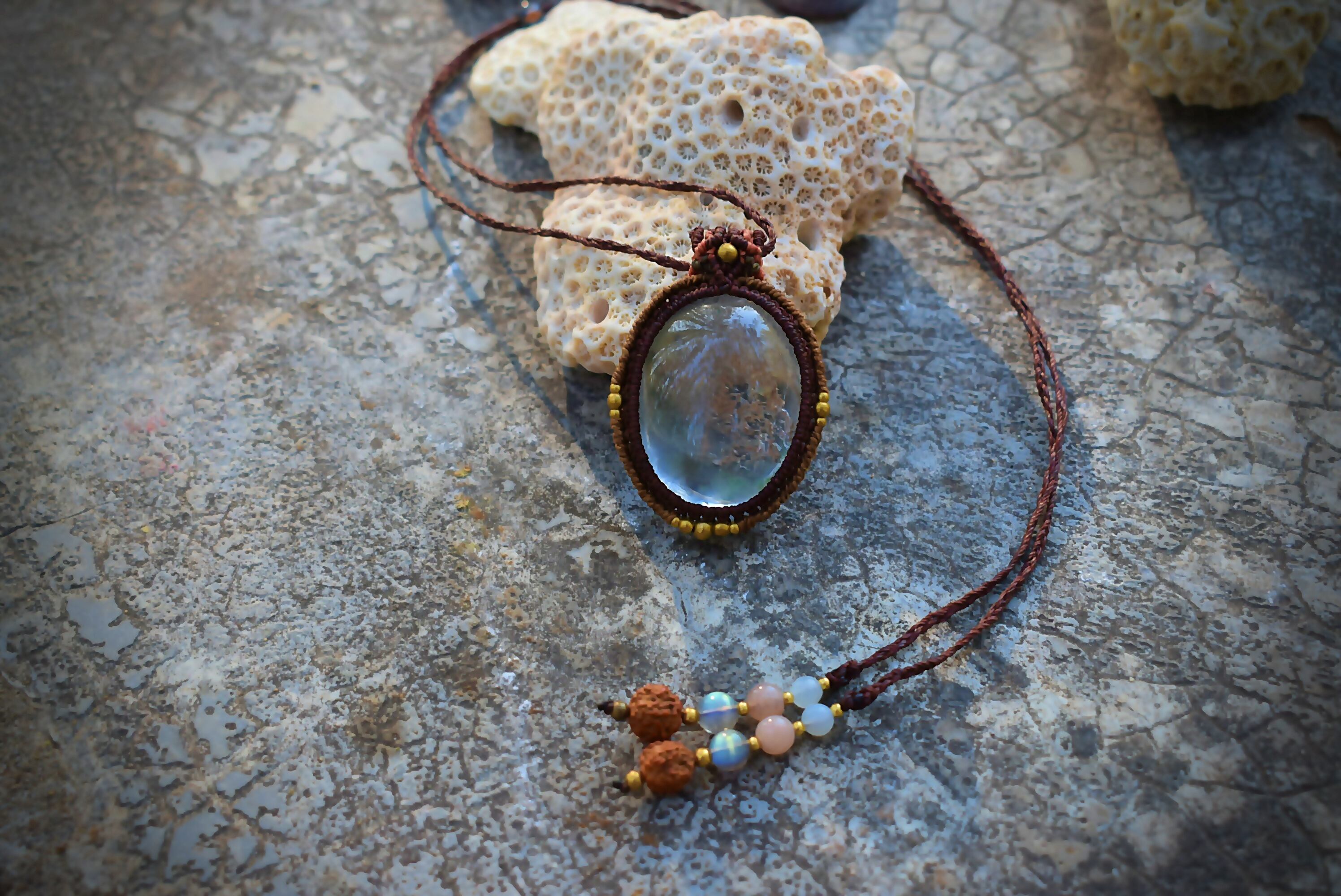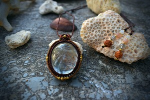 このたびのガーデンクォーツ は鱗のようなピンクカラーの石群野波とよく見るとクォーツインクォーツとも言える石の成長、そしてうっすらとルチルが成長している過程を見てとることができるとても不思議で美しい色味のガーデンクォーツのひとつをマクラメ編み装飾をシンプルに施して仕上げました。