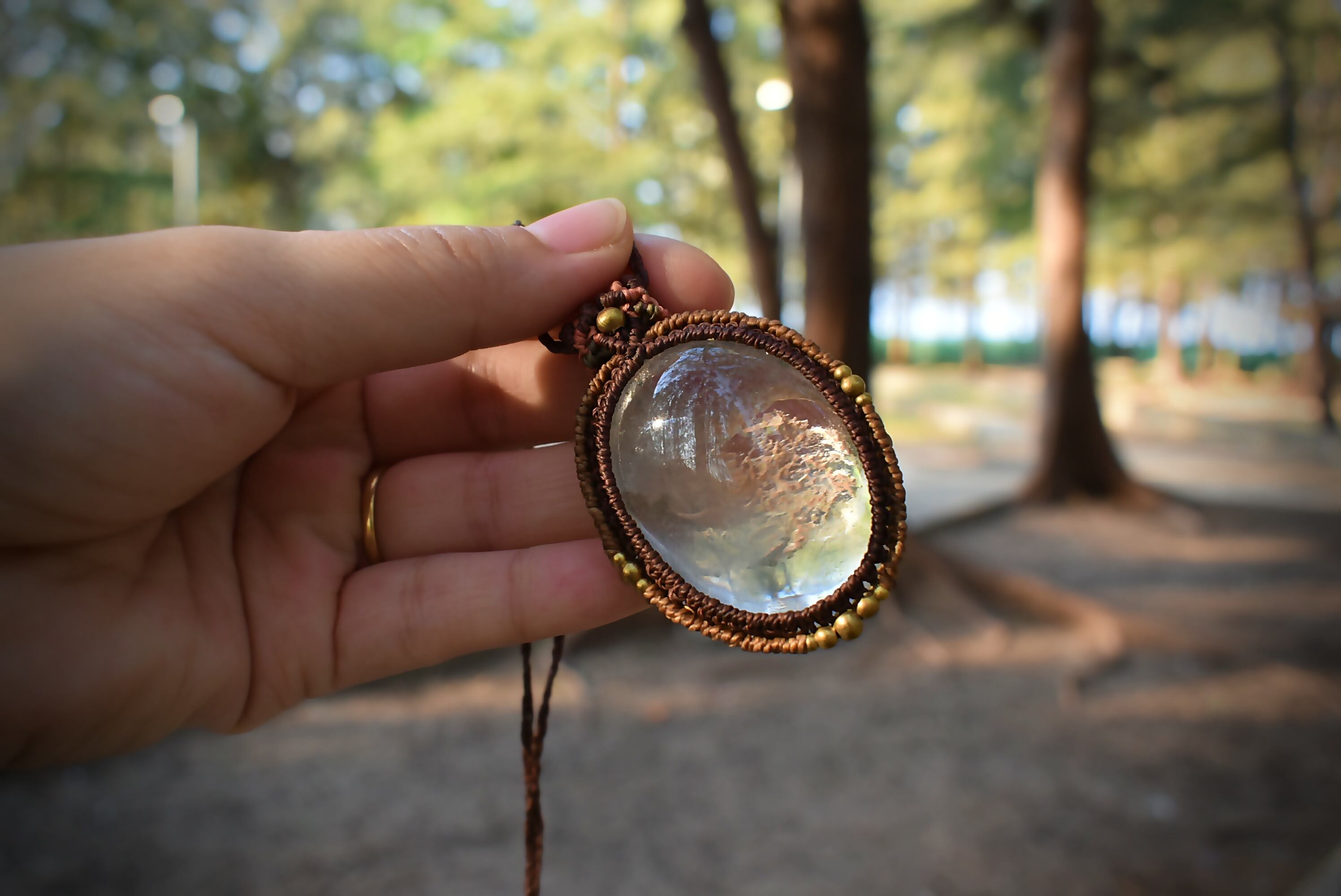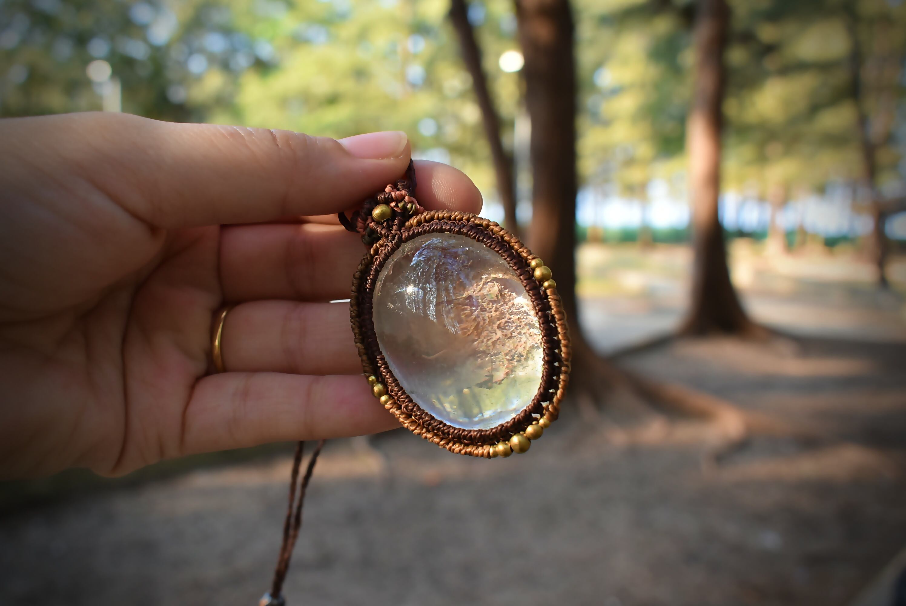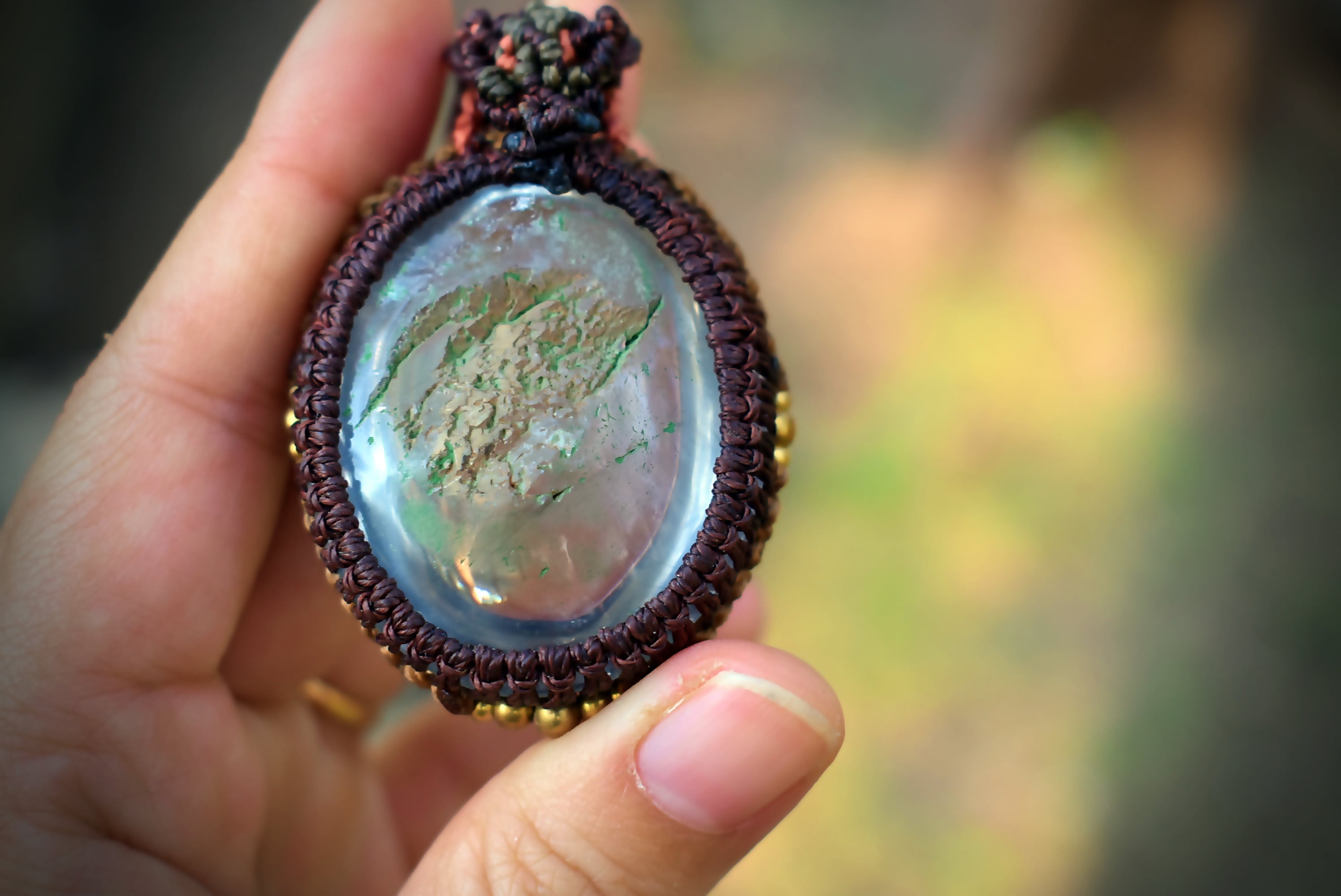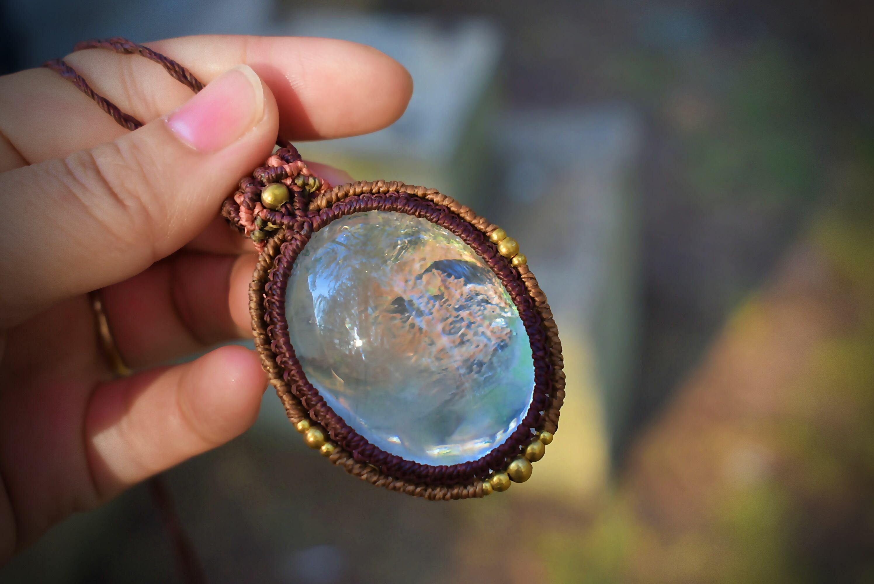 ◆このたびはコーヒーブラウン、ゴールドブラウン、差し色としてサンセットの3色の蝋引き糸を使用しマクラメ編み装飾を施しました。
