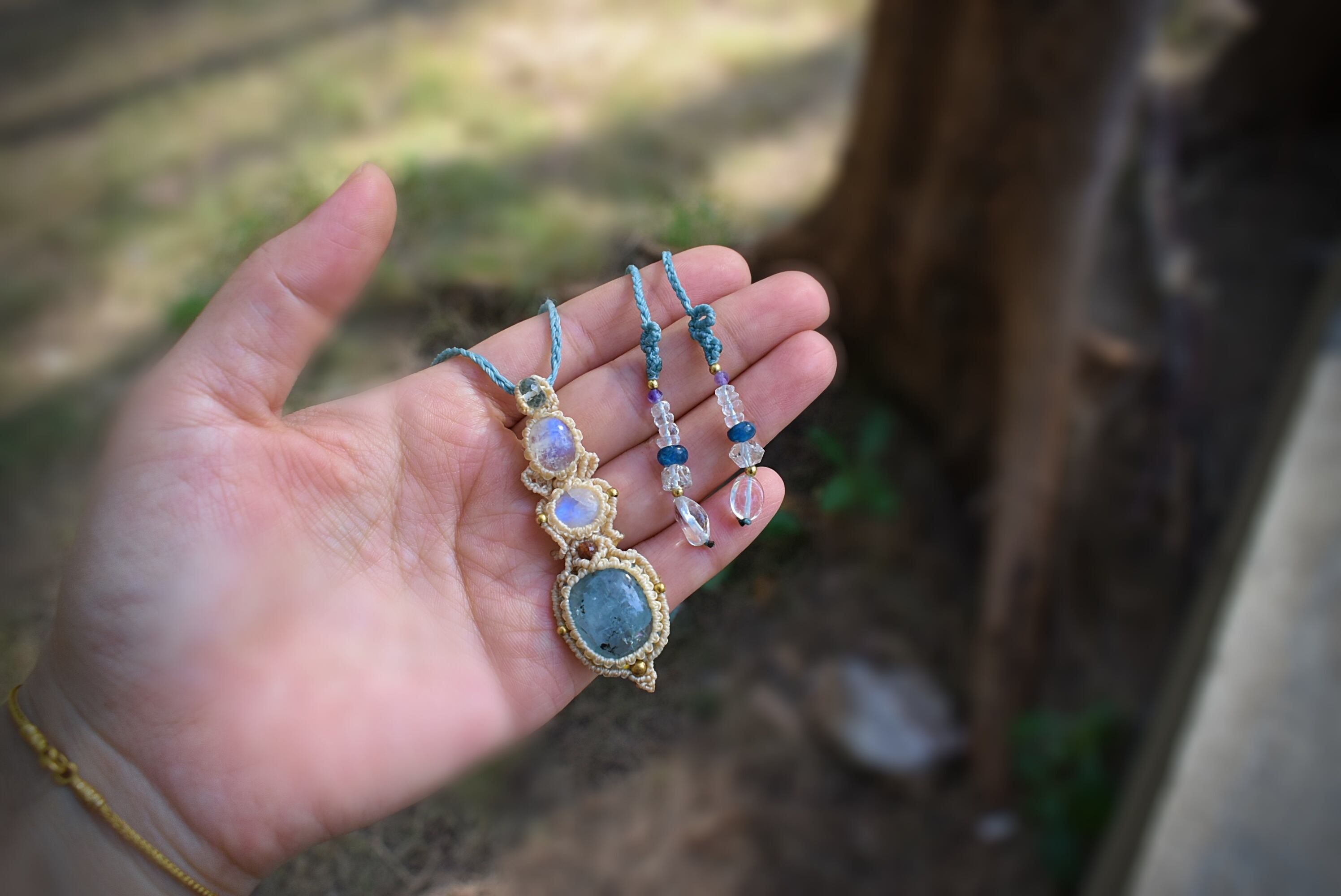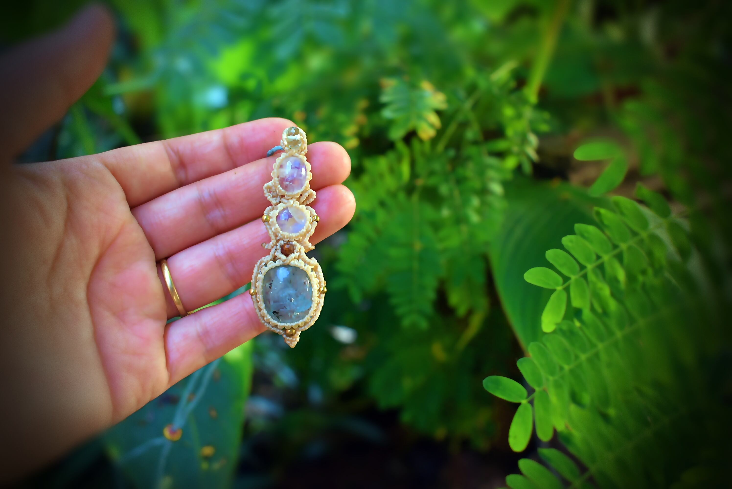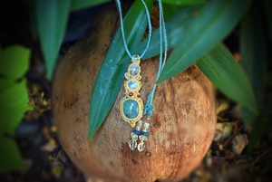 3つの石が愛らしく共鳴し合う姿にマクラメ編み装飾をエキゾチックにシンプルに編み込みました。