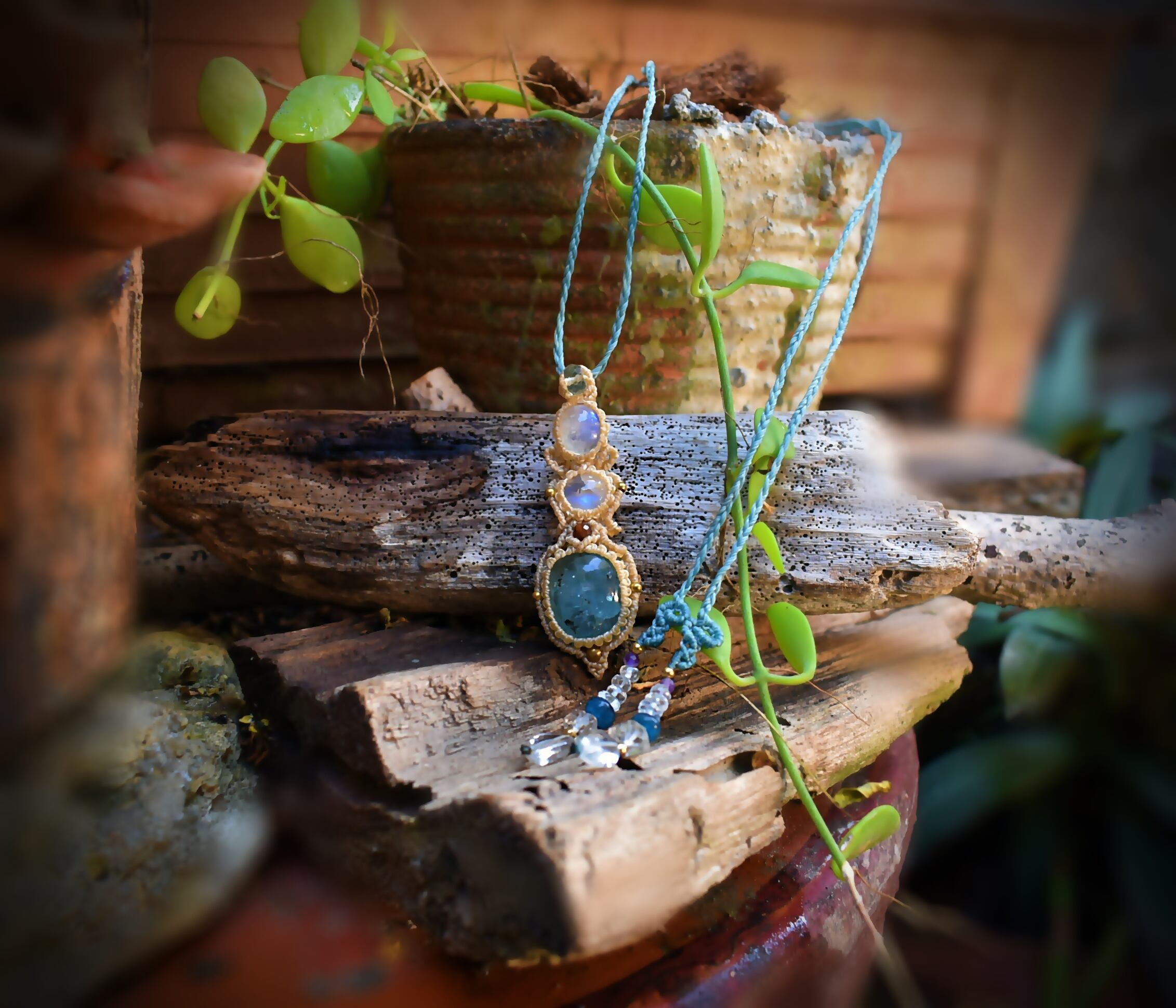 なかでもこのたびのレインボームーンストーン、透明感と淡い色味を持つものに重視した選りすぐりの石たち。一番下の土台となるアクアマリンはもちろん天然色のブルーが濃い色味の透明感溢れるアクアマリンを使用。
