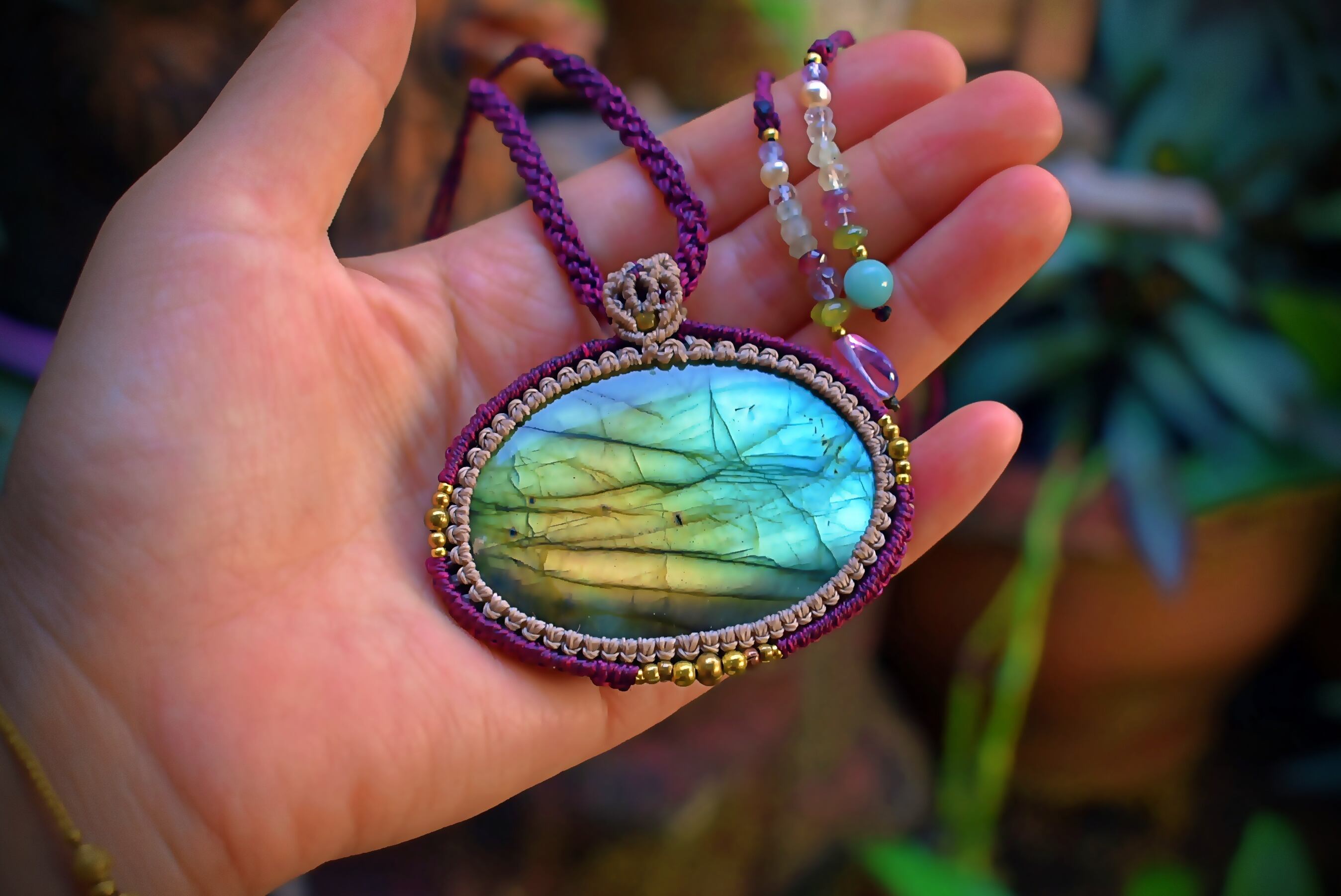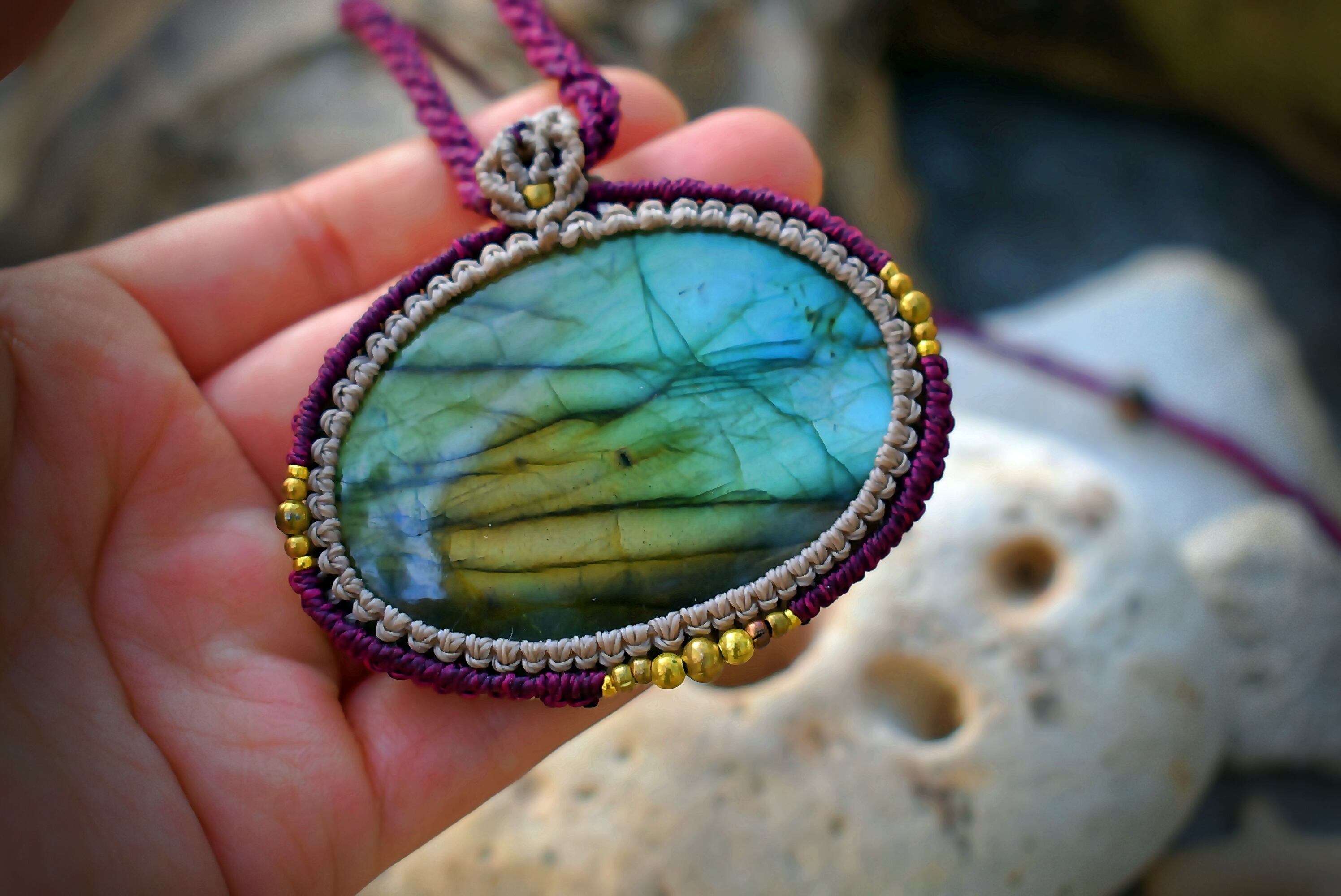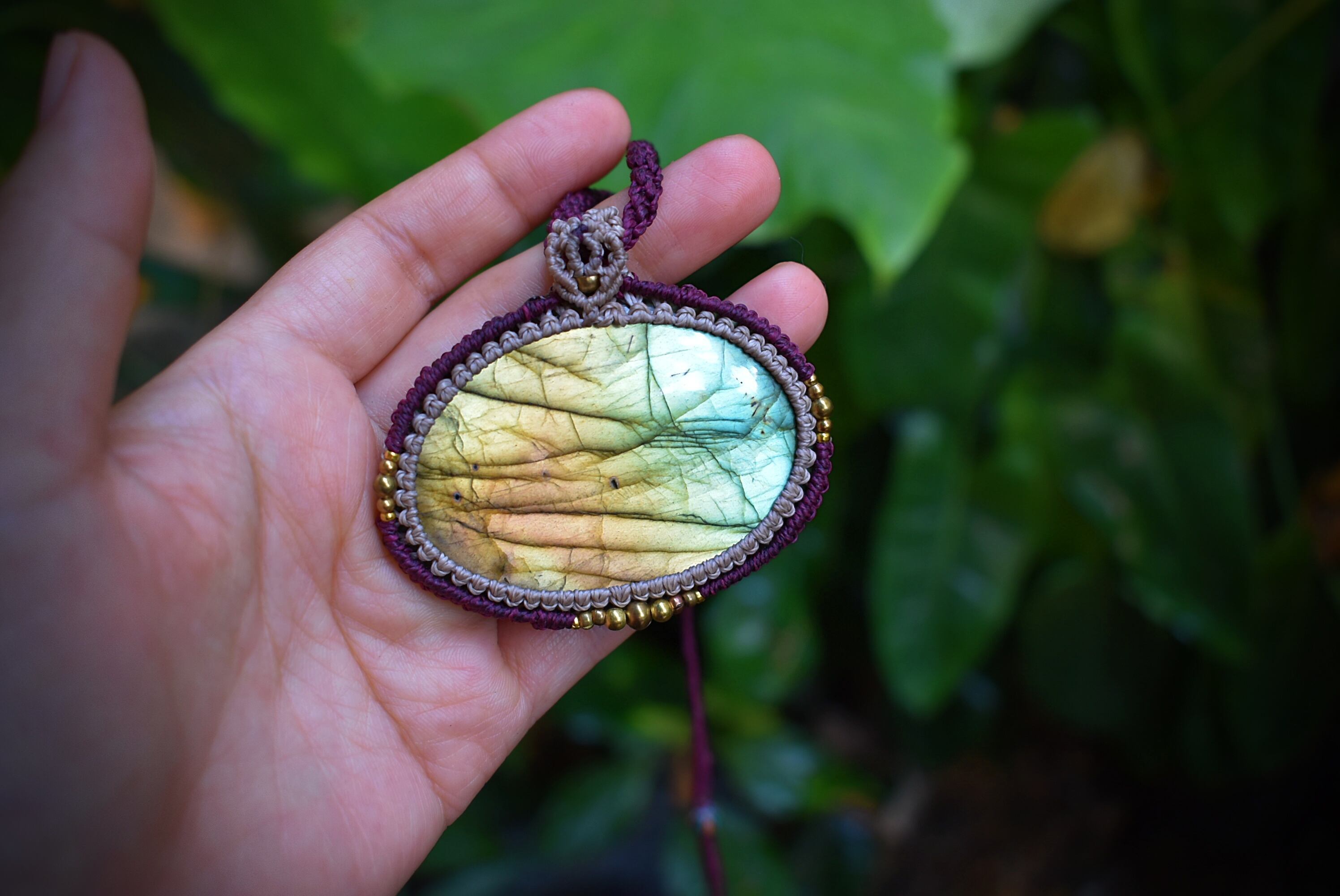 美しい虹色を放つ大ぶりなラブラドライトに出会うことができたので、シンプルにマクラメ編み装飾を施してペンダントに仕上げました。