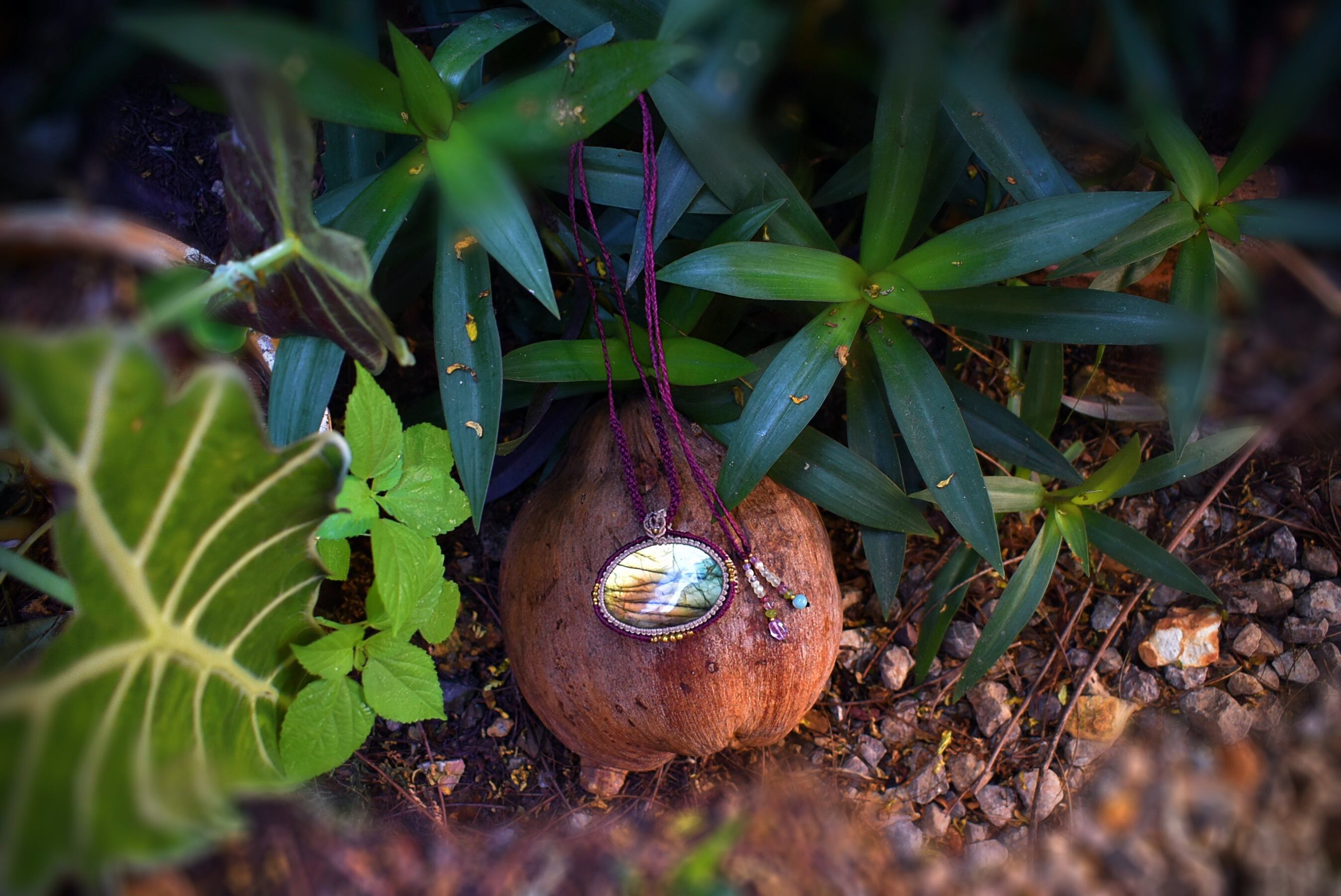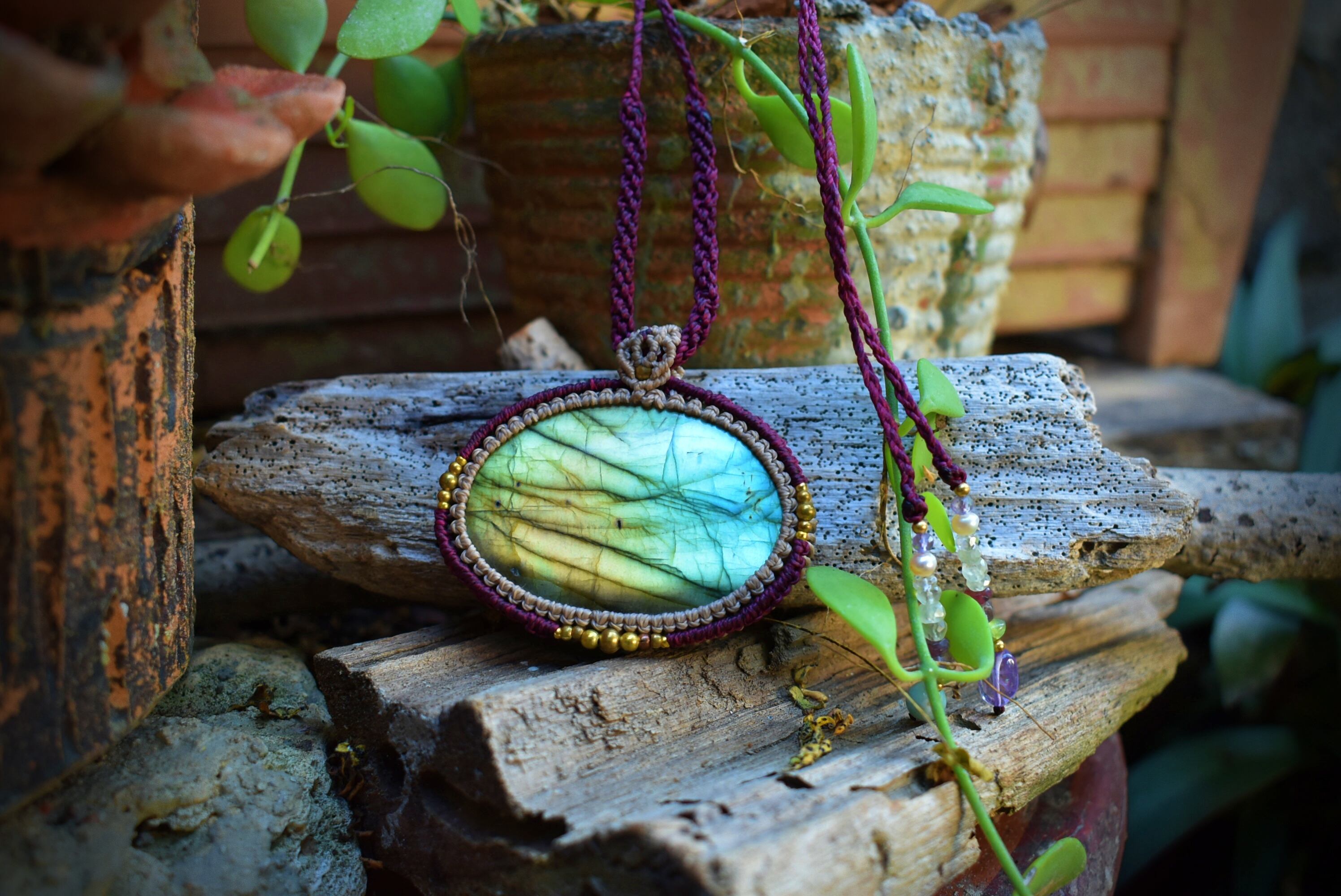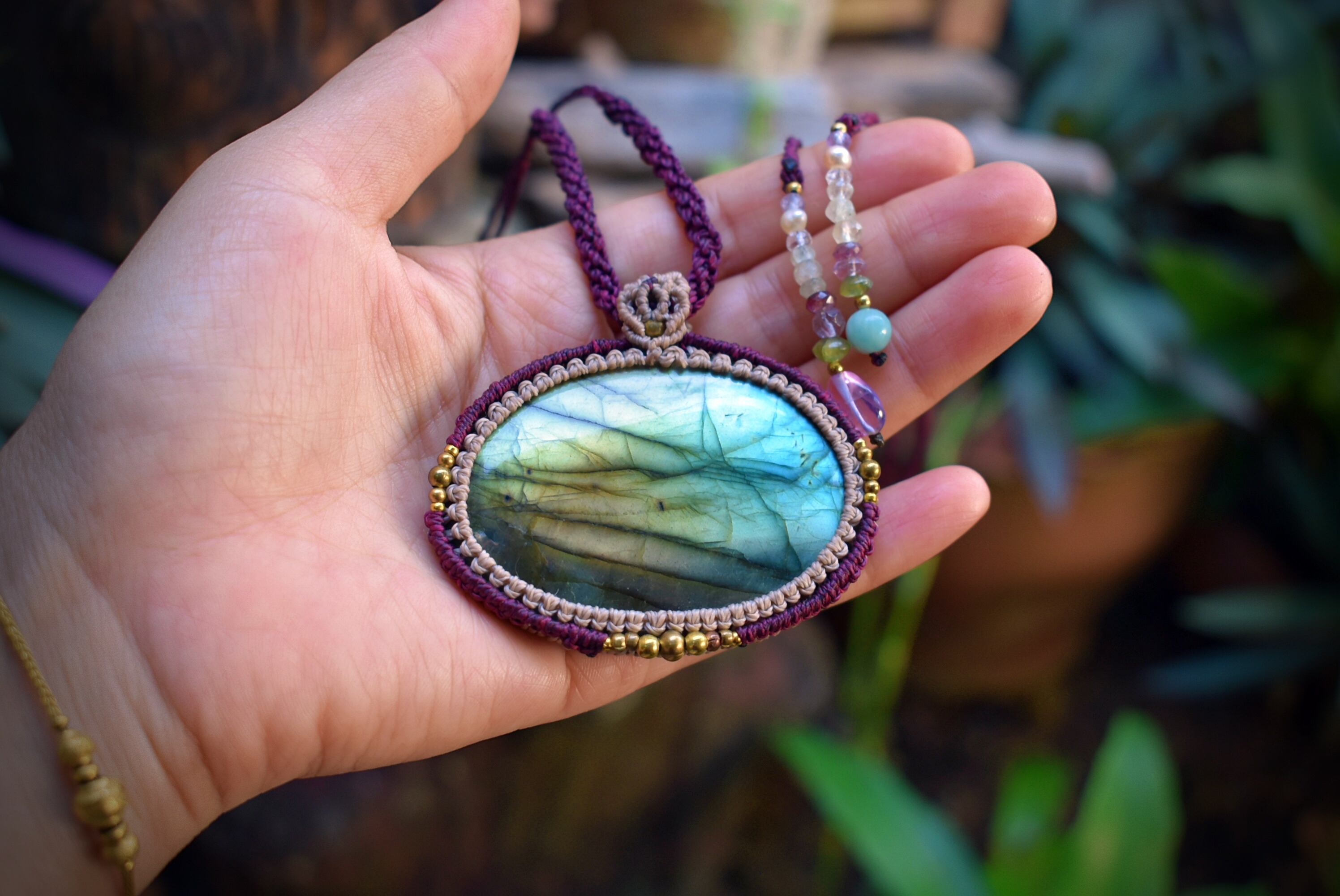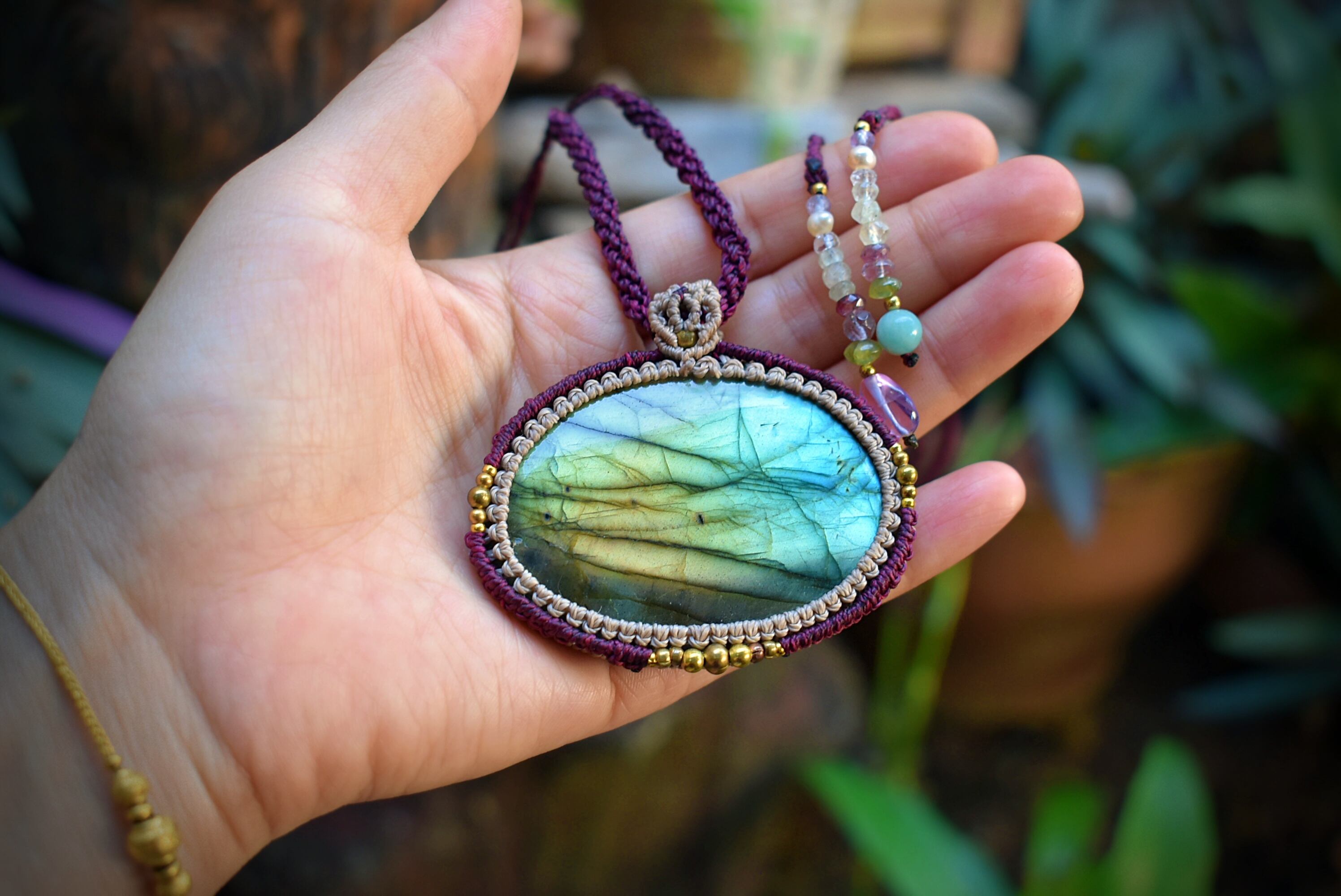 美しい虹色を放つ大ぶりなラブラドライトに出会うことができたので、シンプルにマクラメ編み装飾を施してペンダントに仕上げました。