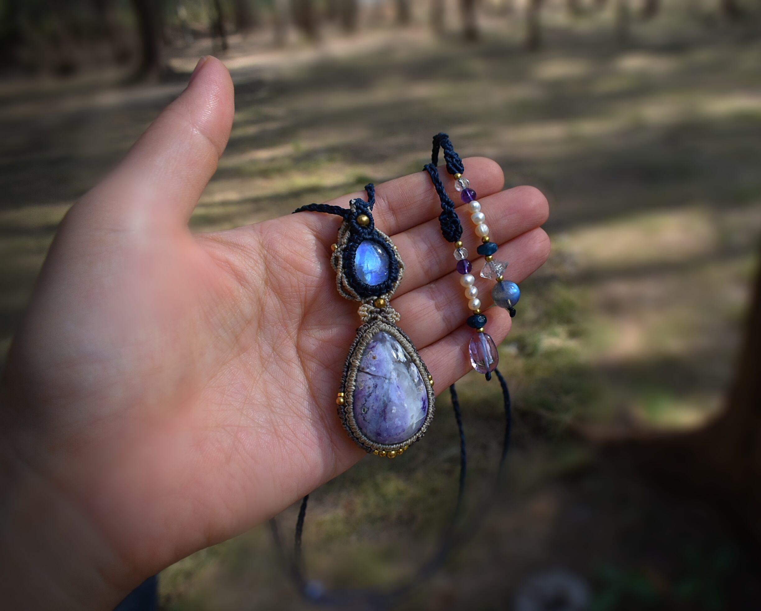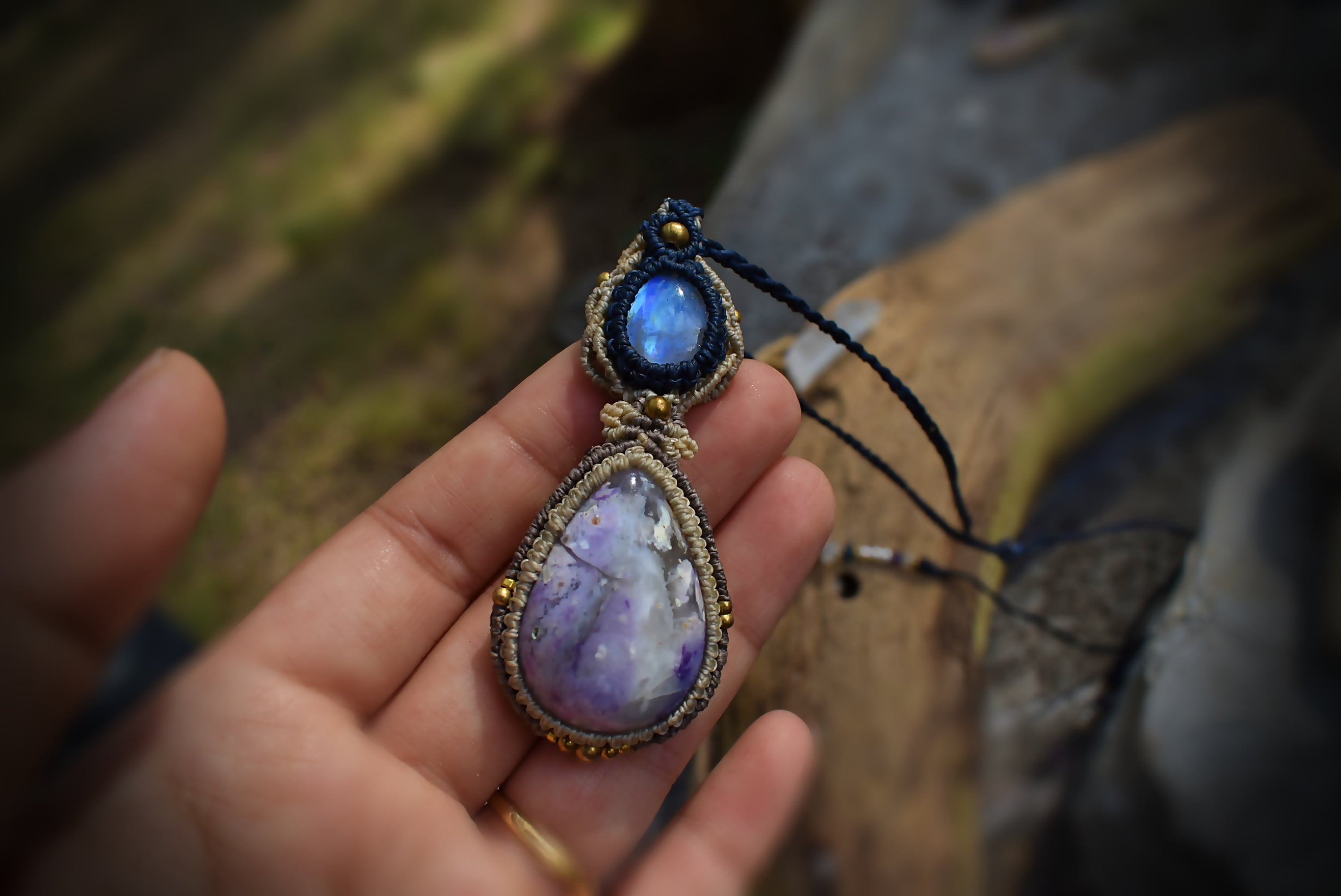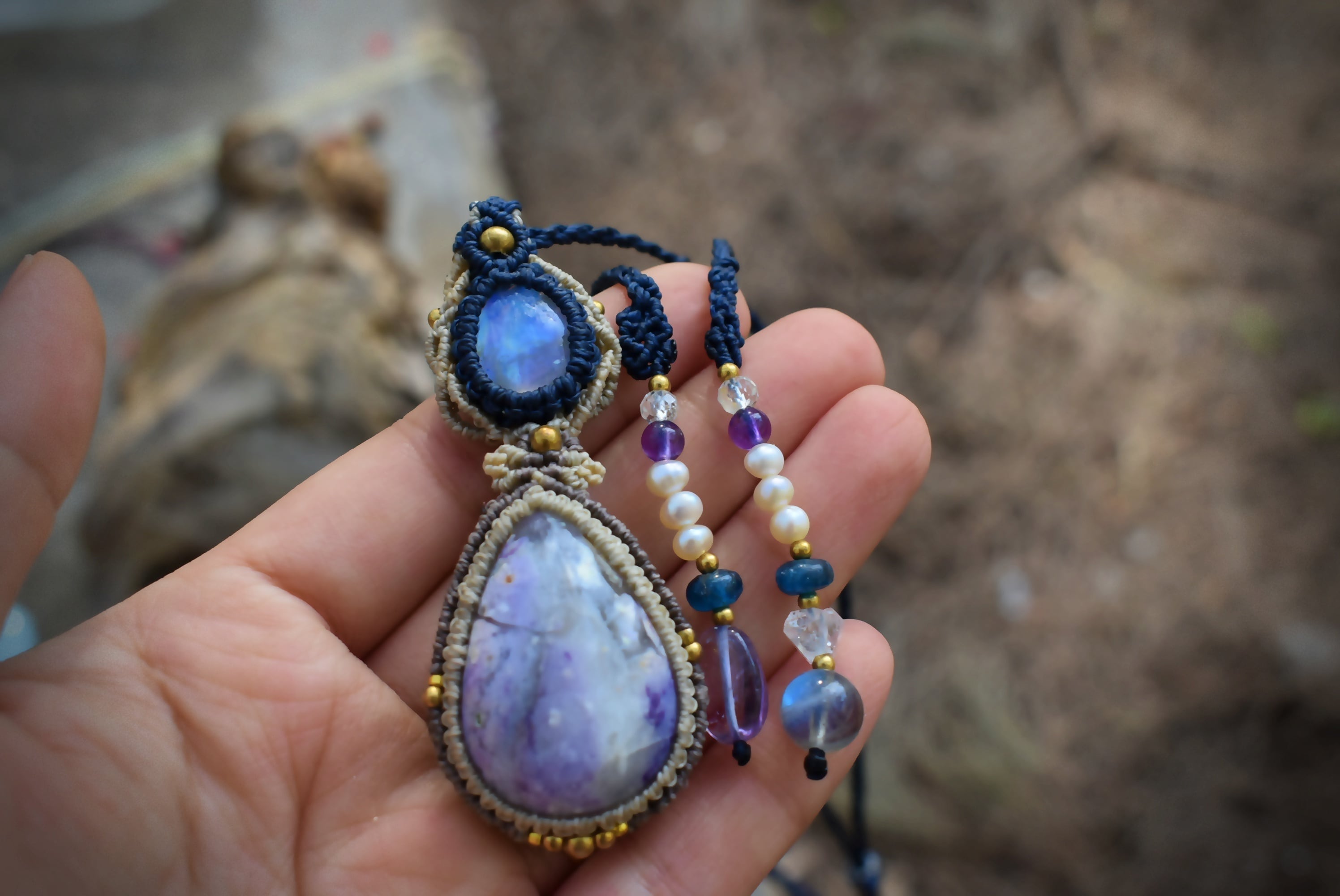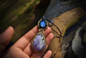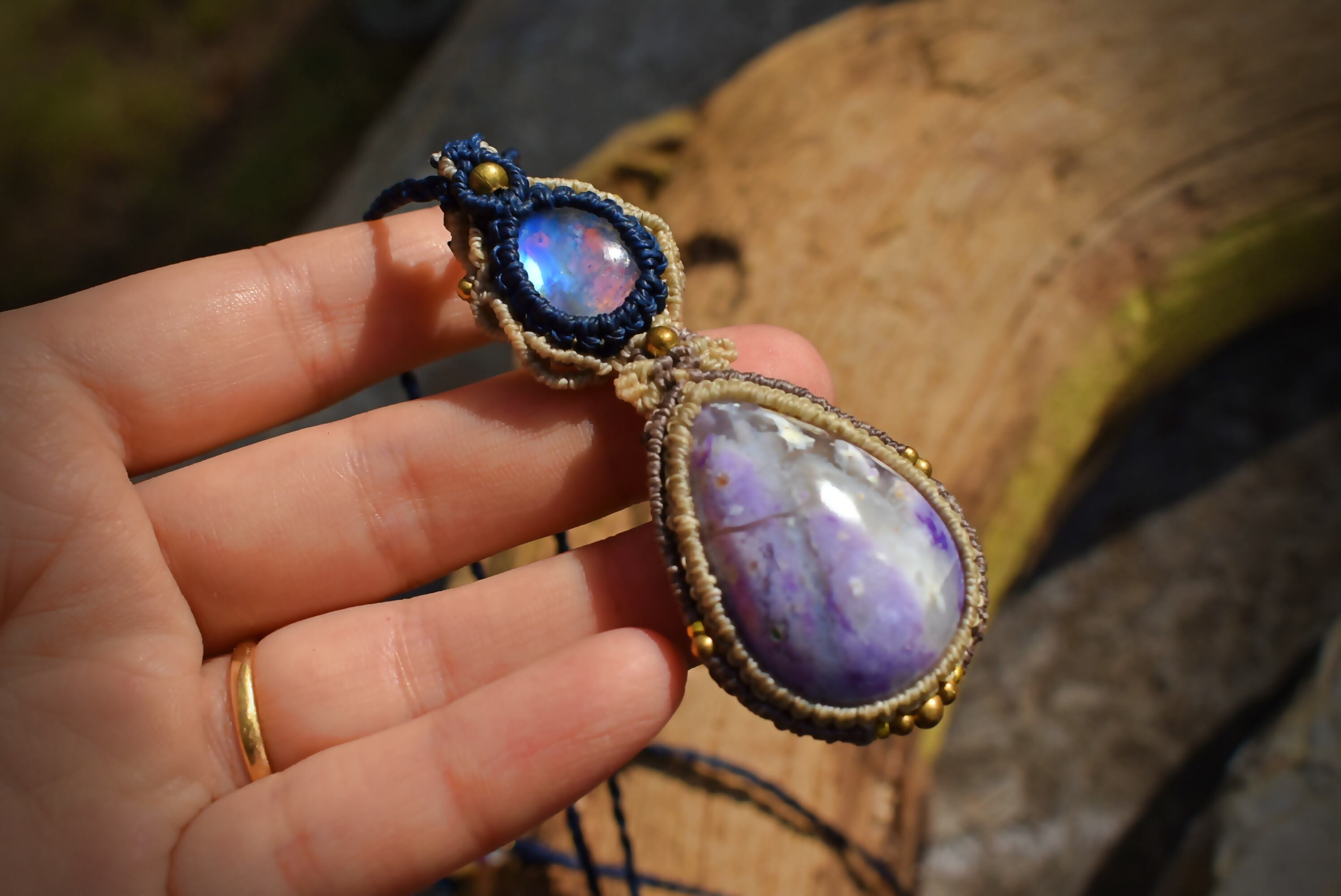 幻想の世界★パープルオパールと虹ムーンストーン マクラメペンダント
