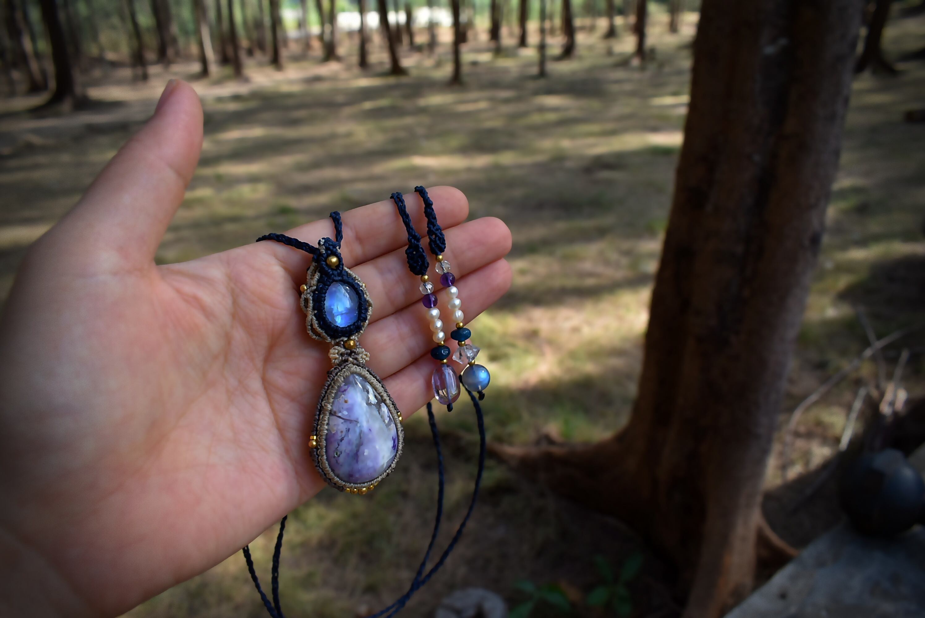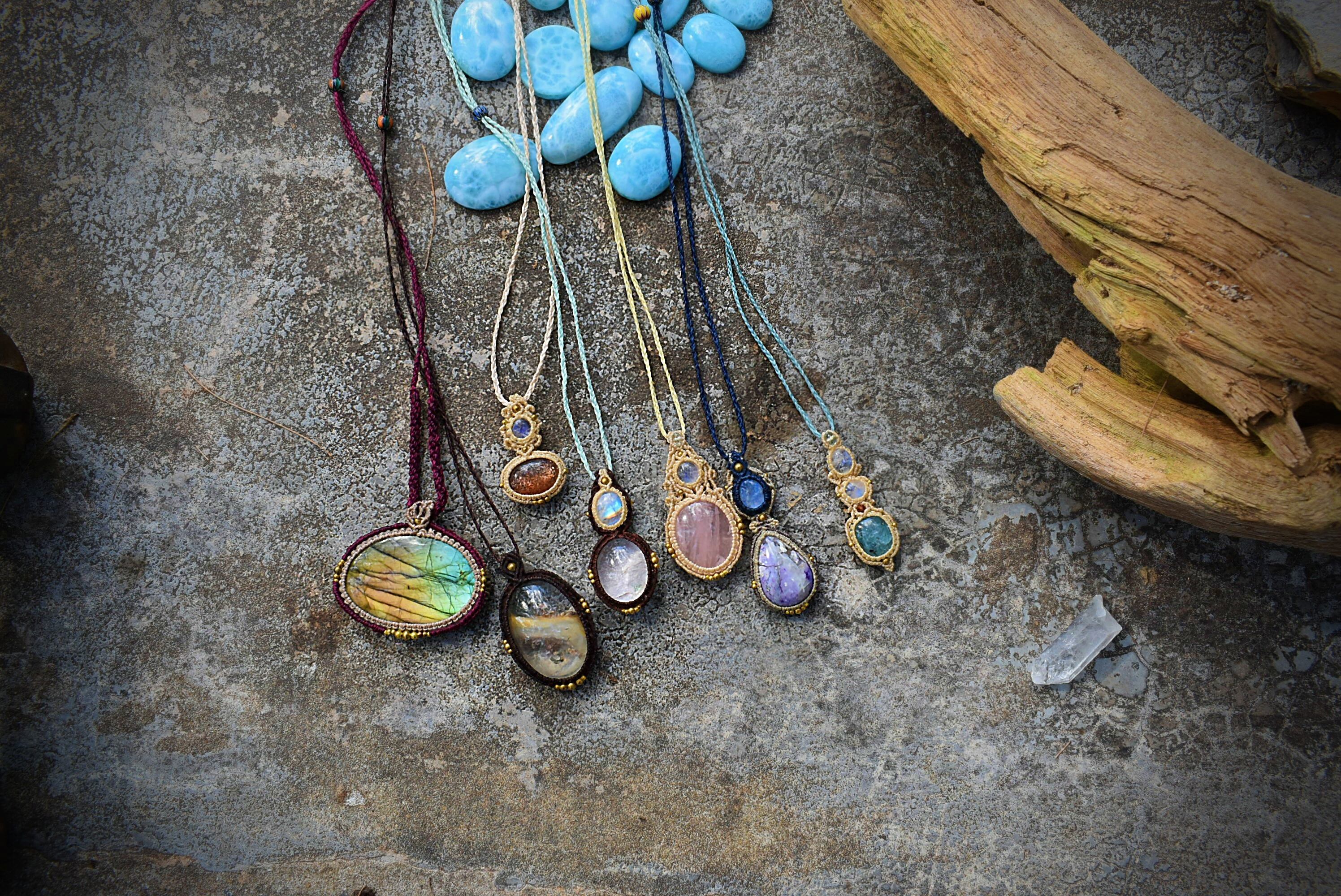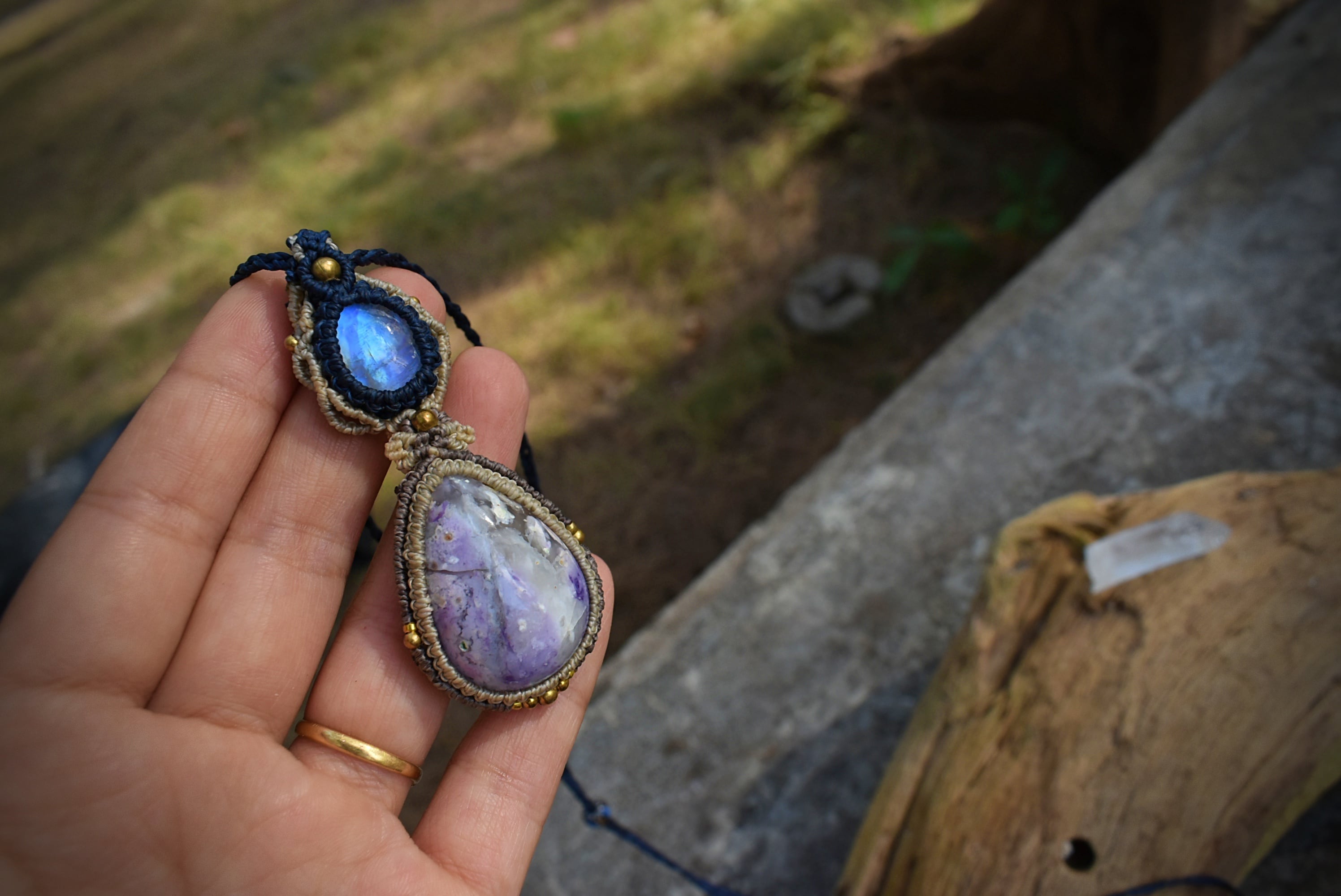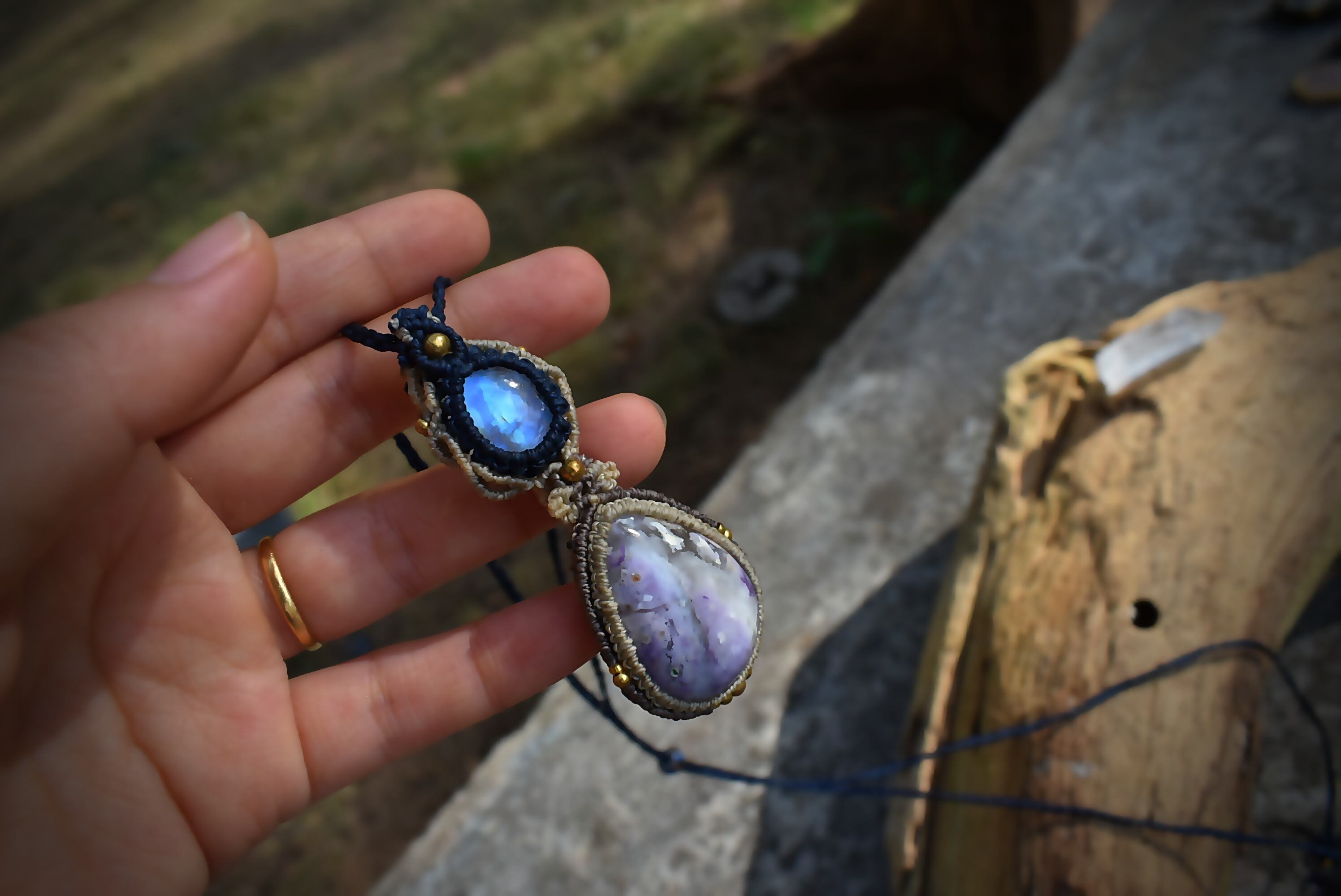 どちらの石も非常に主張が強く、それでいて研磨も素晴らしく、美しい石たちです。この石たちを大切にマクラメ編み装飾を施し、ペンダントに仕上げました。