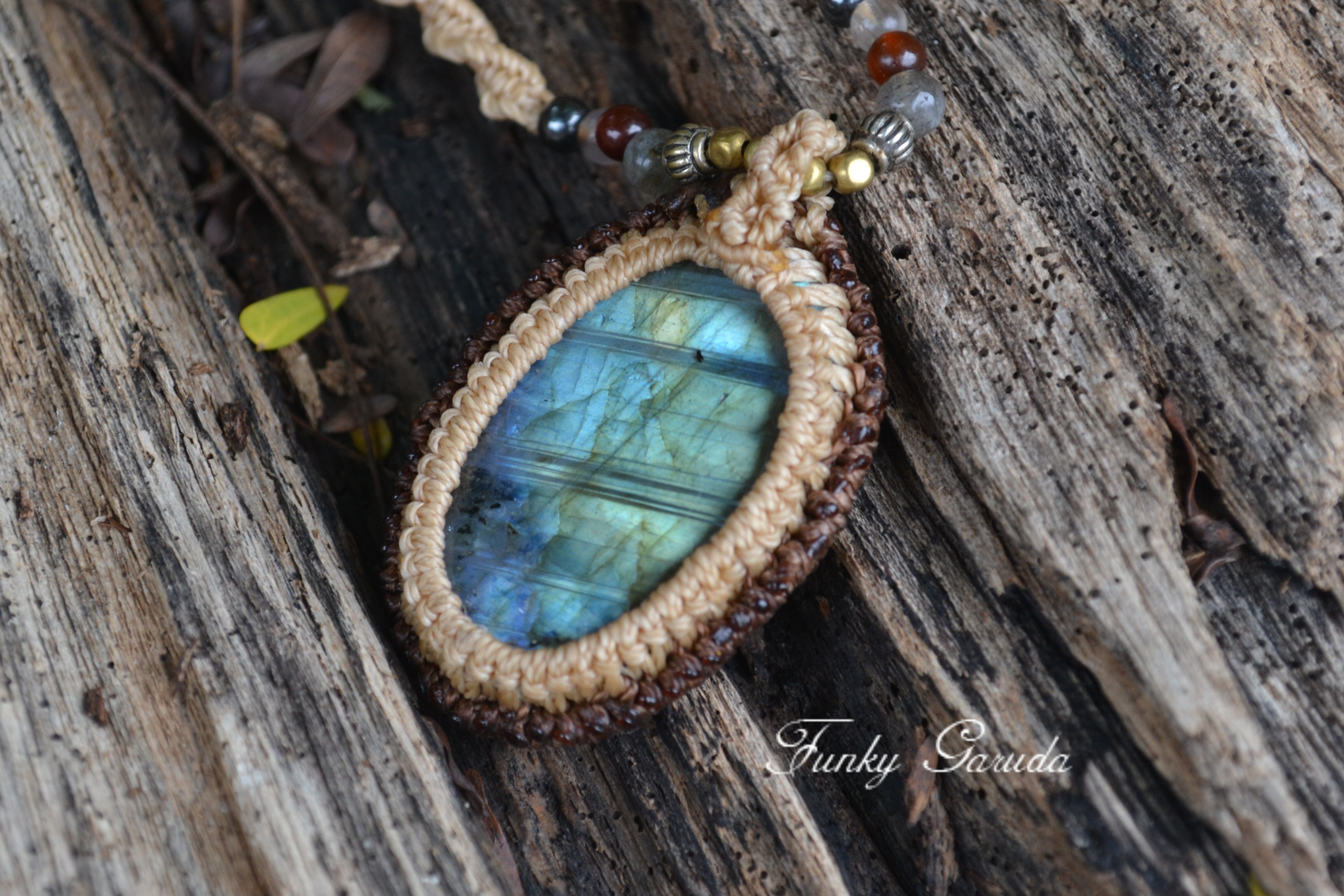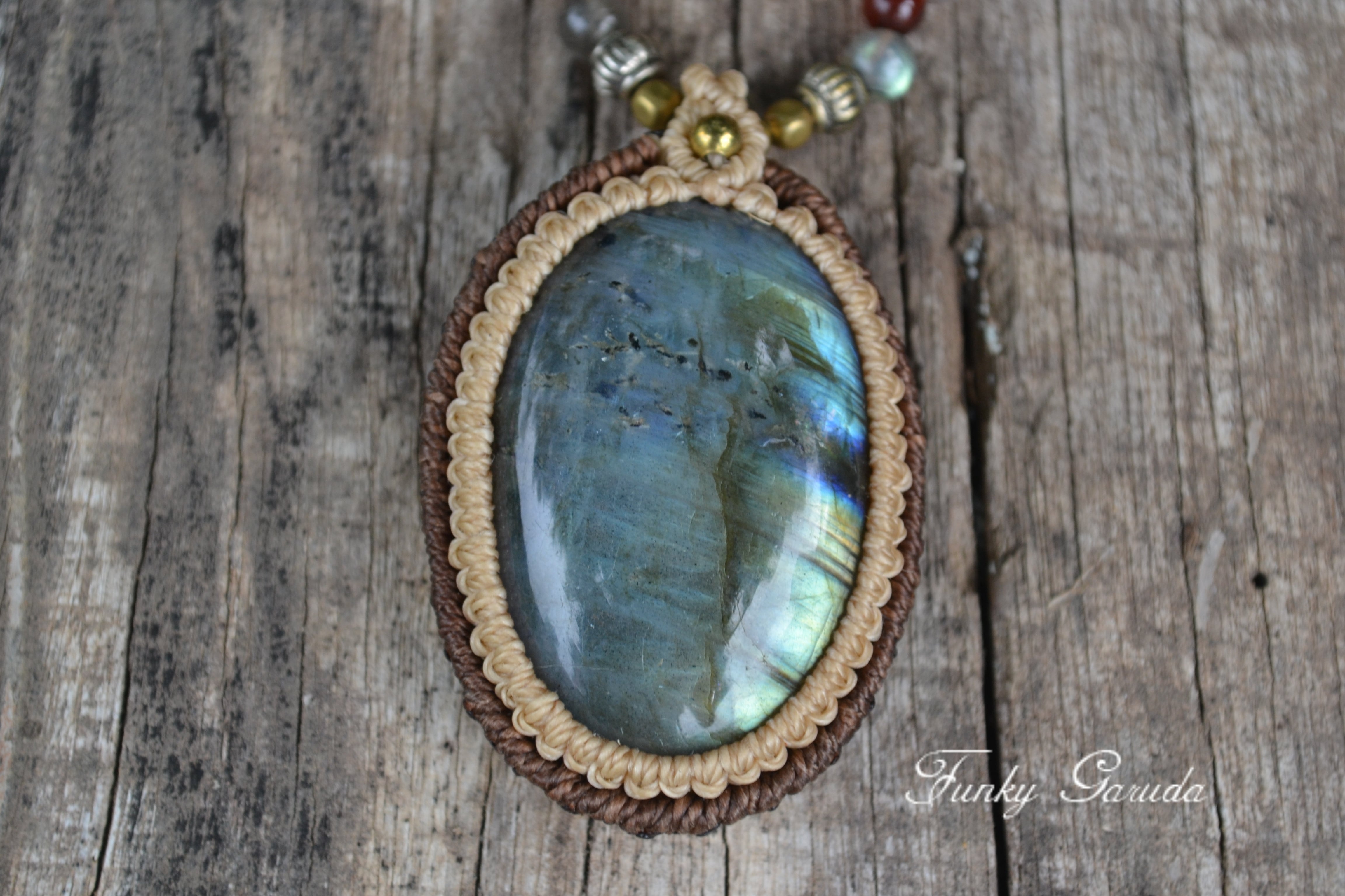 角度によっていろいろな姿を見せてくれる、ラブラドライトをペンダント型にマクラメ編み装飾しました。