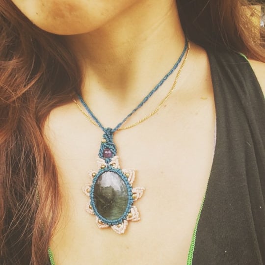 エンド部分も後ろから見てさりげなく、ネックレスを演出できるようにアゲートビーズ、真鍮パーツを編み込んで仕上げました。