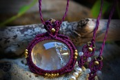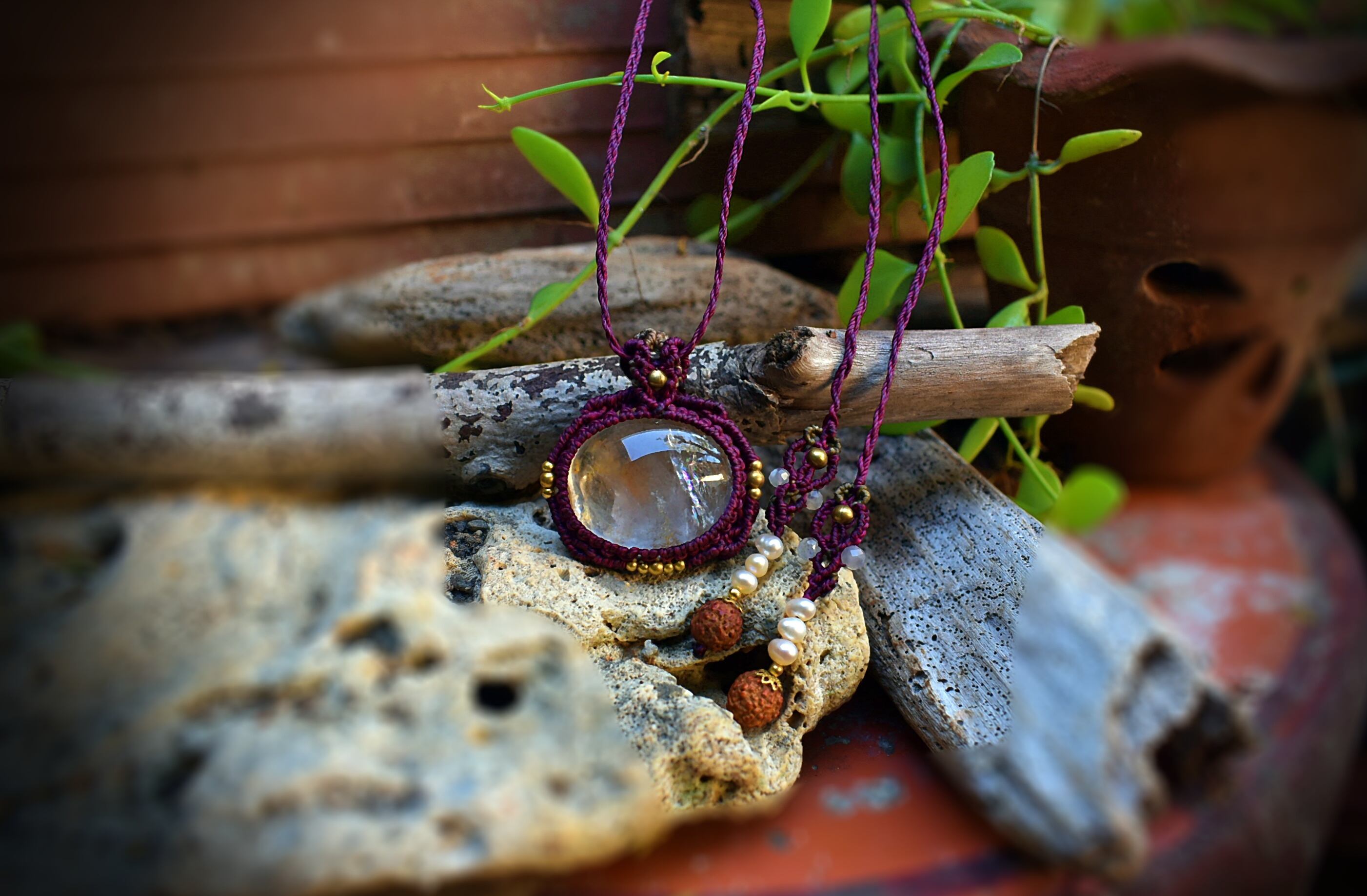 この石の周りに真鍮ビーズをアクセントに一緒に編み込んで、ペンダントに紋章をイメージしてマクラメ編み装飾を施しました。