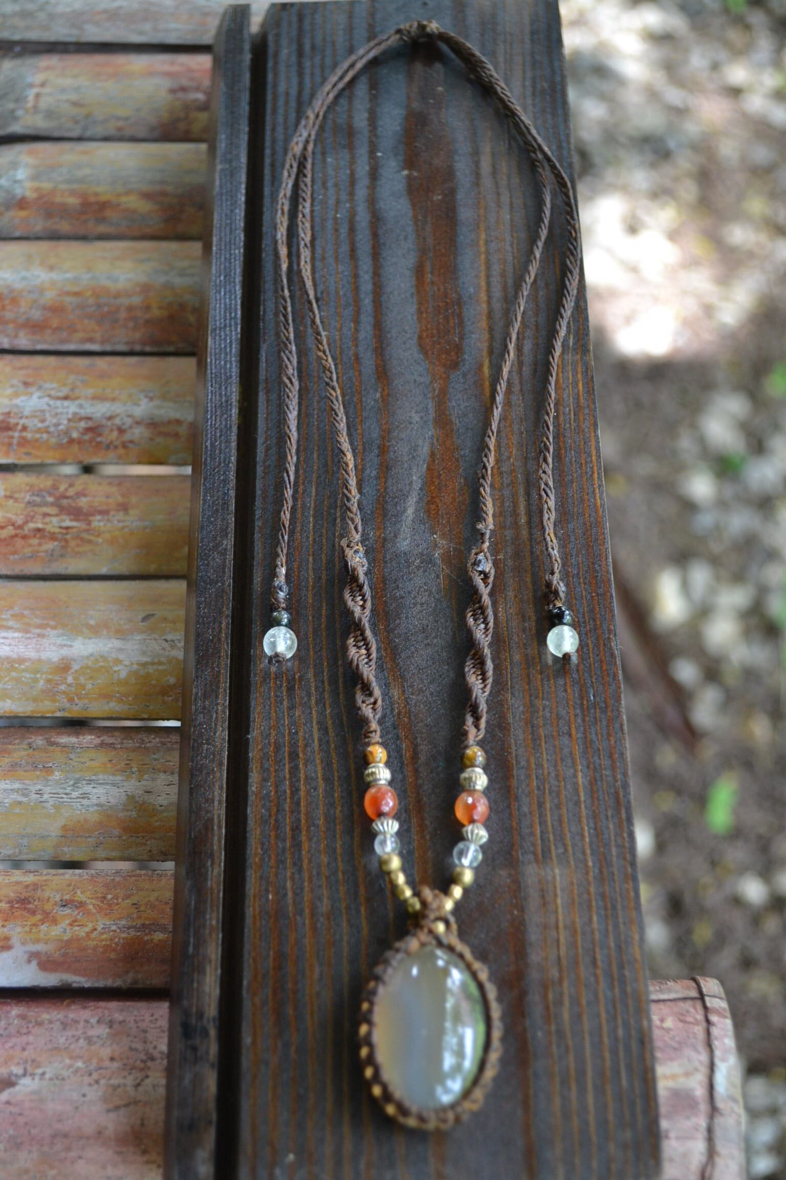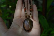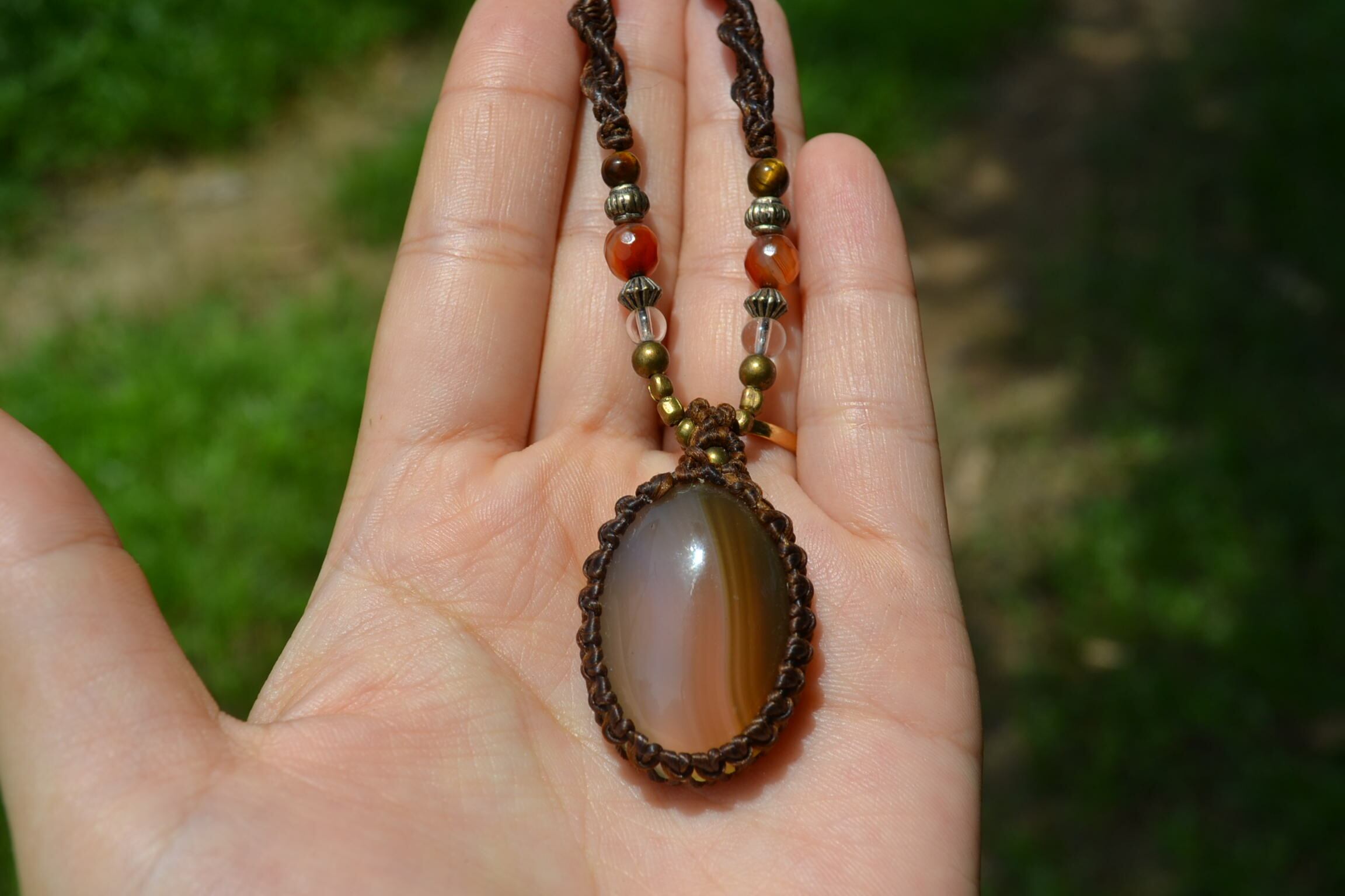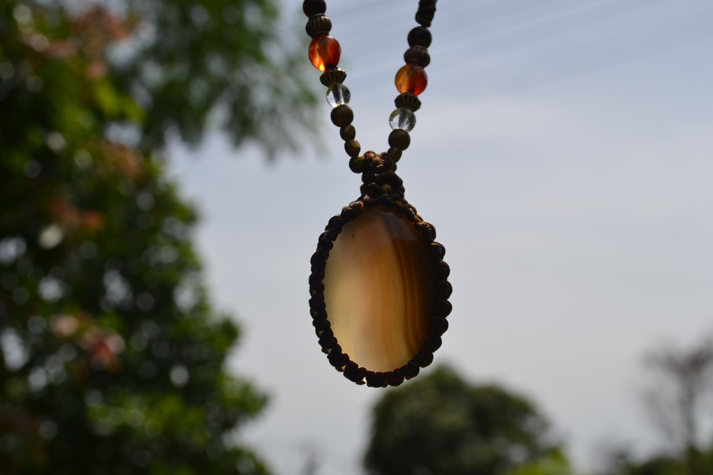 薄いベージュブラウンラインを筆でサラッと書き記したような、川の流れを示すようなそんな模様をしたアゲートをマクラメ編み装飾しペンダントネックレスに仕上げました。長い間の店主コレクションの