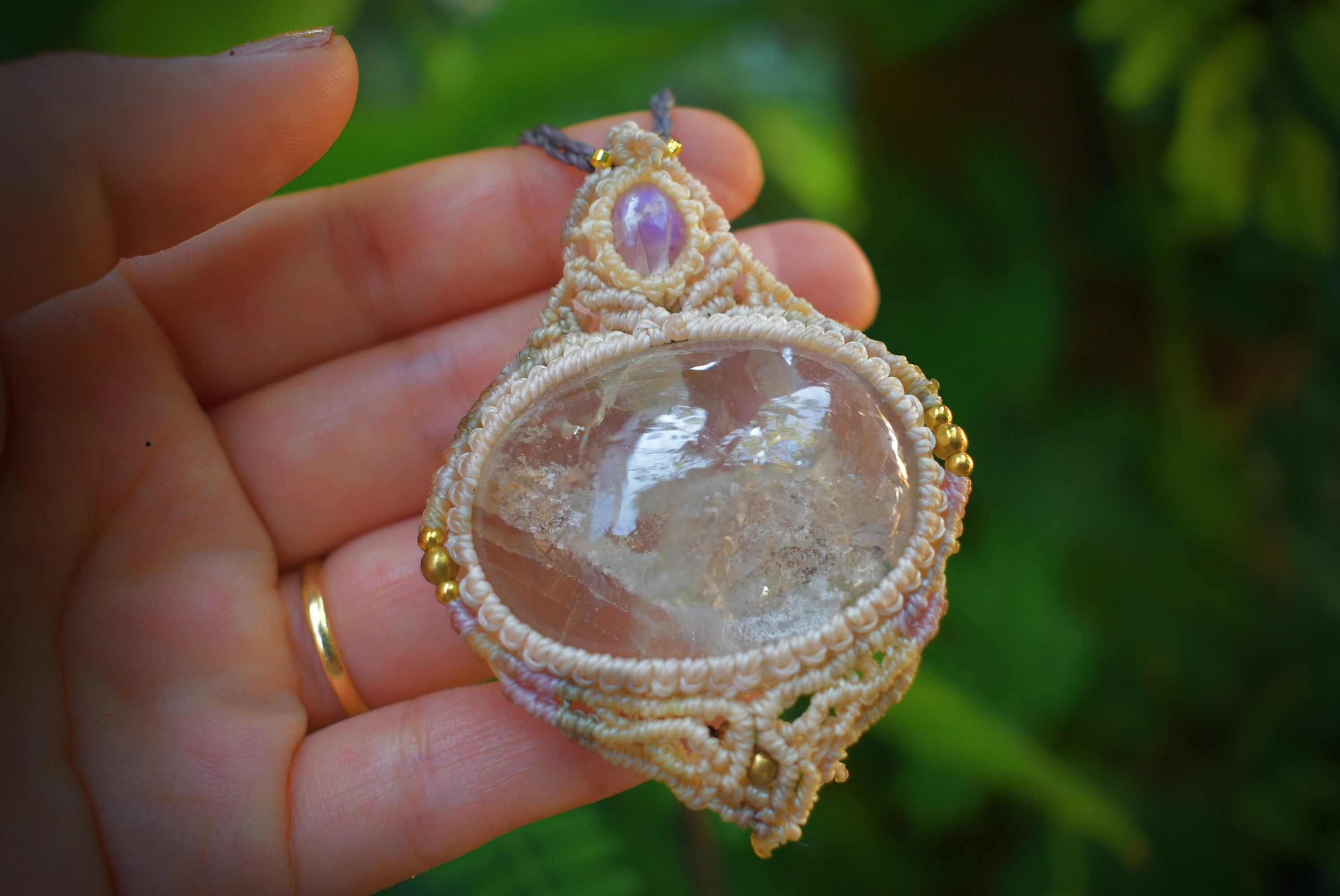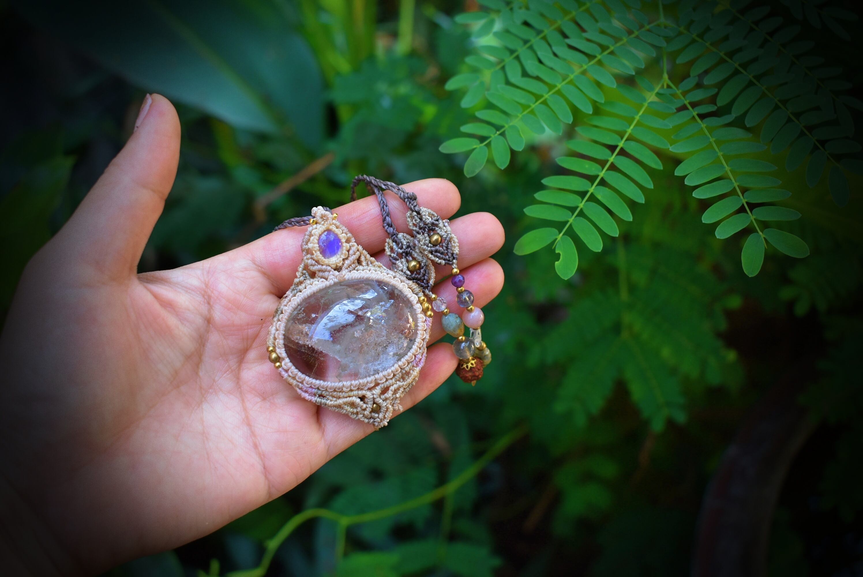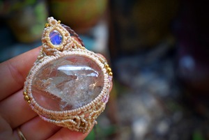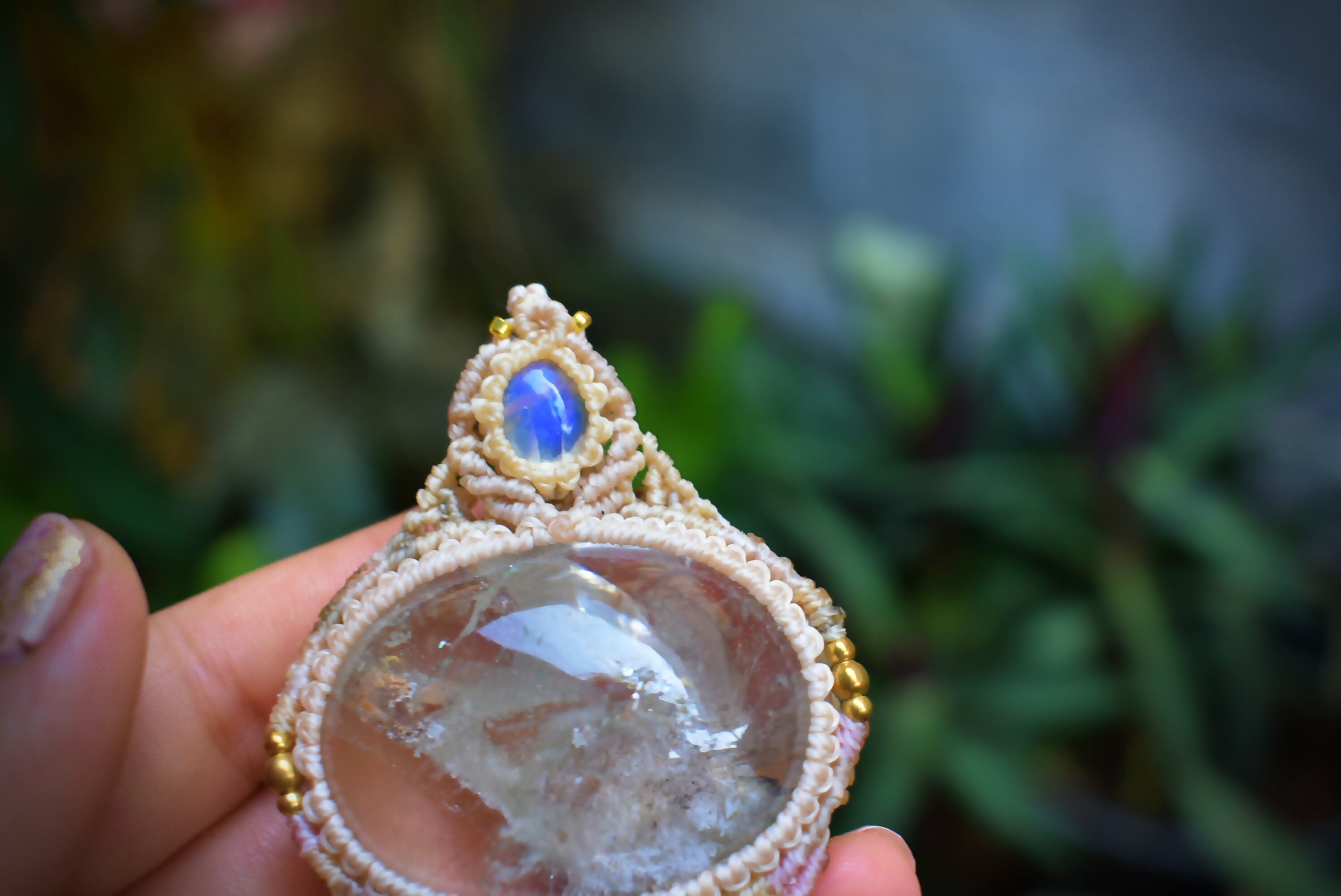 このたび、高品質な美しいブルームーンストーン とピンクの森が混ざり込んだ透明感あるガーデン水晶を合わせてマクラメ編み装飾を施し、ペンダントに仕上げました。