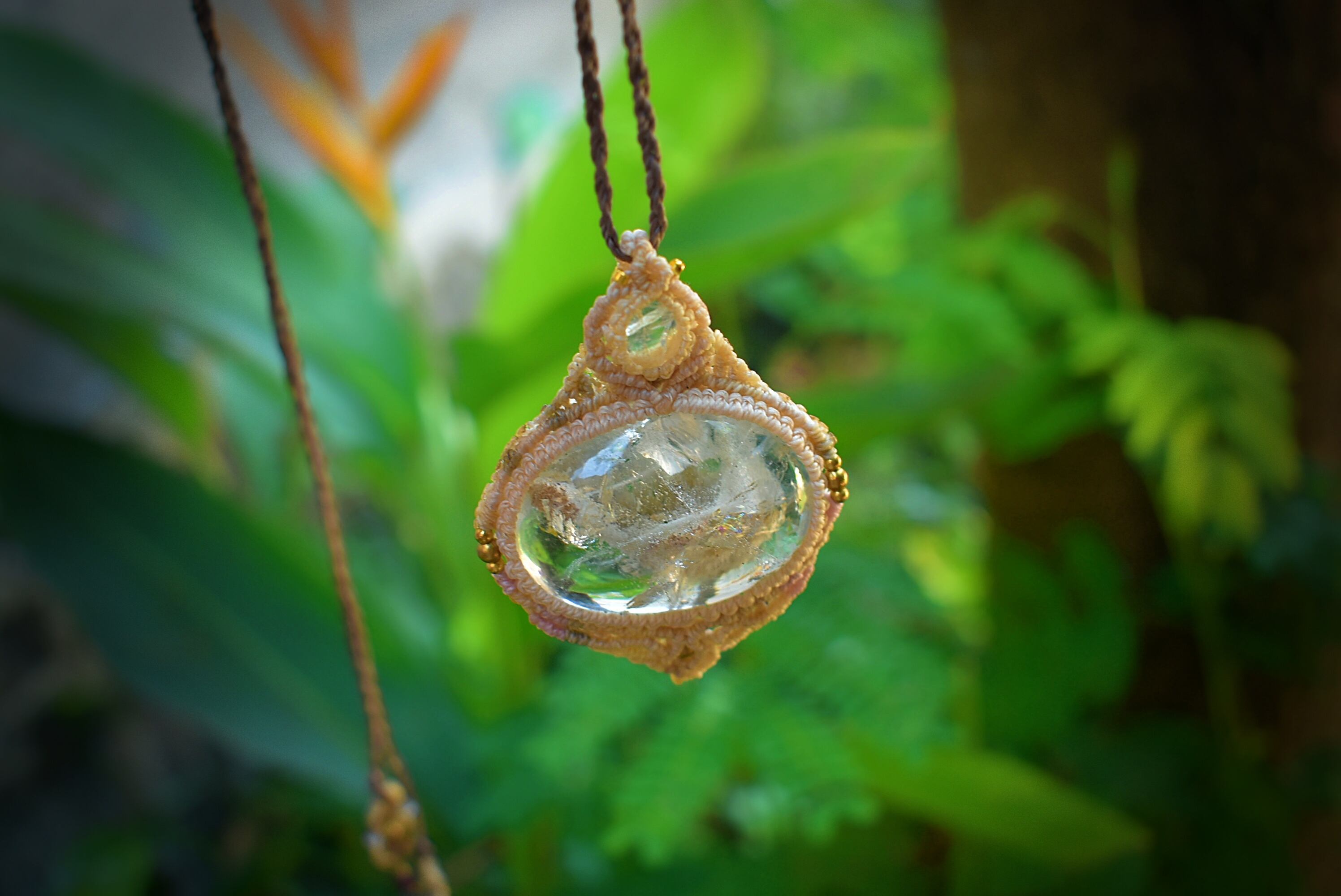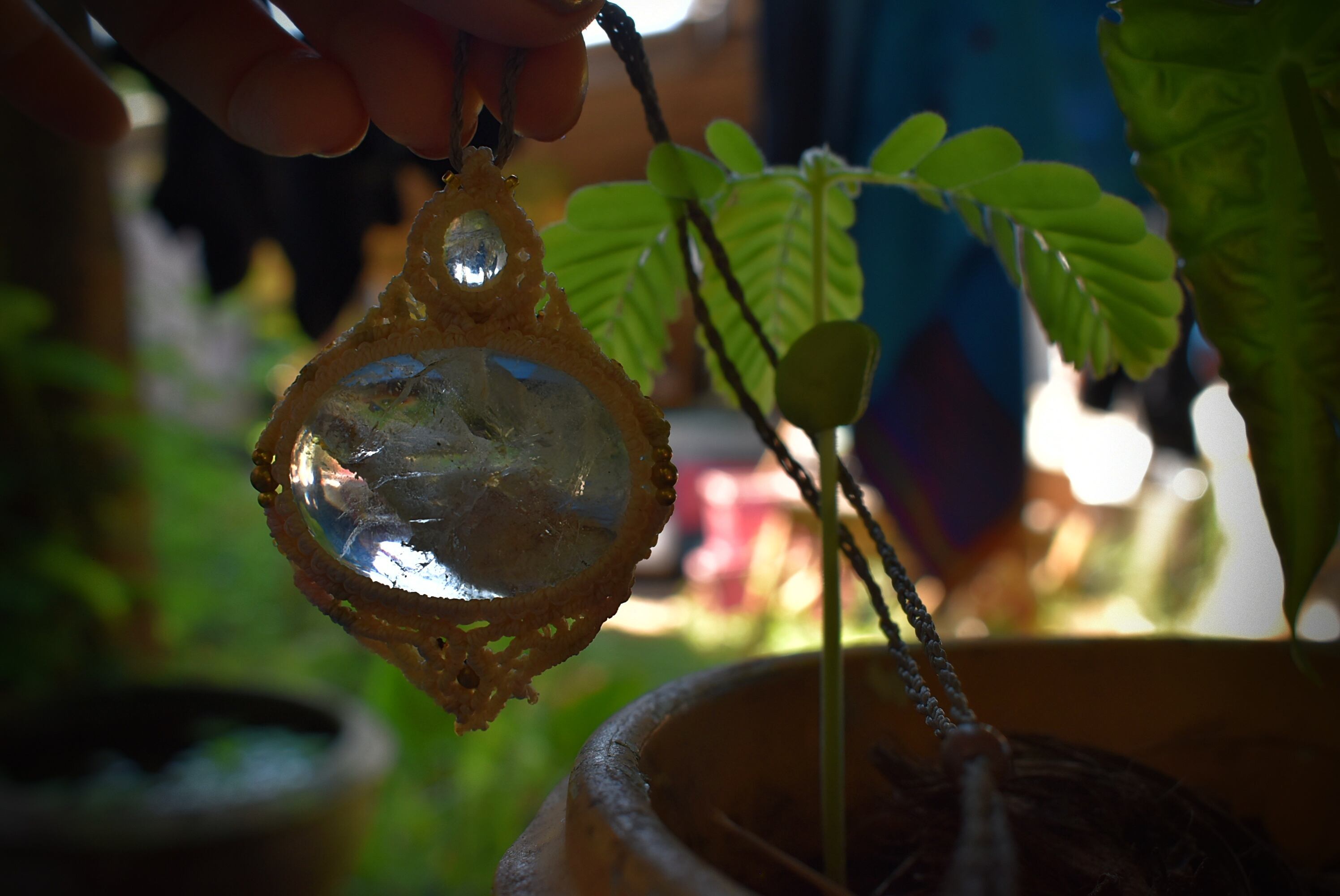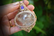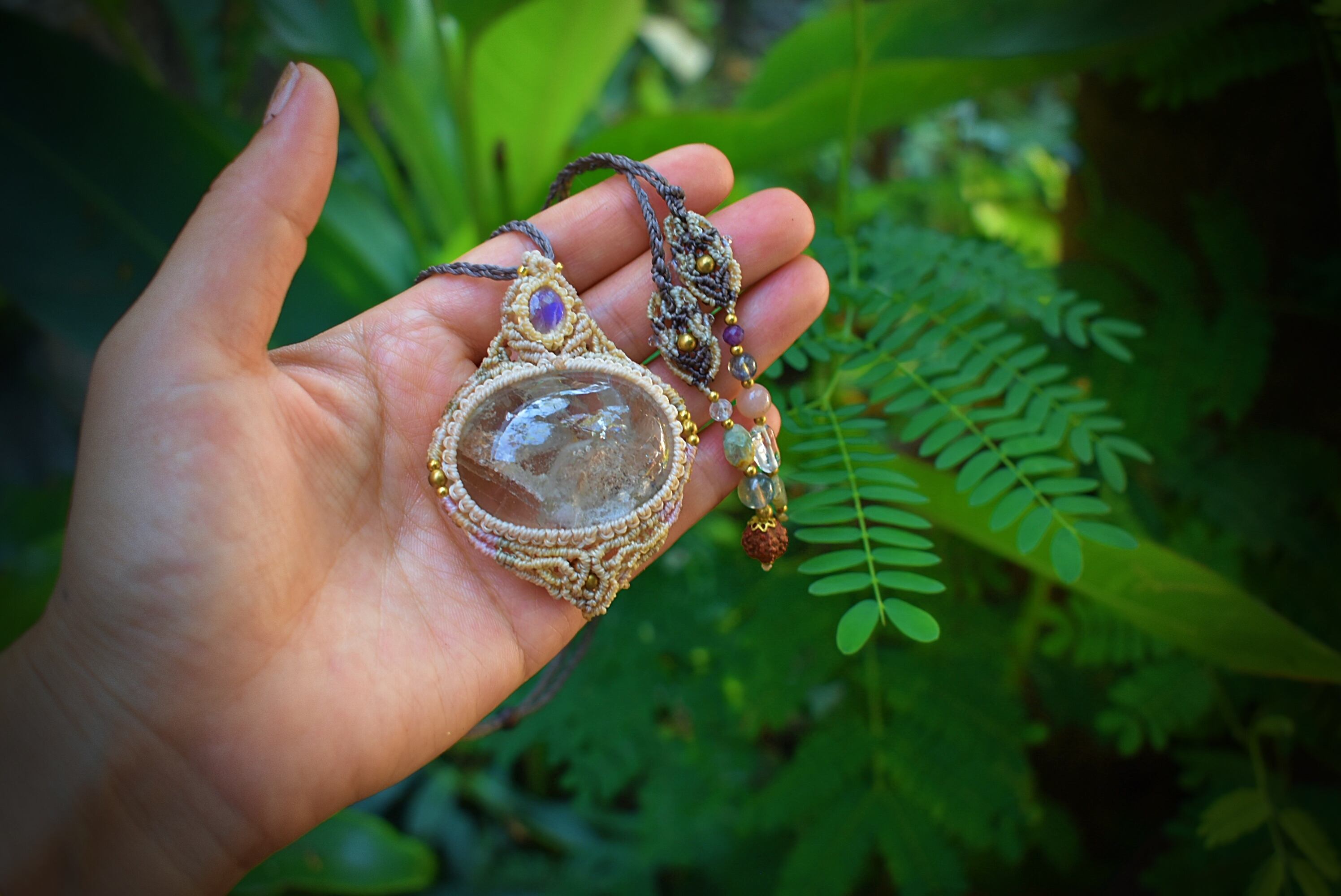 このたび、高品質な美しいブルームーンストーン とピンクの森が混ざり込んだ透明感あるガーデン水晶を合わせてマクラメ編み装飾を施し、ペンダントに仕上げました。