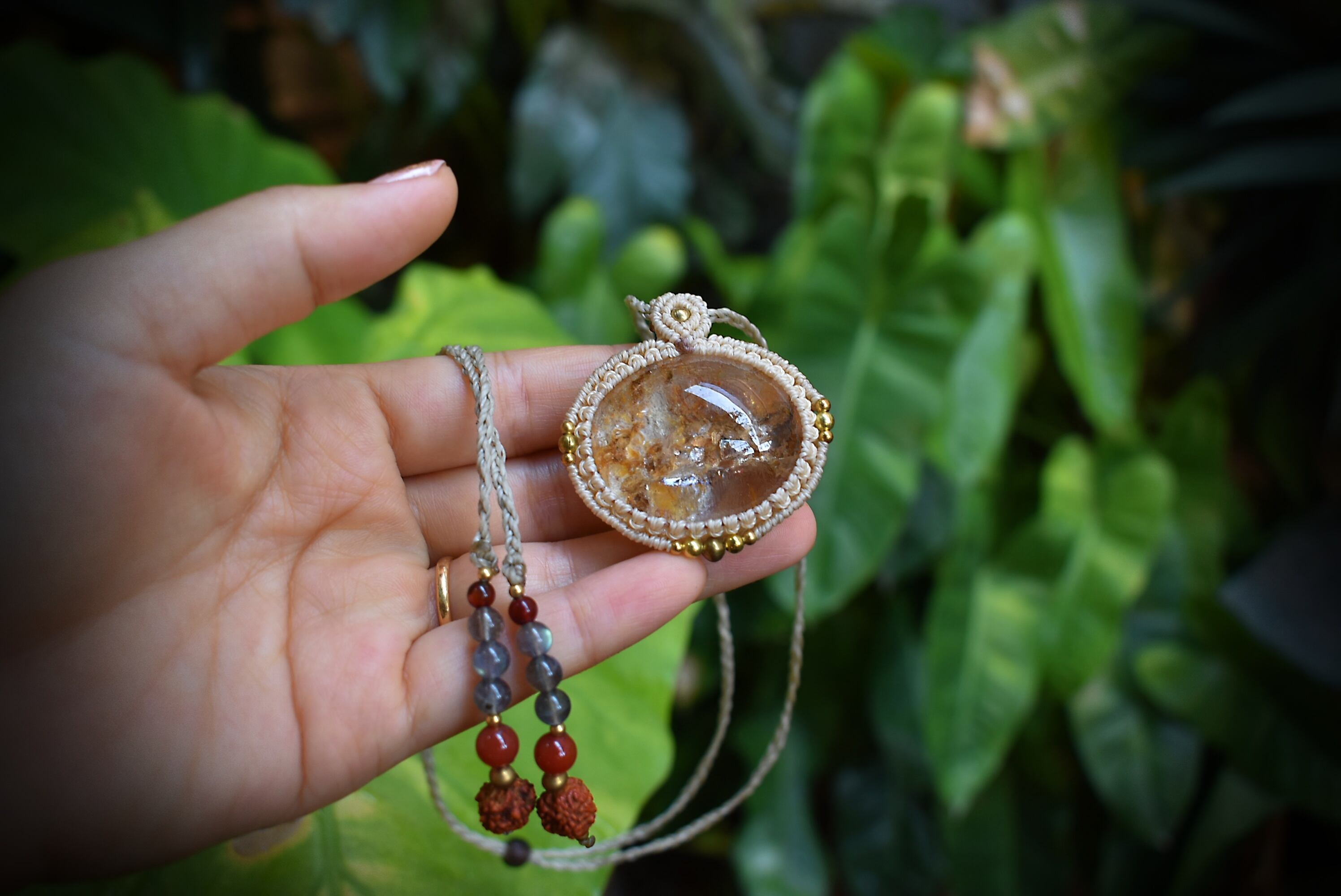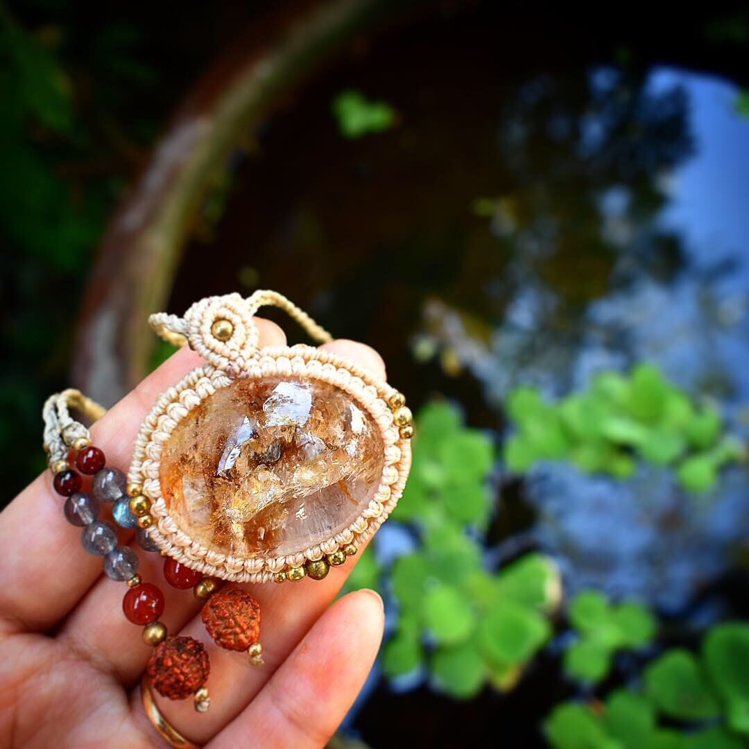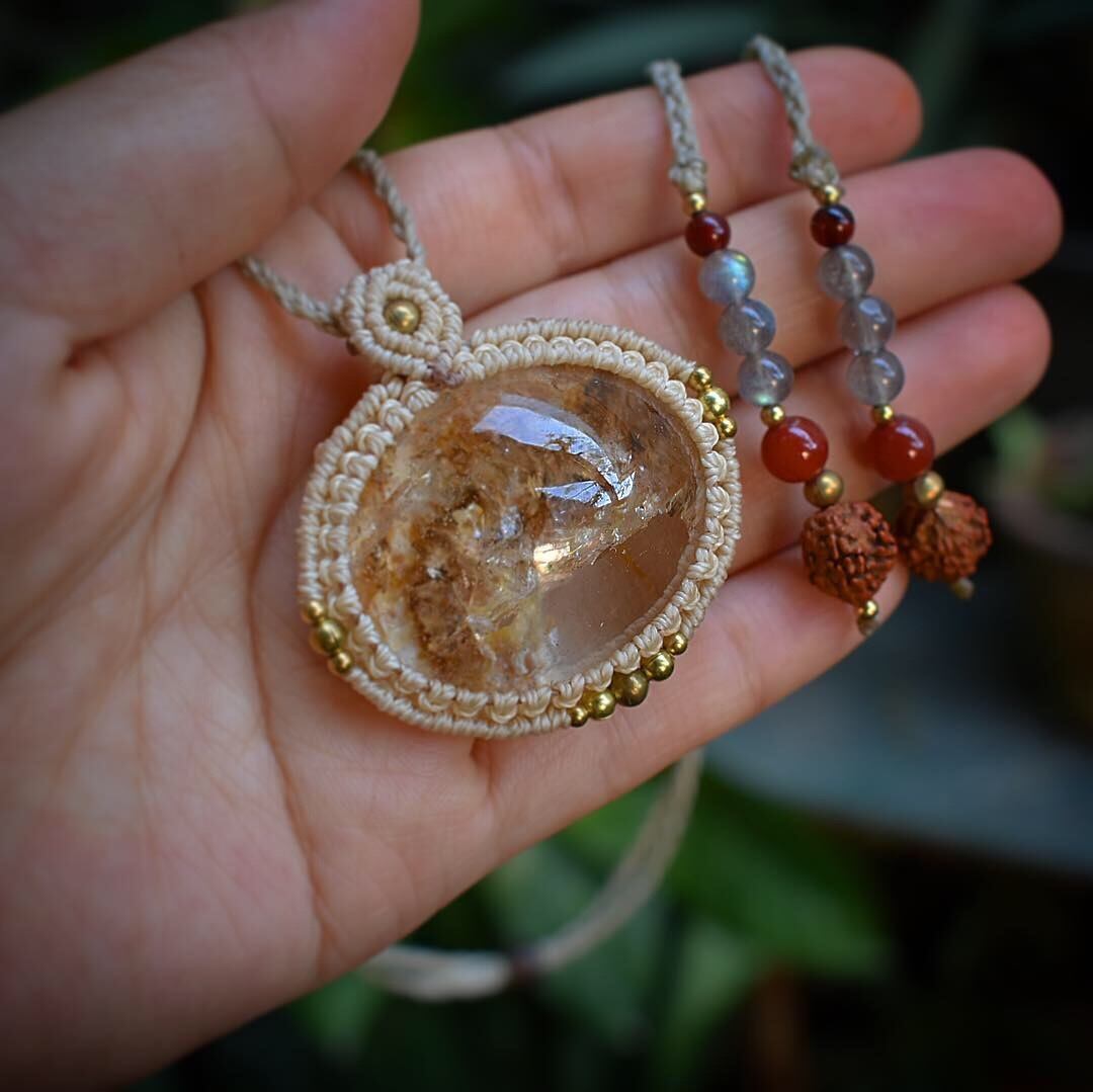 このたびの水晶の中には美しい石の成長が所々に見られ、ひとつひとつが透明水晶、オレンジ、ピンク..色味にわかれて成長していっている過程を見てとることができる不思議で見応えある結晶体の水晶鉱物の世界を見ることができるルースストーンをマクラメ編み装飾を施し、ペンダントに仕上げました。