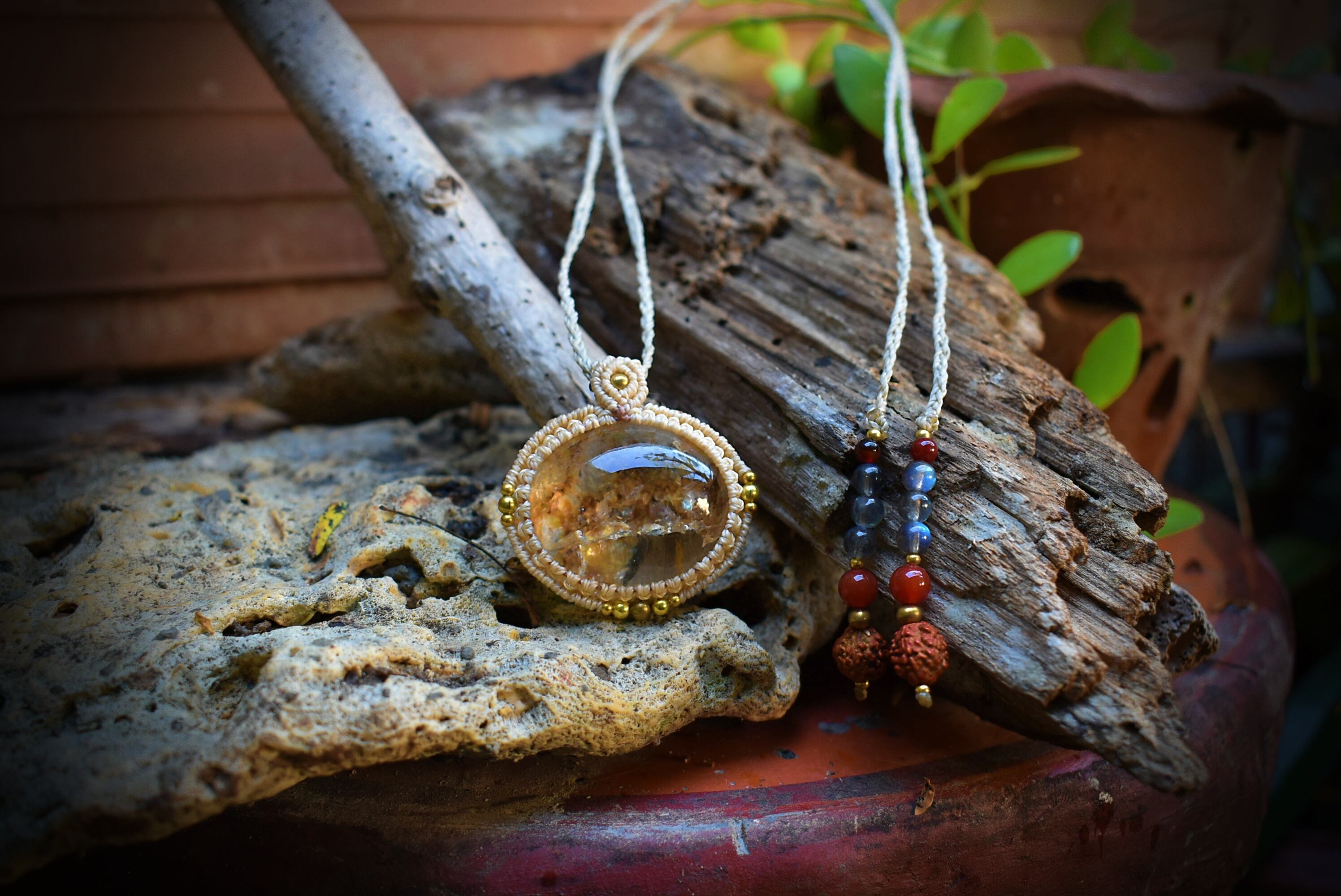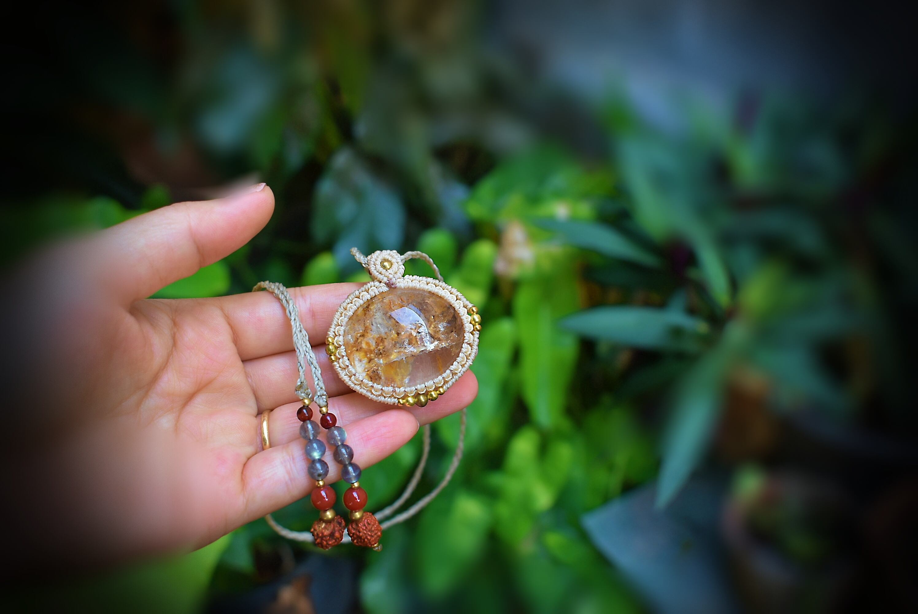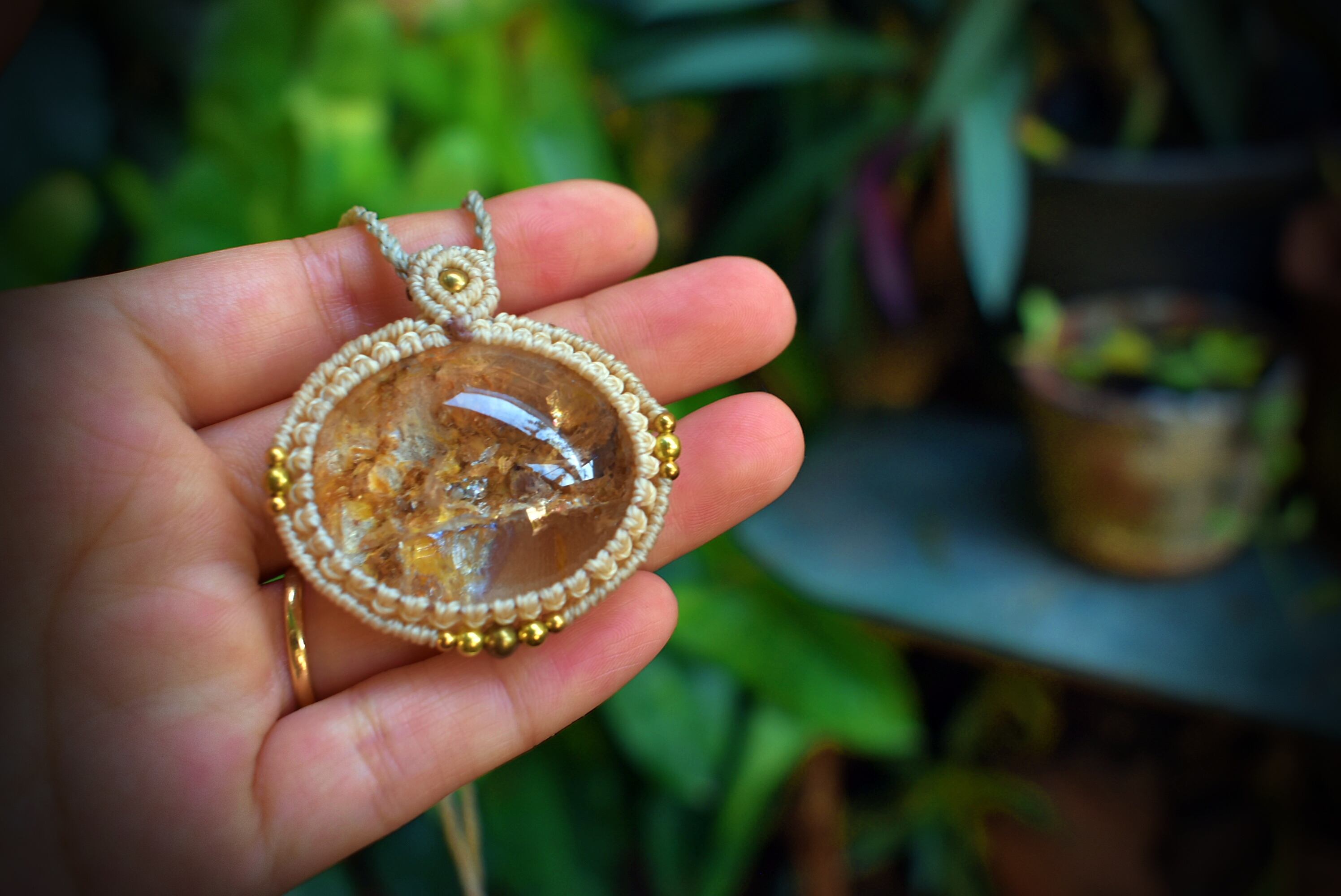このたびの水晶の中には美しい石の成長が所々に見られ、ひとつひとつが透明水晶、オレンジ、ピンク..色味にわかれて成長していっている過程を見てとることができる不思議で見応えある結晶体の水晶鉱物の世界を見ることができるルースストーンをマクラメ編み装飾を施し、ペンダントに仕上げました。