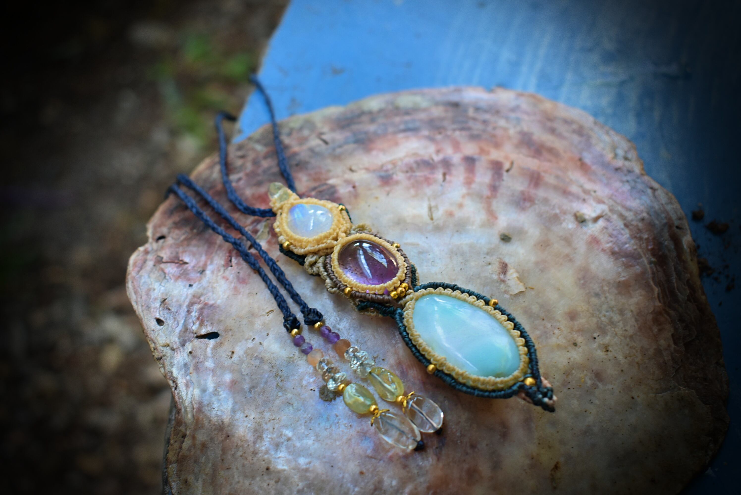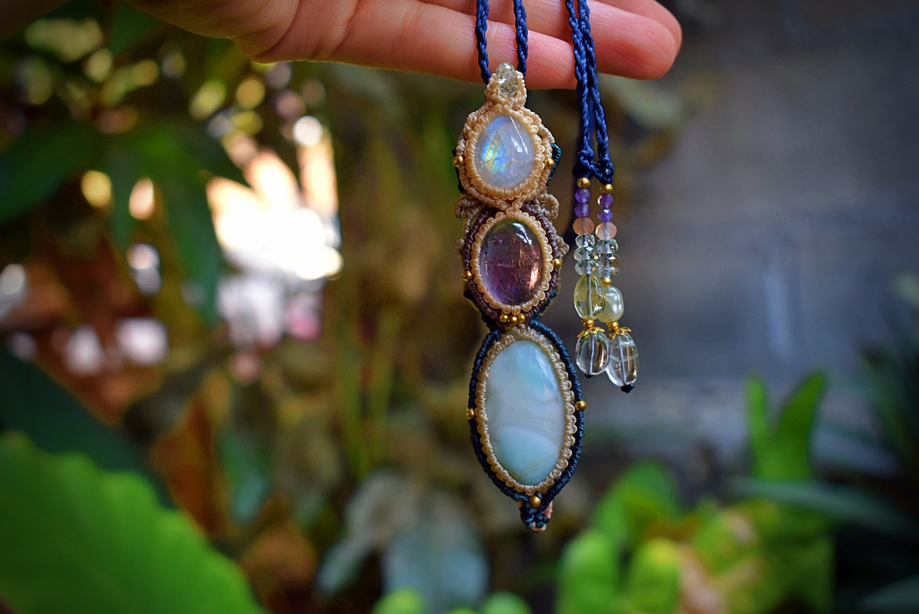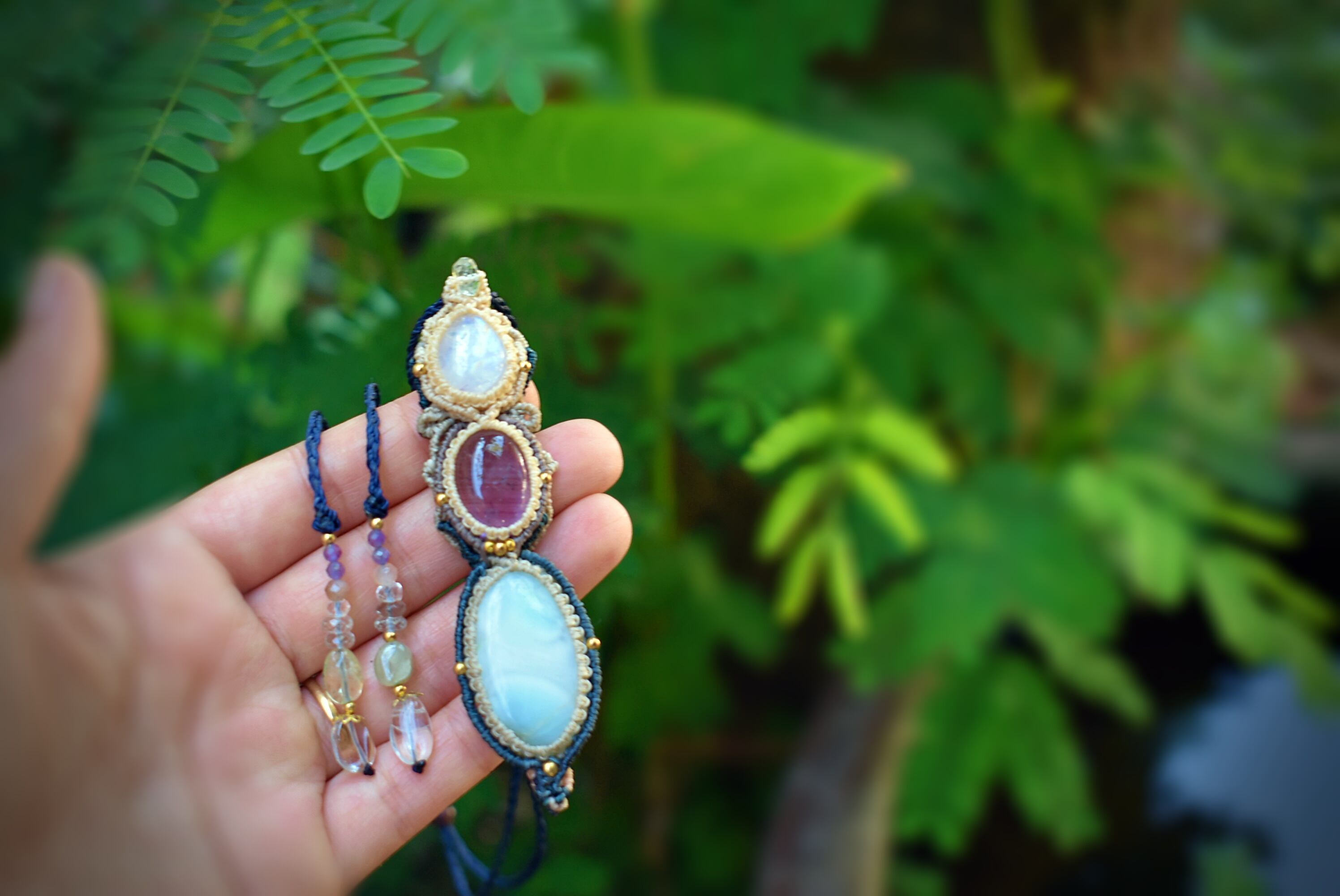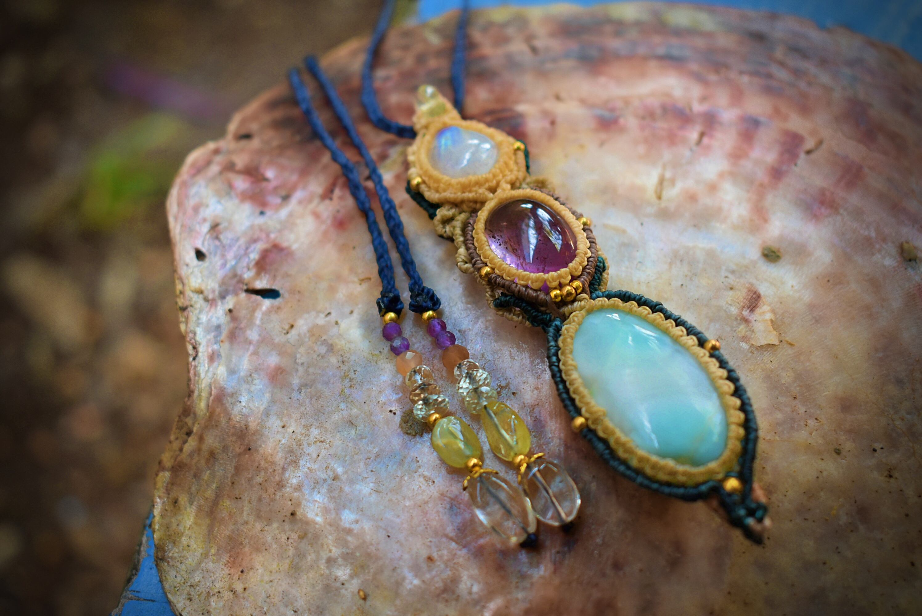 透明感あるアメトリンを中心にマクラメ編み装飾を施した魔法のステッキのようなペンダントを制作しました。一番下のラリマーはうっすら模様と透け感が素晴らしいもの。天然石ラリマーから採掘される極めて珍しい部分のルースを使用。トップのレインボームーンストーン はこのペンダント全体を照らしだす役割り。いろんな虹の色味が輝いています。