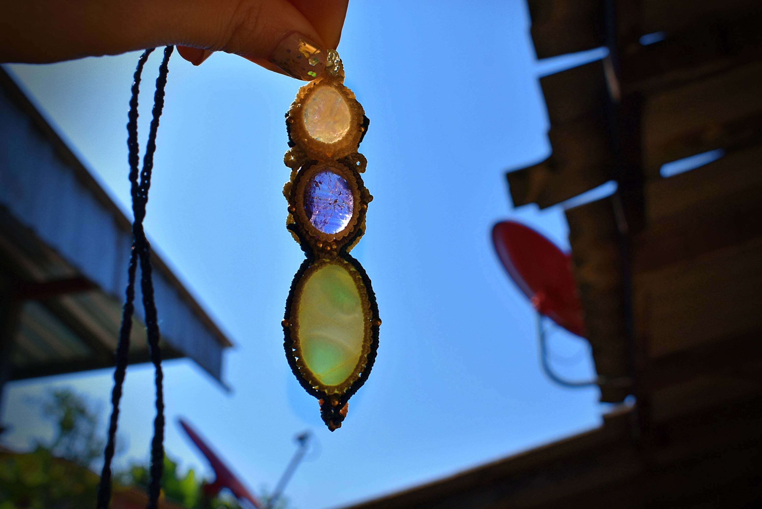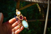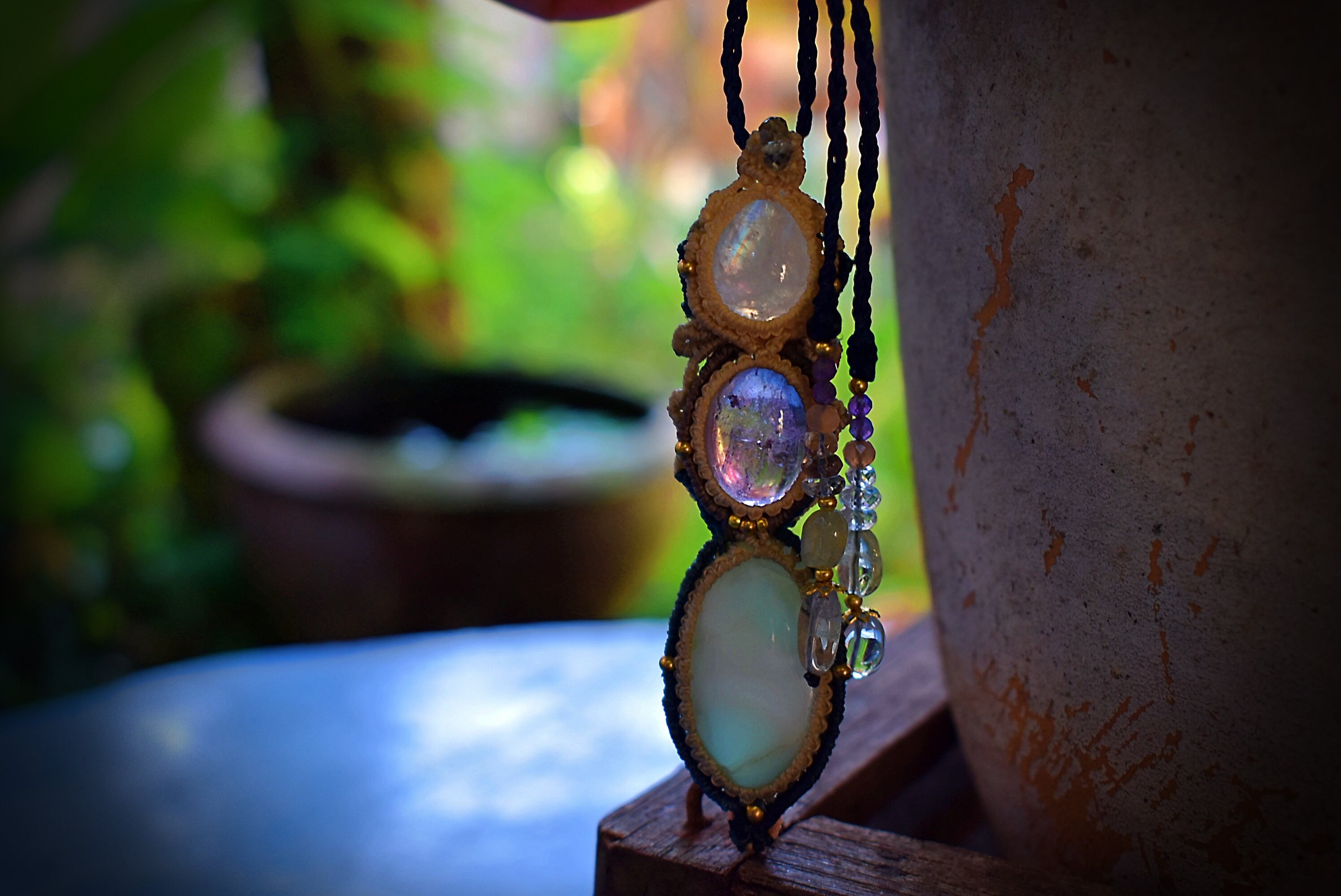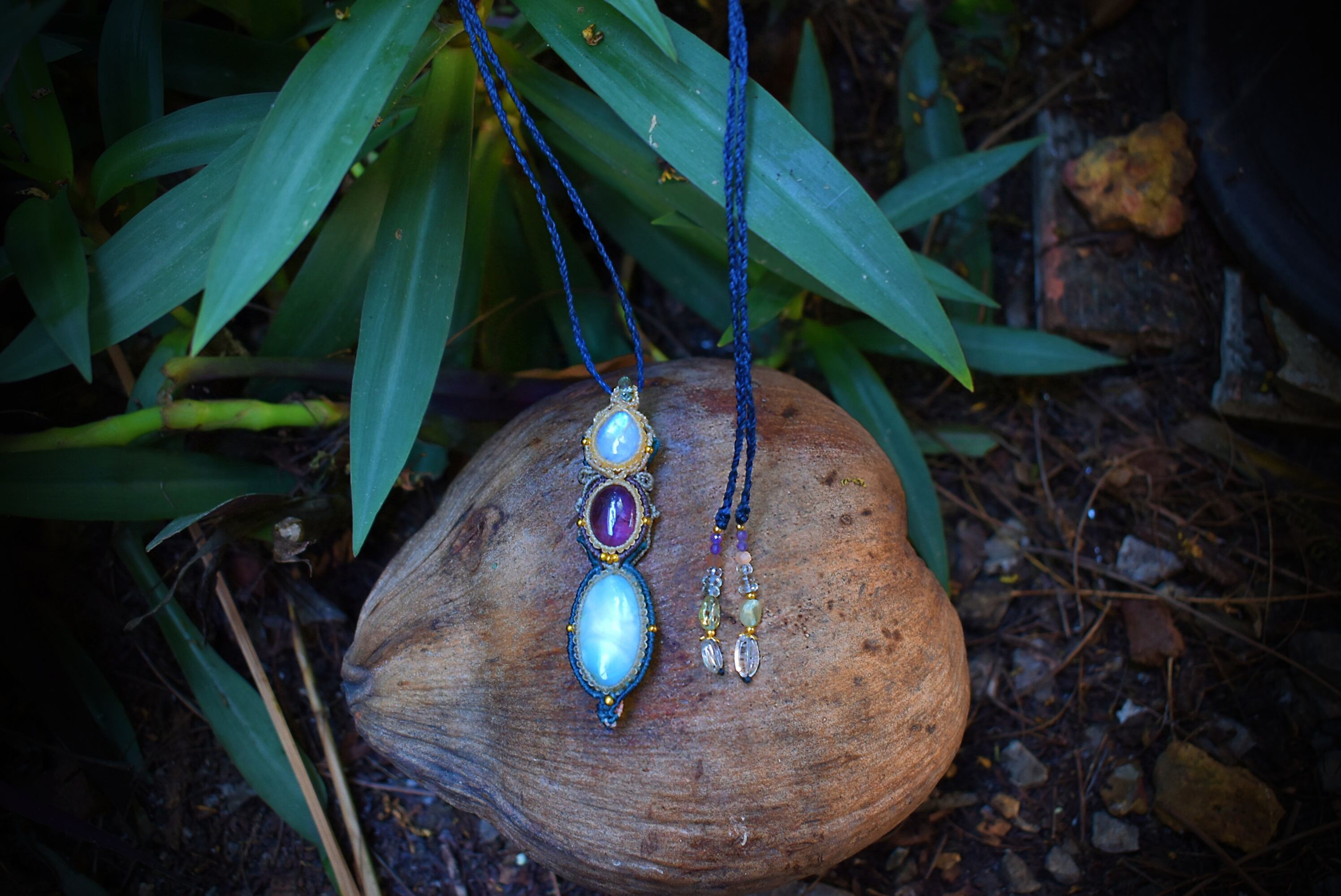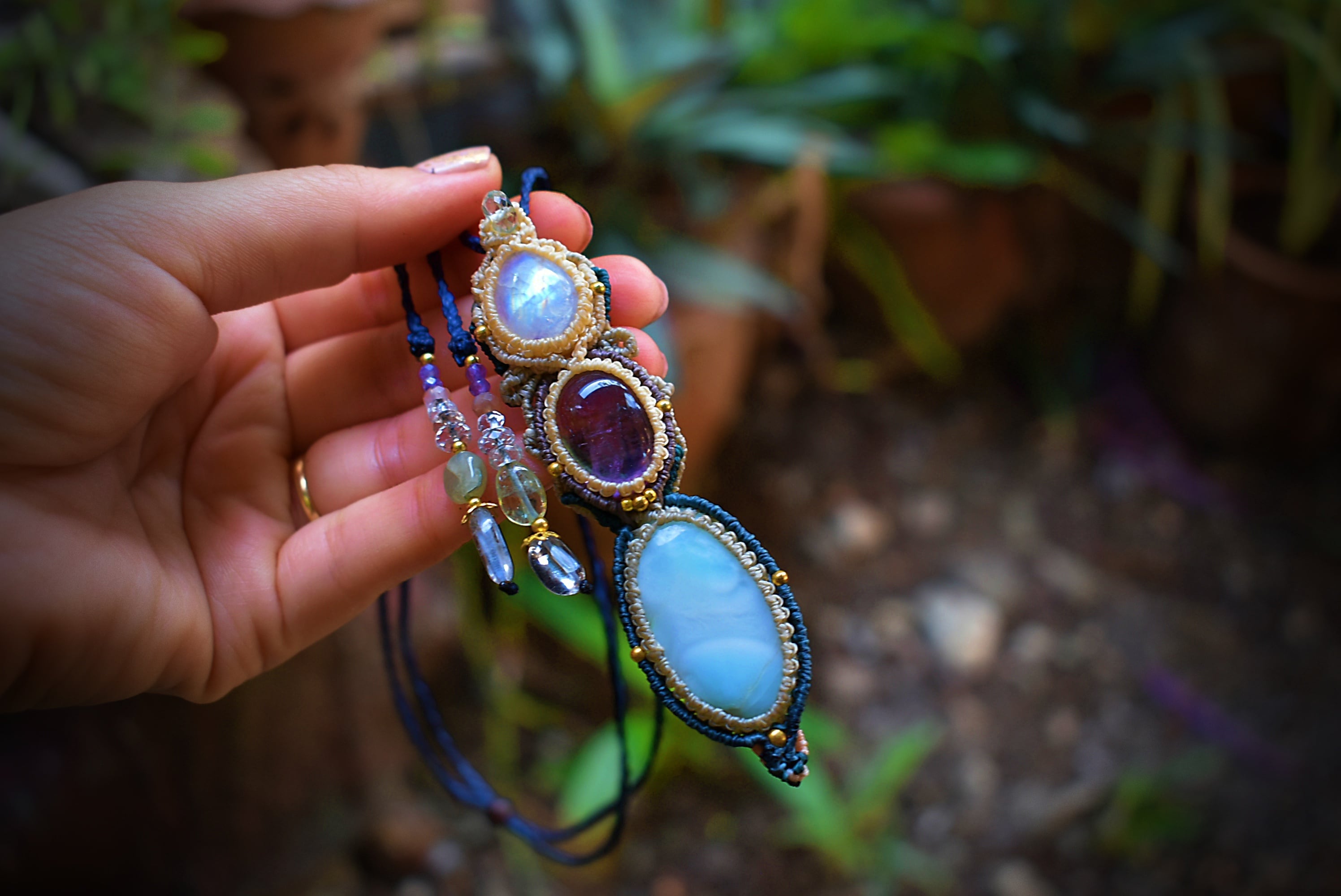 透明感あるアメトリンを中心にマクラメ編み装飾を施した魔法のステッキのようなペンダントを制作しました。一番下のラリマーはうっすら模様と透け感が素晴らしいもの。天然石ラリマーから採掘される極めて珍しい部分のルースを使用。トップのレインボームーンストーン はこのペンダント全体を照らしだす役割り。いろんな虹の色味が輝いています。