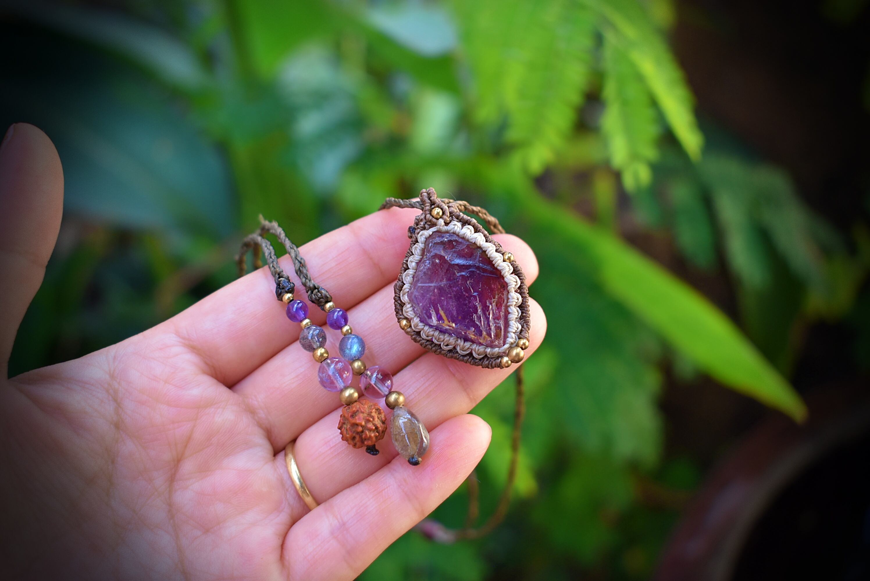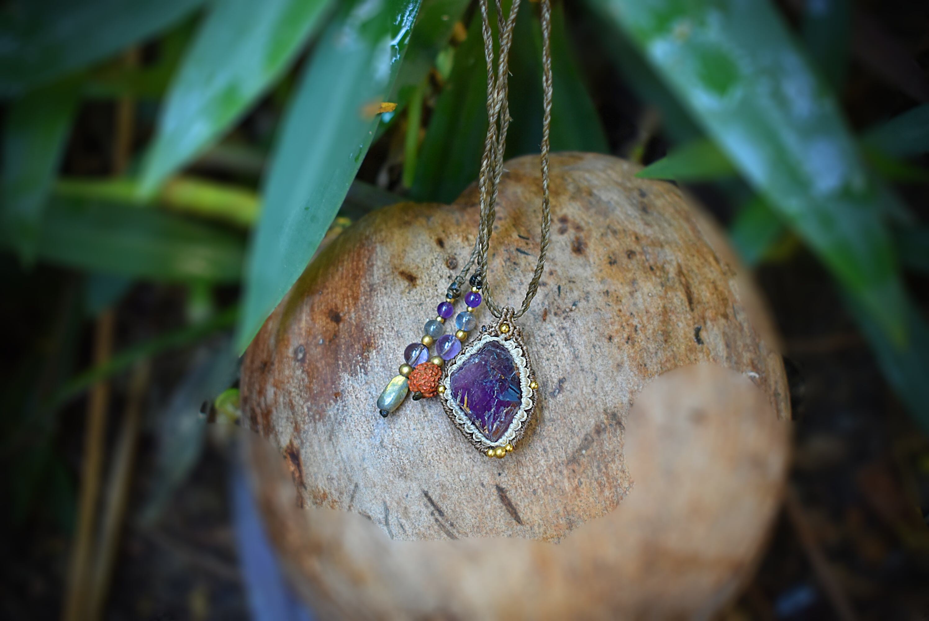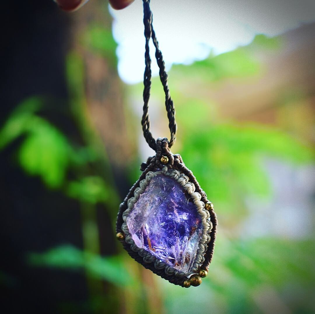 石の世界のグラデーションが透明感、そして妖艶感、共に素晴らしい原石のアメジストをそのままマクラメ編み装飾を施して制作したペンダントになります。