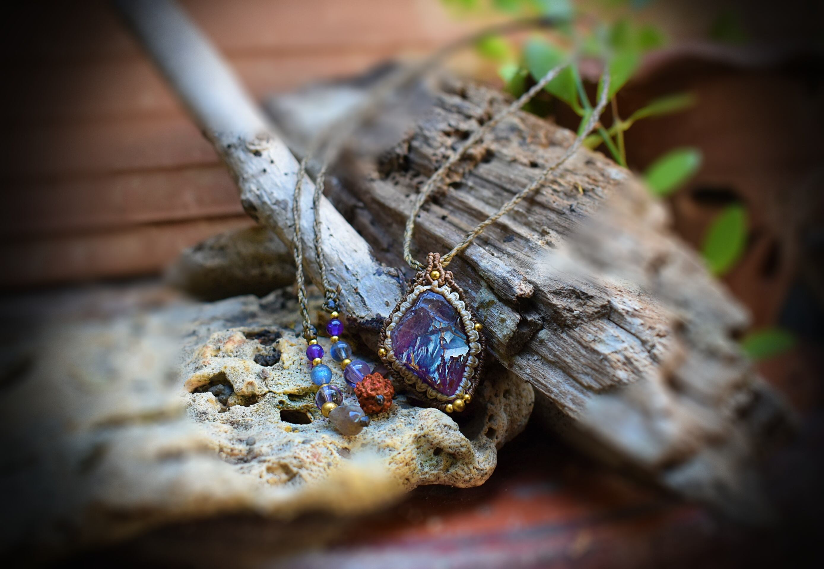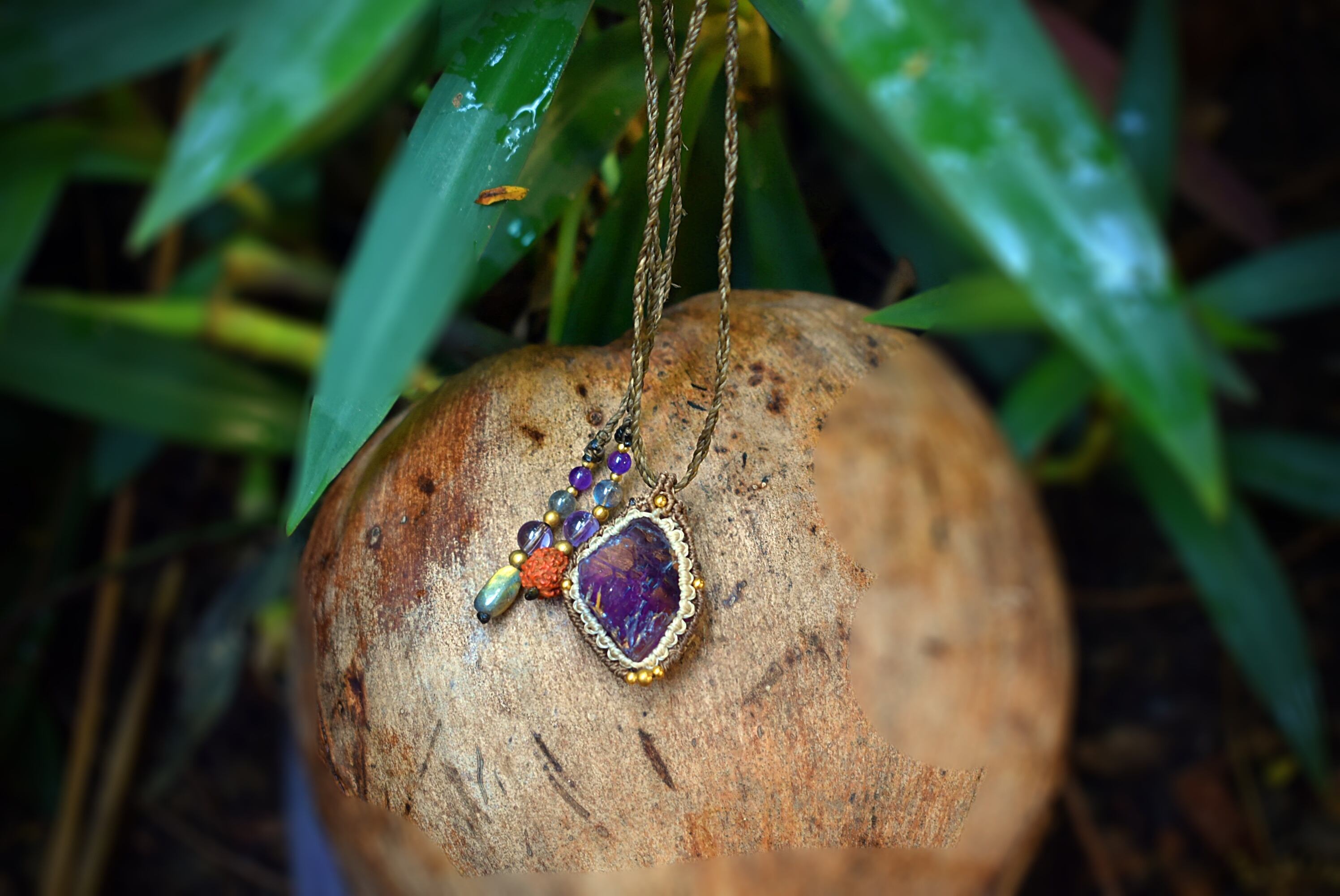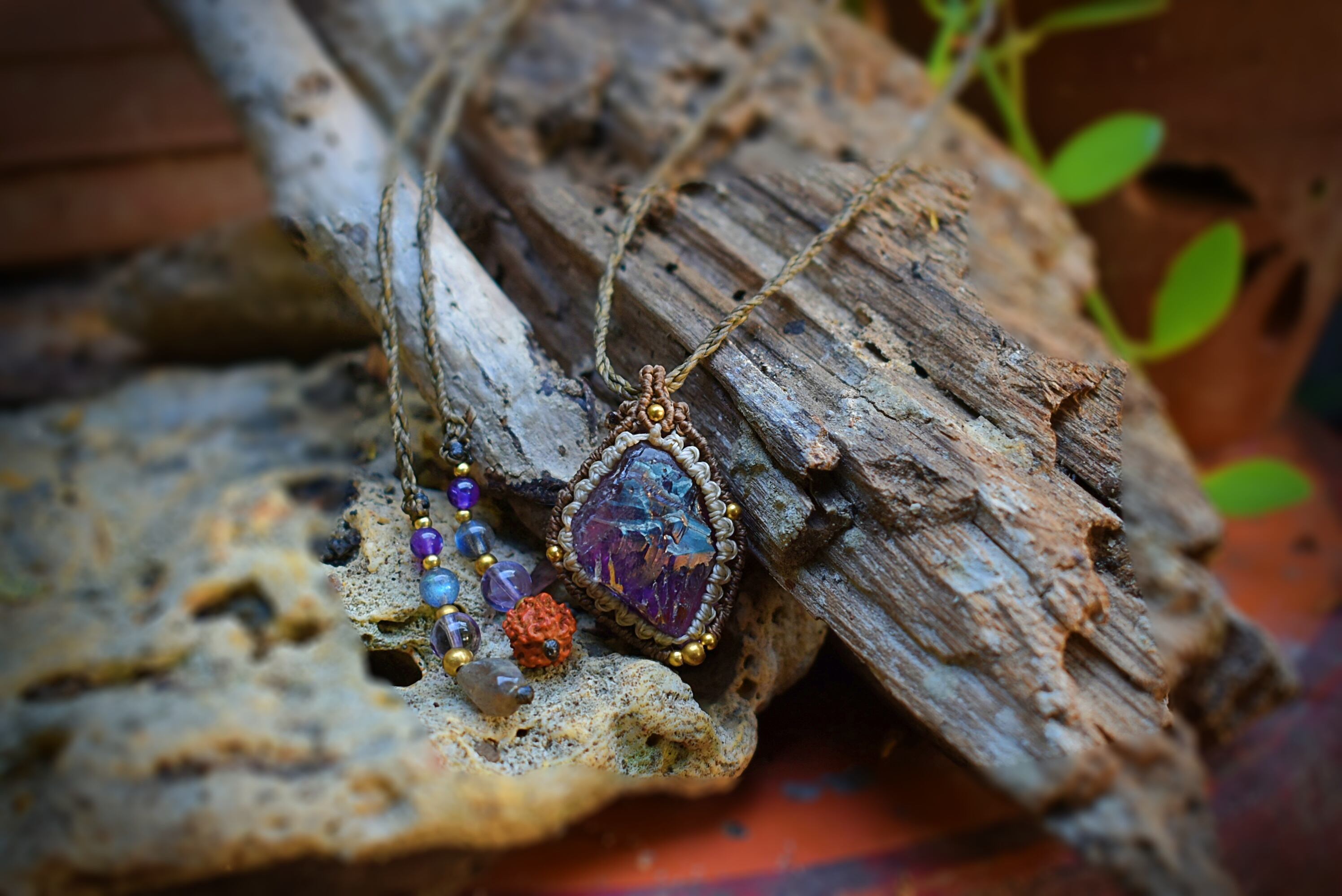 石の世界のグラデーションが透明感、そして妖艶感、共に素晴らしい原石のアメジストをそのままマクラメ編み装飾を施して制作したペンダントになります。
