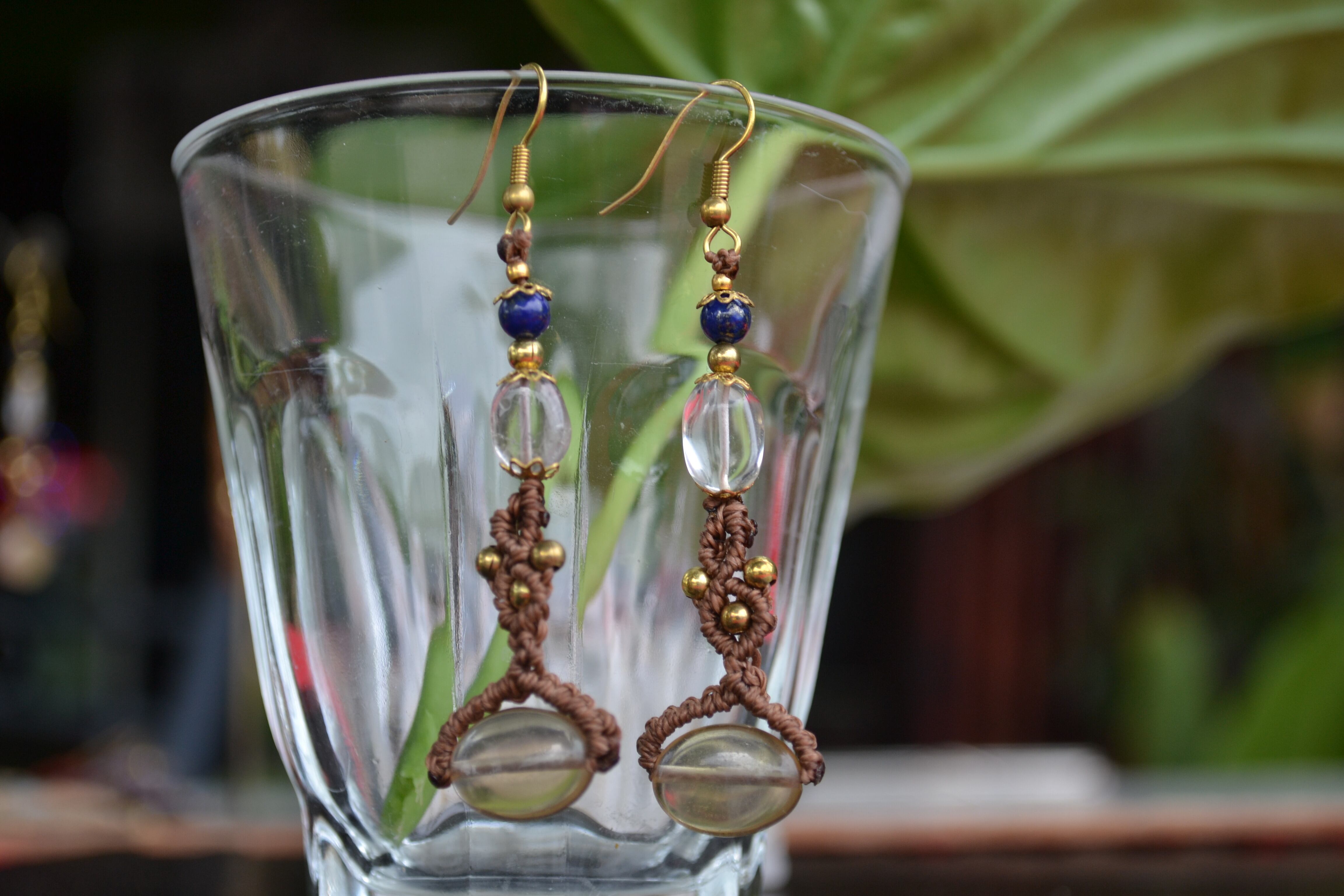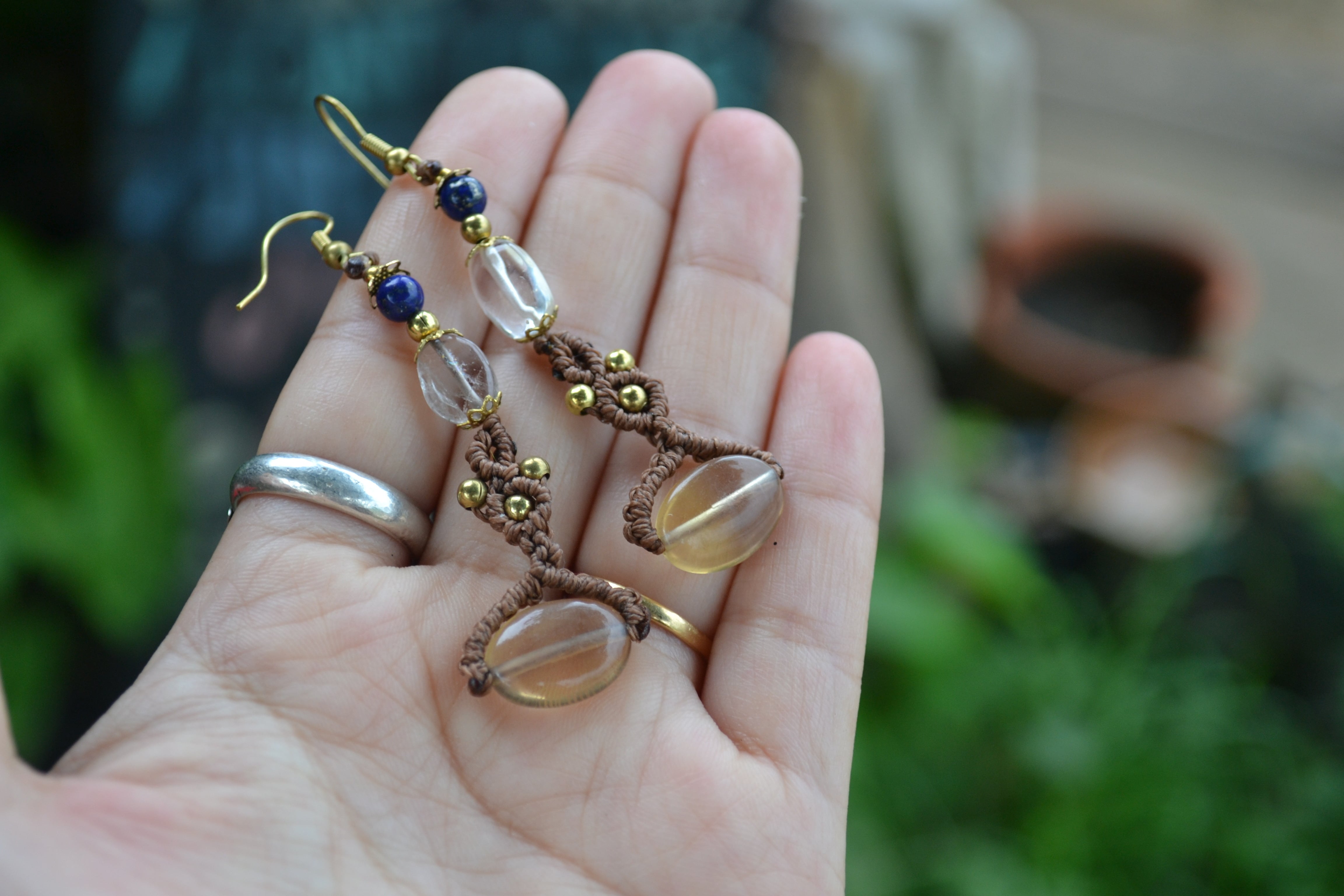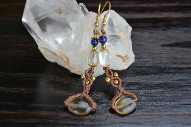 クリアクオーツとラピスラズリ+フローライトマクラメピアス