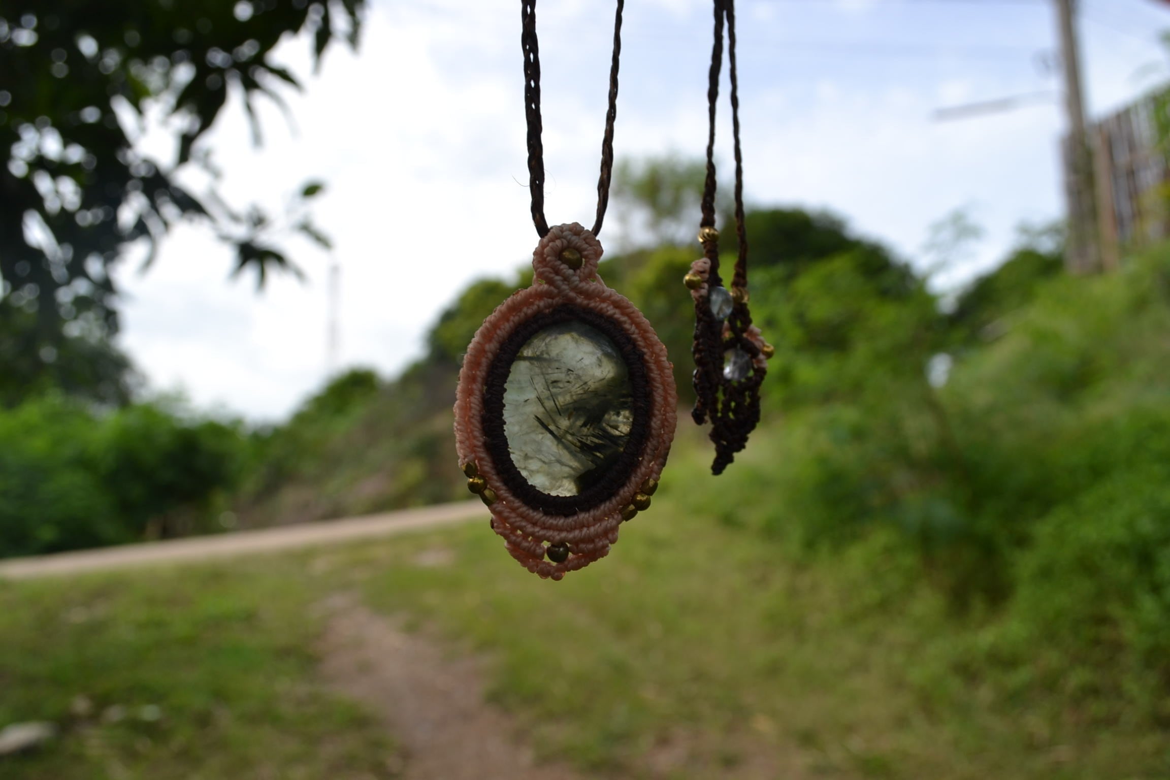 こちらのプレナイトは自然のアートが石の中にちゃんと見えるプルンとしたプレナイトです。この度はシンプルにベージュとブラウンの蝋引き糸2色を使用し、ペンダントに仕上げました。