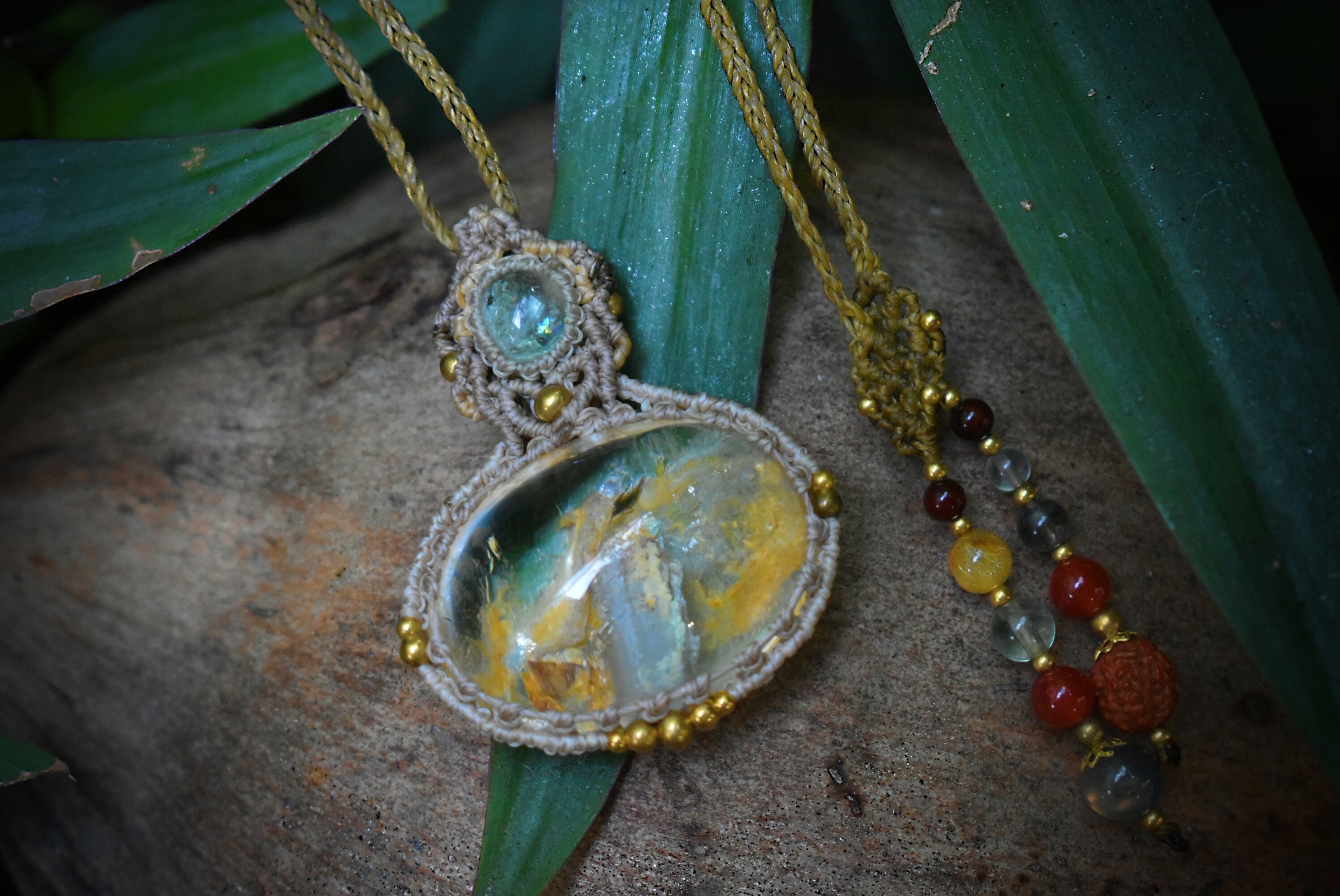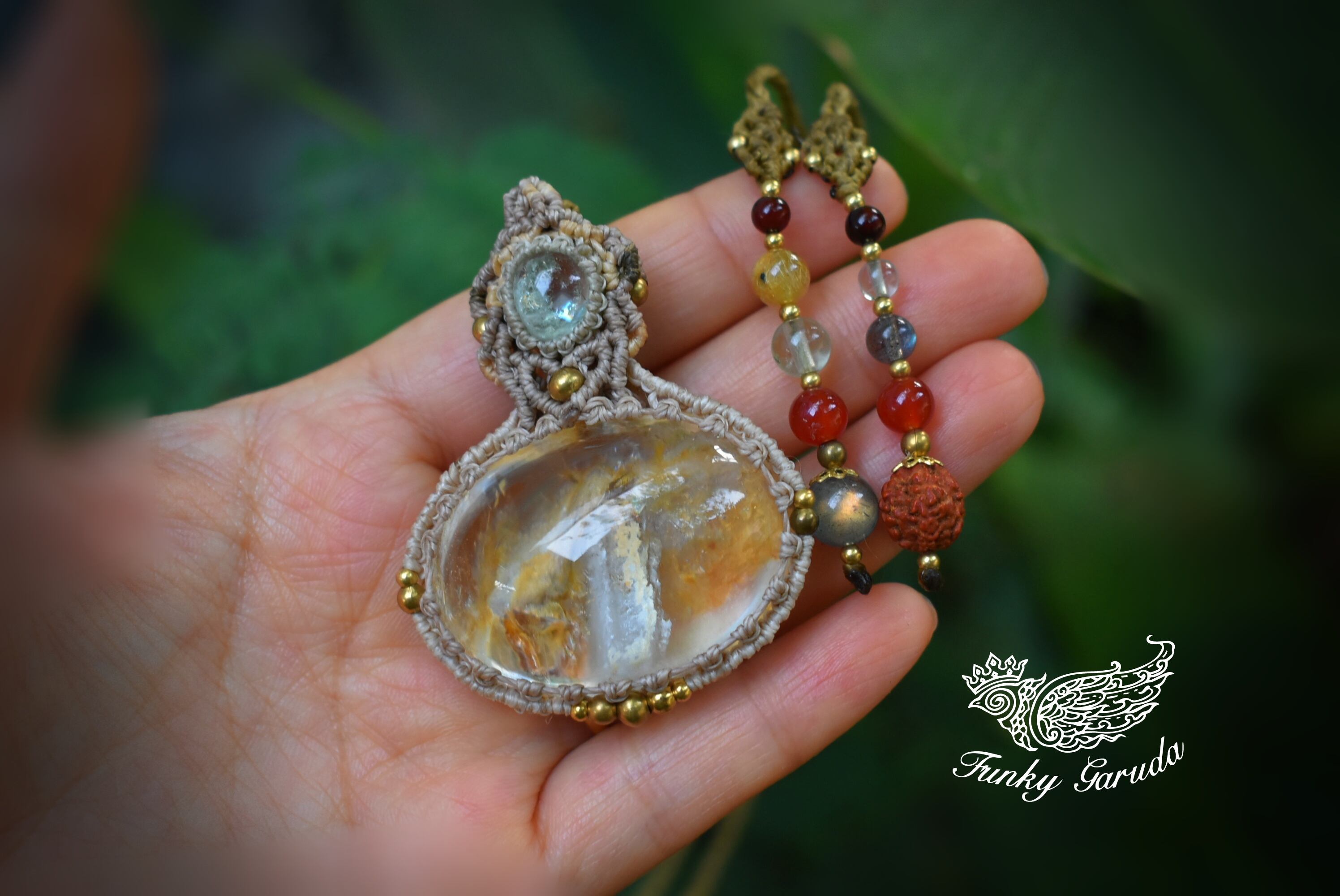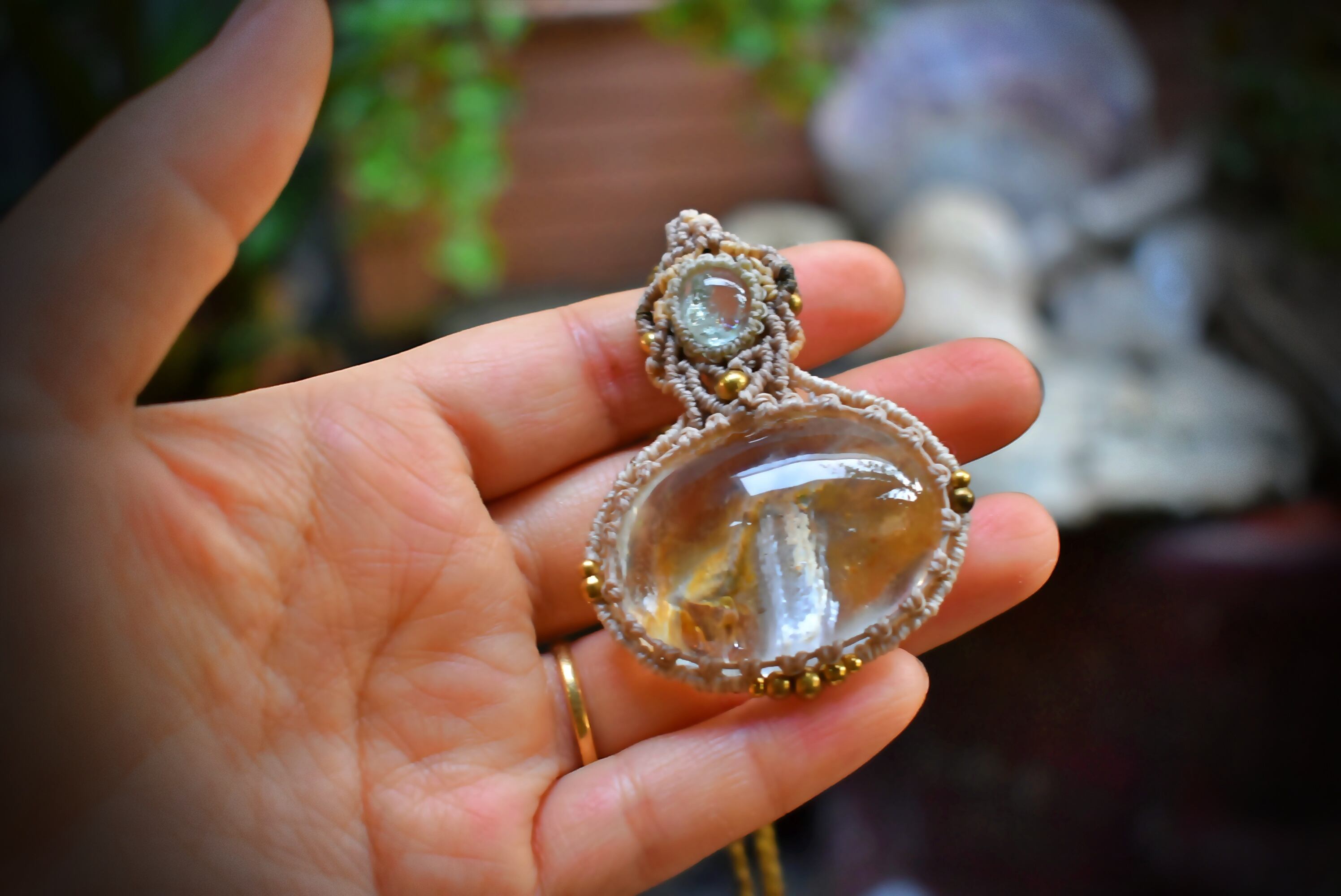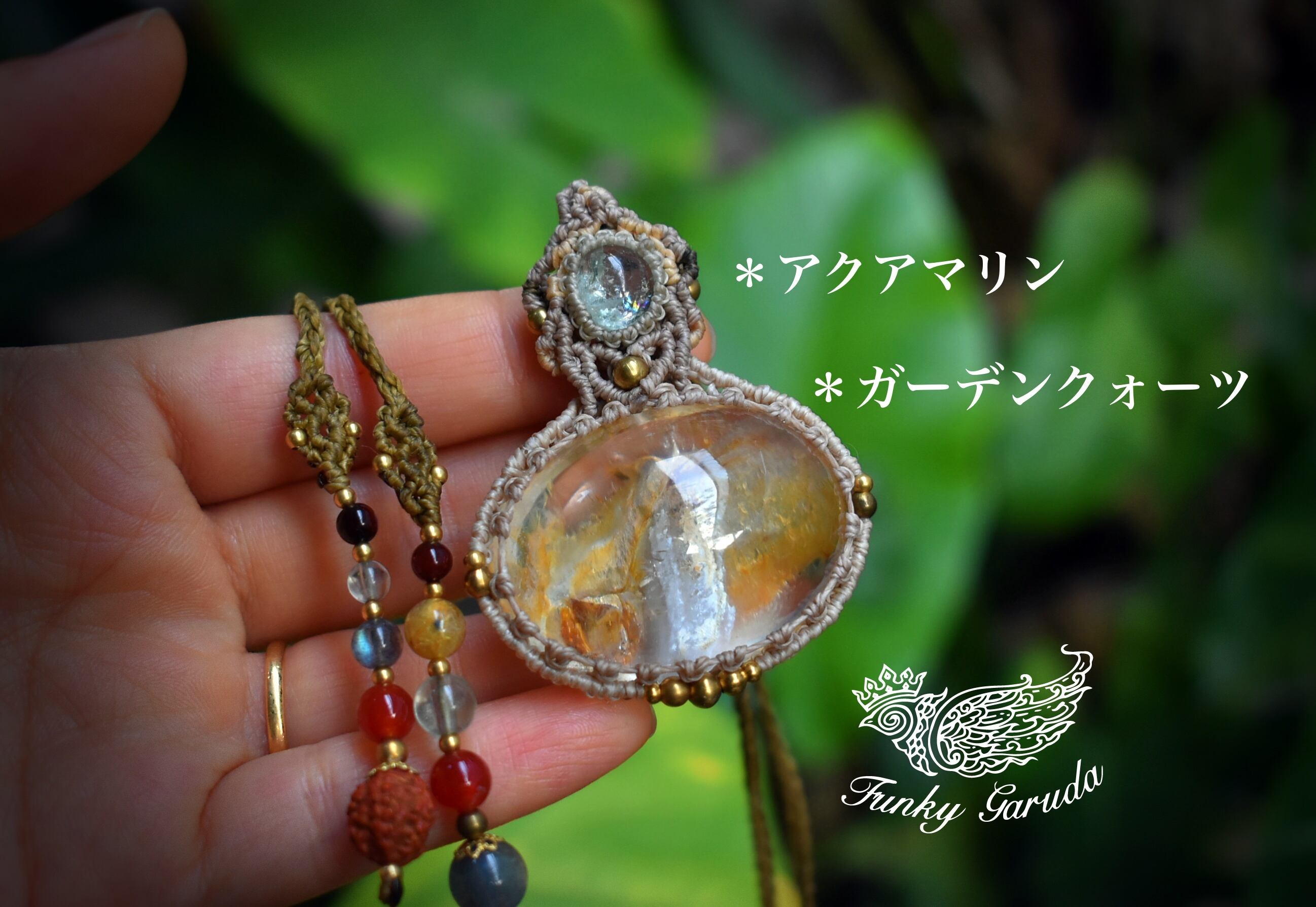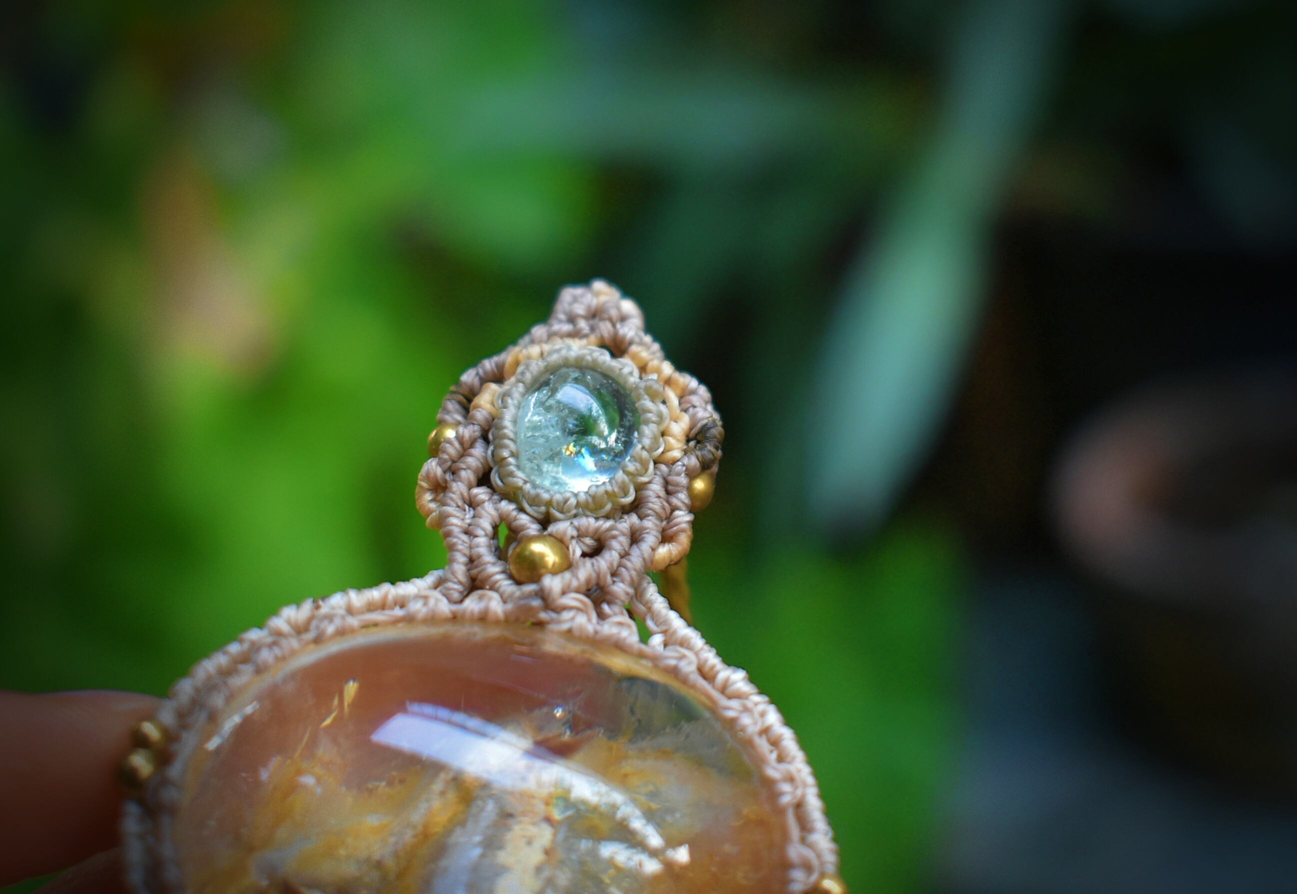 虹の見える★爽やかアクアマリン+ガーデン水晶 マクラメペンダント