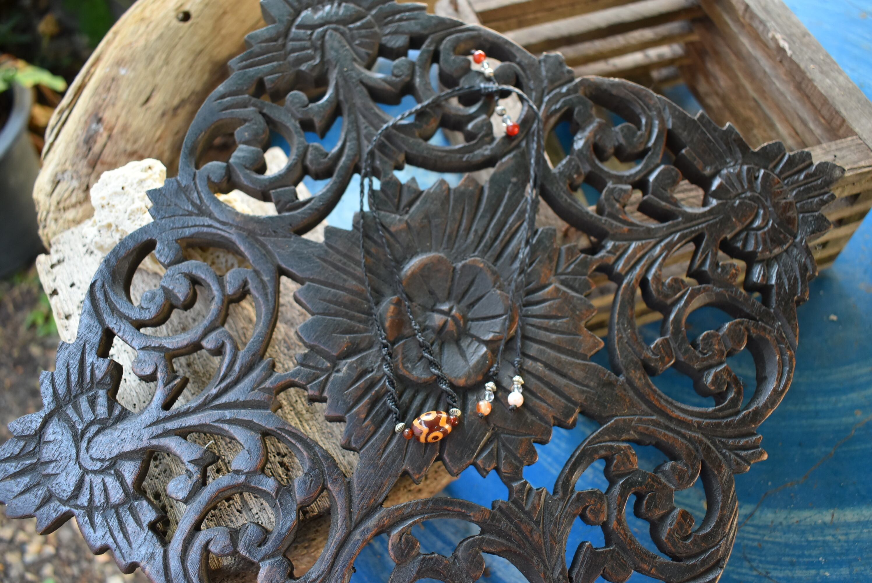 チベットから伝わる天珠ビーズのお守りのひとつを使用しチョーカーにもなるネックレスをカーネリアンビーズを組み合わせて使用し、仕上げました。