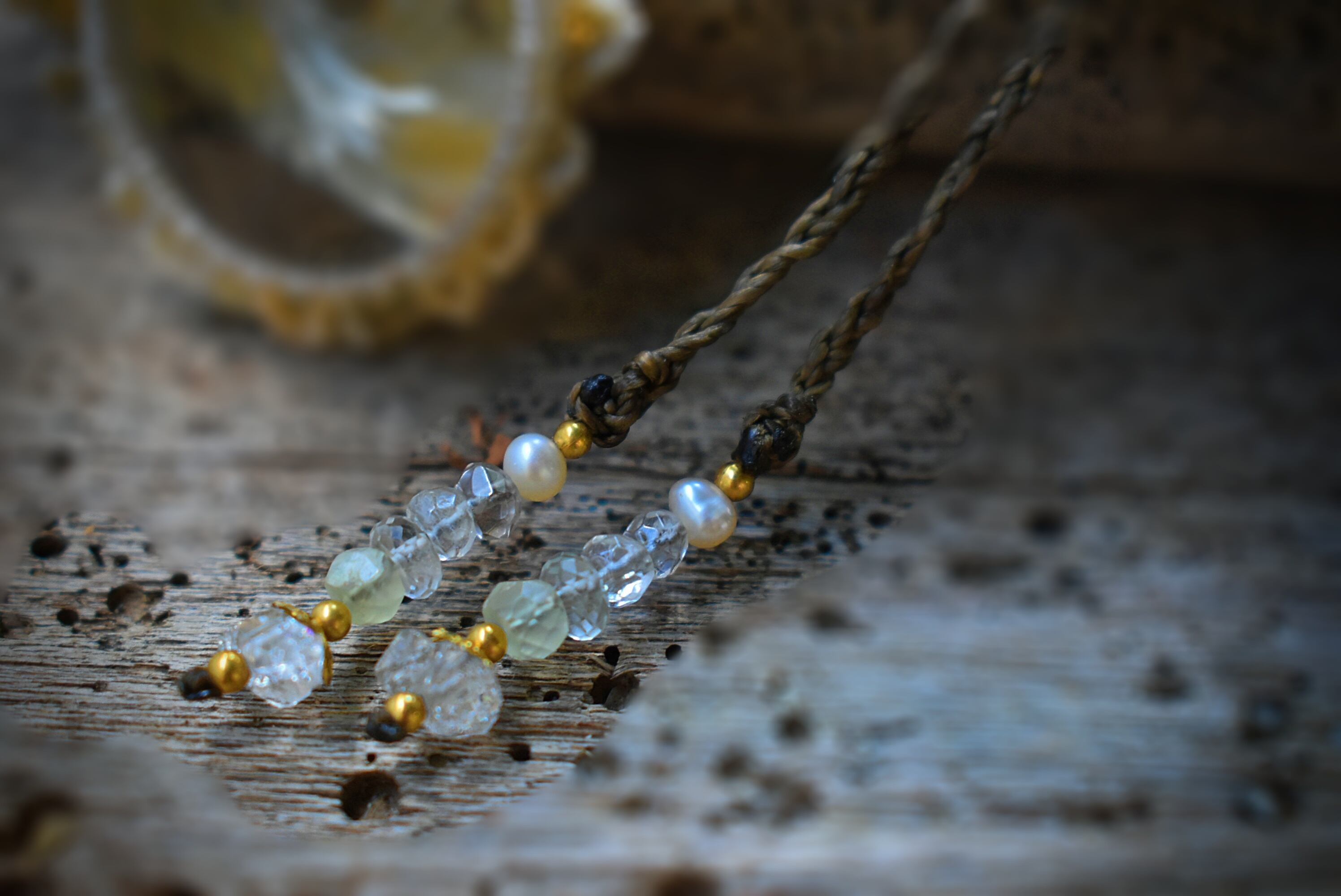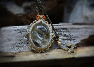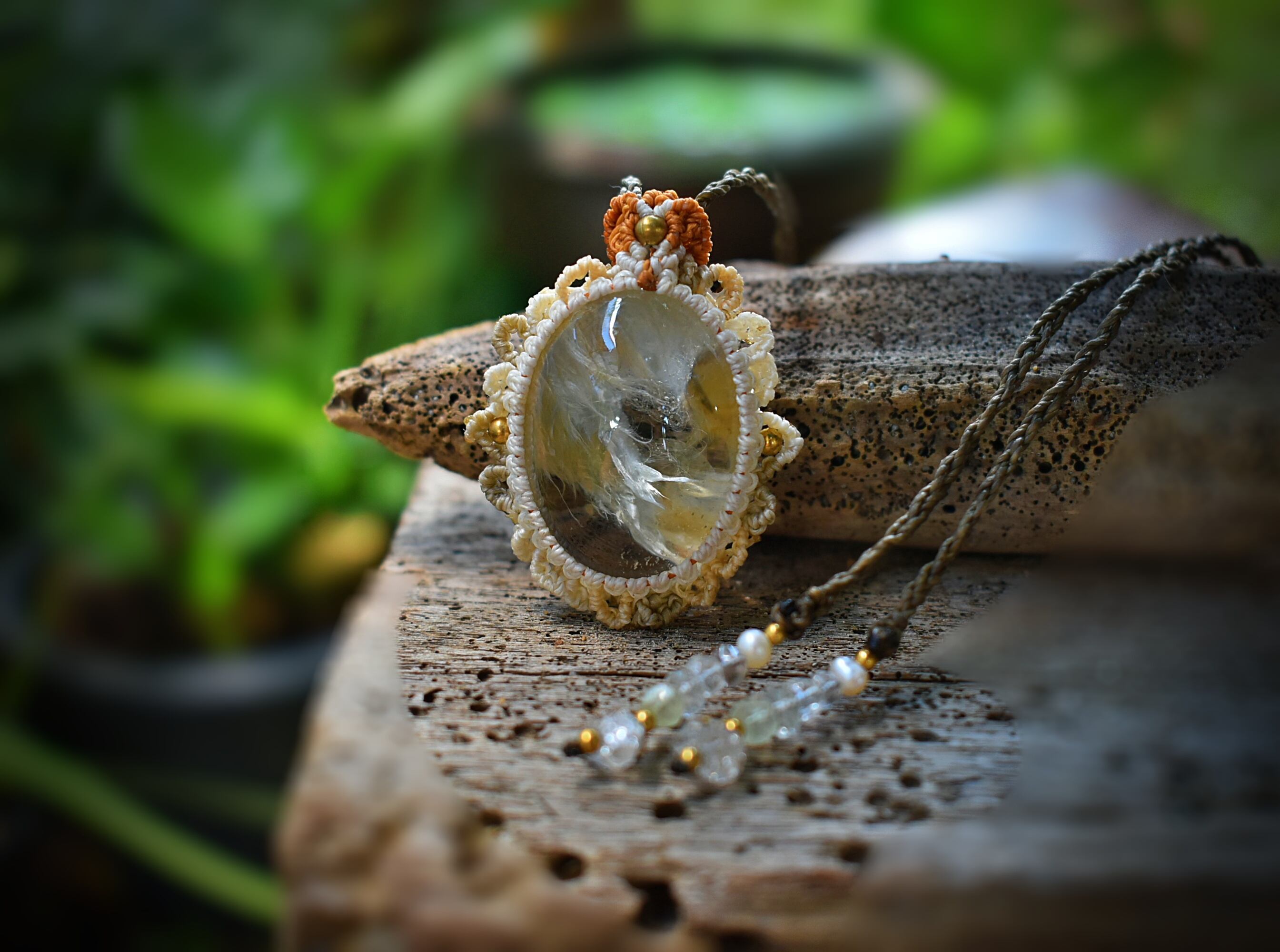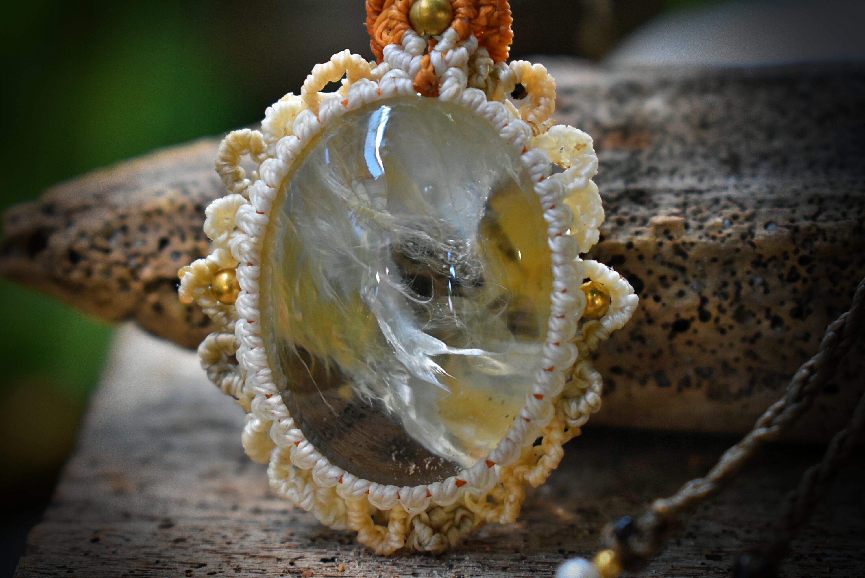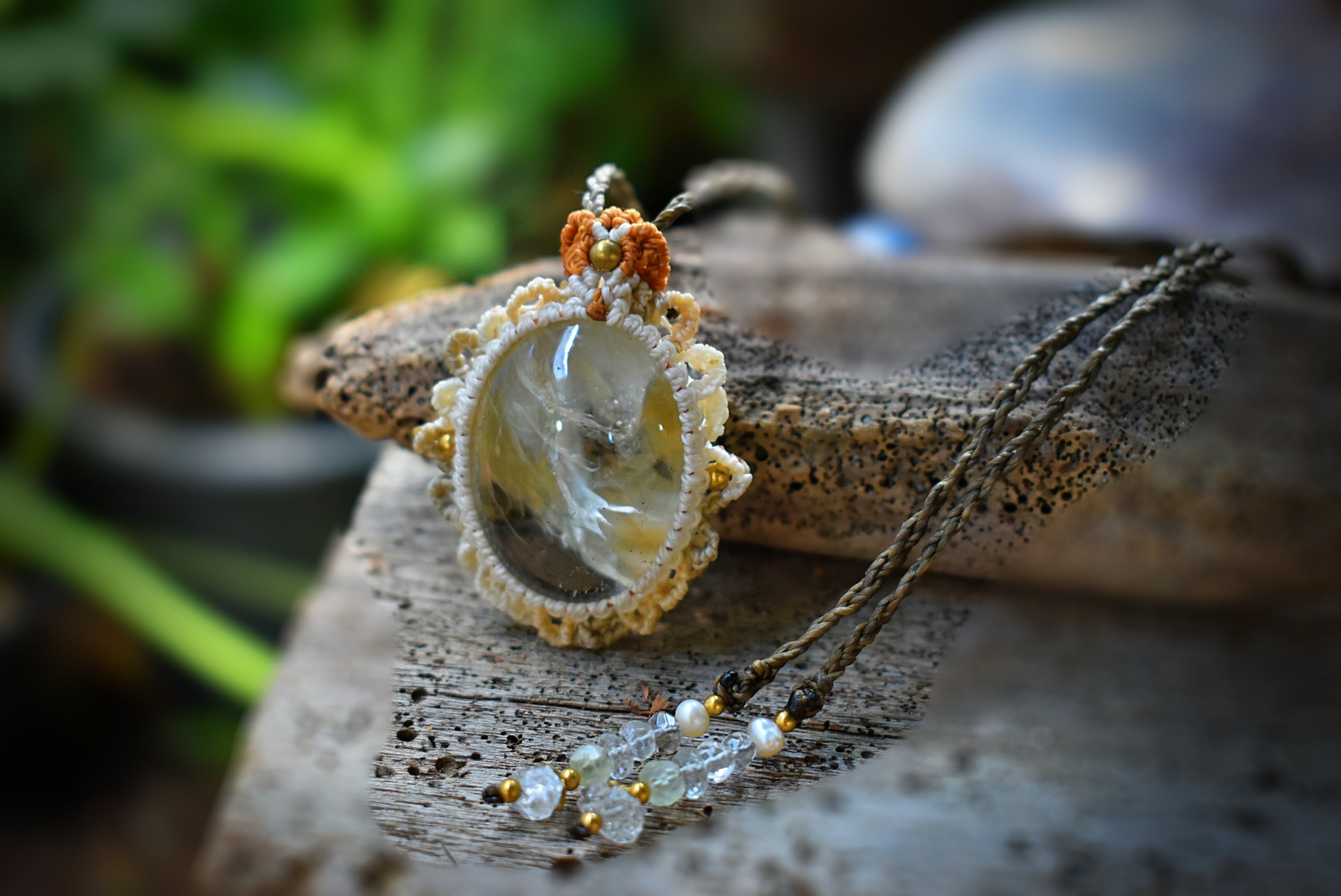 このたびのガーデンクォーツは画像から見てとれる、水晶の中に風になびくような繊細なホワイトカラーの毛並みをしっかりと見てとることのできる、とてもレアなホワイトガーデンクォーツを泡のように、花のように、この世界に生きる微生物のように意識を集中させてマクラメ編み装飾を施し、ペンダントに仕上げました。