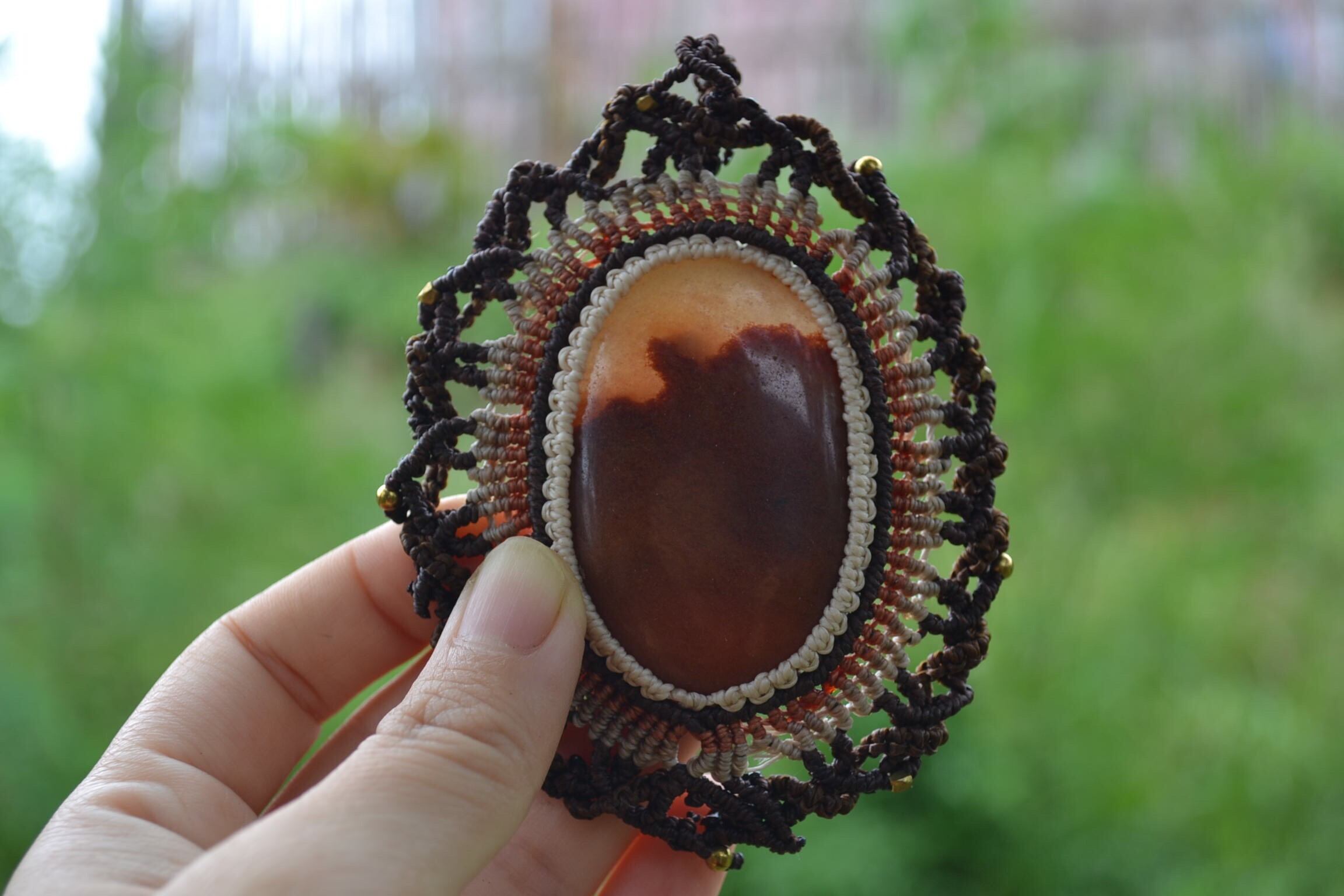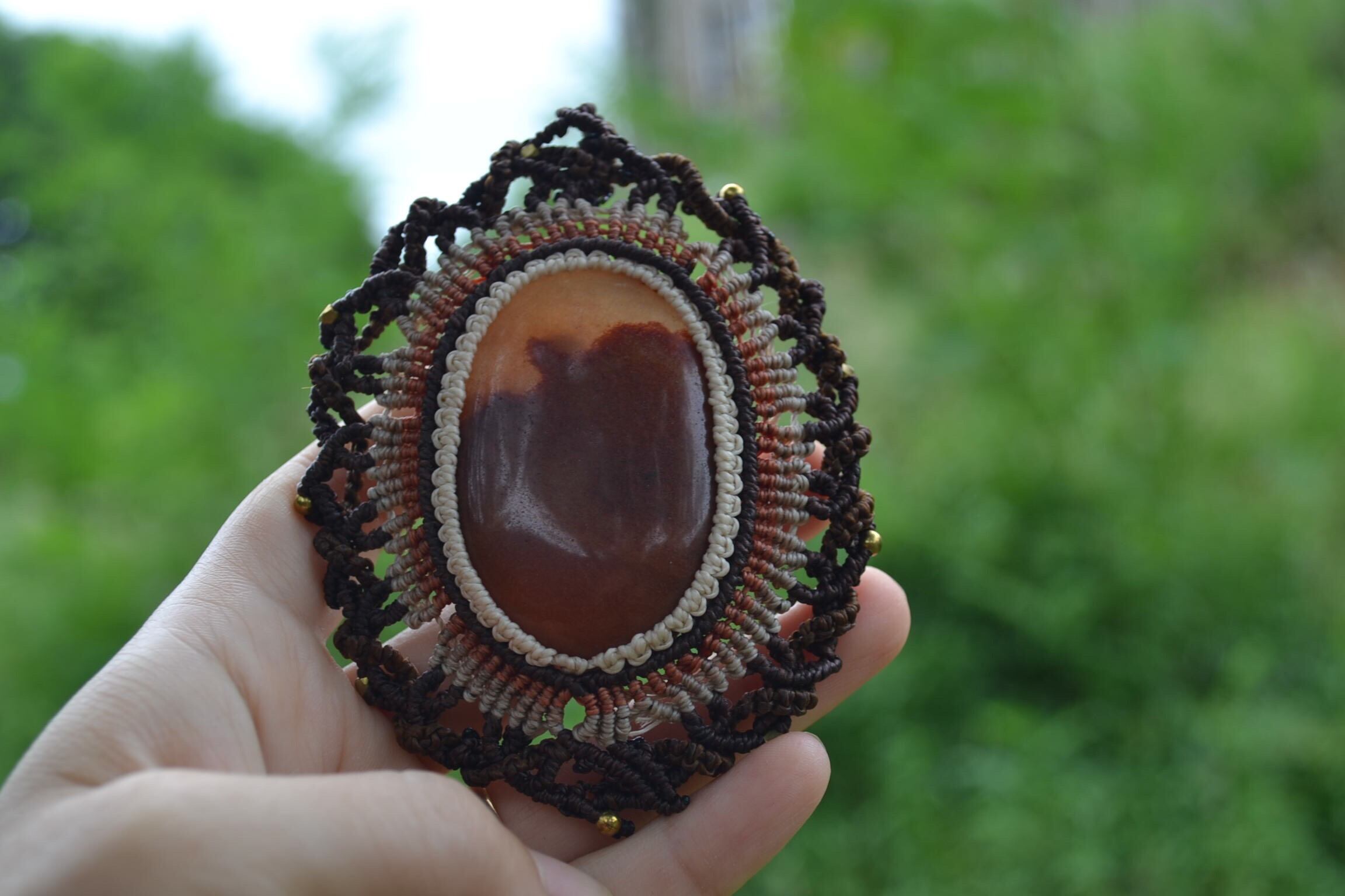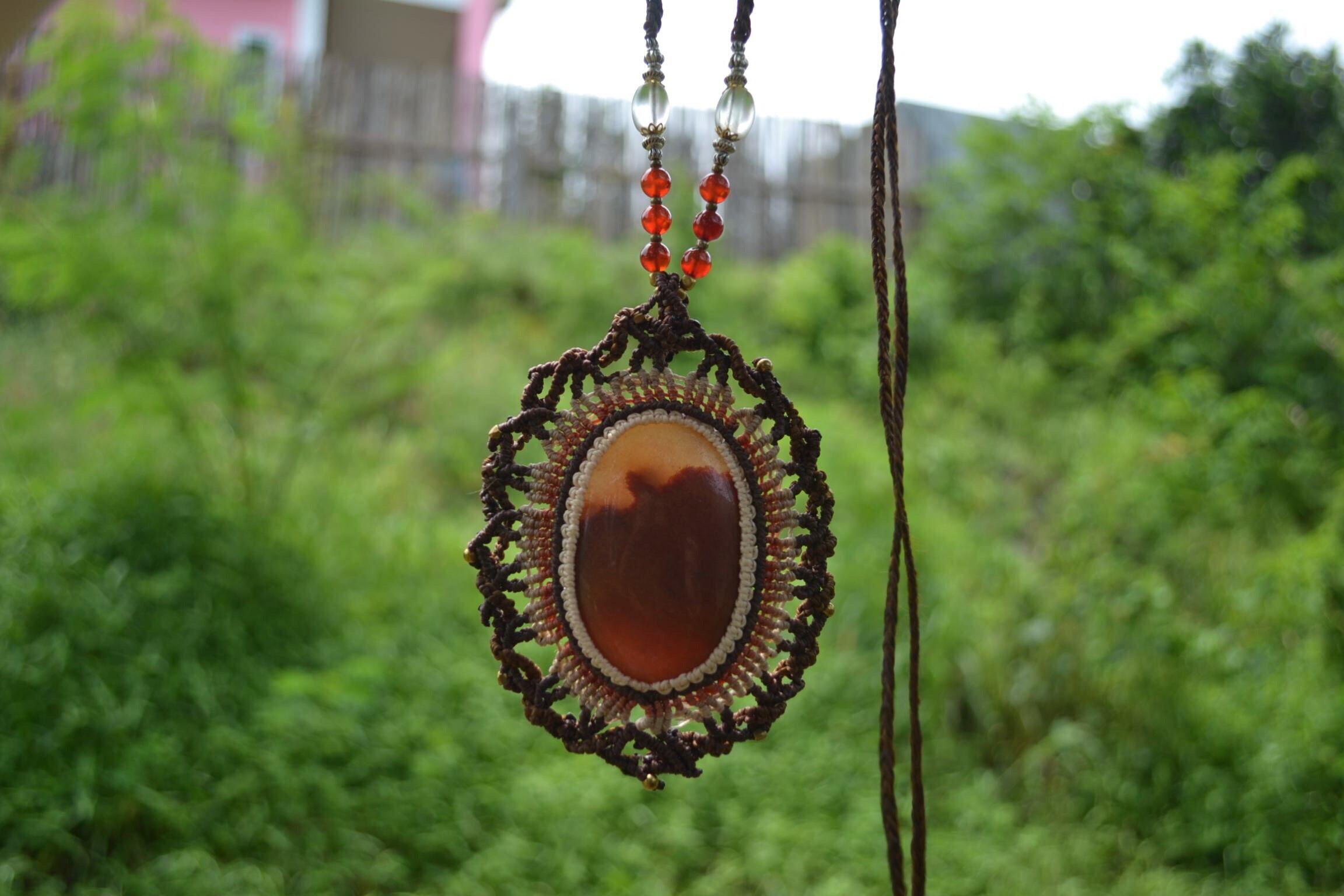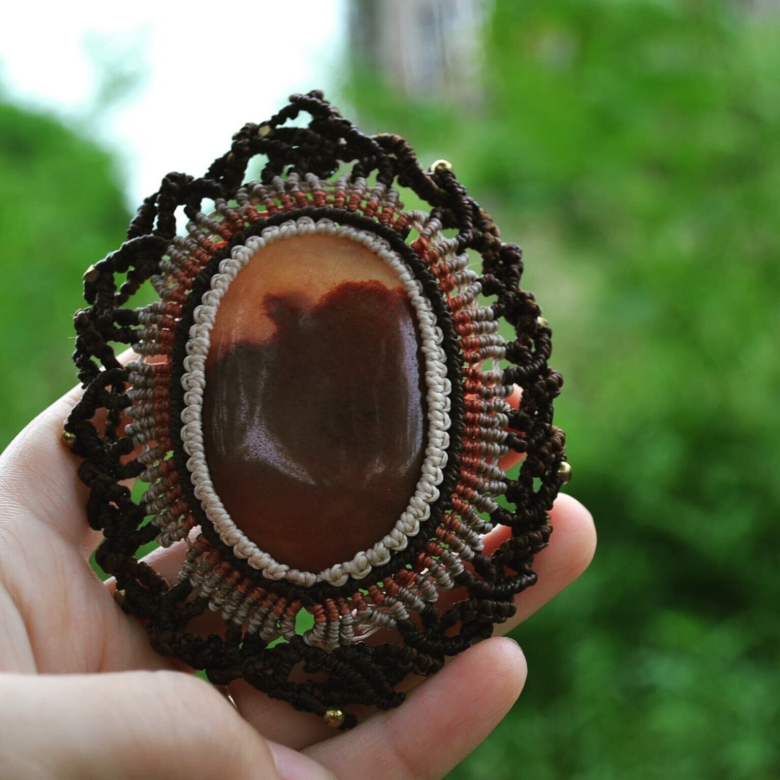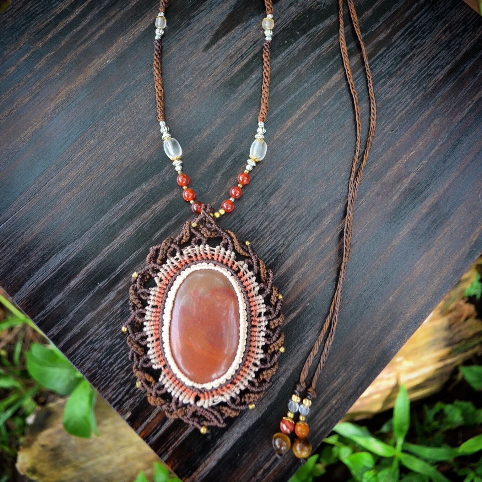大きなオレンジジャスパーのルースをマクラメ編み装飾してペンダントにしました。こちらのアゲードはとても珍しい柄を持っている石といえます、中にはキラキラとしたラメのようなものが見ることができ、天然石サンストーンにも似ているような色味を持ち合わせています。この度はこの石の色味と個性に負けないようにしっかりと、太陽のようにマクラメ編み装飾を施しました。胸元に装着していただくと、美しく存在感を放つアクセサリーになりました。このような石を取り扱うことができて、とても光栄です。