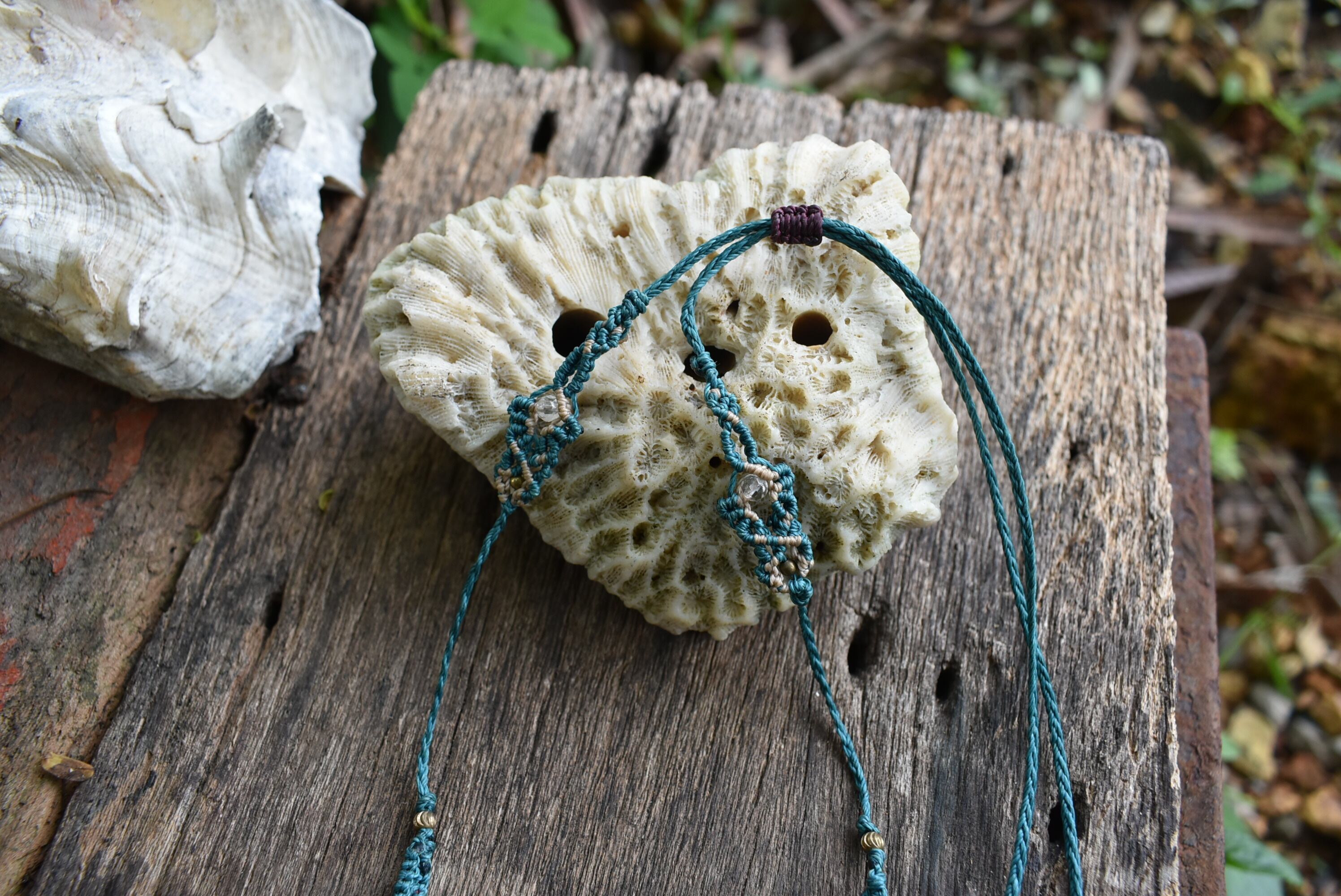 サイドのネックレス部分はさりげなく、小ぶりのでダイヤモンドカットされたクリアクオーツをトッピングし、その周りをマクラメ編み装飾をほどこし、凹凸のあるひきしまったデザインを編み出しました。
