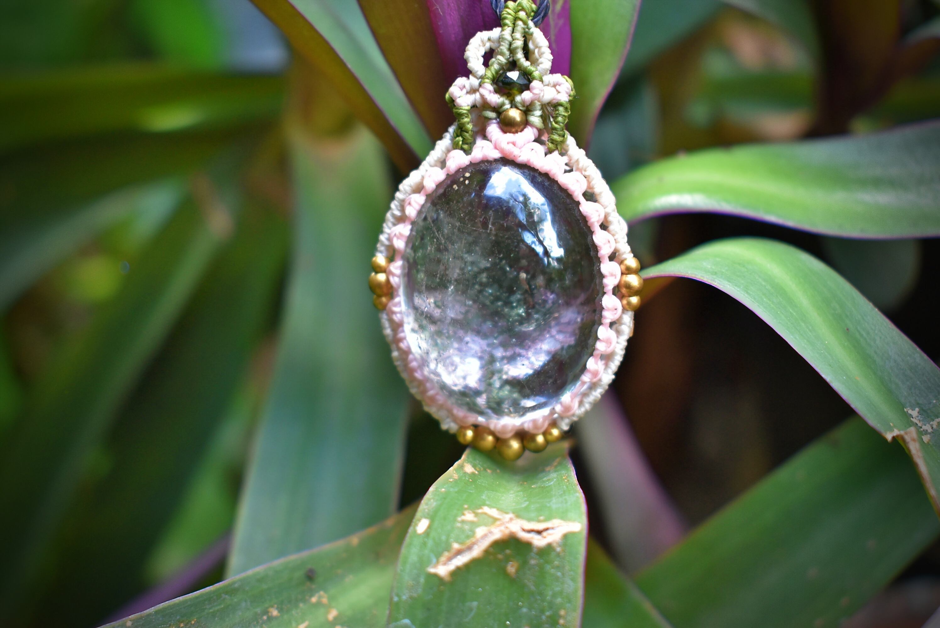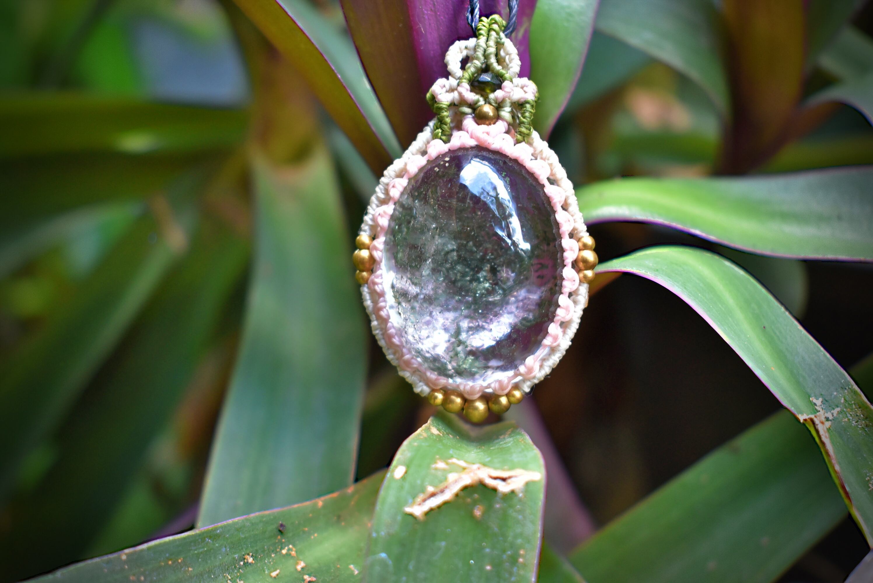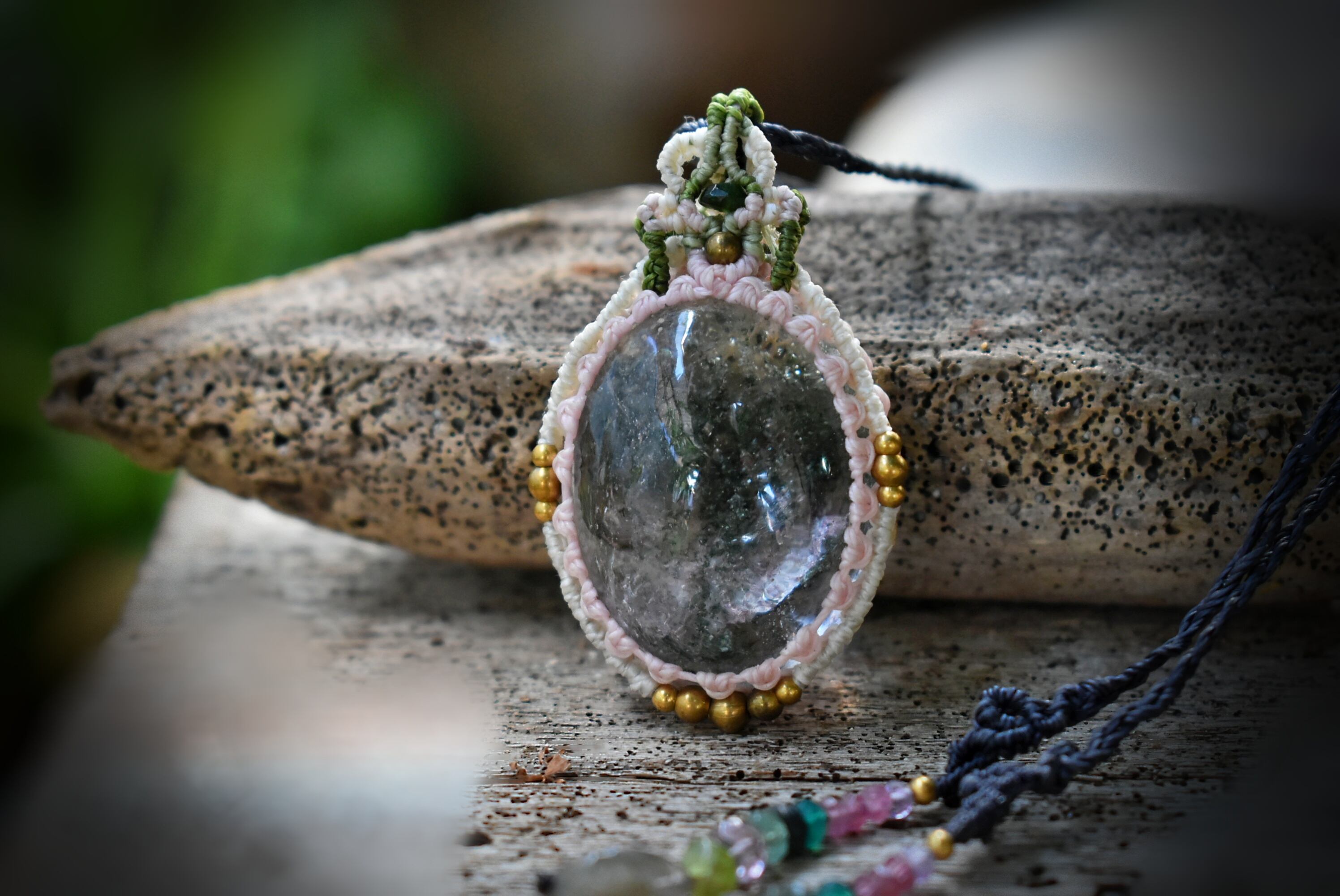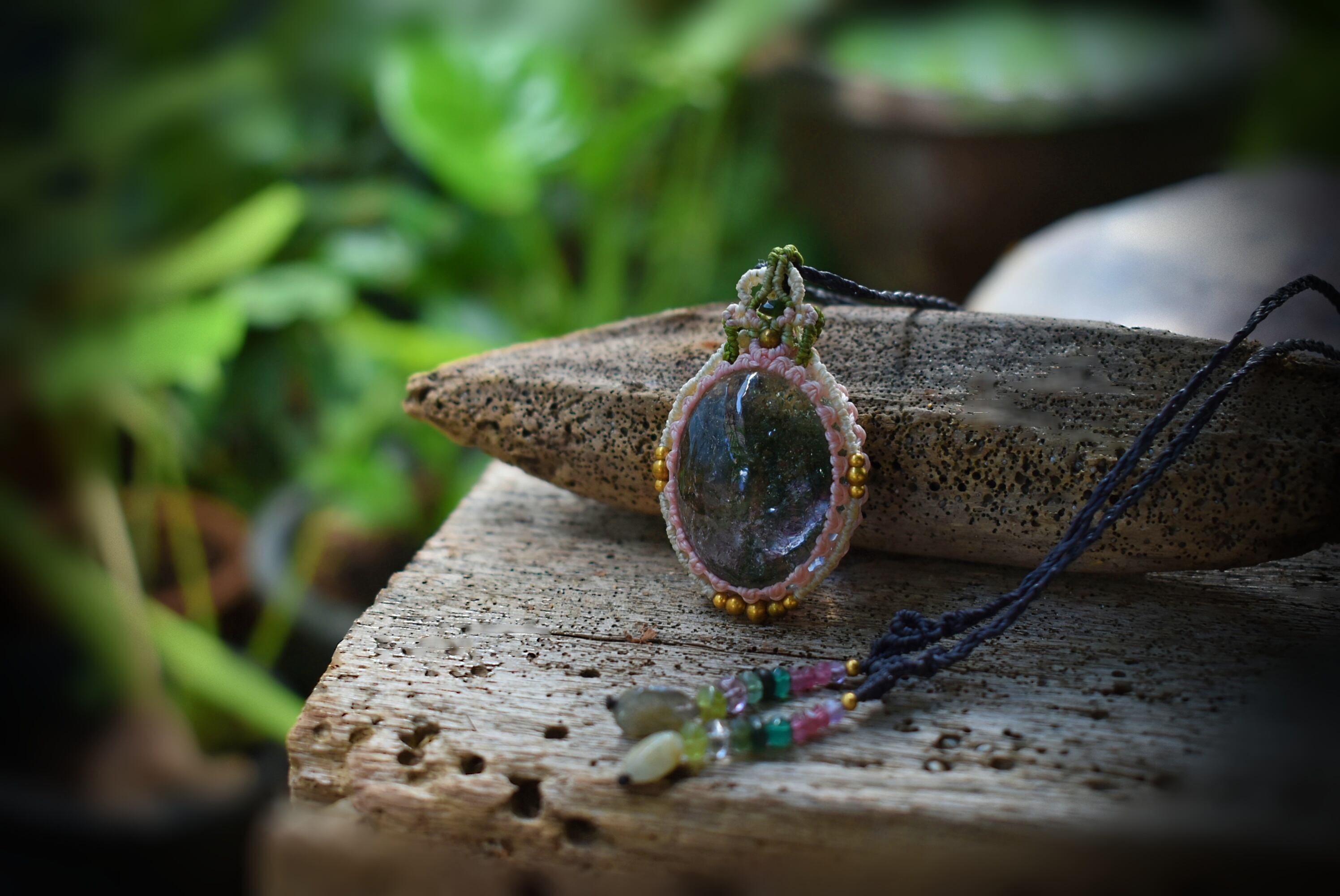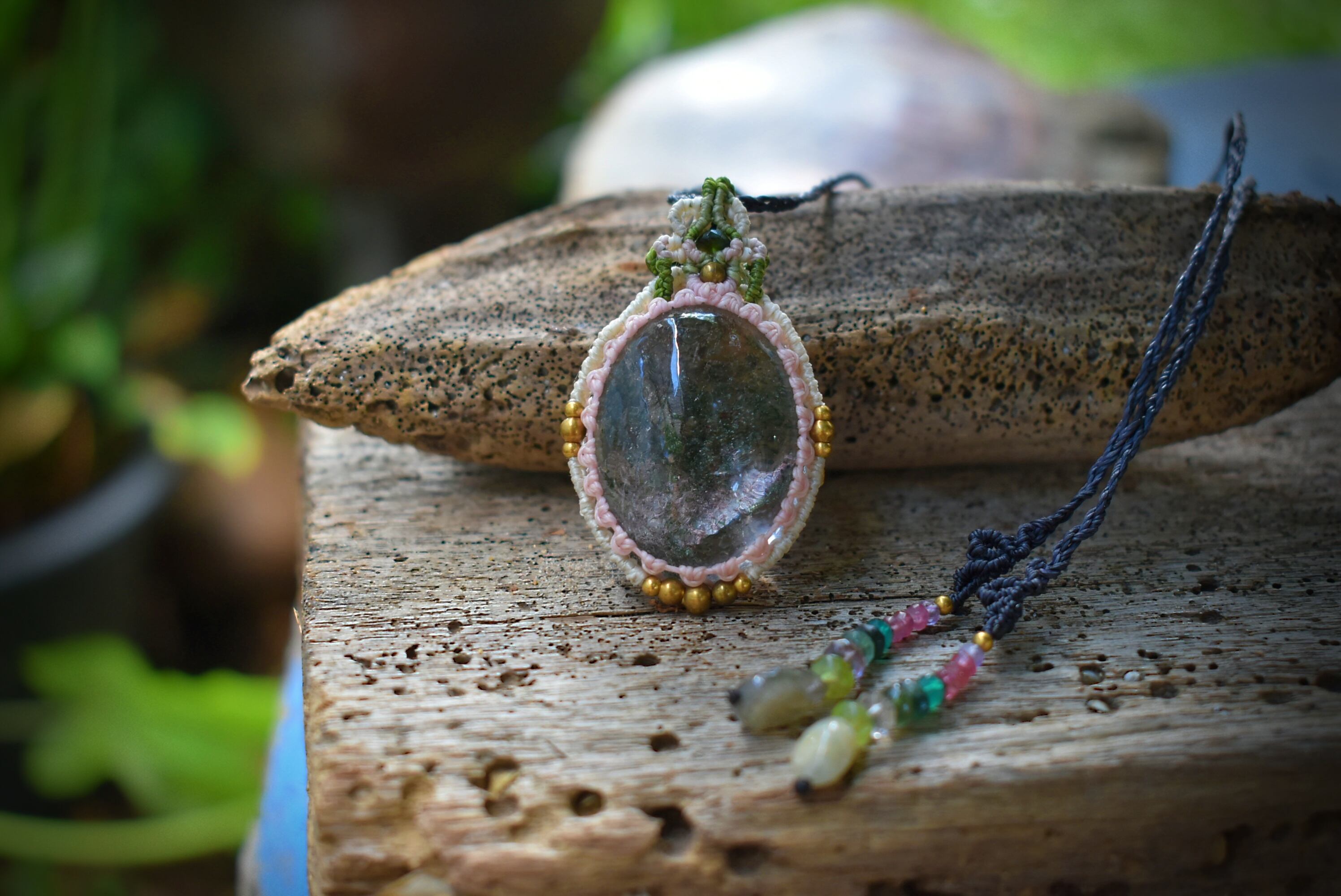 こちらは色味が大変ハッキリとしており、ギラギラのシラー。どれもがユニークな地球の芸術品。この石の繊細な色味を意識してマクラメ編みを施し、ペンダントに仕上げました。クローライト入りガーデンクォーツをお探しの方へオススメの一粒です。
