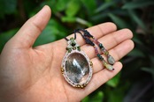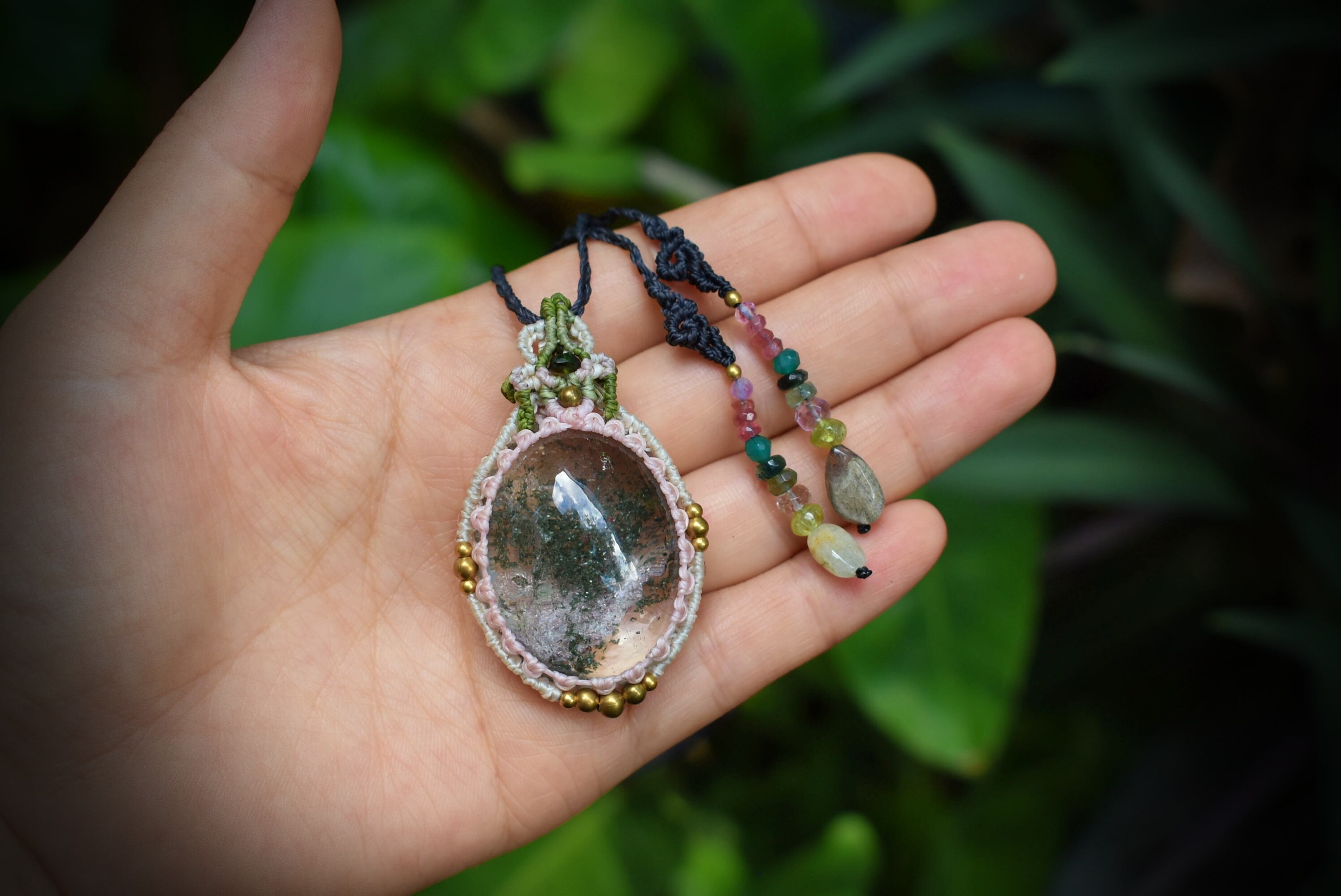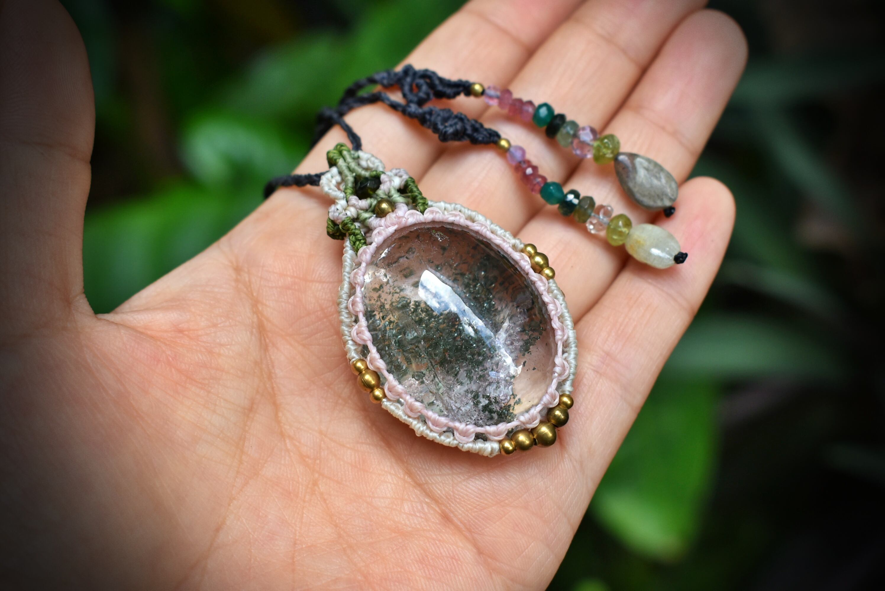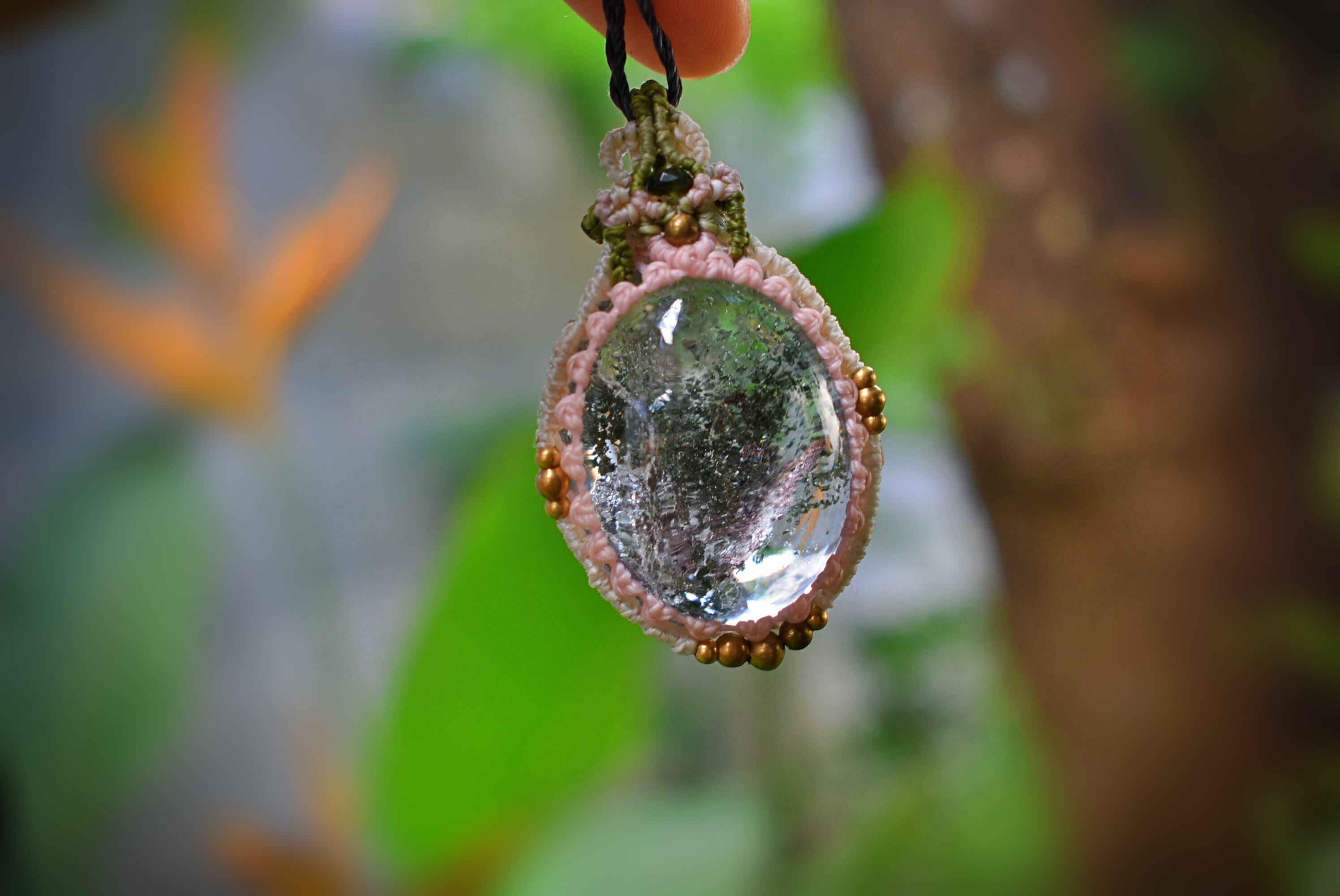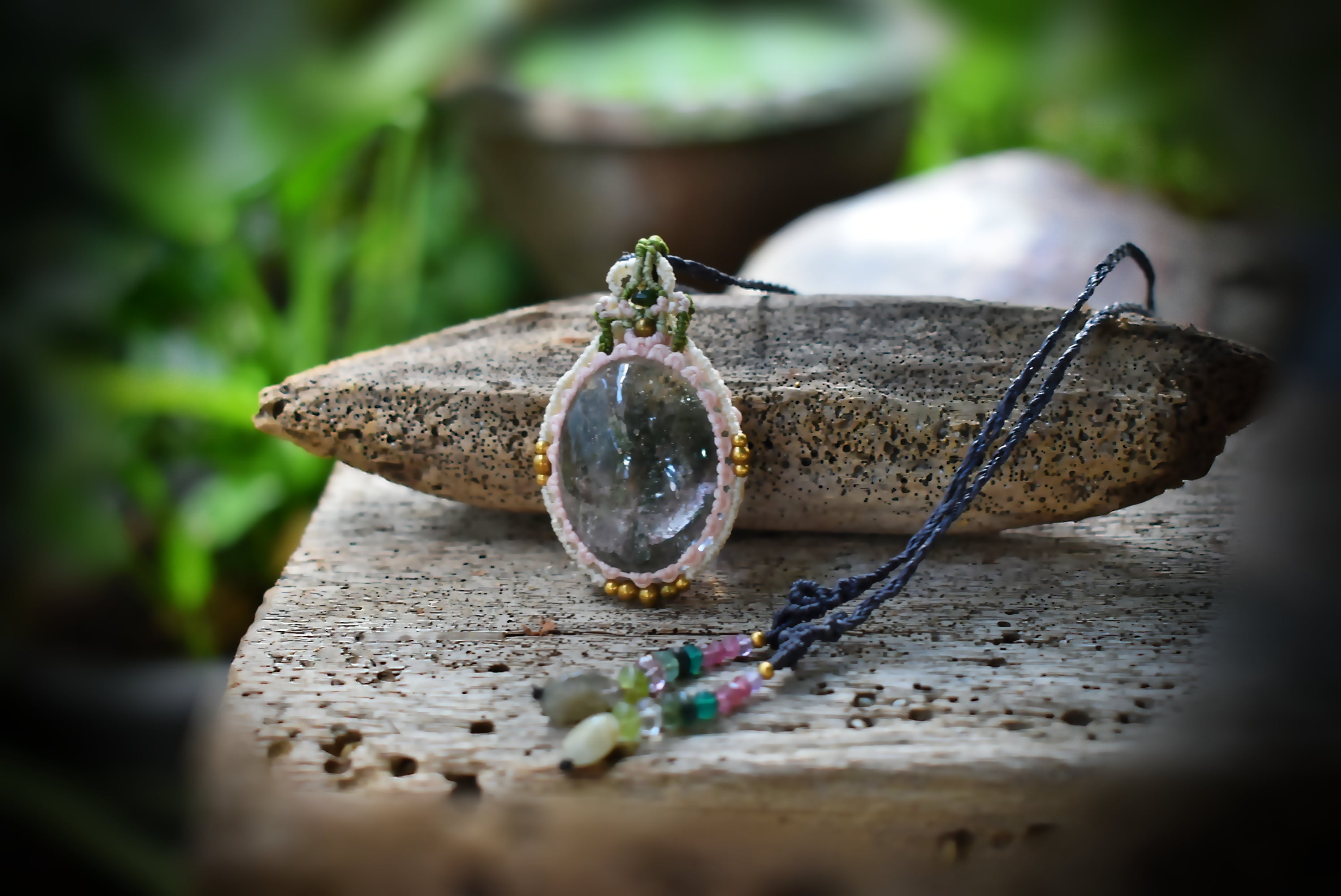 こちらは色味が大変ハッキリとしており、ギラギラのシラー。どれもがユニークな地球の芸術品。この石の繊細な色味を意識してマクラメ編みを施し、ペンダントに仕上げました。クローライト入りガーデンクォーツをお探しの方へオススメの一粒です。
