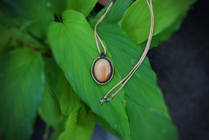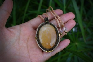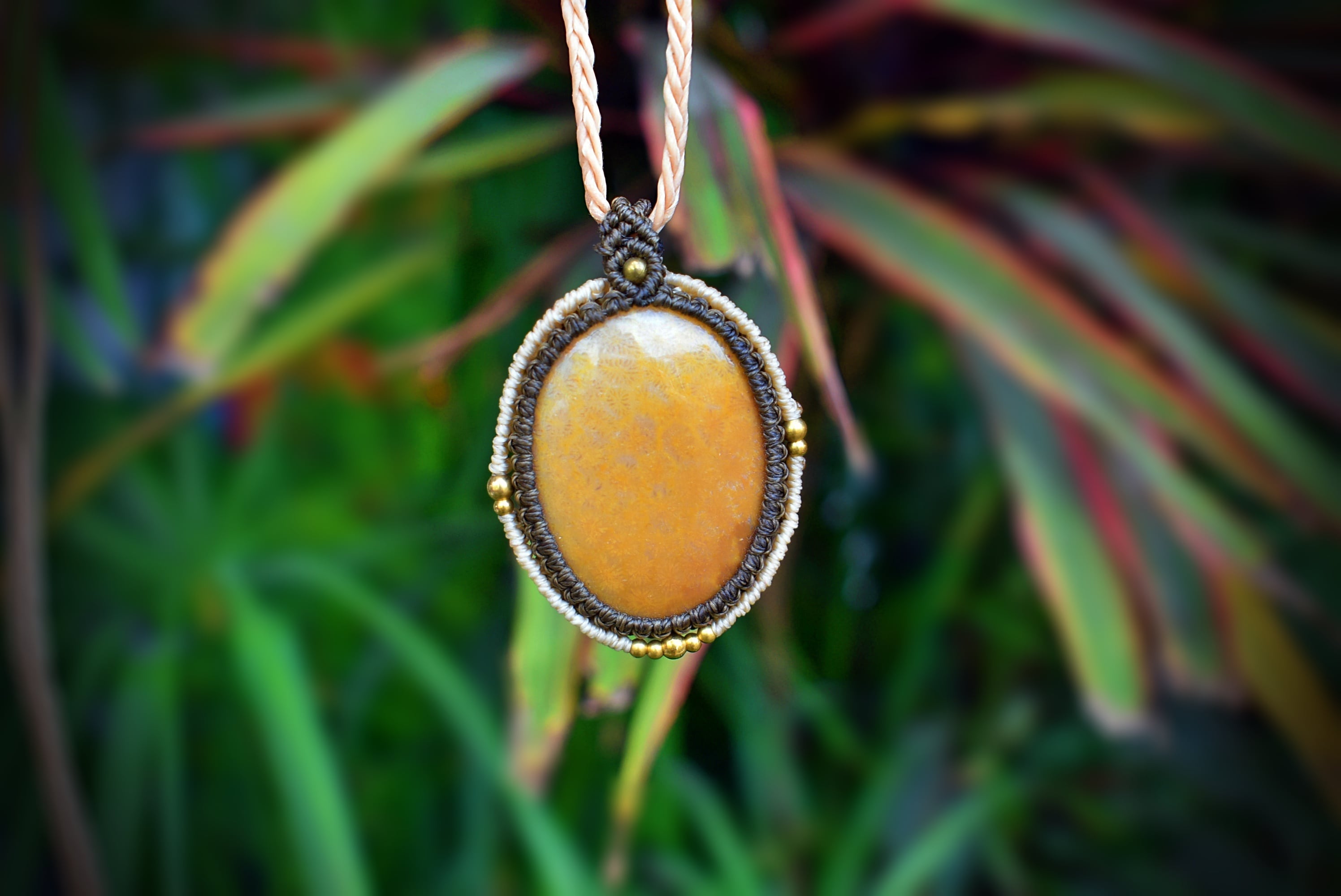 かすかな模様が鱗のように入り込んだフォッシルコーラル。この石に真鍮ビーズをトッピングしてマクラメ編みペンダントを仕上げました。オレンジ色が強いこのたびのフォッシルコーラルはやや透け感もあり、コーラル特有の細やかな柄をグラデーション状に見てとることができます。