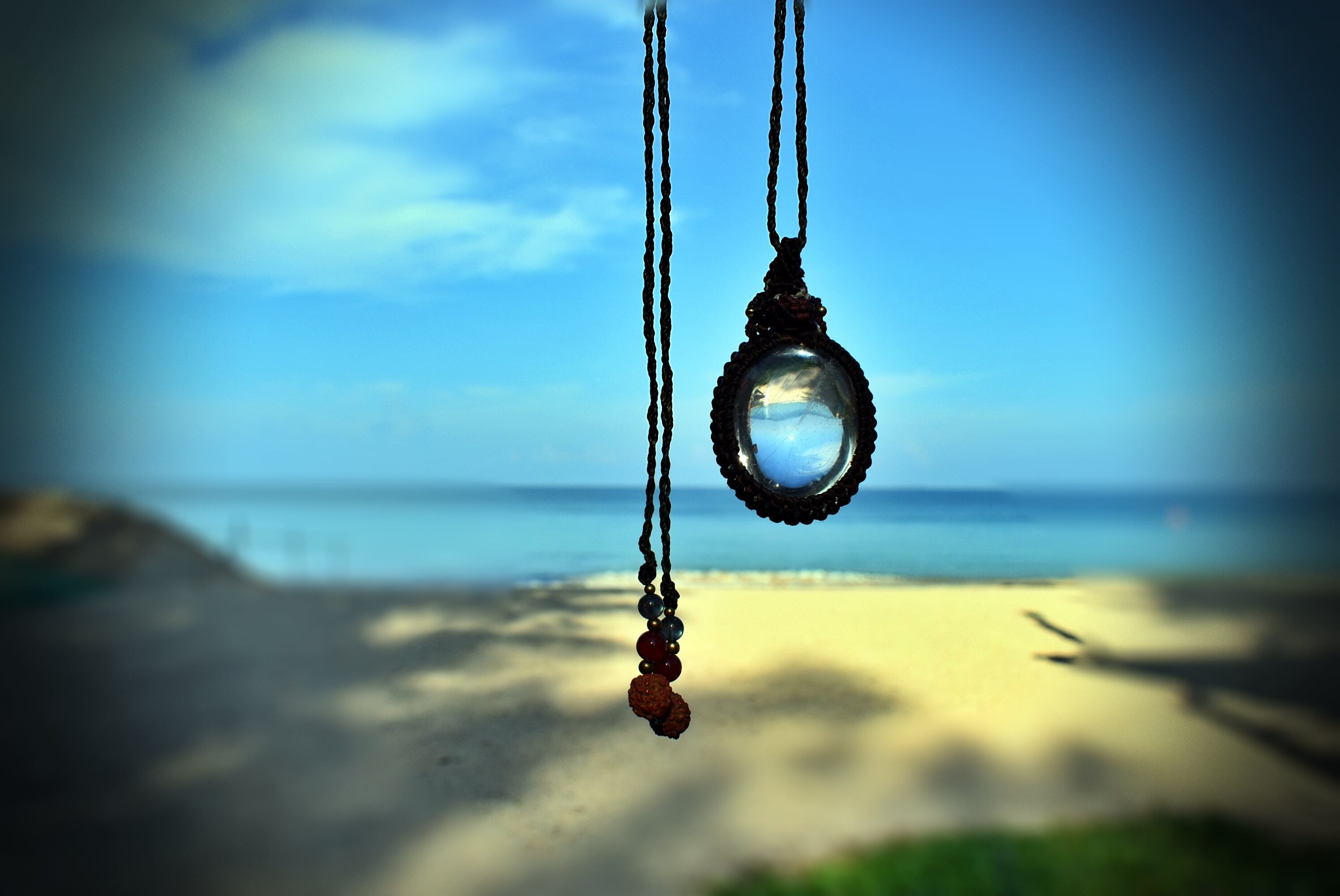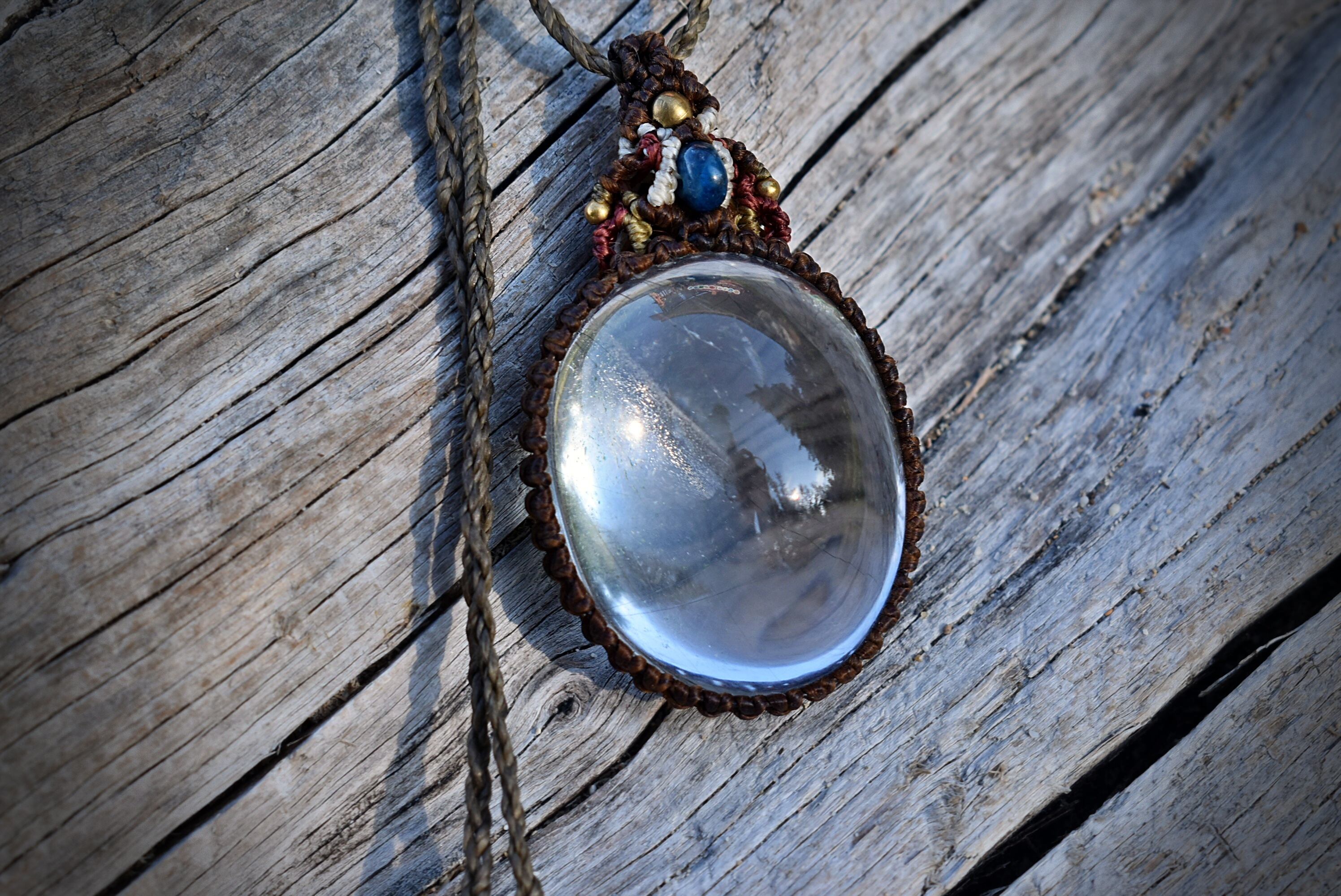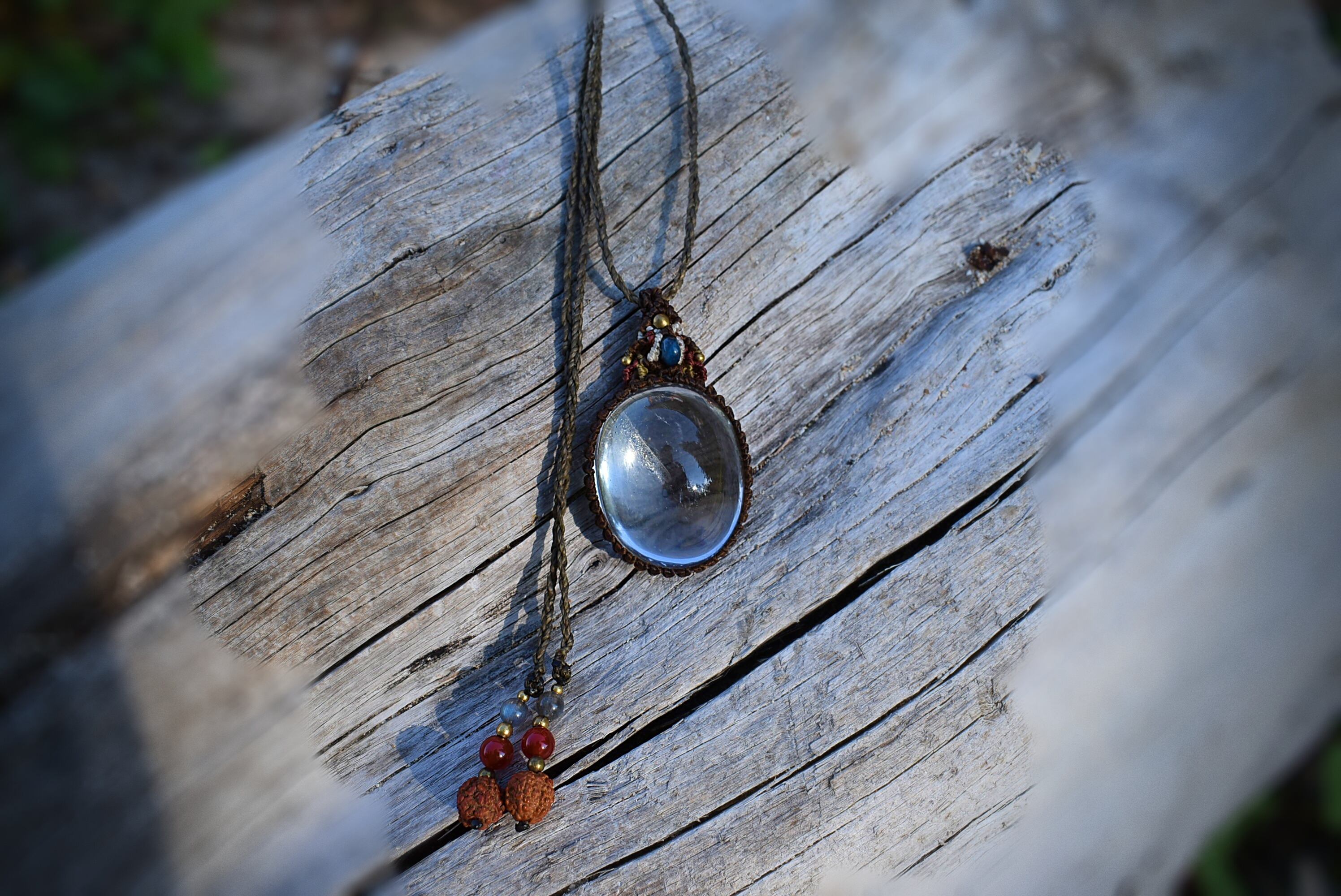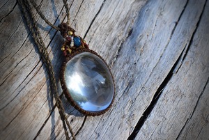 クリアクォーツ。この水晶をシンプルに、かつトップの部分にブルーアパタイトビーズをトッピングしてペンダントにマクラメ編み装飾を施しました。