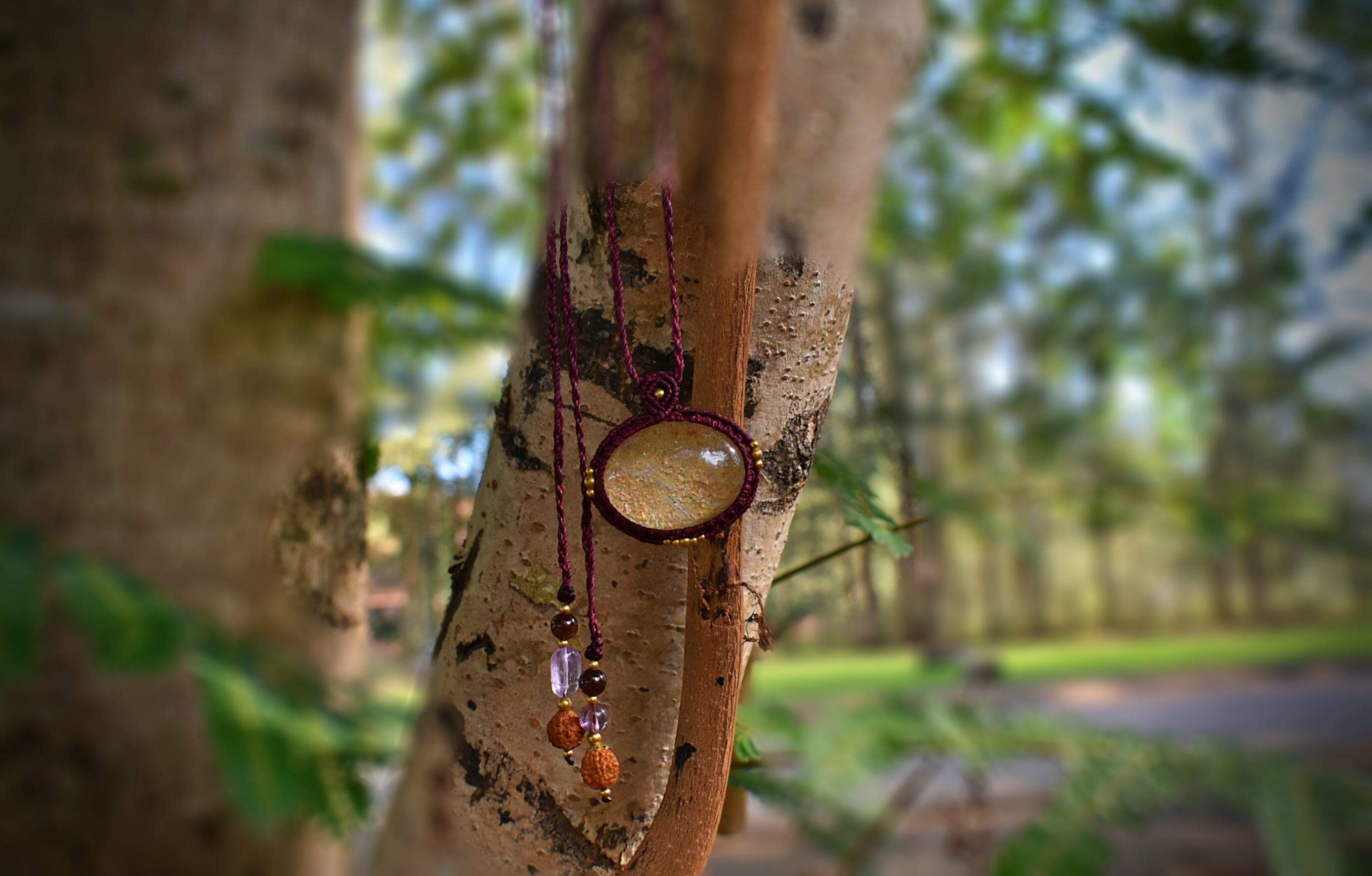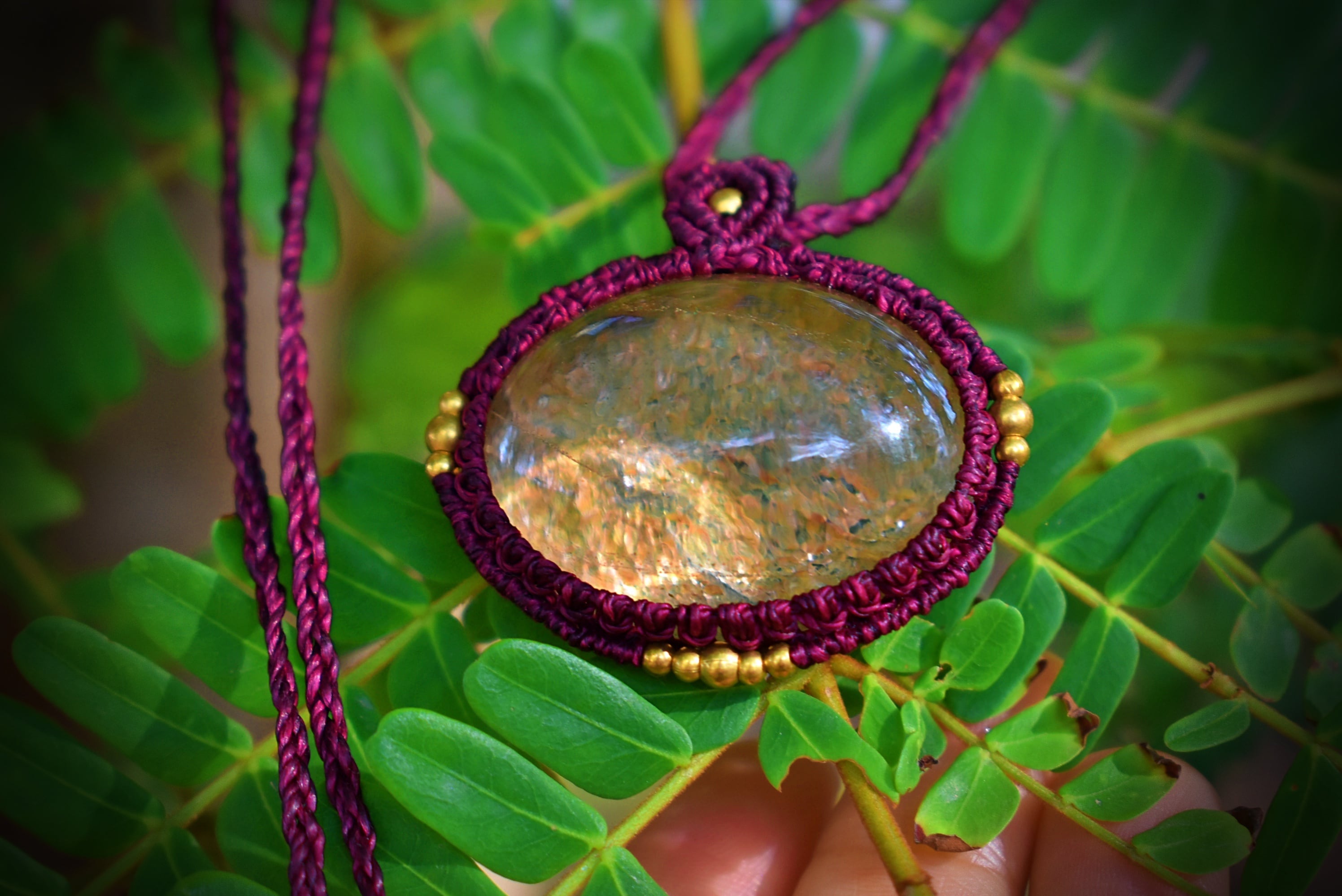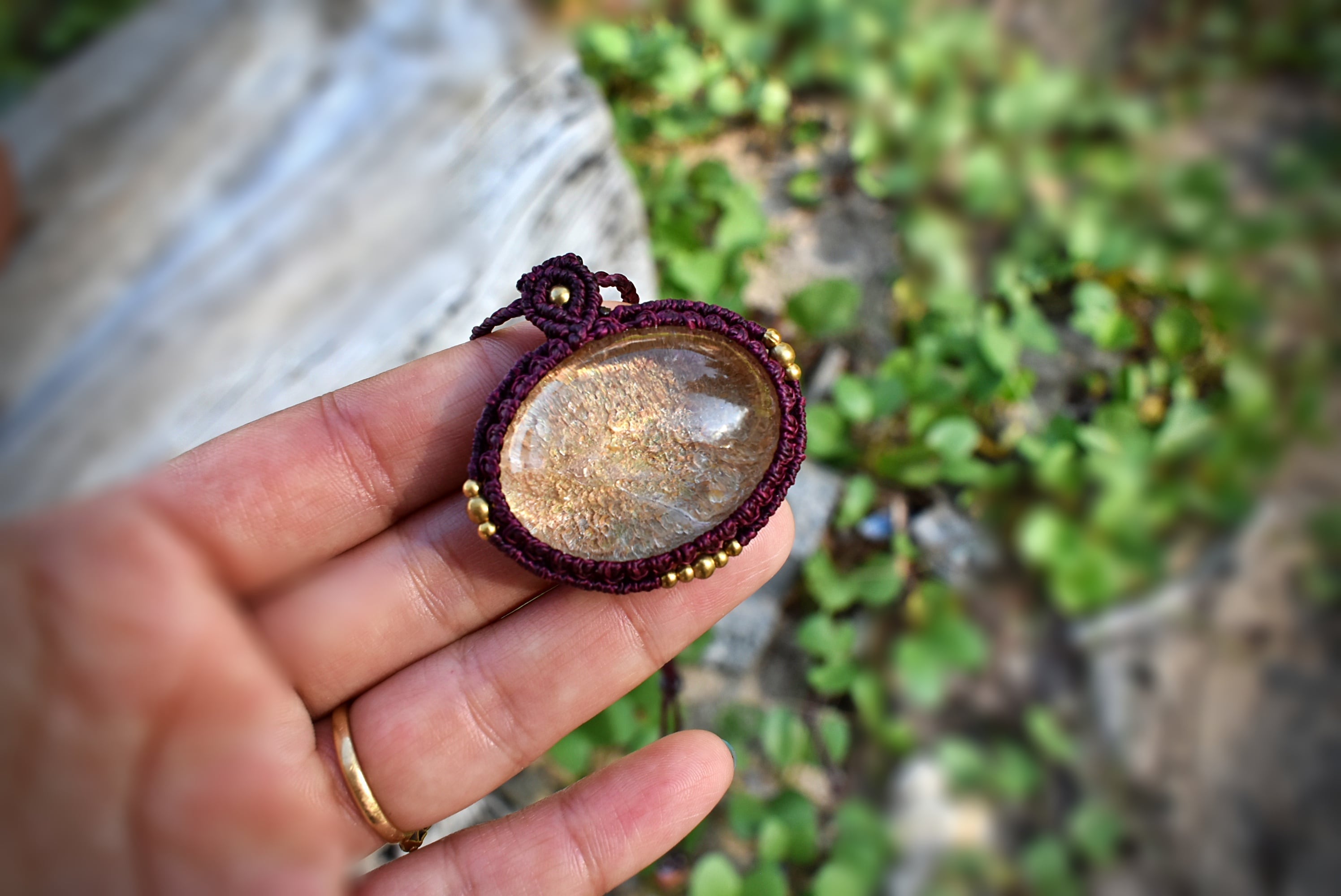 このたびのガーデンクォーツはまさにゴールドイエローカラーの鱗のようなシラーが水晶の中に少しずつ生えているような、美しいぷるんとしたゴールドガーデンクォーツをこの石が一番美しく見える角度でペンダントとしてマクラメ編み装飾を施して仕上げました。