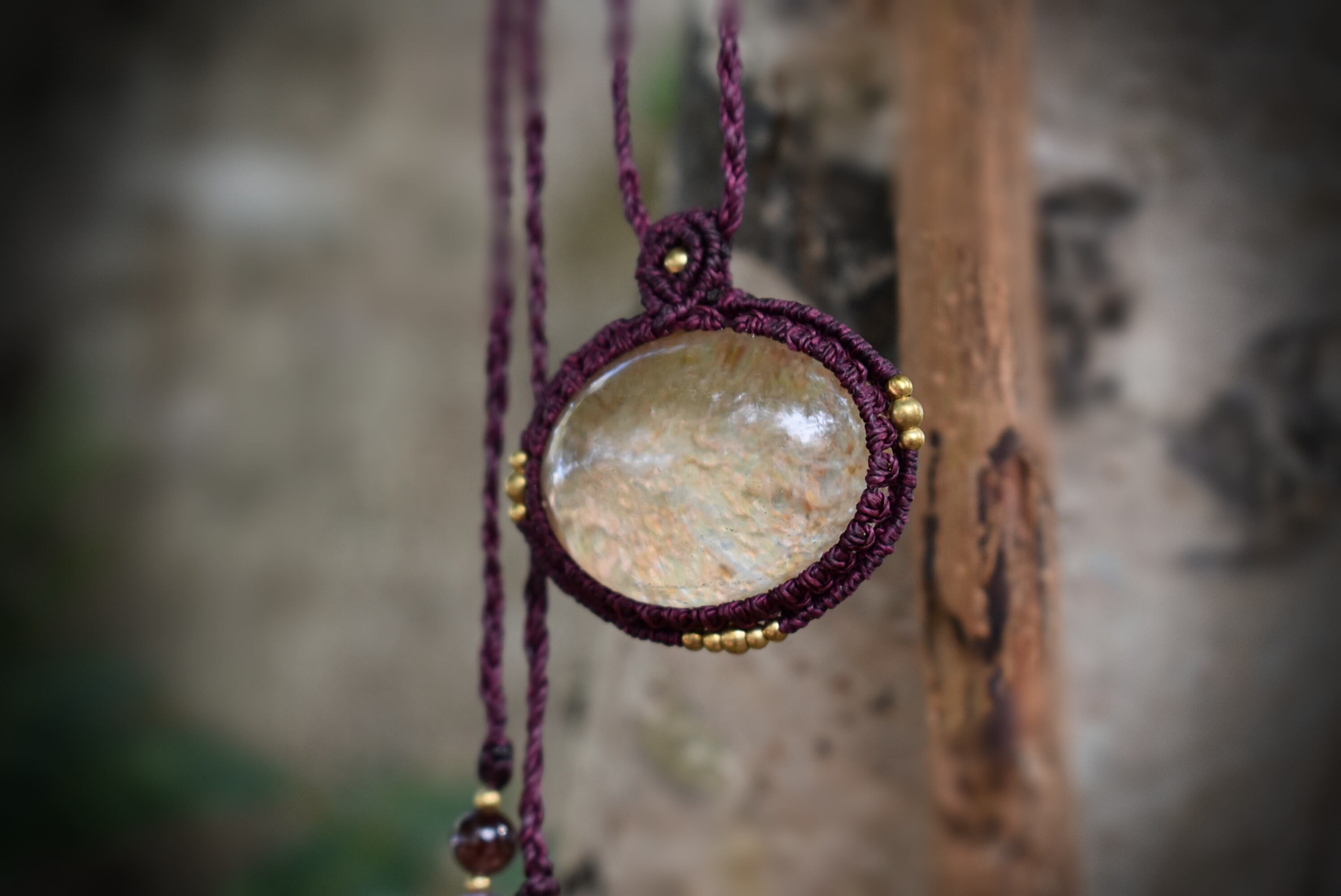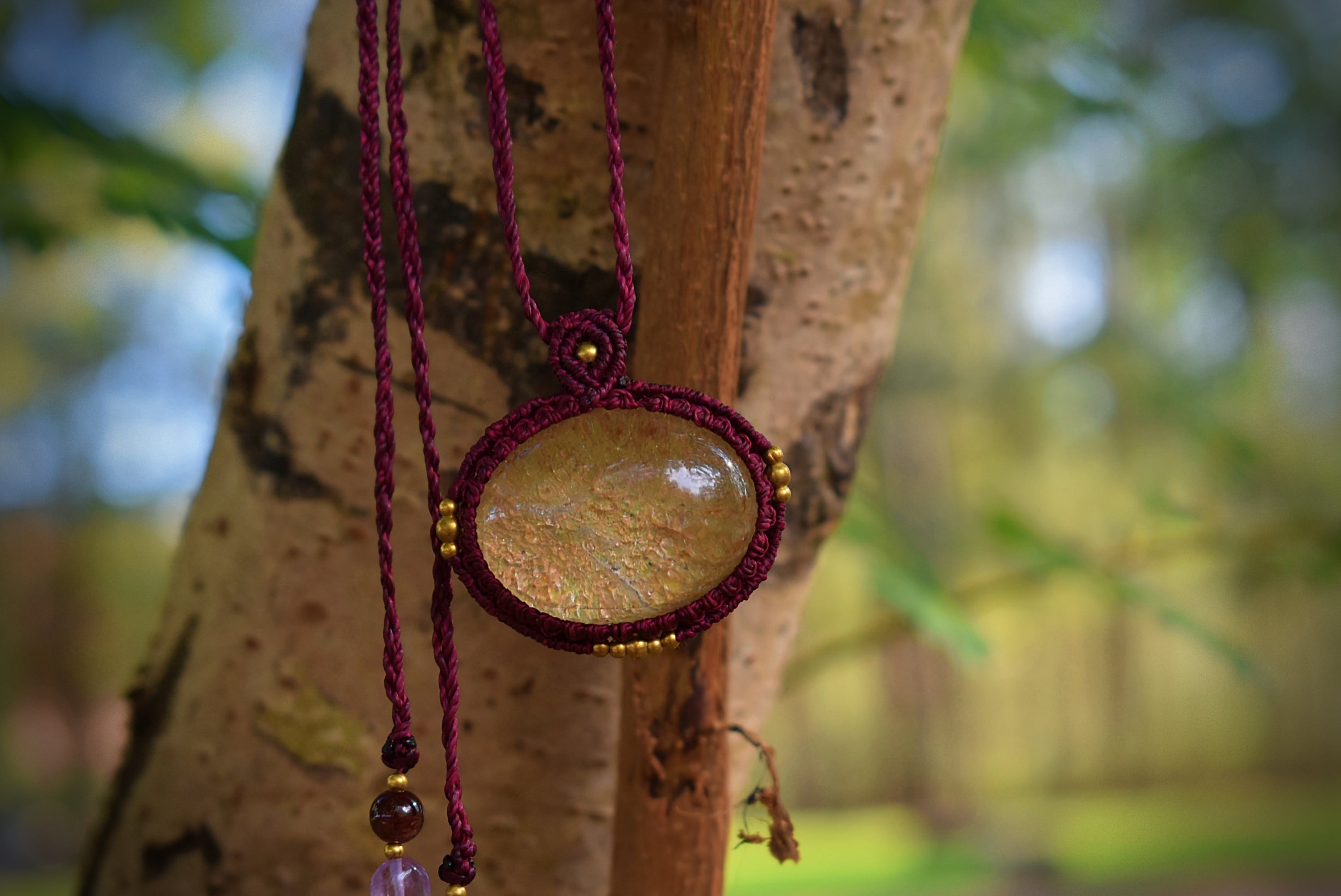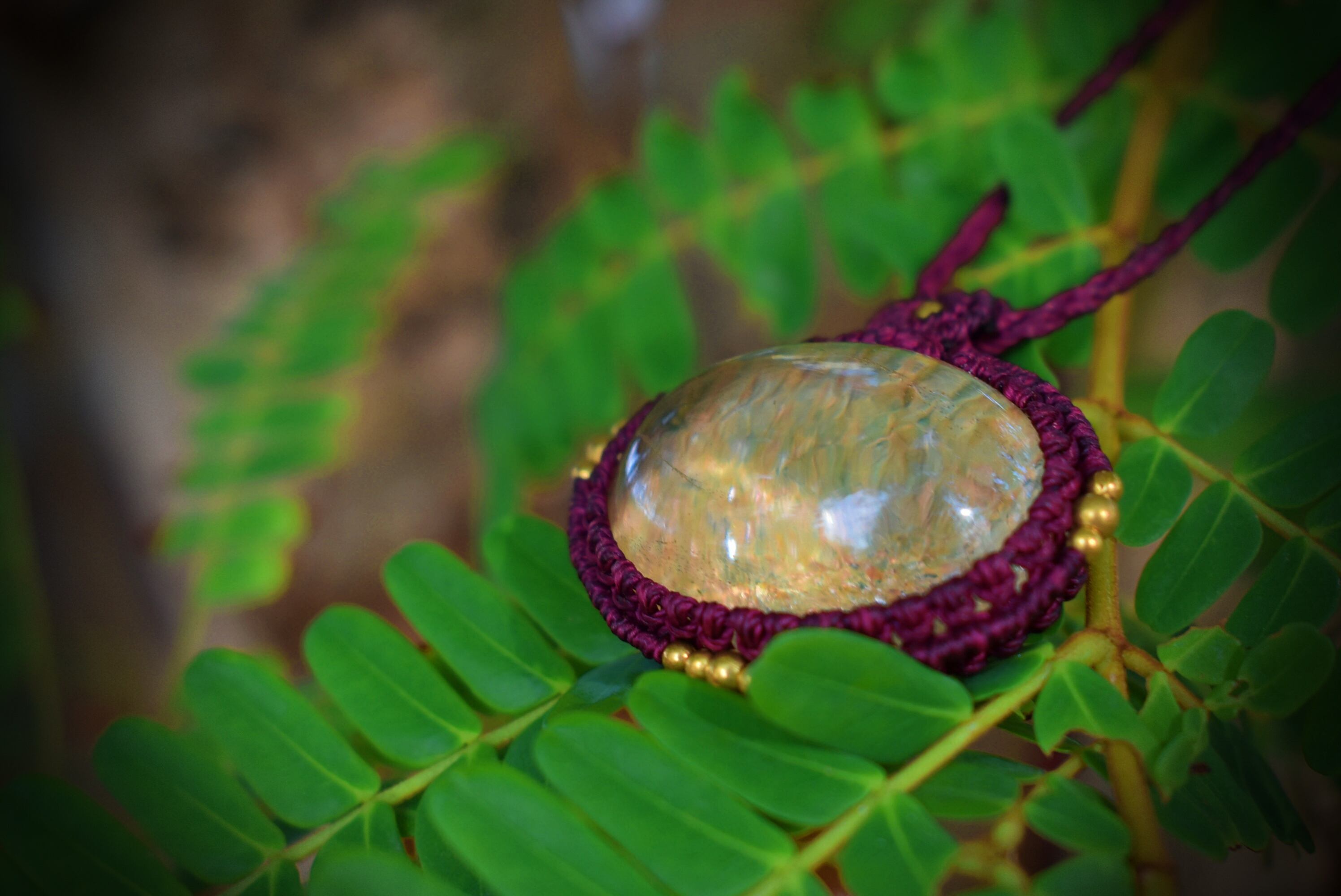 このたびのガーデンクォーツはまさにゴールドイエローカラーの鱗のようなシラーが水晶の中に少しずつ生えているような、美しいぷるんとしたゴールドガーデンクォーツをこの石が一番美しく見える角度でペンダントとしてマクラメ編み装飾を施して仕上げました。