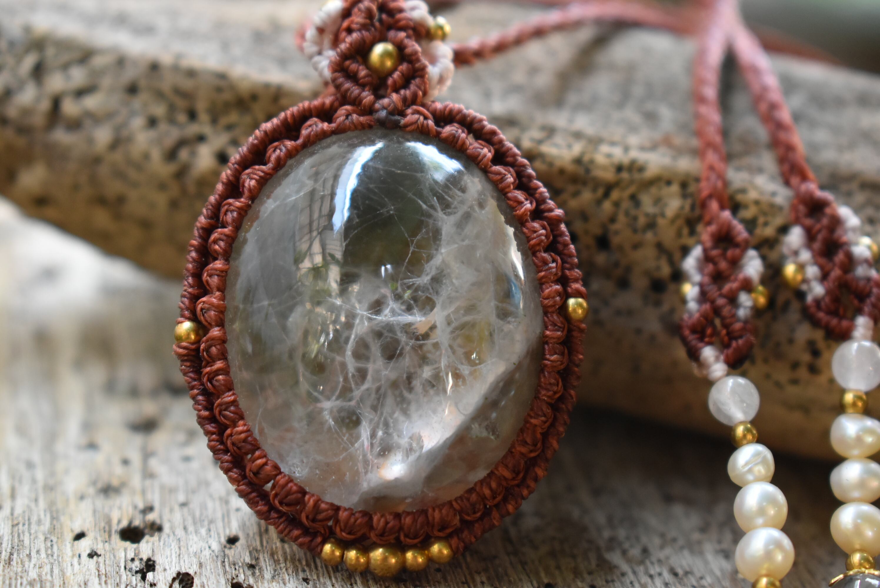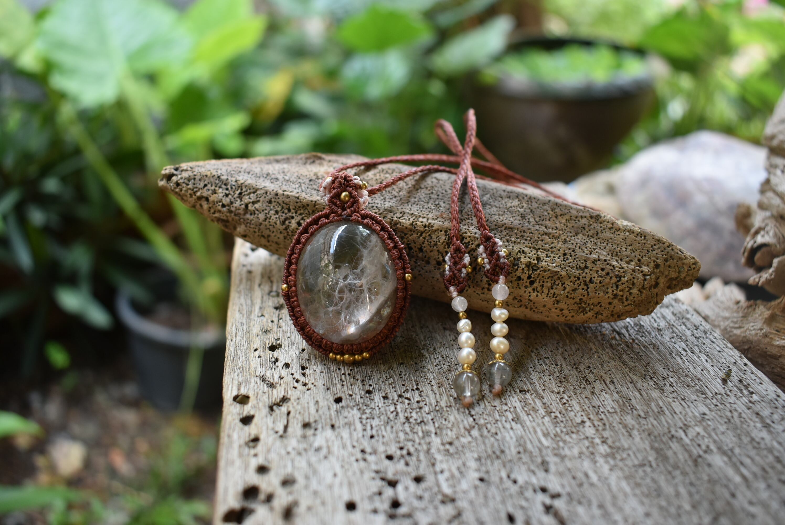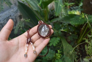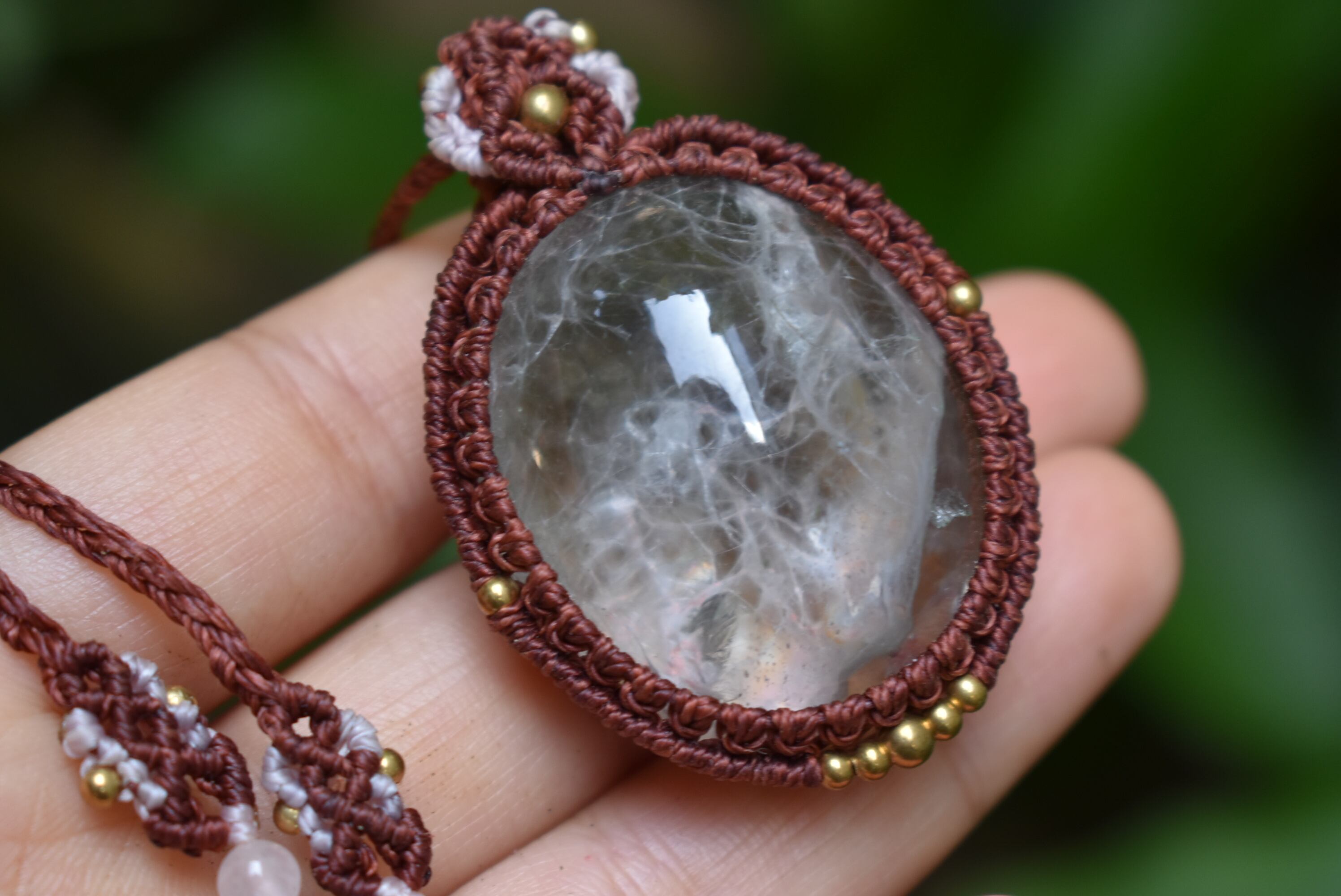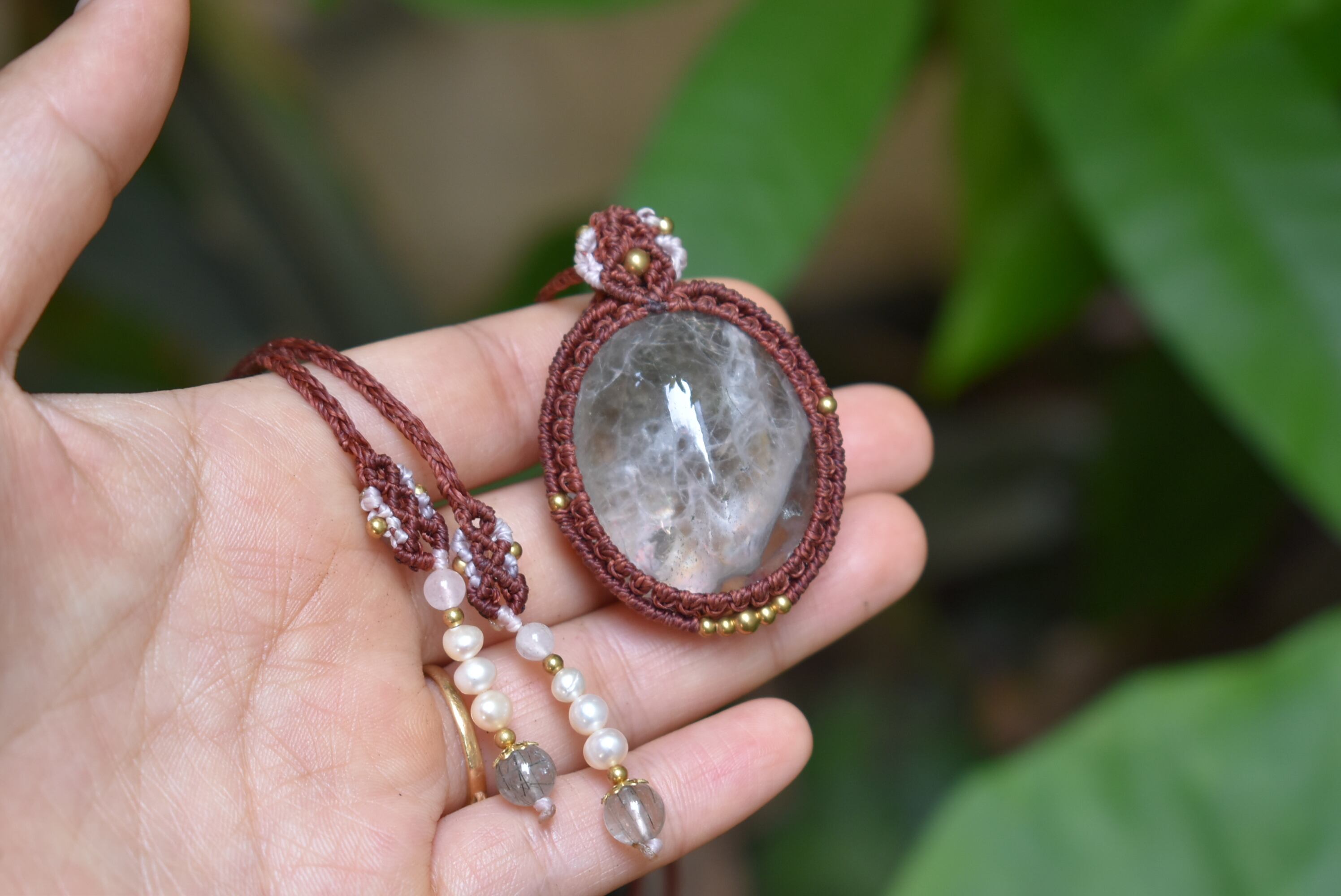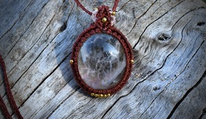 この石から見てとれるピンクカラーと水晶全体を引き締めたような色味にしたかったのでレッドブラウンの蝋引き糸を使用してマクラメ編み装飾を少しだけ施し、シンプルなペンダントに仕上げました。