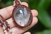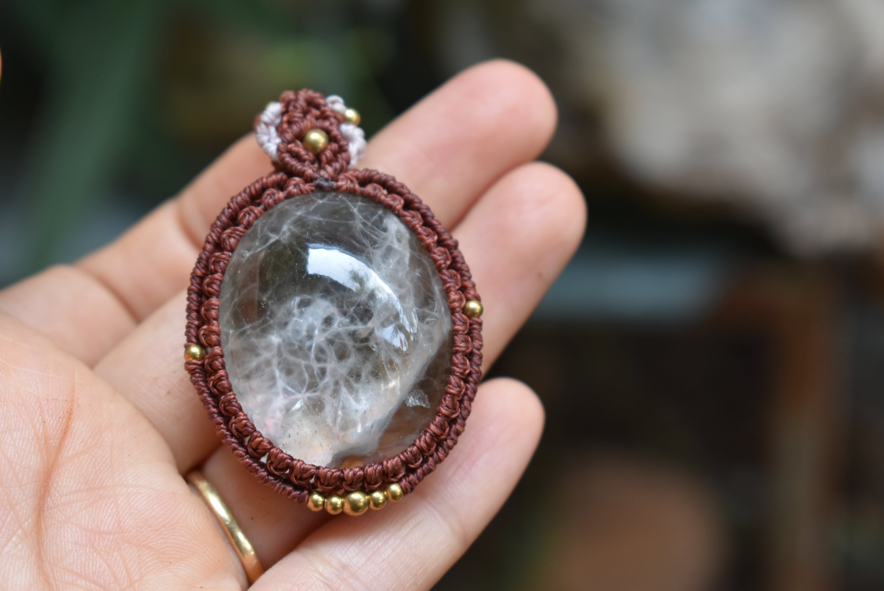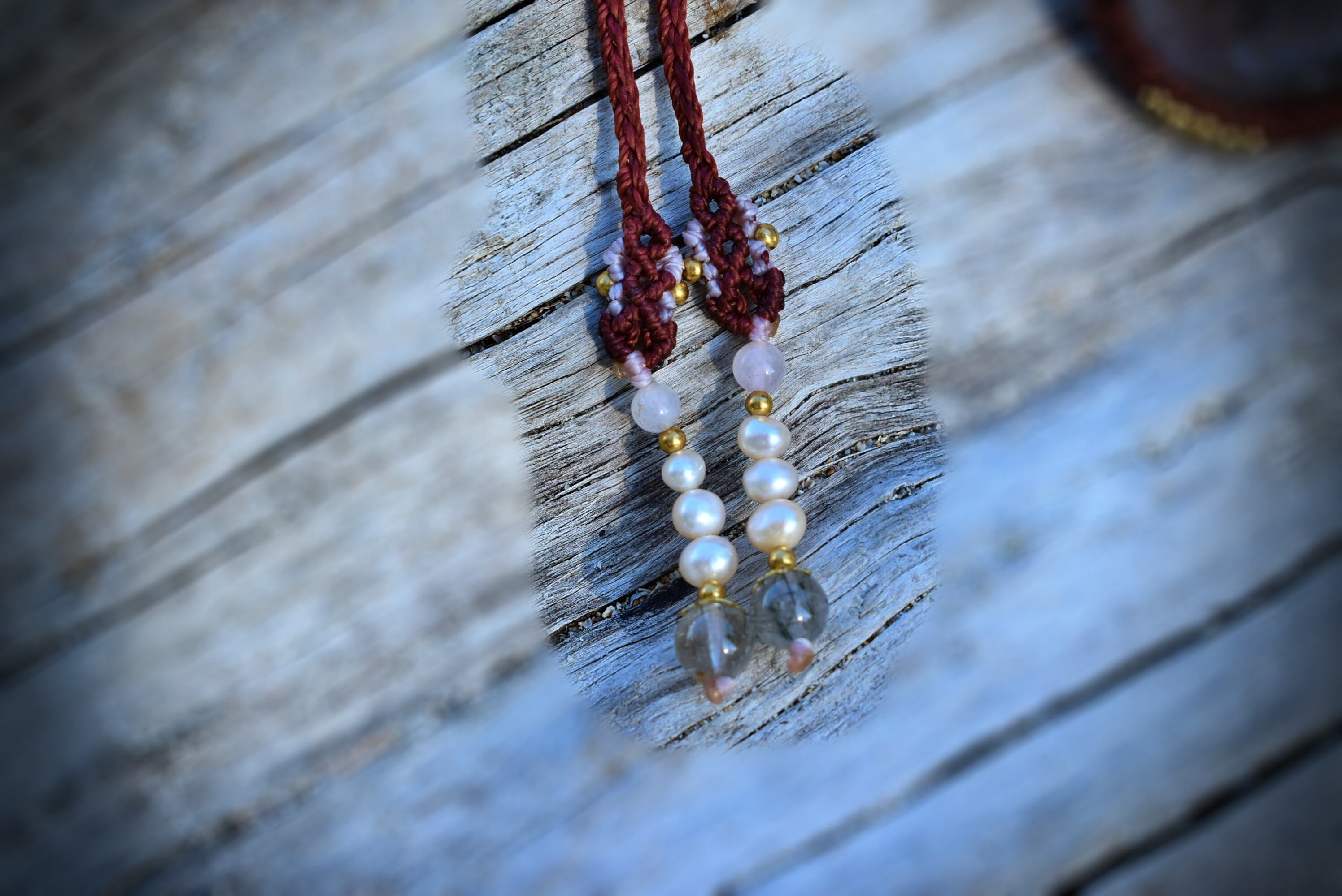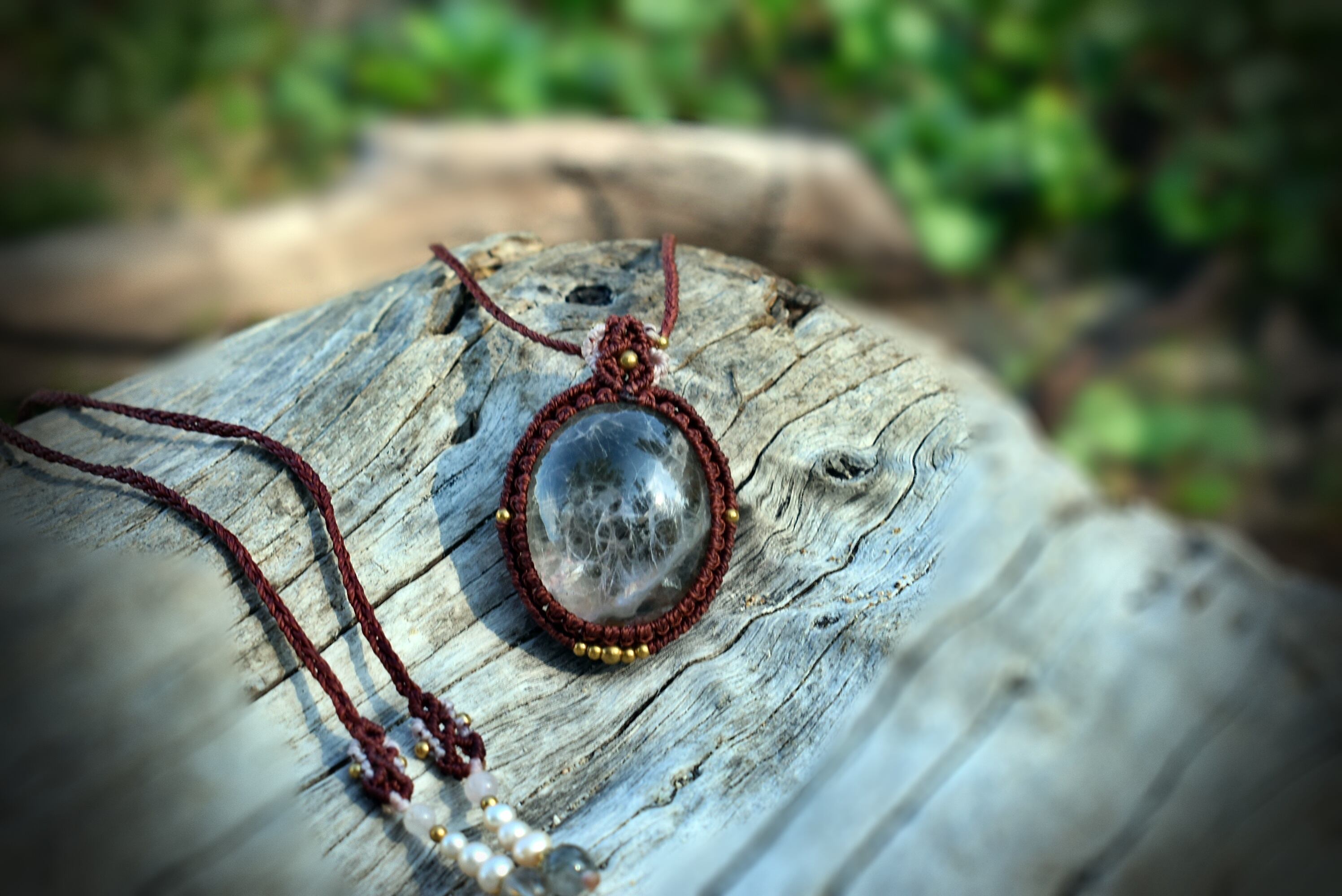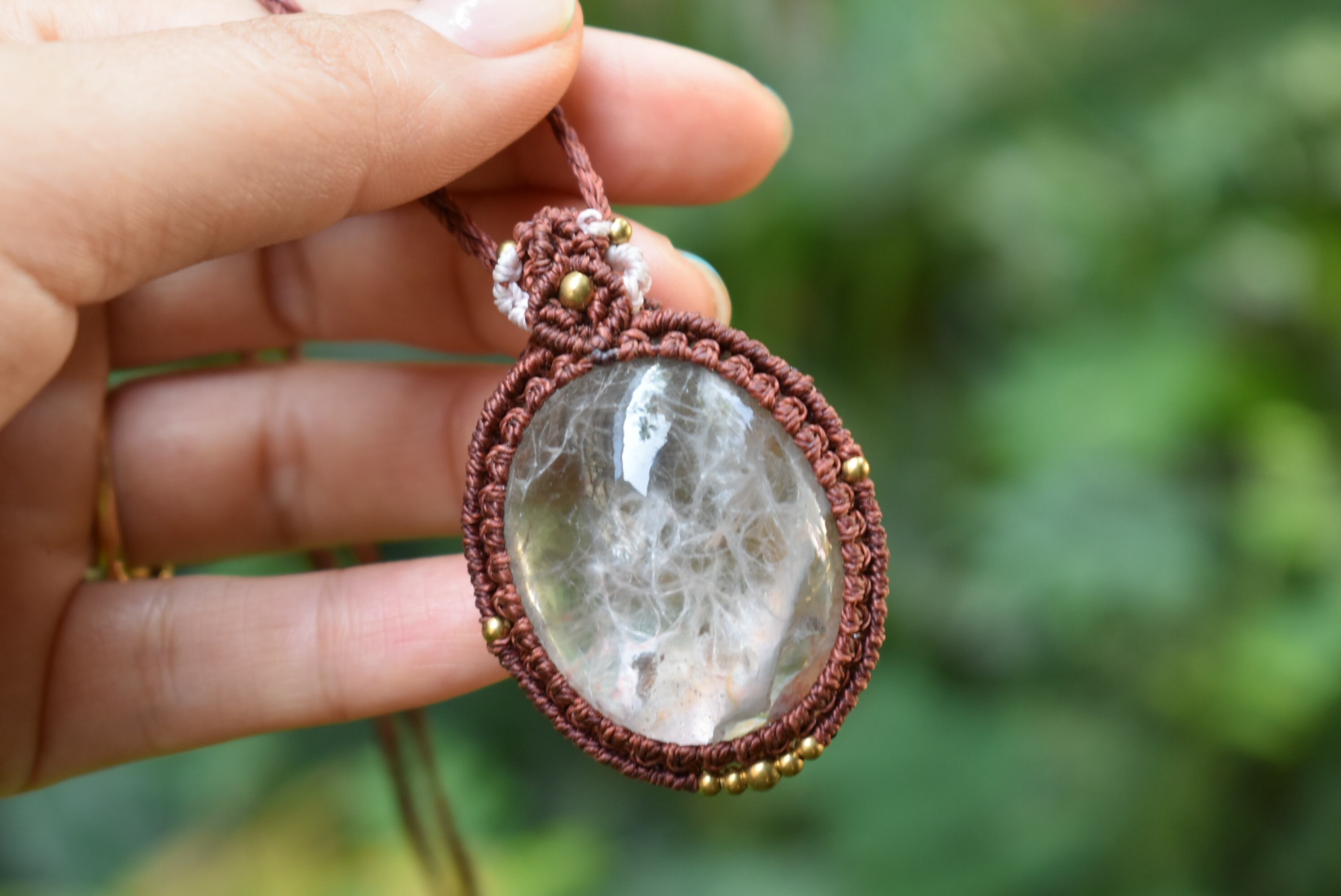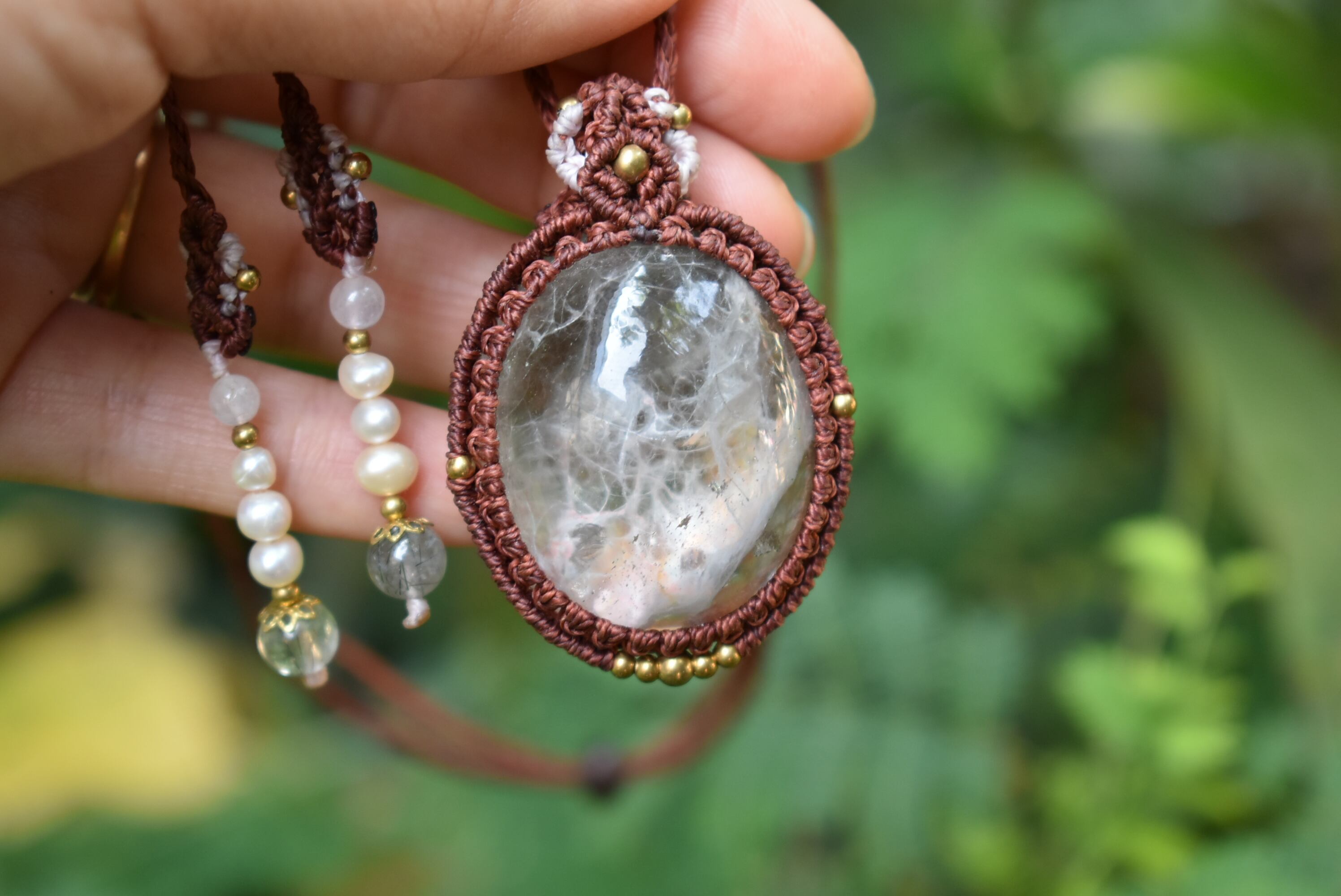 この石から見てとれるピンクカラーと水晶全体を引き締めたような色味にしたかったのでレッドブラウンの蝋引き糸を使用してマクラメ編み装飾を少しだけ施し、シンプルなペンダントに仕上げました。