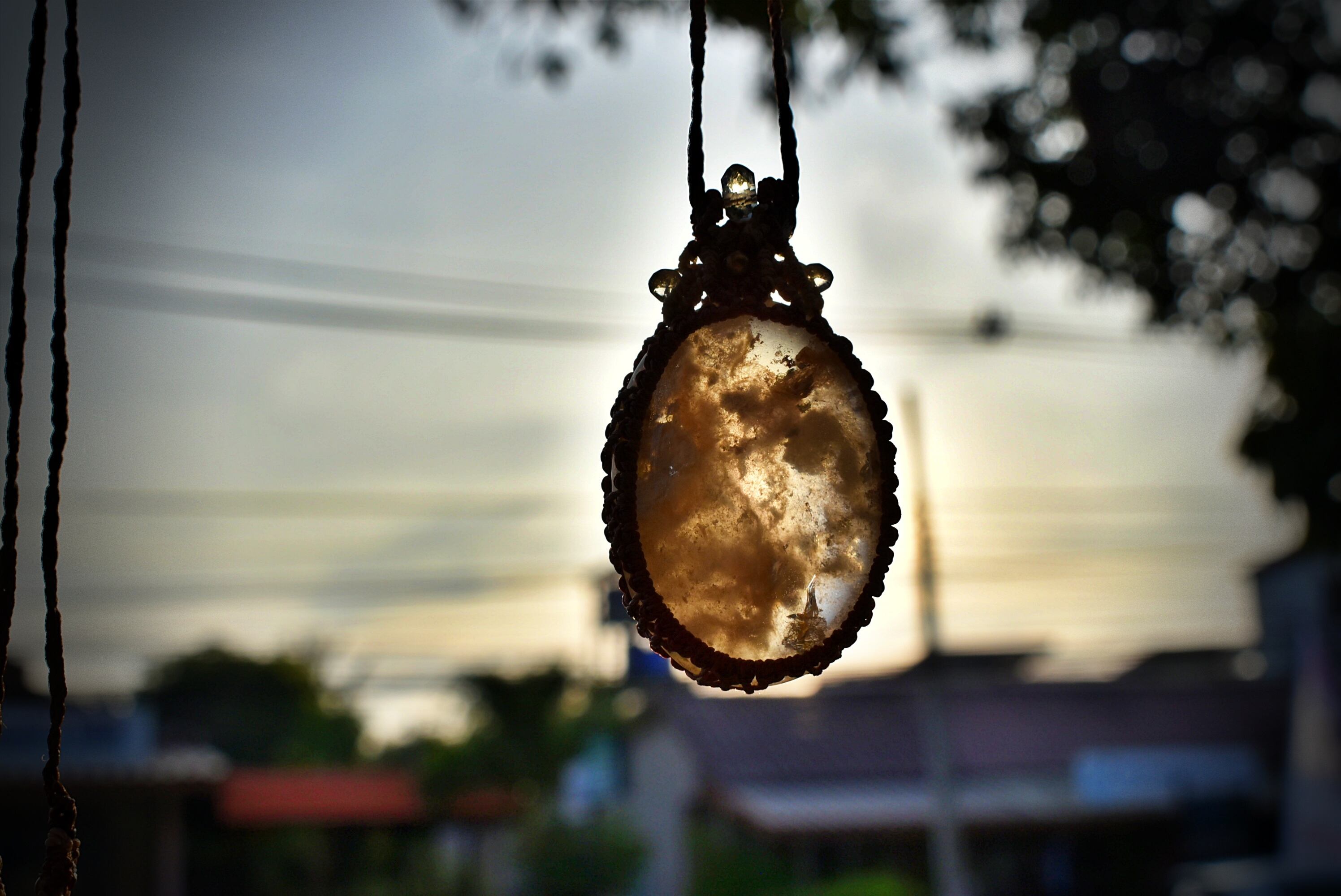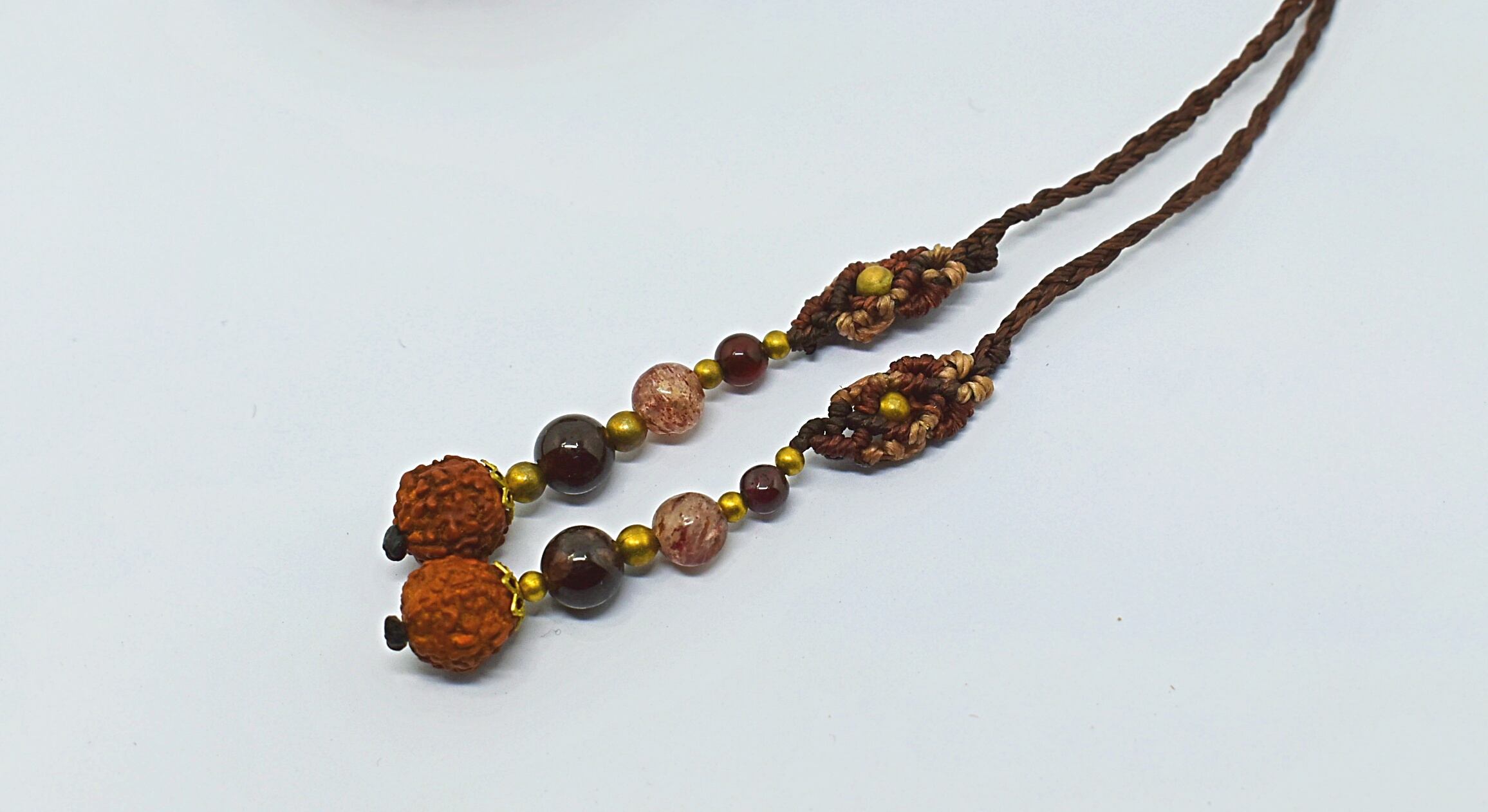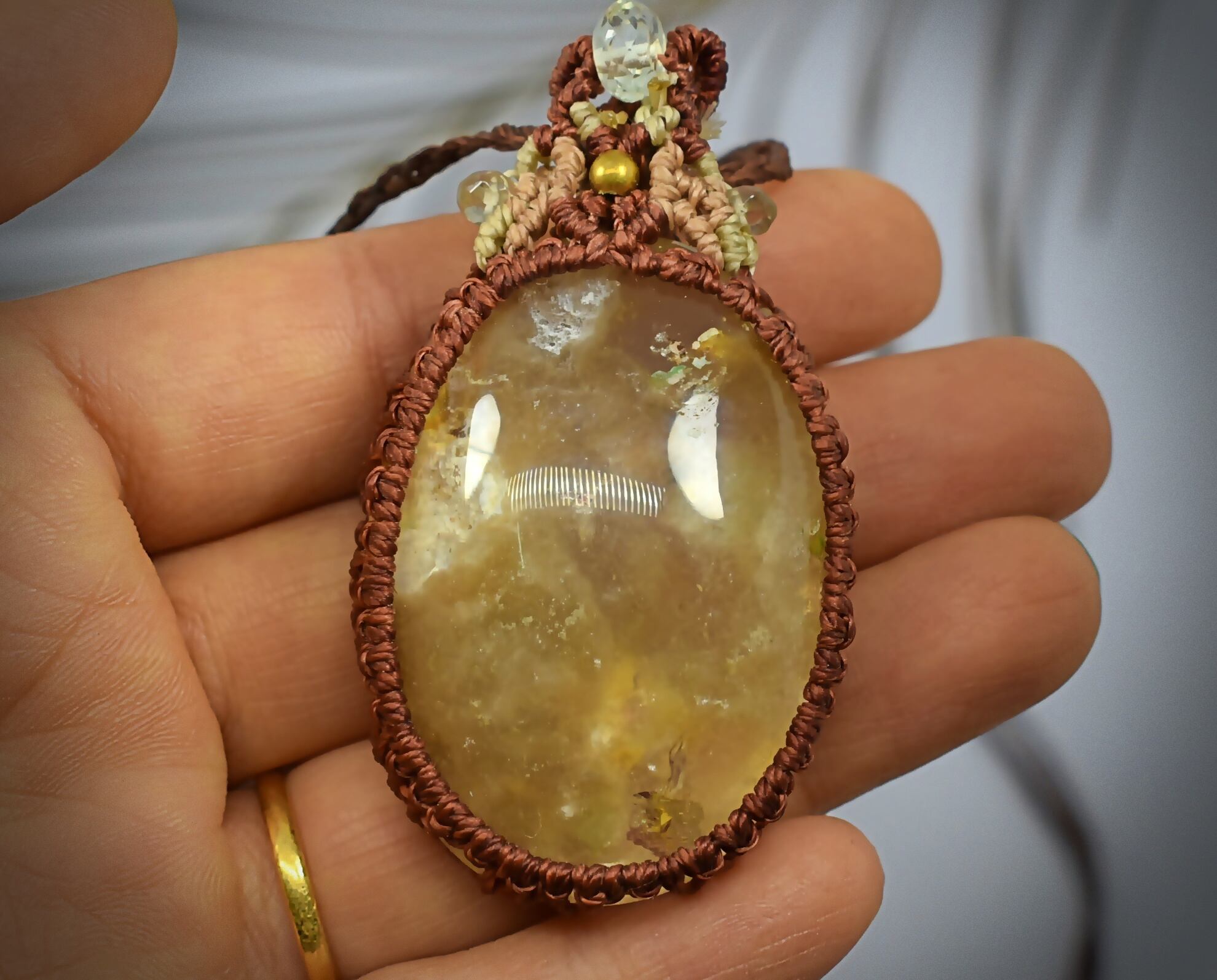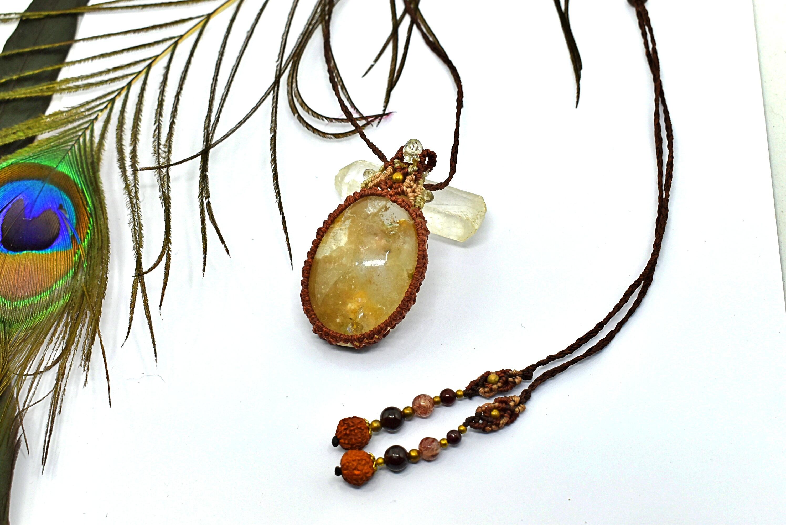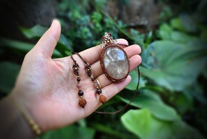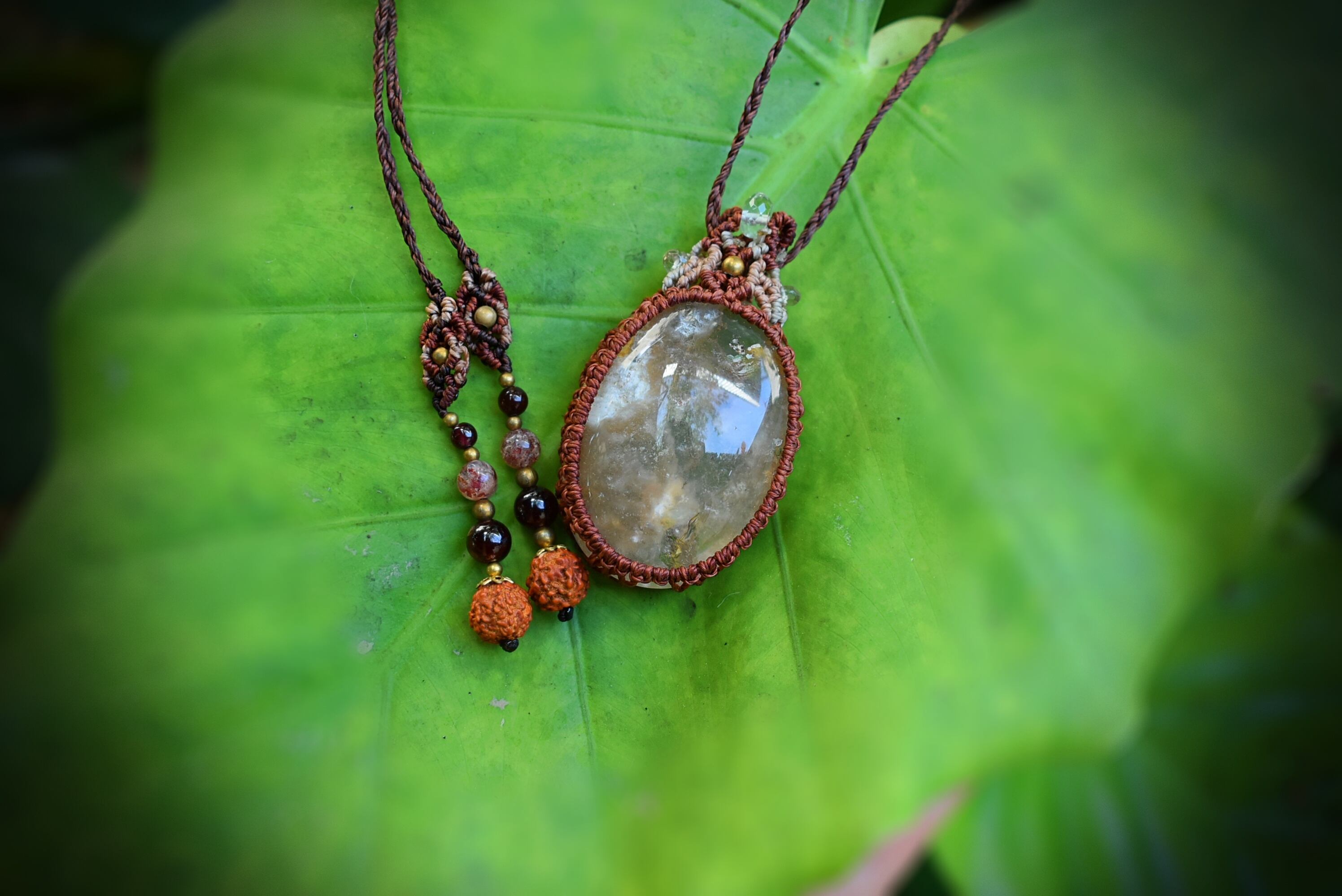 とても個性的なタイプのこのたびの水晶を石の中がしっかり見えるよう、隙間を開けて蝋引き糸で包み込み、トップをマクラメ編み装飾をして仕上げました。