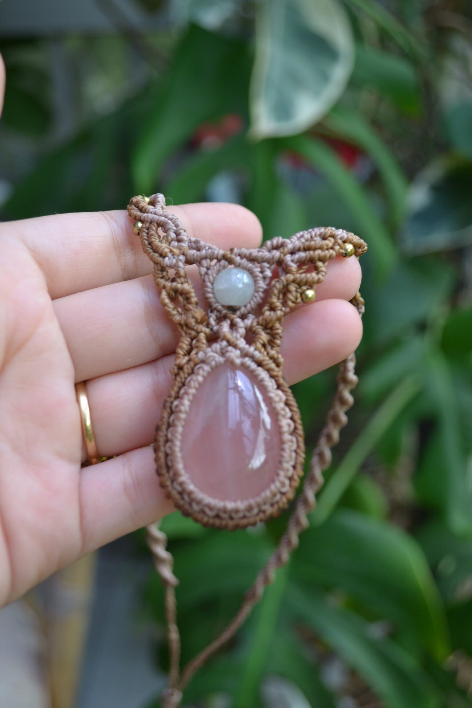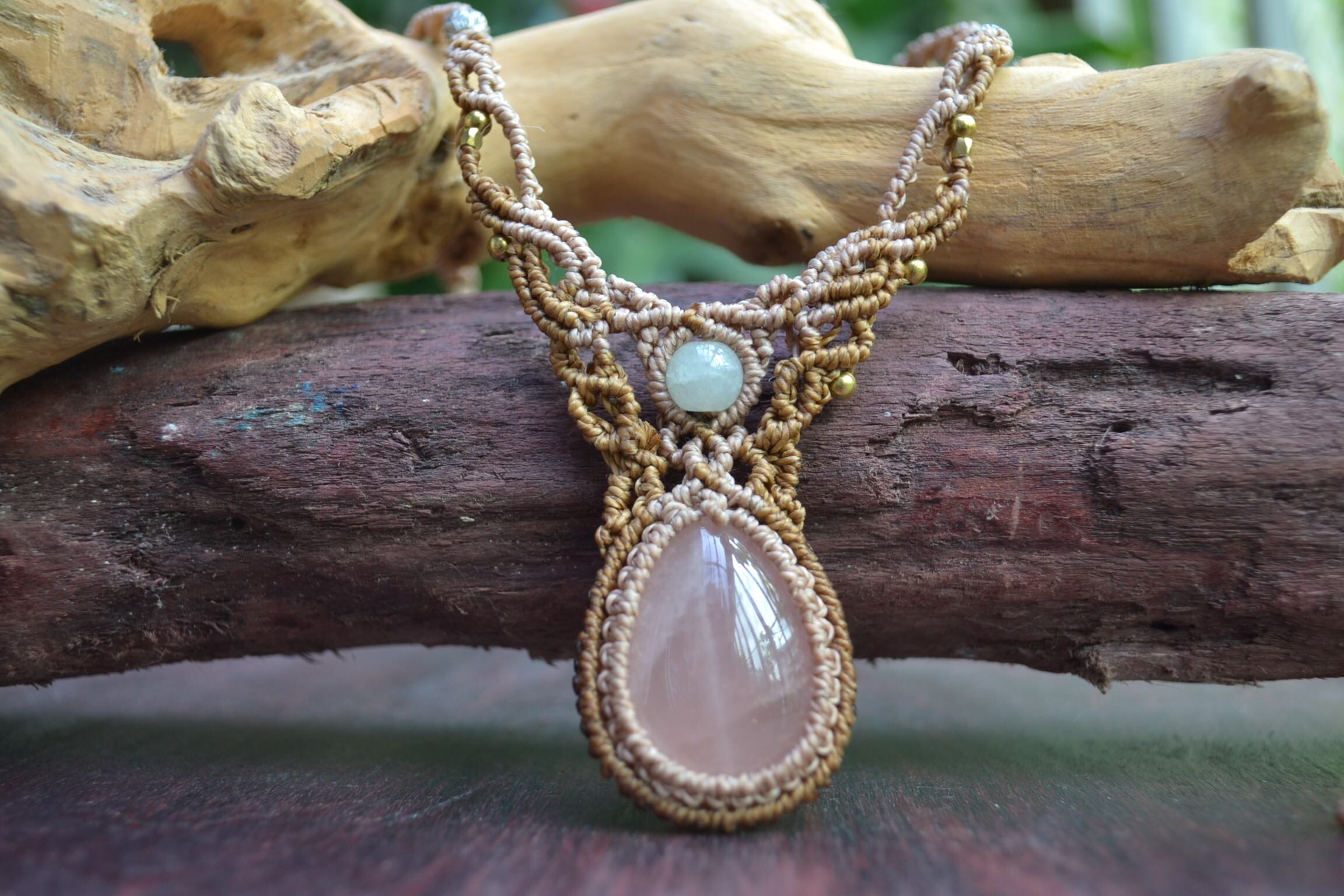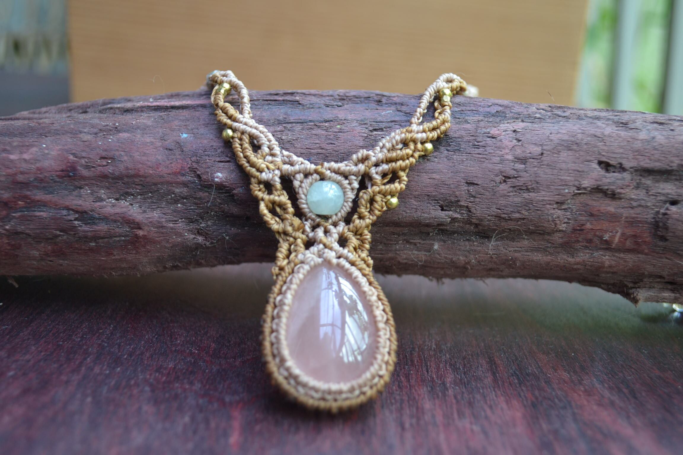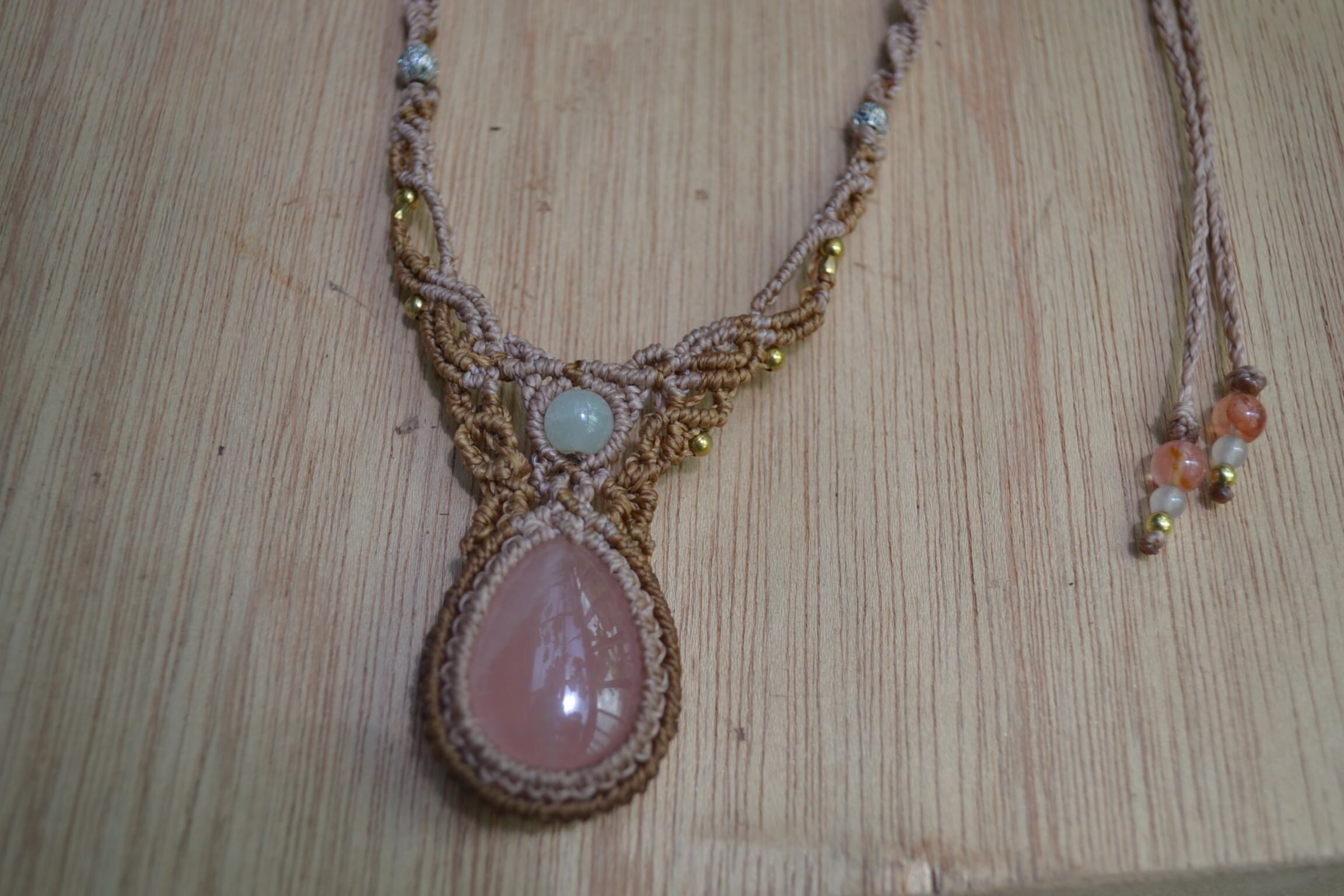 この度、優しい色合いのローズクオーツと翡翠(ジェイド)をトップにマクラメ編み装飾を施しネックレスを制作しました。2種類違う色味の蝋引き糸を使用し、優しいコントラストをつけながら、真鍮パーツをトッピングしました。ローズクオーツとジェイドの優しい色味が首元を華やかに彩ってくれるネックレスです。