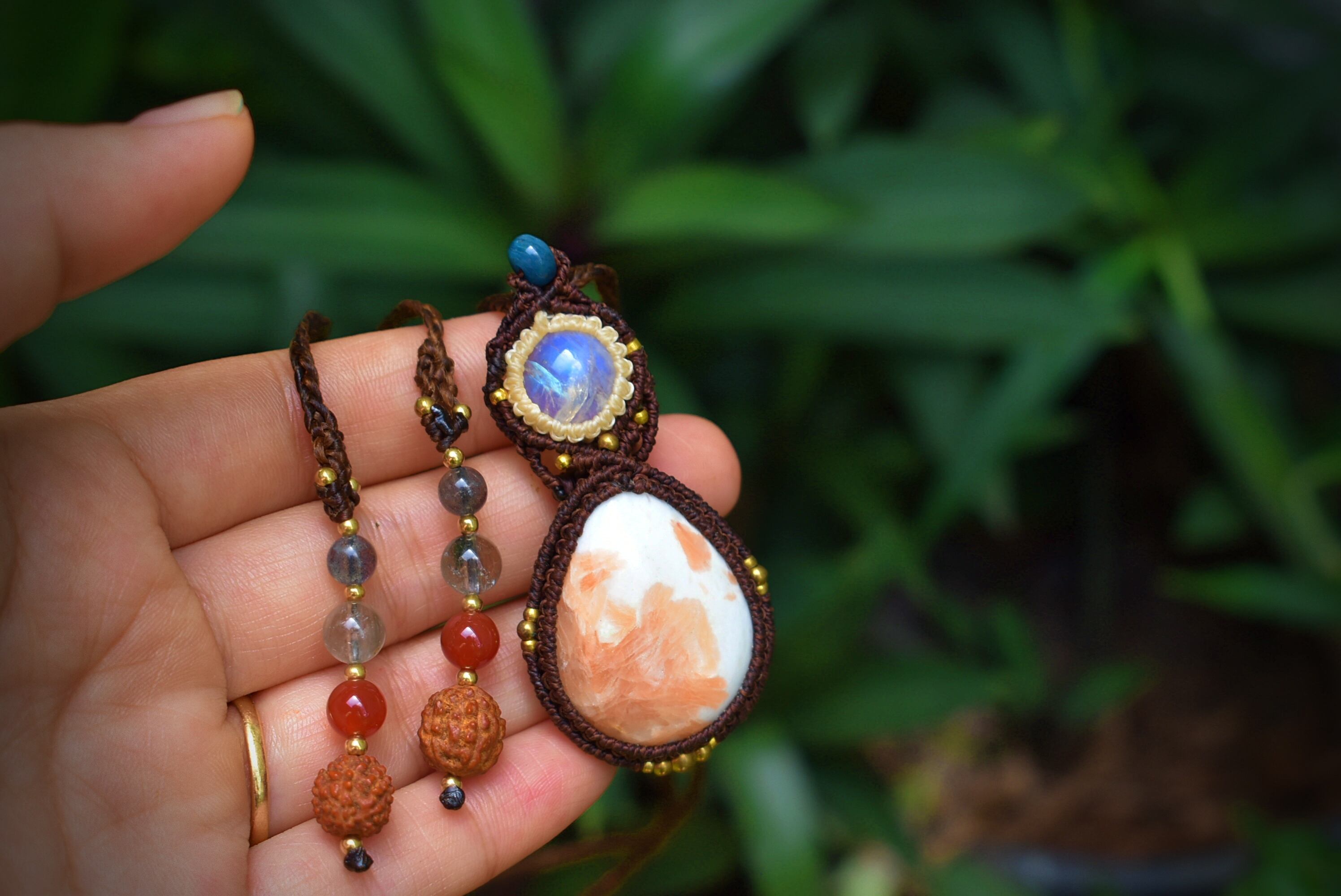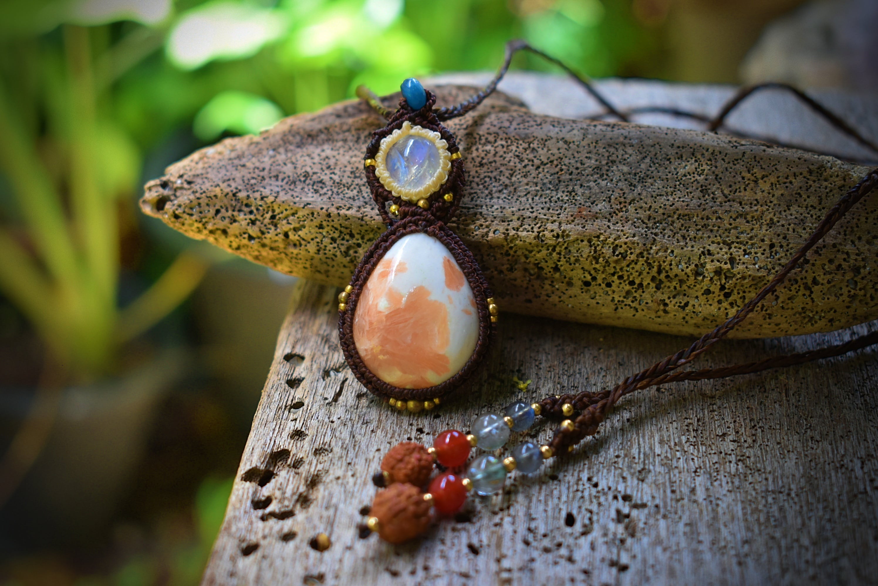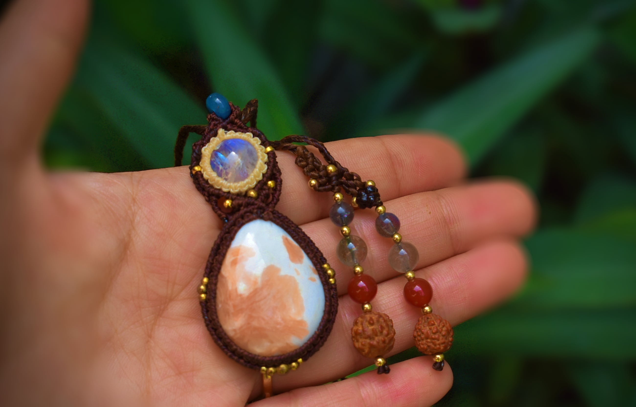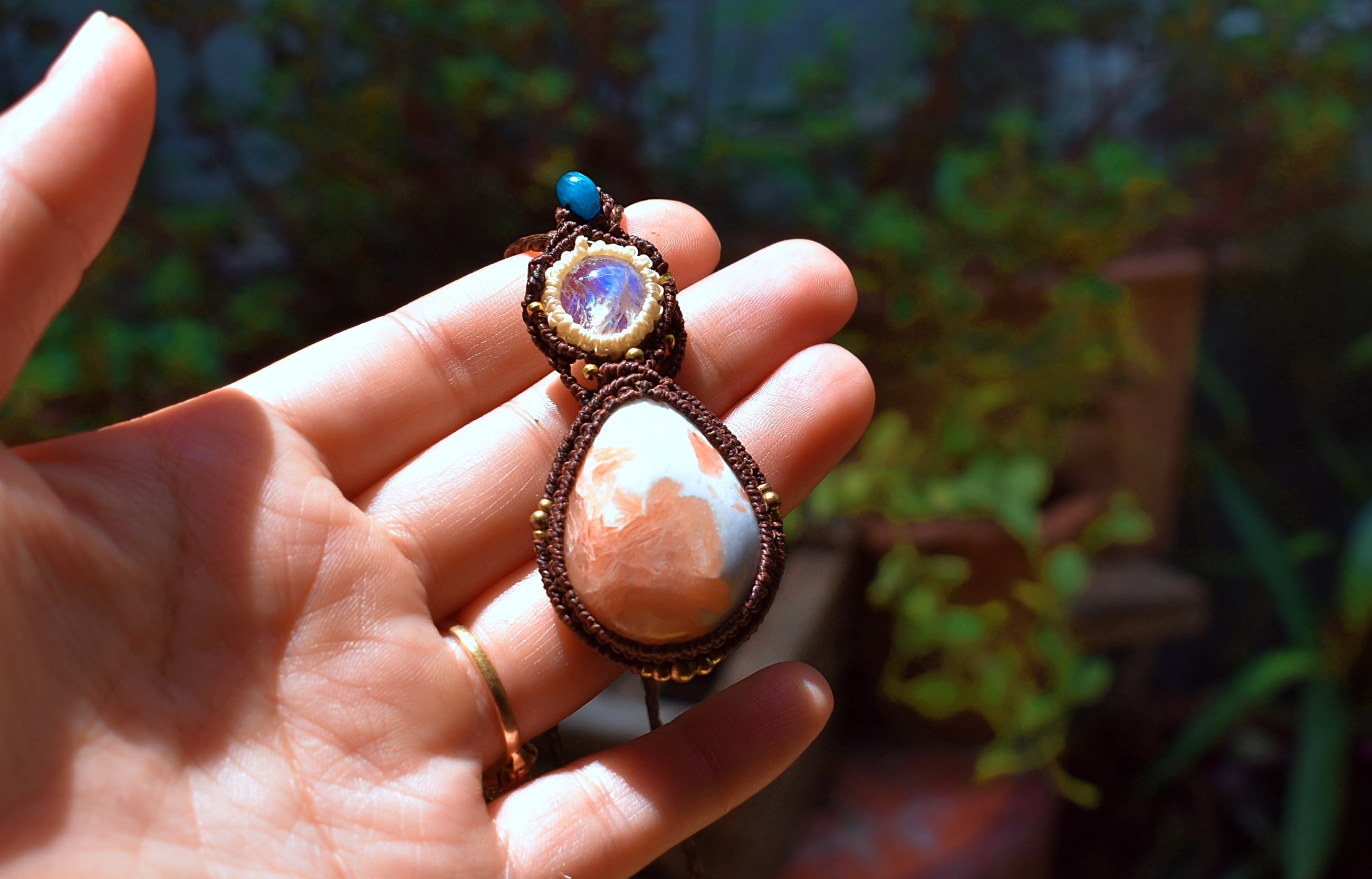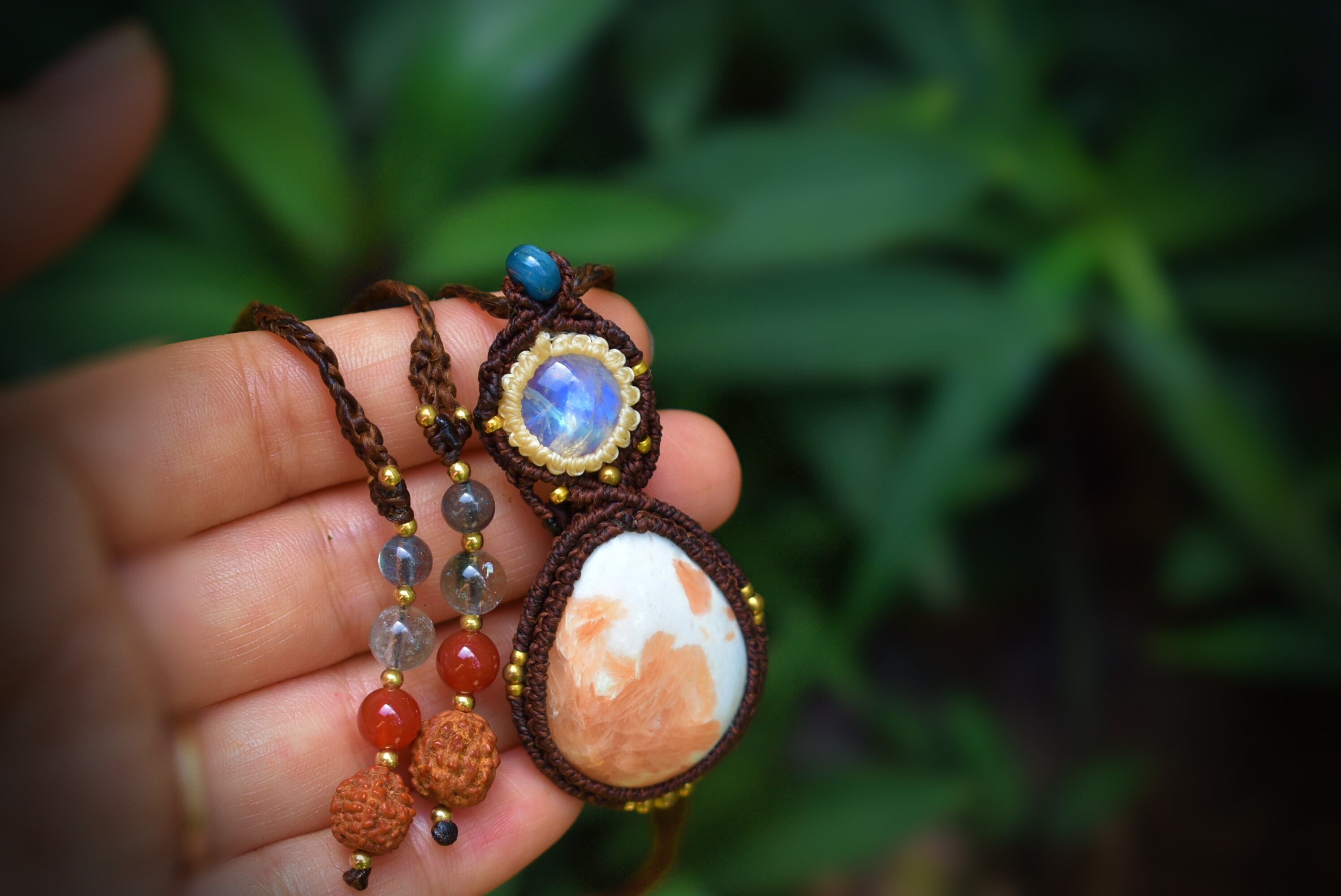 月と太陽の奇跡★オレンジスコレサイトとホワイトラブラドライト マクラメペンダントmoon005