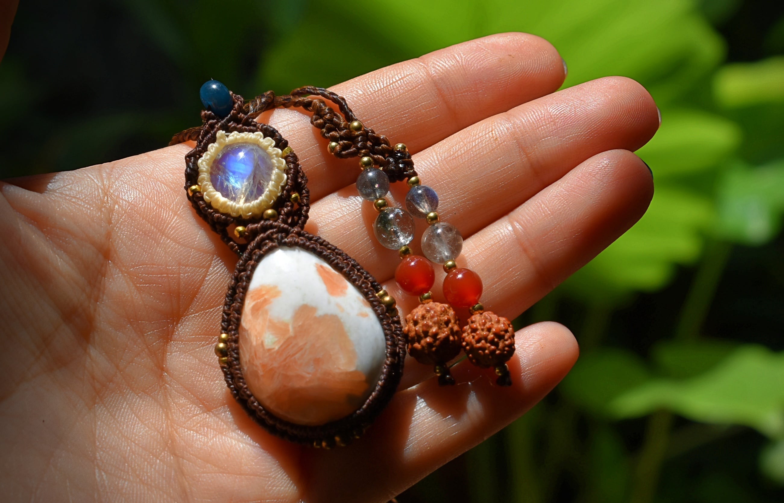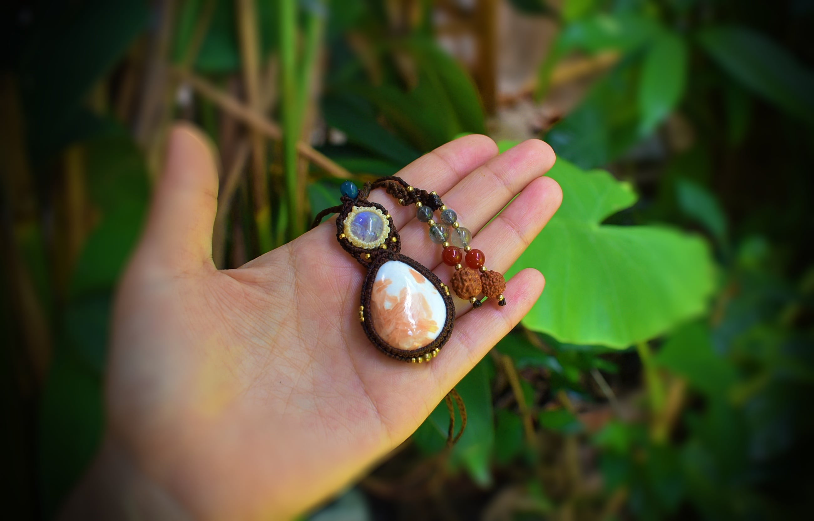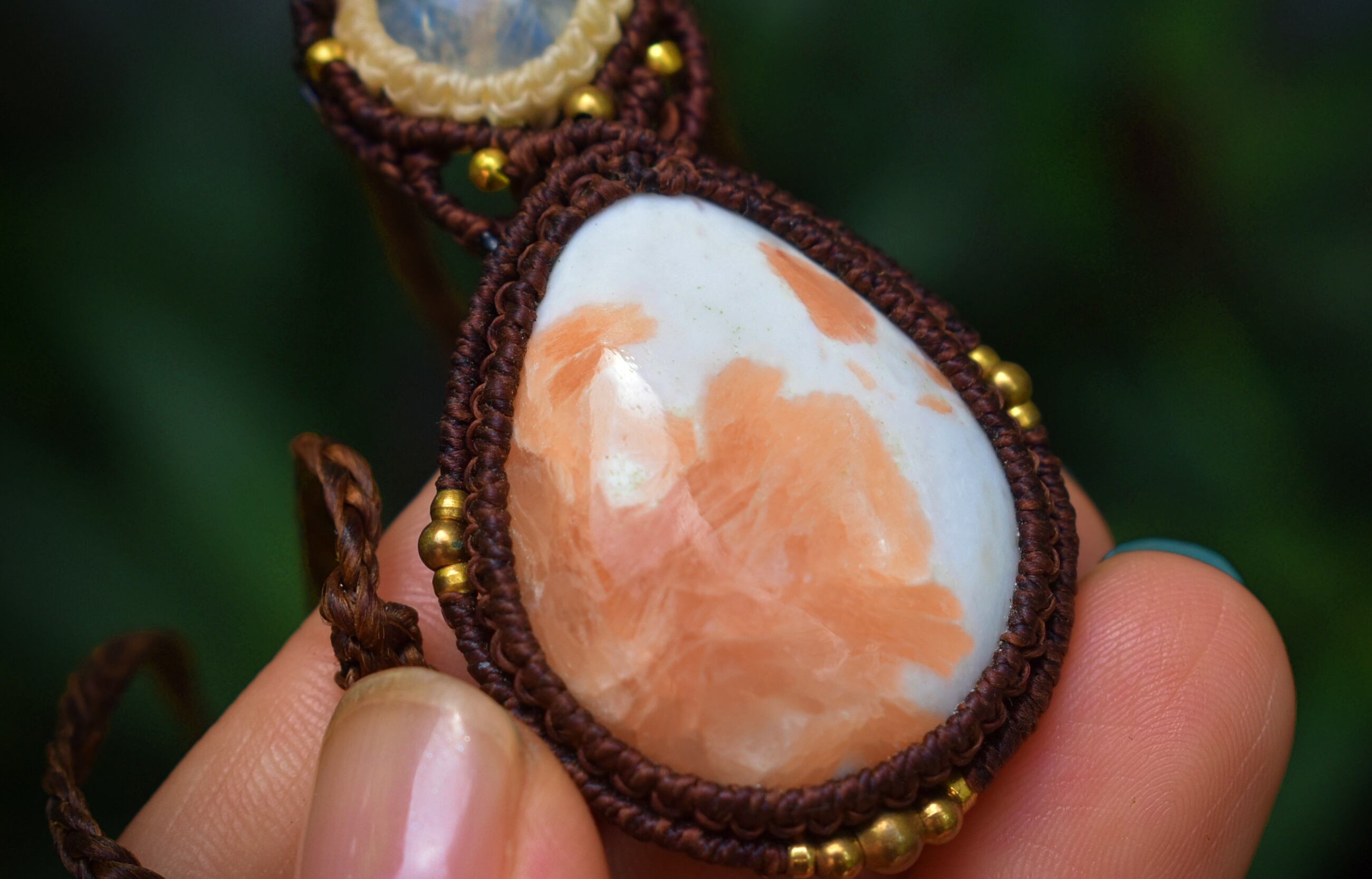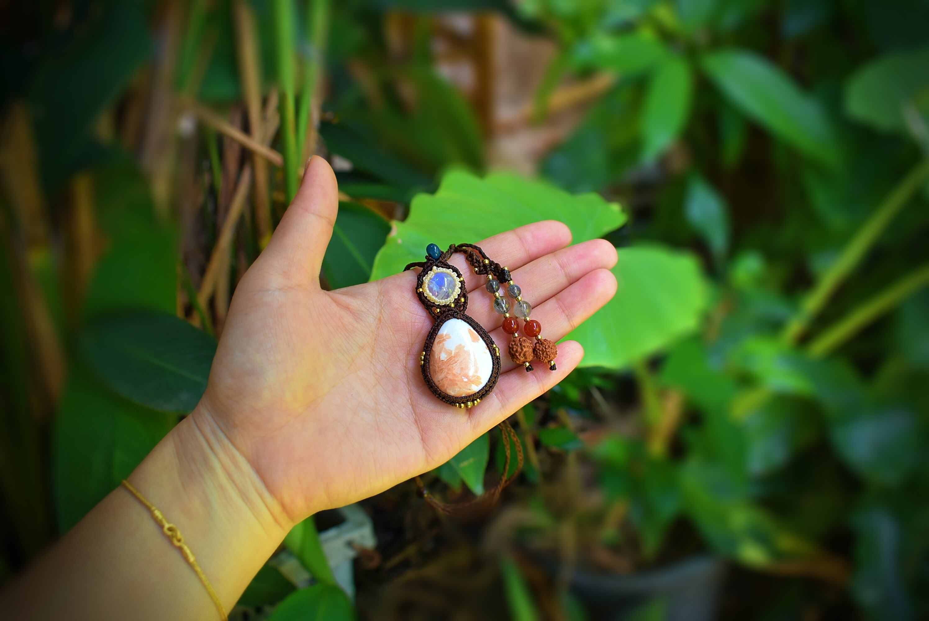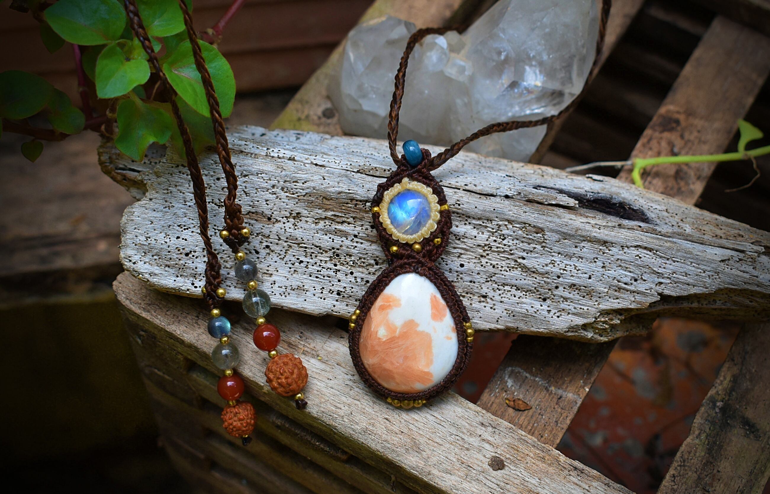 月と太陽の奇跡★オレンジスコレサイトとホワイトラブラドライト マクラメペンダントmoon005